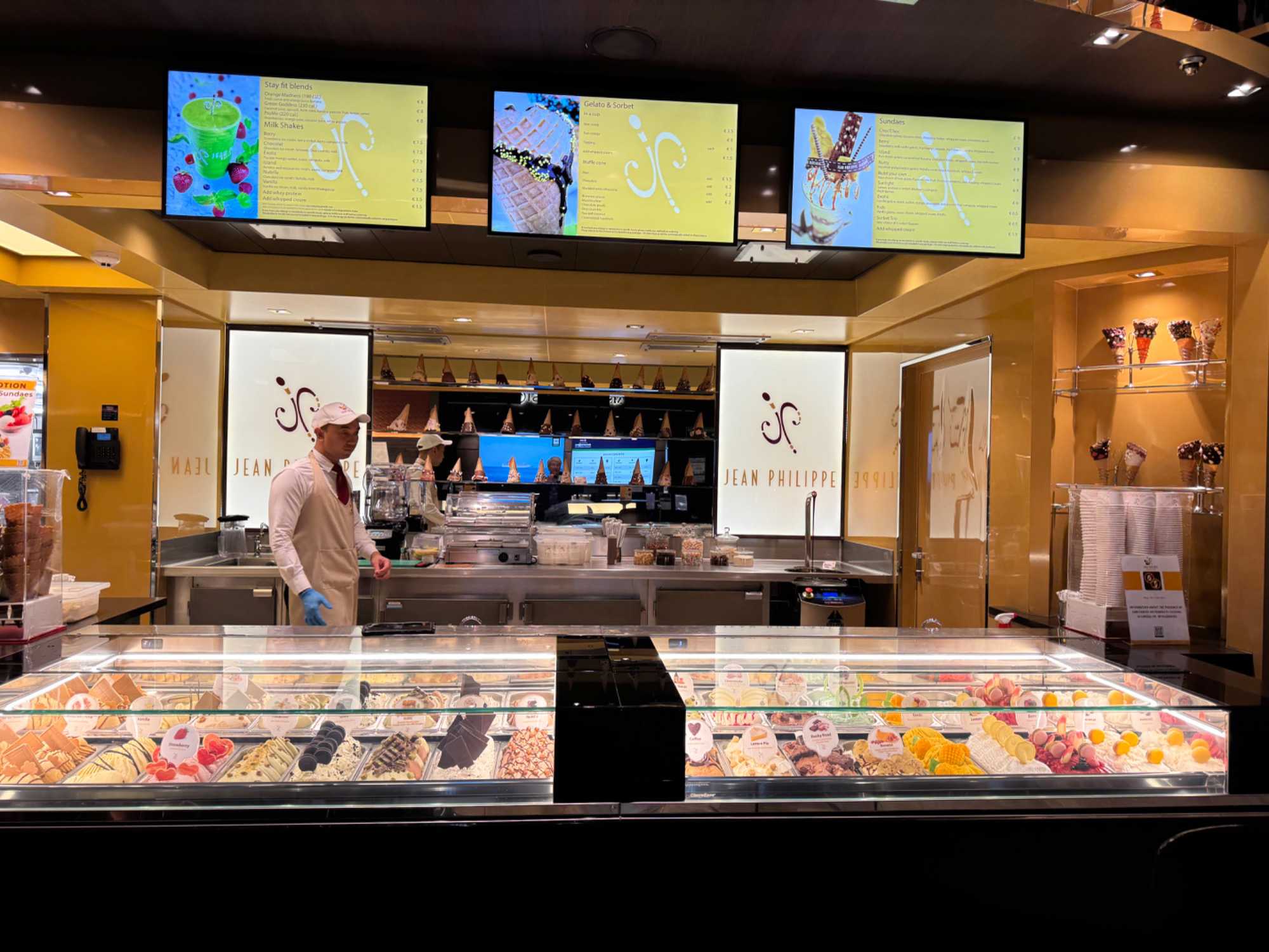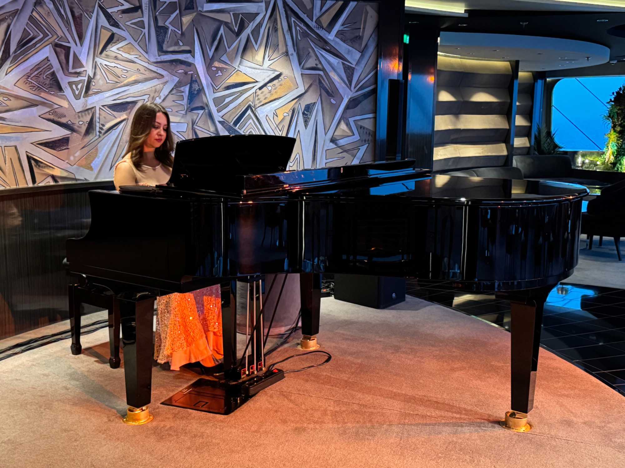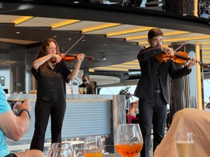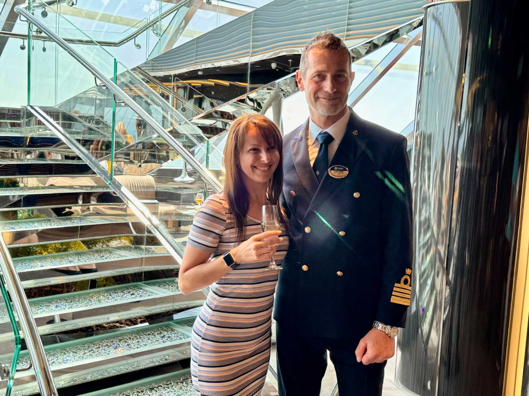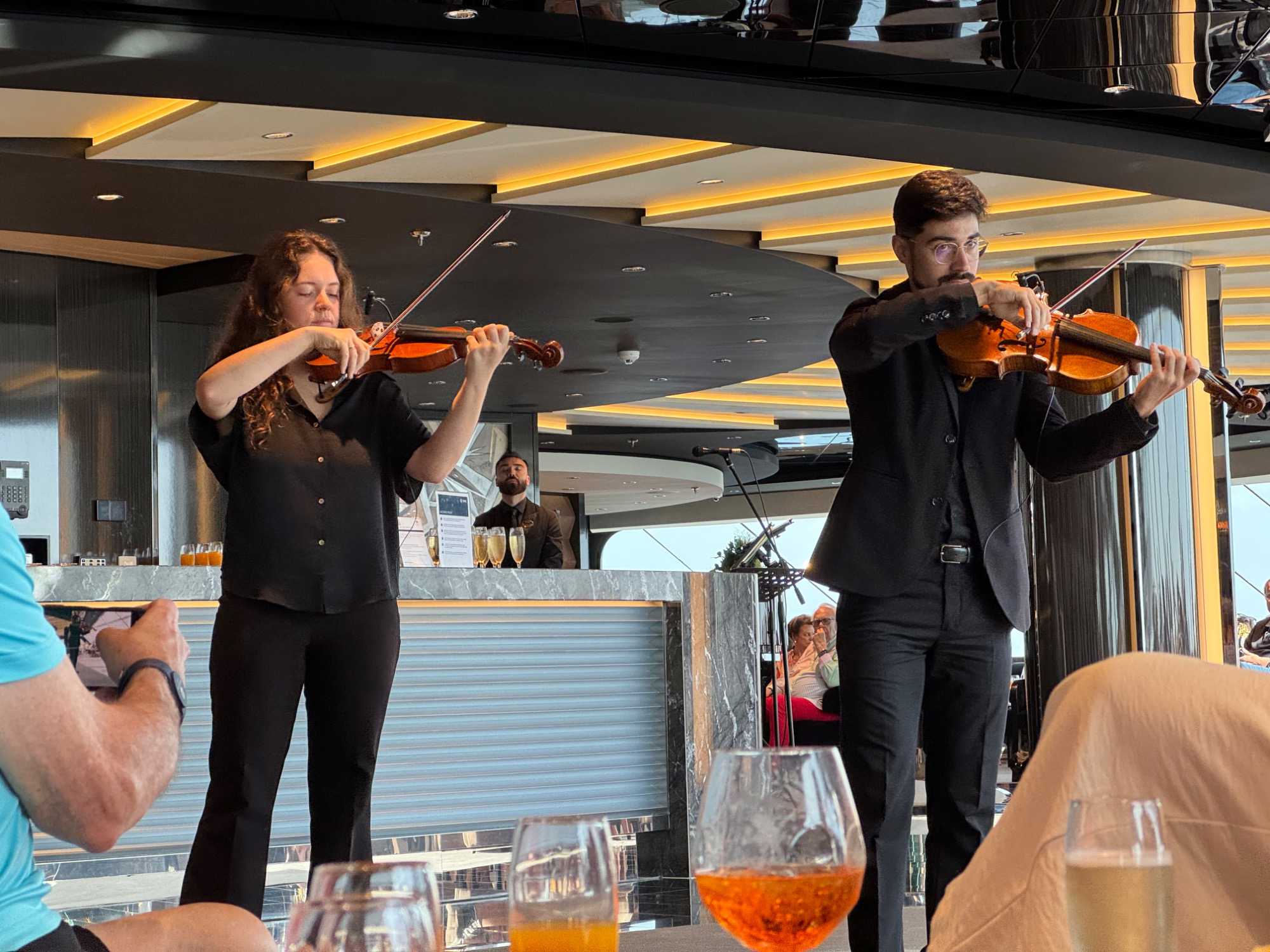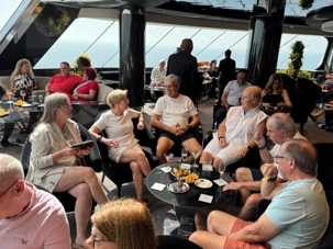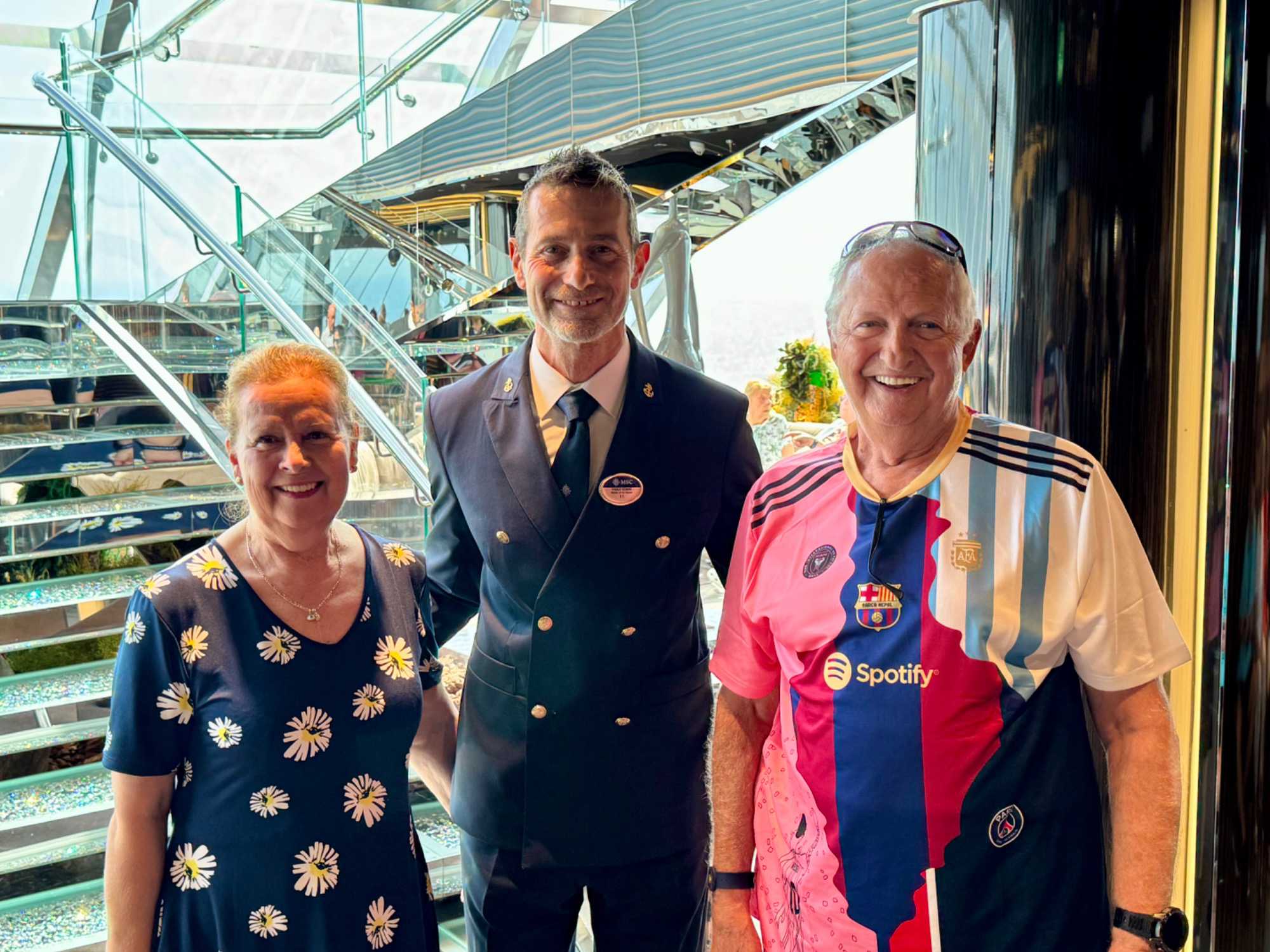 En fin de matinée, les passagers du Yacht Club sont conviés à un cocktail officiel dans le superbe salon privé. Ce moment privilégié permet de rencontrer l’équipe du Yacht Club, dont le professionnalisme, la gentillesse et l’attention constante se démarquent une fois de plus. Le commandant du navire prend également le temps de venir saluer les invités et de souhaiter la bienvenue, un geste fort apprécié. Le service, élégant et chaleureux, reflète parfaitement l’esprit du Yacht Club, où l’on se sent véritablement accueilli avec soin et considération. La présence du français à bord, tant dans les menus que dans le service, contribue grandement au confort et au sentiment de bien-être de tous.