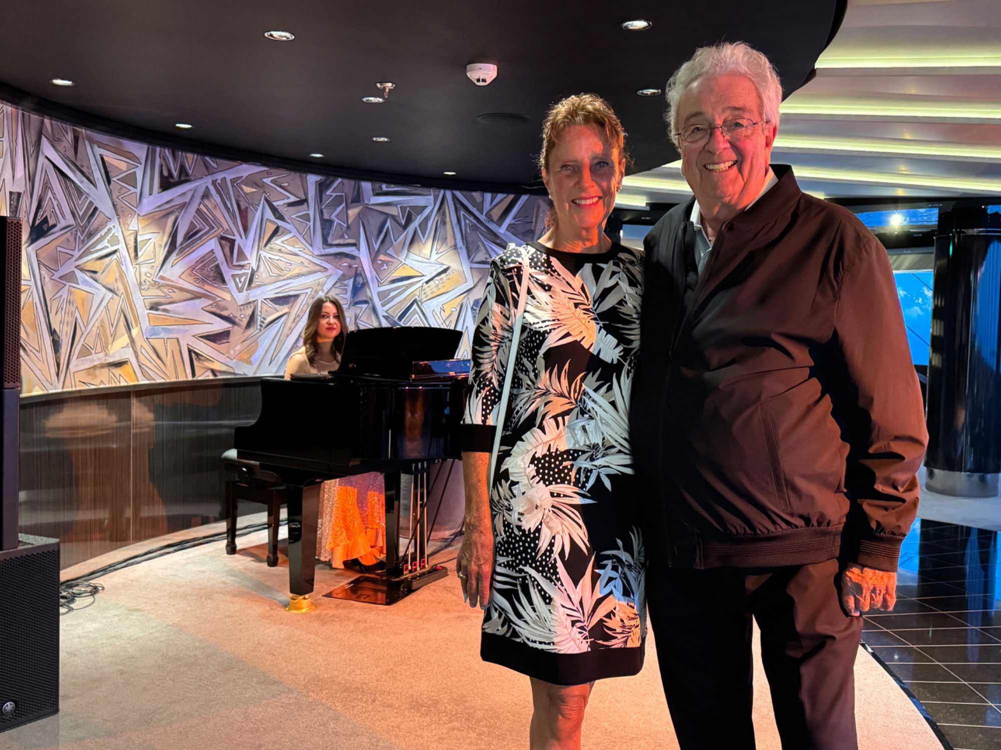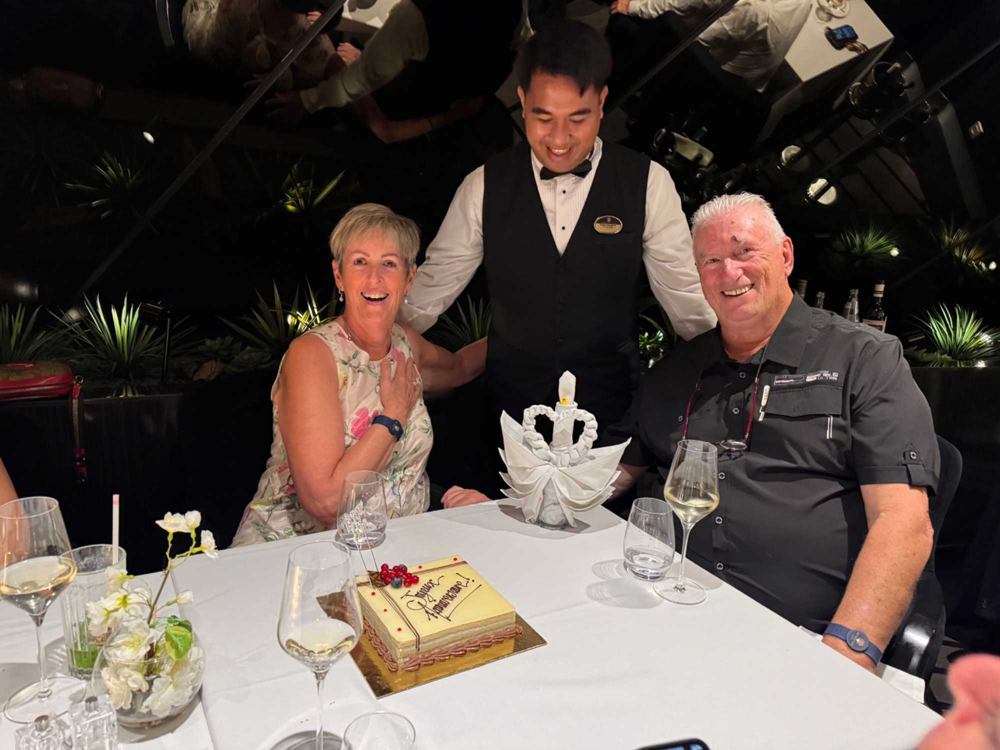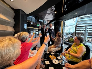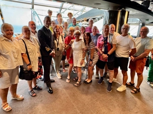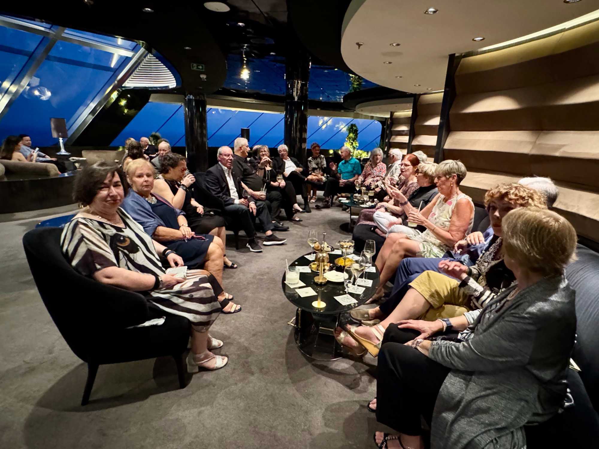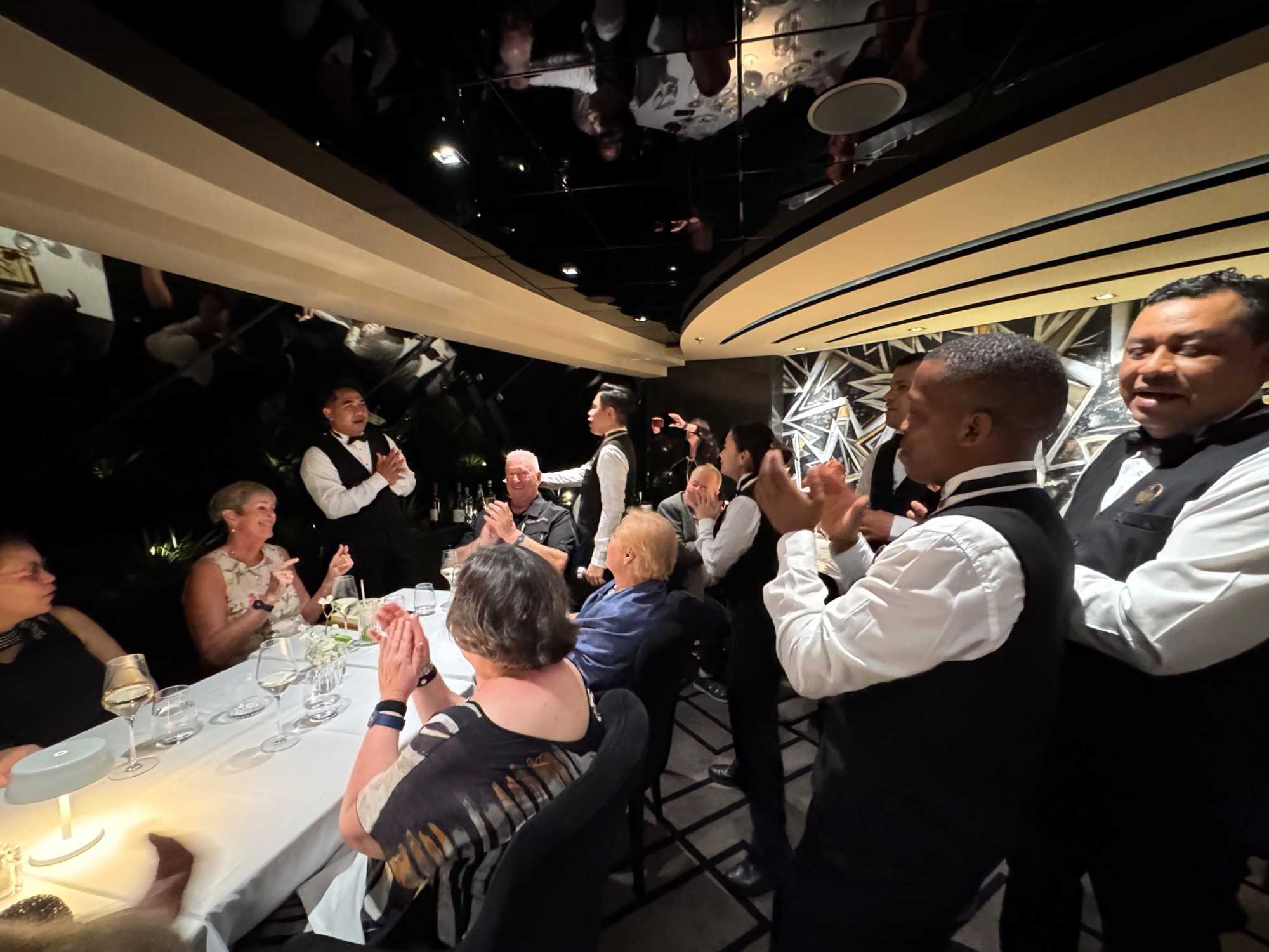 En soirée, le navire se pare d’une atmosphère raffinée pour la soirée chic. Les salons et le restaurant du Yacht Club vibrent d’une ambiance festive et distinguée. Le souper, soigneusement préparé, est à la hauteur de l’événement, tant par la qualité des plats que par l’excellence du service. Au moment du dessert, une attention toute spéciale vient émouvoir la table : nos serveurs offrent un magnifique gâteau d’anniversaire à Danielle, qui célèbre aujourd’hui sa fête. Un moment chaleureux et joyeux, partagé dans les applaudissements et la bonne humeur.