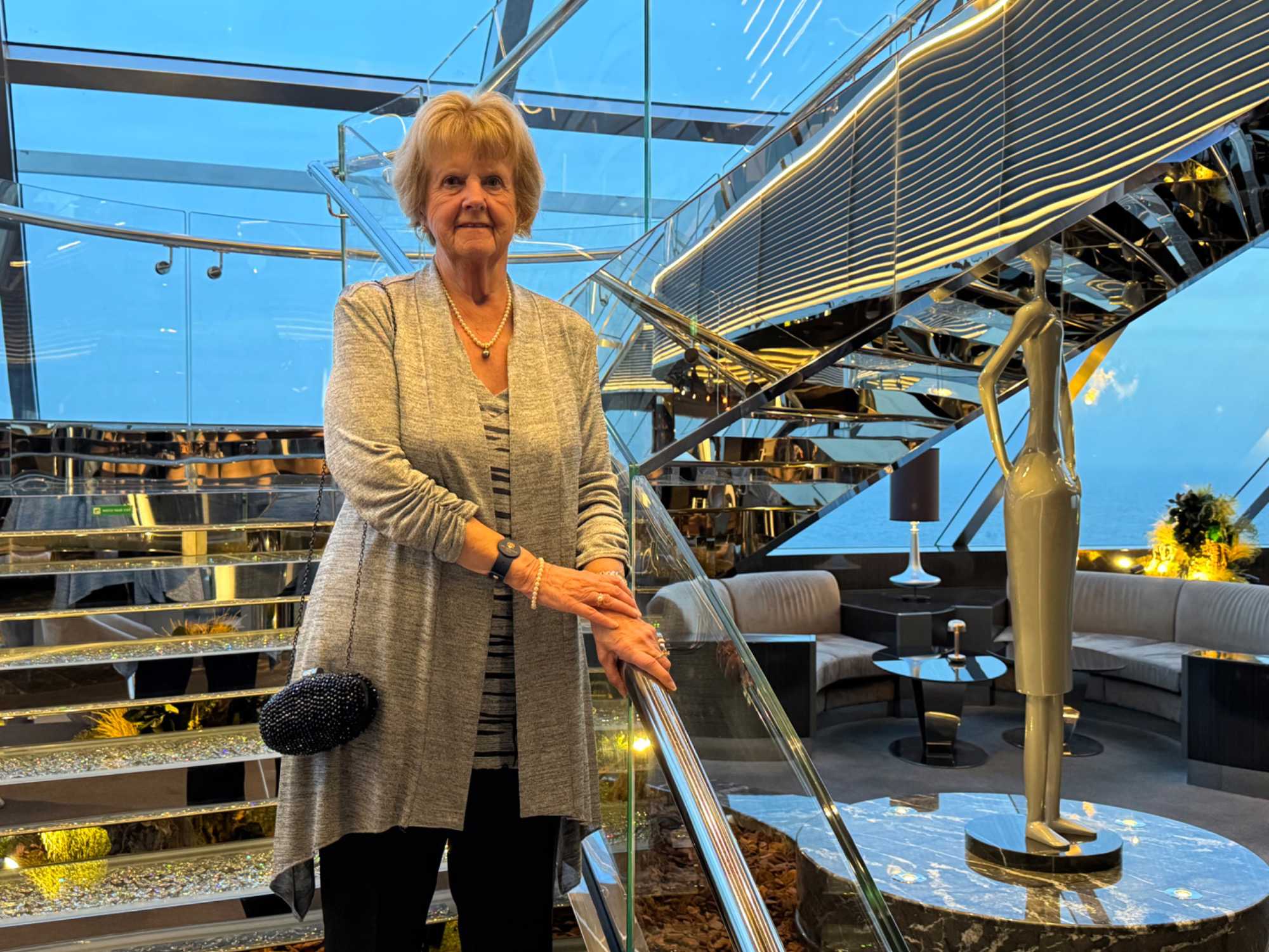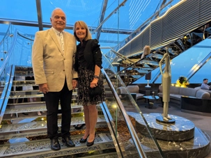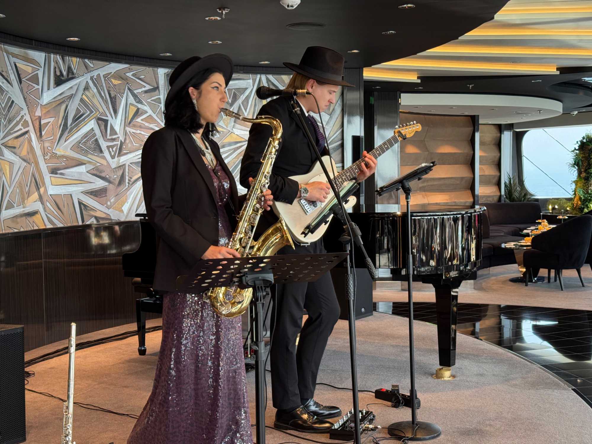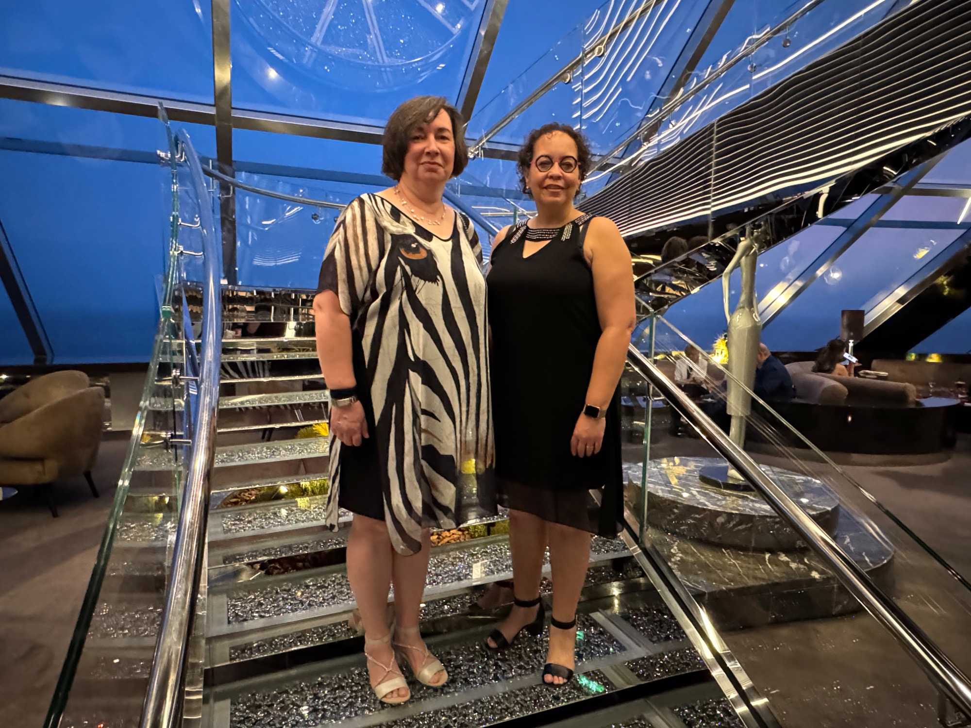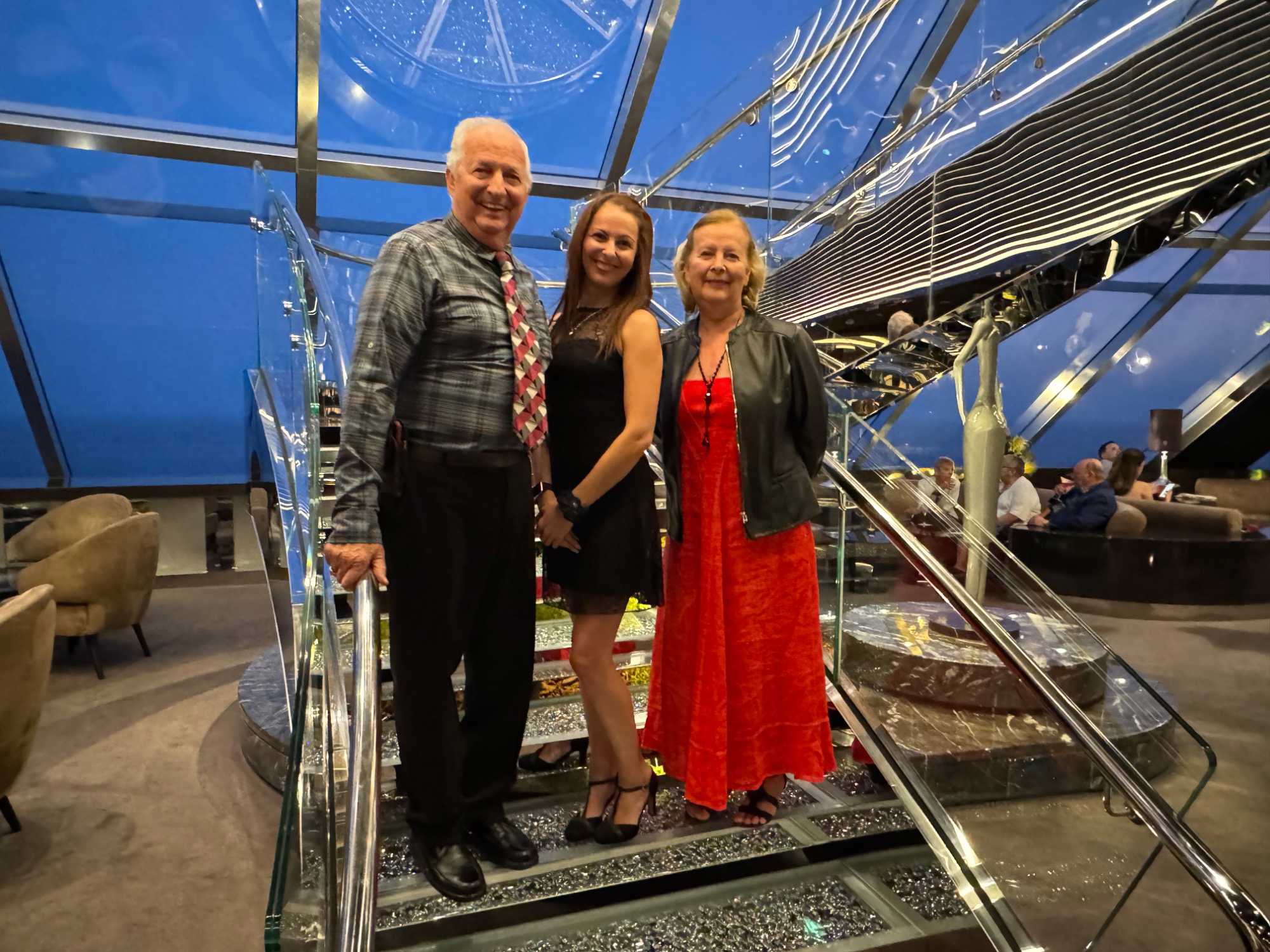En soirée, le navire se pare d’une atmosphère raffinée pour la soirée chic. Les salons et le restaurant du Yacht Club vibrent d’une ambiance festive et distinguée. Le souper, soigneusement préparé, est à la hauteur de l’événement, tant par la qualité des plats que par l’excellence du service. Au moment du dessert, une attention toute spéciale vient émouvoir la table : nos serveurs offrent un magnifique gâteau d’anniversaire à Danielle, qui célèbre aujourd’hui sa fête. Un moment chaleureux et joyeux, partagé dans les applaudissements et la bonne humeur.