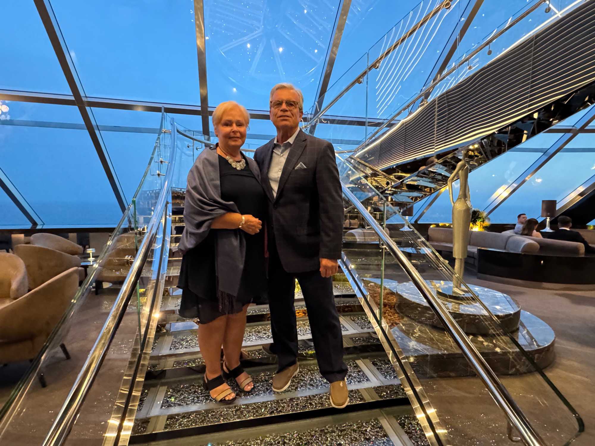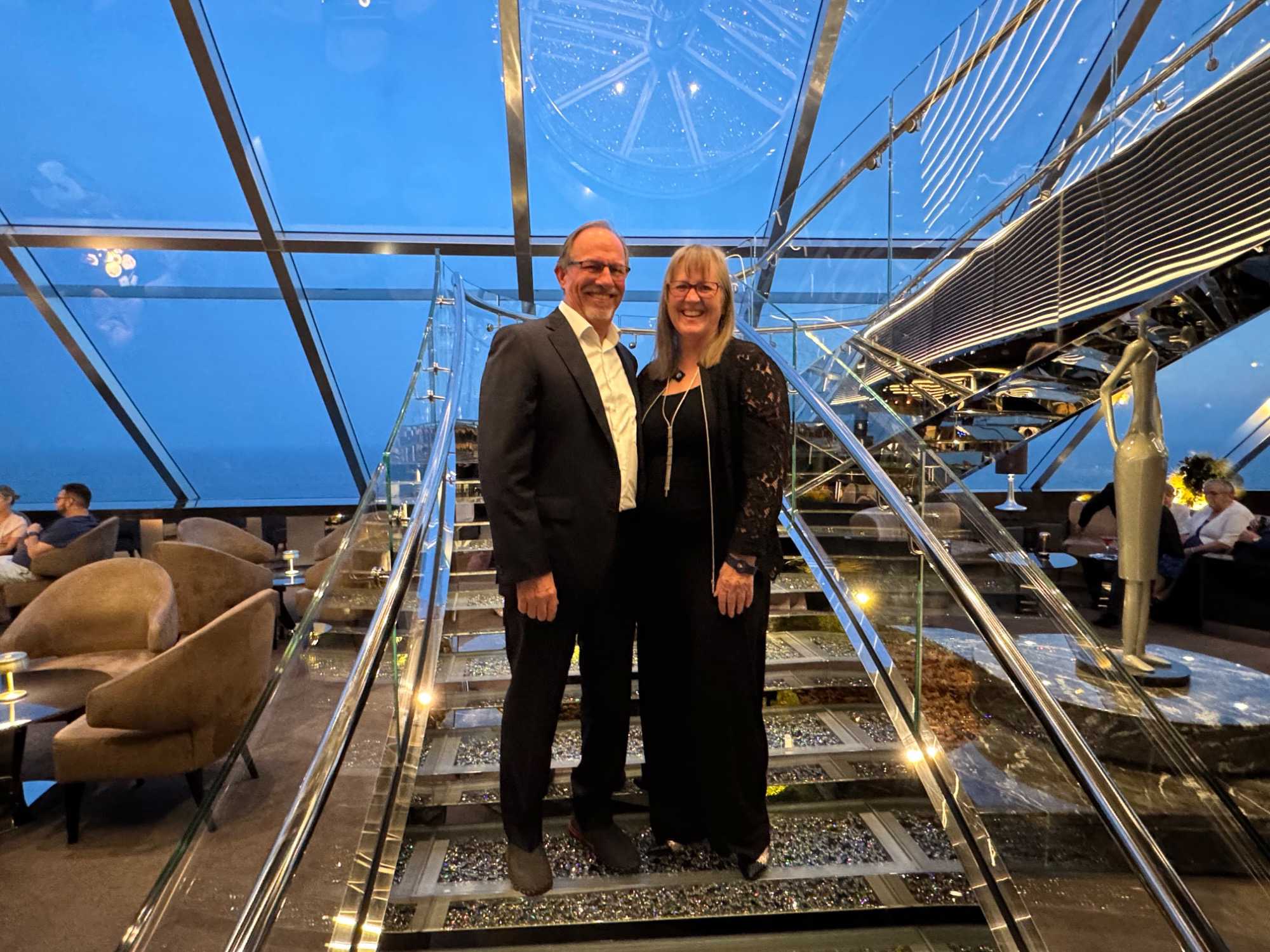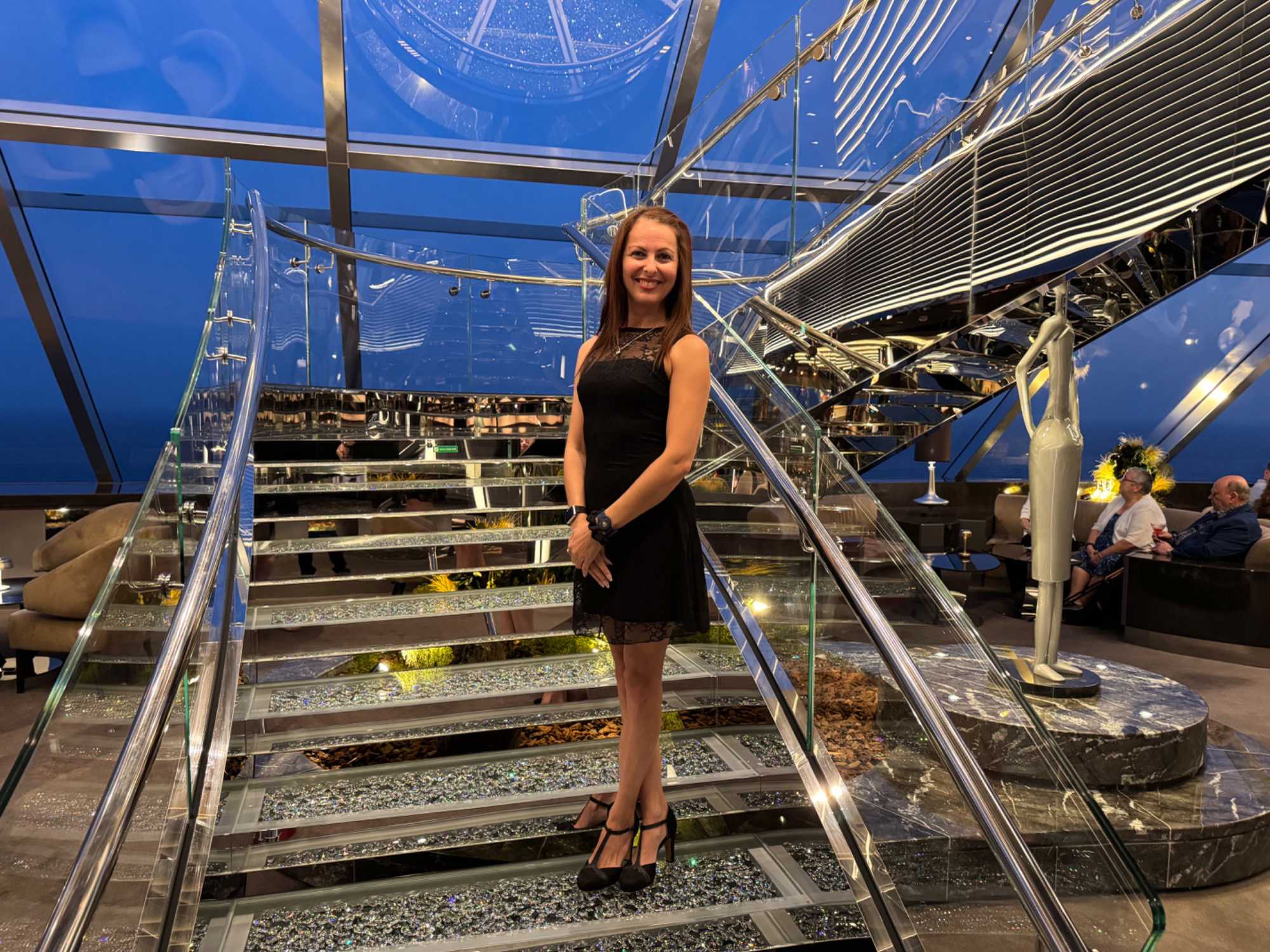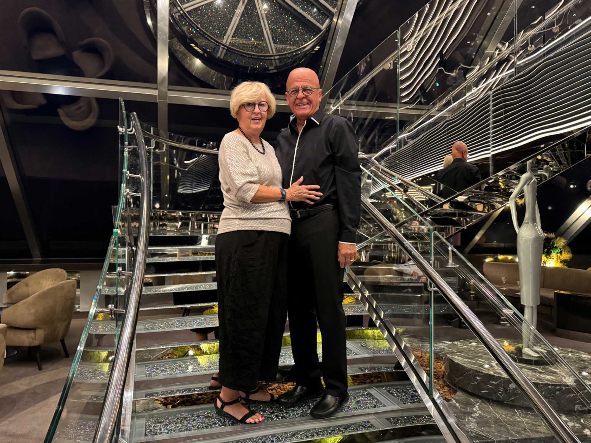 En soirée, le navire se pare d’une atmosphère raffinée pour la soirée chic. Les salons et le restaurant du Yacht Club vibrent d’une ambiance festive et distinguée. Le souper, soigneusement préparé, est à la hauteur de l’événement, tant par la qualité des plats que par l’excellence du service. Au moment du dessert, une attention toute spéciale vient émouvoir la table : nos serveurs offrent un magnifique gâteau d’anniversaire à Danielle, qui célèbre aujourd’hui sa fête. Un moment chaleureux et joyeux, partagé dans les applaudissements et la bonne humeur.