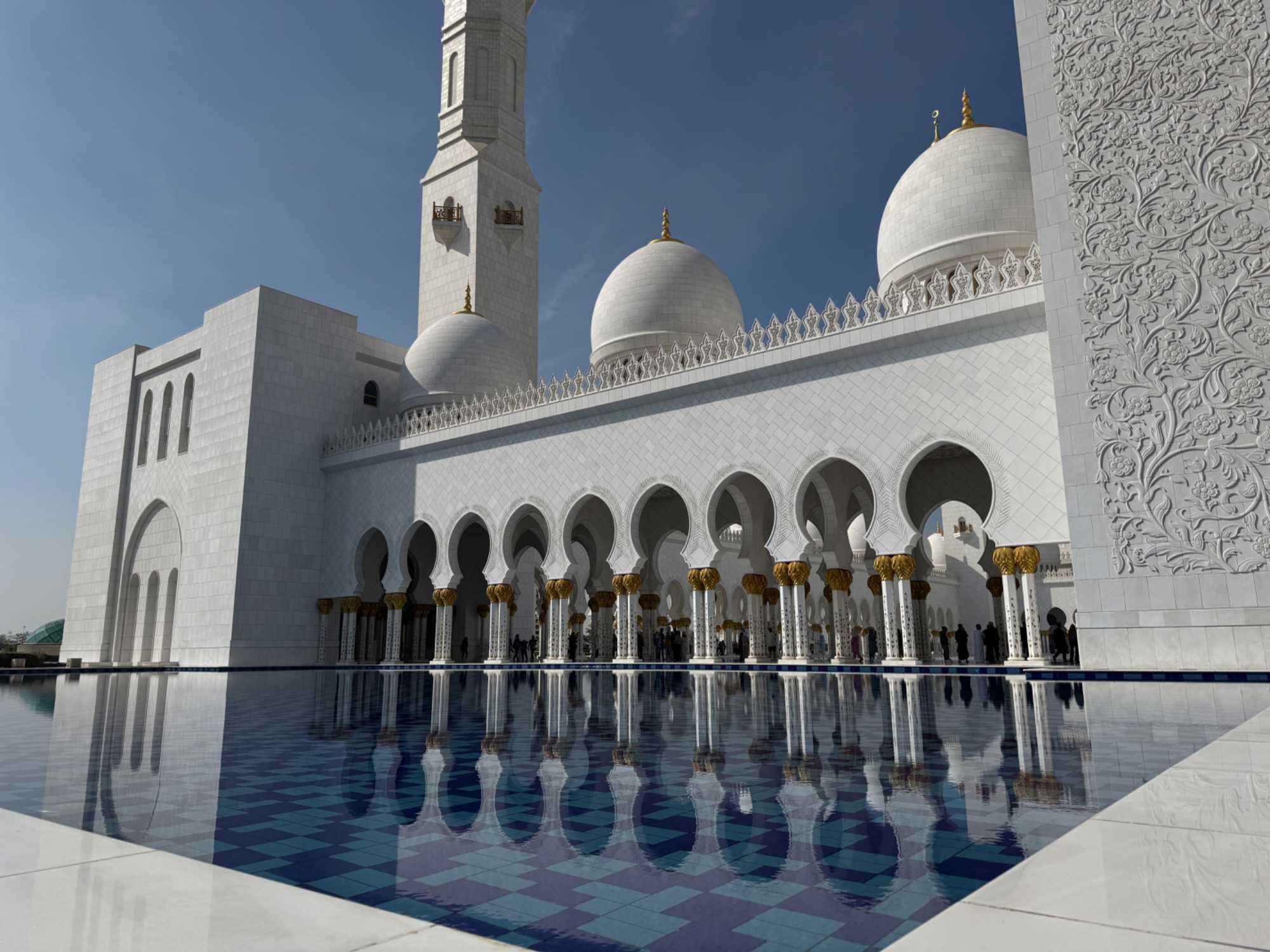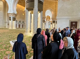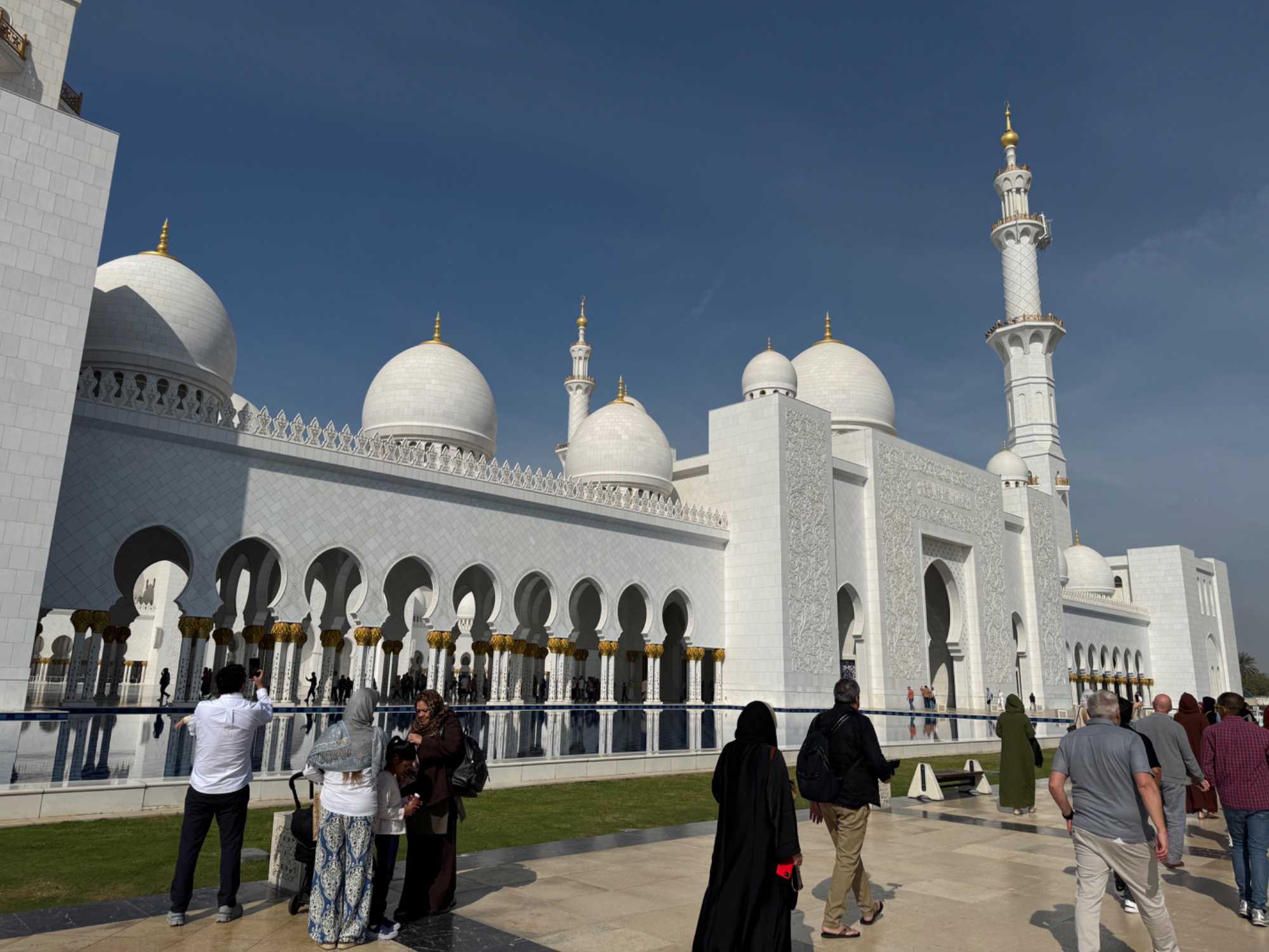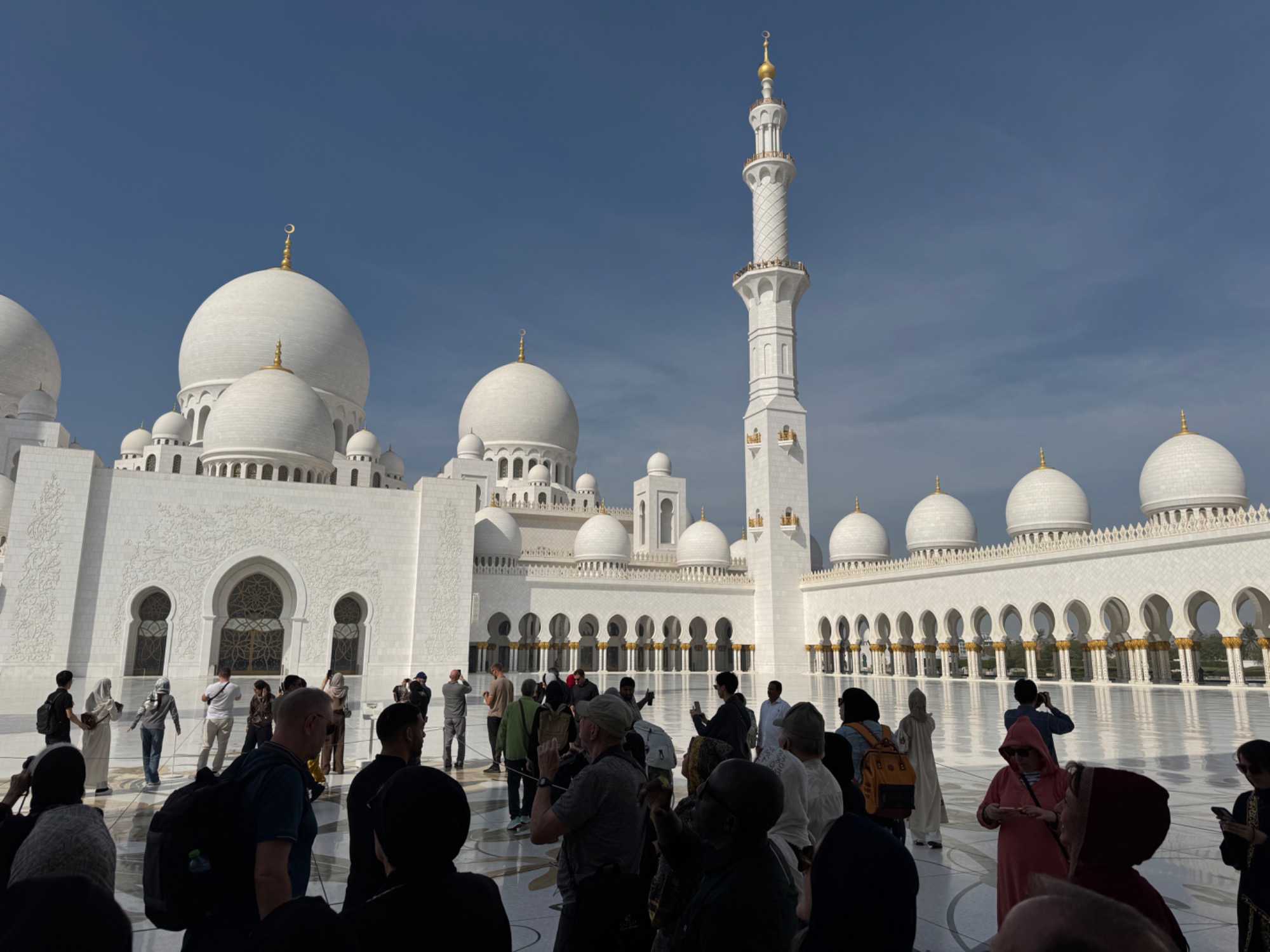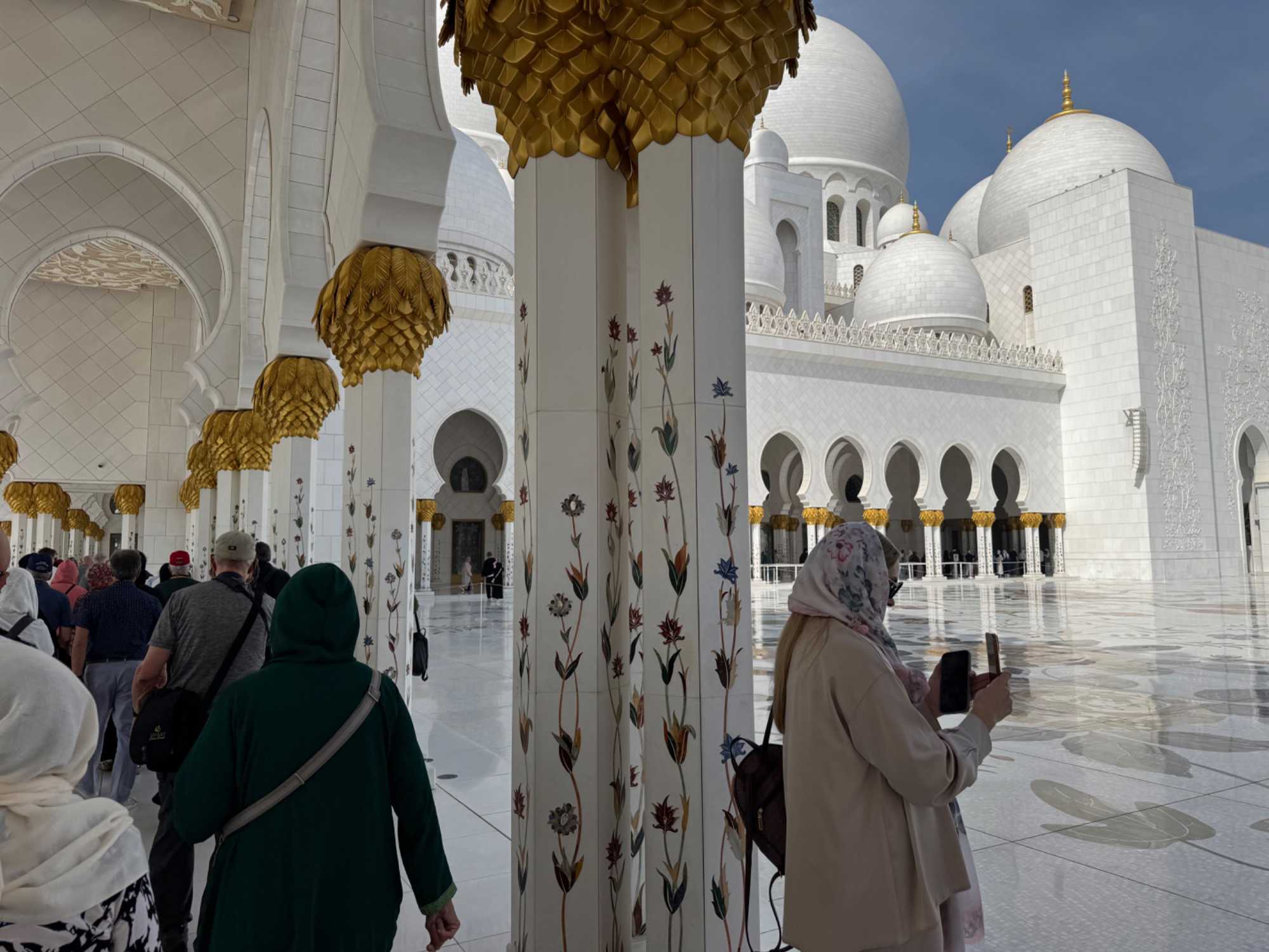 Vers 8 h 40, nous prenons la route vers la Grande Mosquée Sheikh Zayed, l’un des plus impressionnants chefs-d’œuvre architecturaux du monde islamique et véritable symbole spirituel des Émirats. Conçue comme un lieu d’unité et d’ouverture, elle peut accueillir jusqu’à 40 000 fidèles. L’arrivée sur le site est saisissante : 82 dômes immaculés, plus de 1 000 colonnes et des lustres ornés d’or 24 carats suscitent l’émerveillement dès le premier regard. La salle de prière principale abrite le plus grand tapis noué à la main au monde ainsi qu’un lustre monumental de 10 mètres de diamètre, 15 mètres de hauteur et pesant 12 tonnes. La sérénité du lieu, la noblesse des matériaux et la richesse symbolique confèrent à cette visite un caractère inoubliable. Le cheikh Zayed lui-même repose sur le site, ajoutant une dimension profondément émotive à l’expérience.