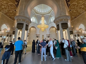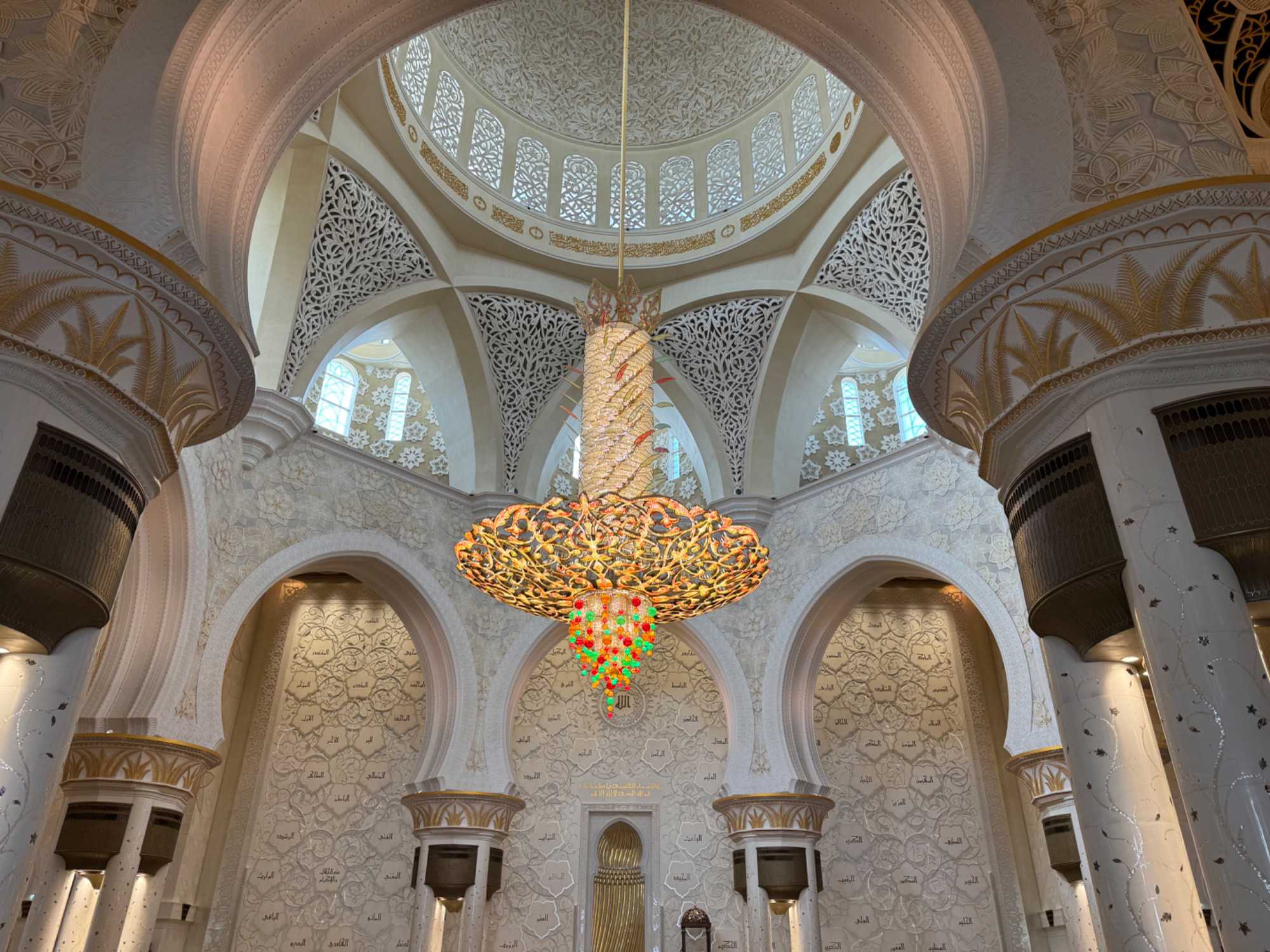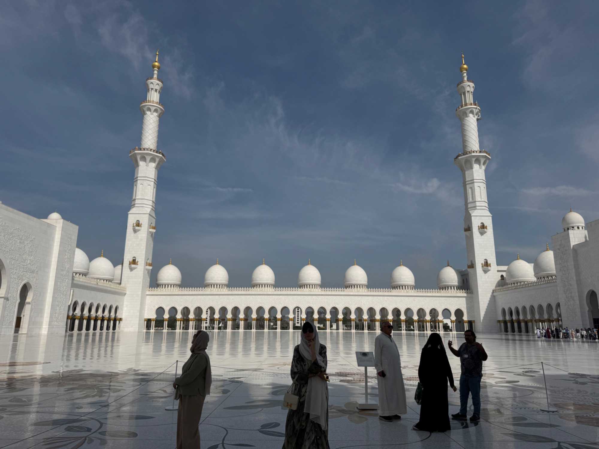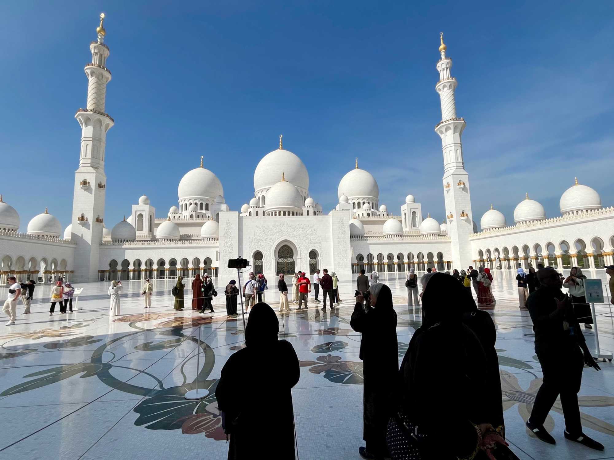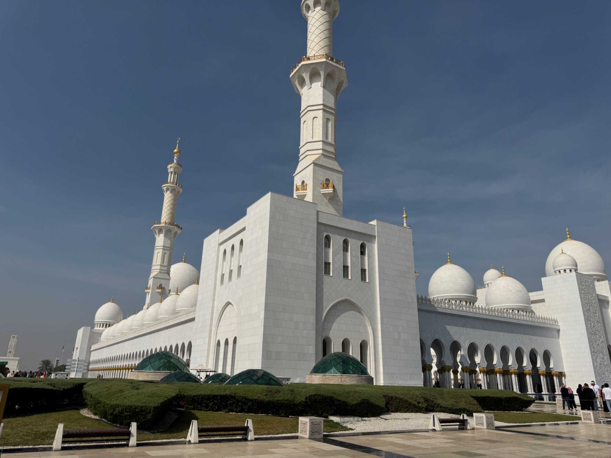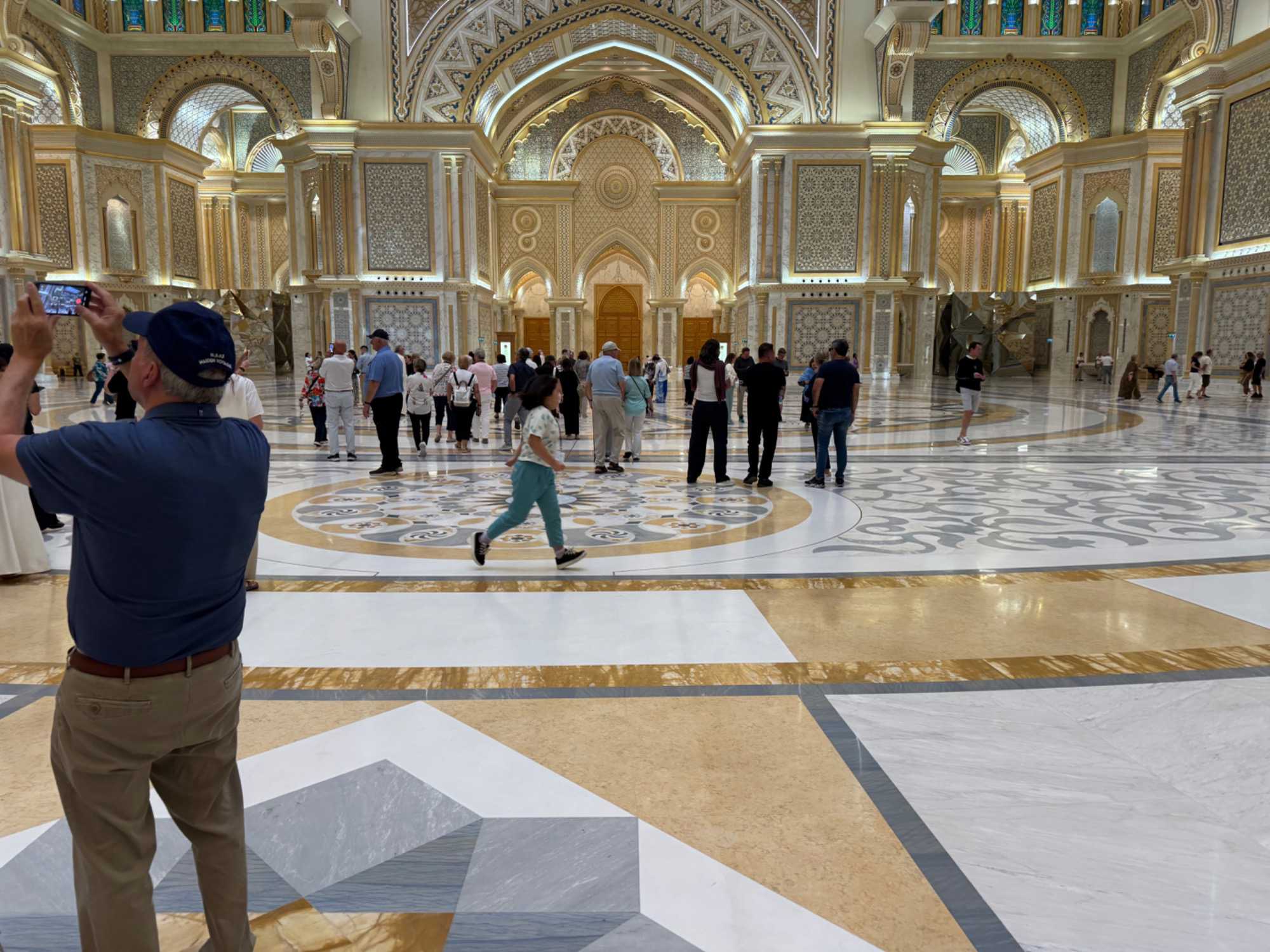 Vers 8 h 40, nous prenons la route vers la Grande Mosquée Sheikh Zayed, l’un des plus impressionnants chefs-d’œuvre architecturaux du monde islamique et véritable symbole spirituel des Émirats. Conçue comme un lieu d’unité et d’ouverture, elle peut accueillir jusqu’à 40 000 fidèles. L’arrivée sur le site est saisissante : 82 dômes immaculés, plus de 1 000 colonnes et des lustres ornés d’or 24 carats suscitent l’émerveillement dès le premier regard. La salle de prière principale abrite le plus grand tapis noué à la main au monde ainsi qu’un lustre monumental de 10 mètres de diamètre, 15 mètres de hauteur et pesant 12 tonnes. La sérénité du lieu, la noblesse des matériaux et la richesse symbolique confèrent à cette visite un caractère inoubliable. Le cheikh Zayed lui-même repose sur le site, ajoutant une dimension profondément émotive à l’expérience.