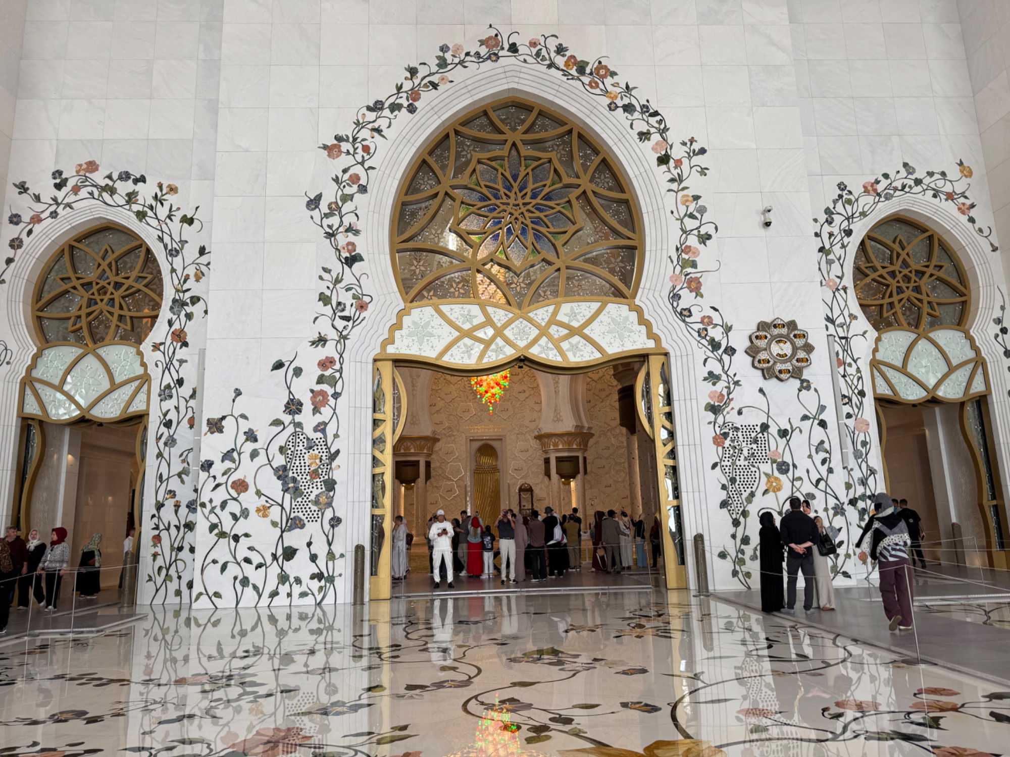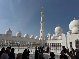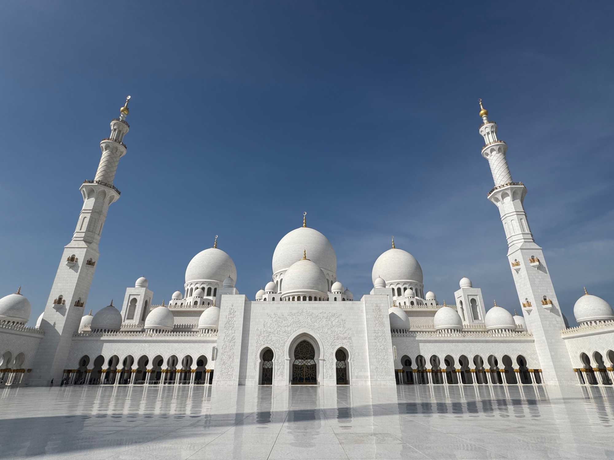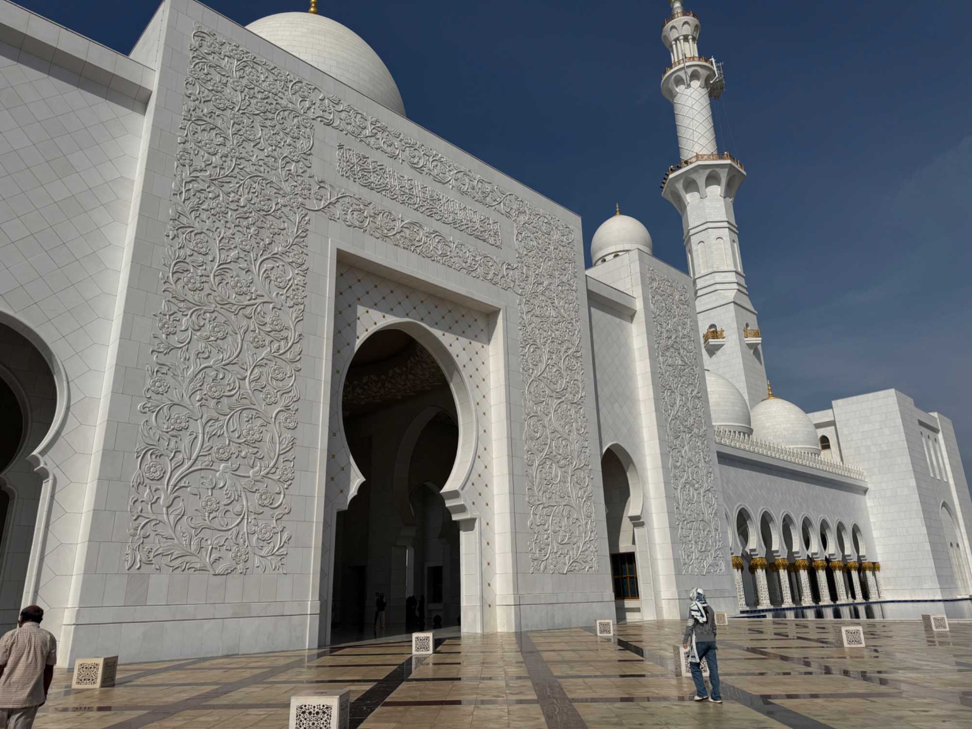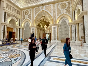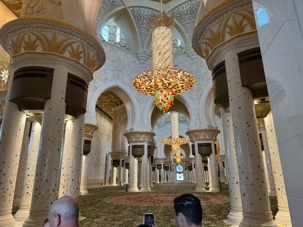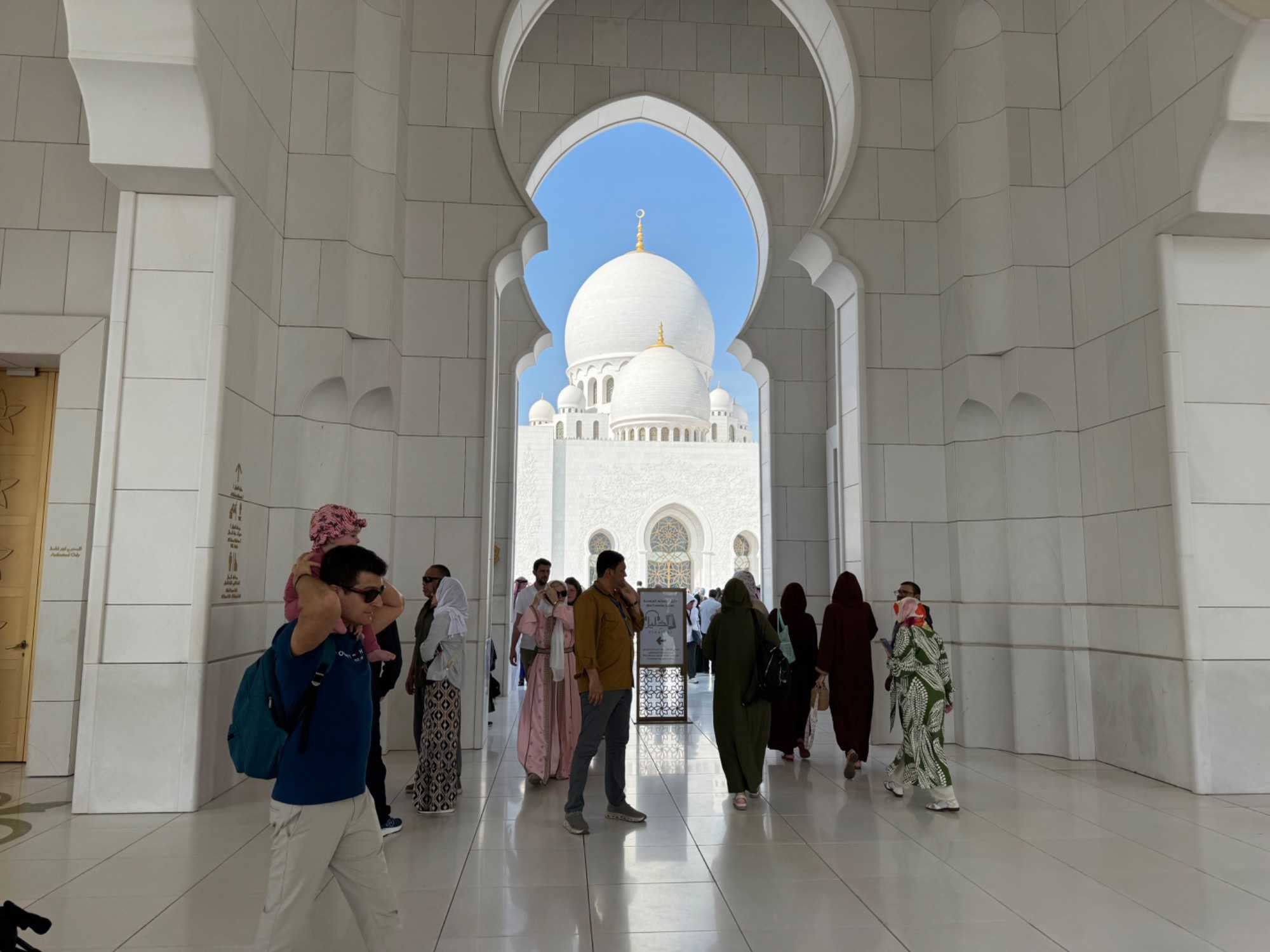 Vers 8 h 40, nous prenons la route vers la Grande Mosquée Sheikh Zayed, l’un des plus impressionnants chefs-d’œuvre architecturaux du monde islamique et véritable symbole spirituel des Émirats. Conçue comme un lieu d’unité et d’ouverture, elle peut accueillir jusqu’à 40 000 fidèles. L’arrivée sur le site est saisissante : 82 dômes immaculés, plus de 1 000 colonnes et des lustres ornés d’or 24 carats suscitent l’émerveillement dès le premier regard. La salle de prière principale abrite le plus grand tapis noué à la main au monde ainsi qu’un lustre monumental de 10 mètres de diamètre, 15 mètres de hauteur et pesant 12 tonnes. La sérénité du lieu, la noblesse des matériaux et la richesse symbolique confèrent à cette visite un caractère inoubliable. Le cheikh Zayed lui-même repose sur le site, ajoutant une dimension profondément émotive à l’expérience.