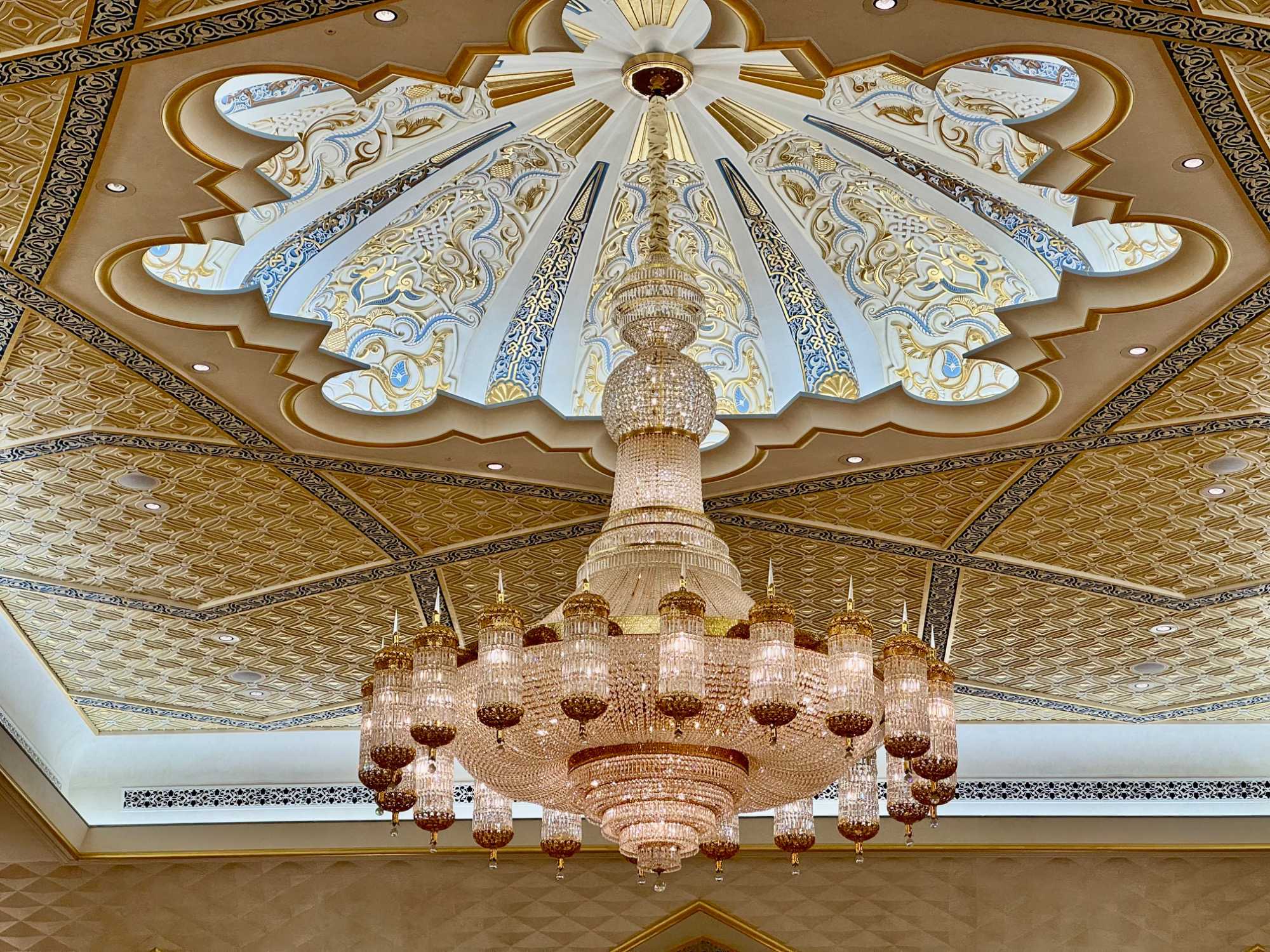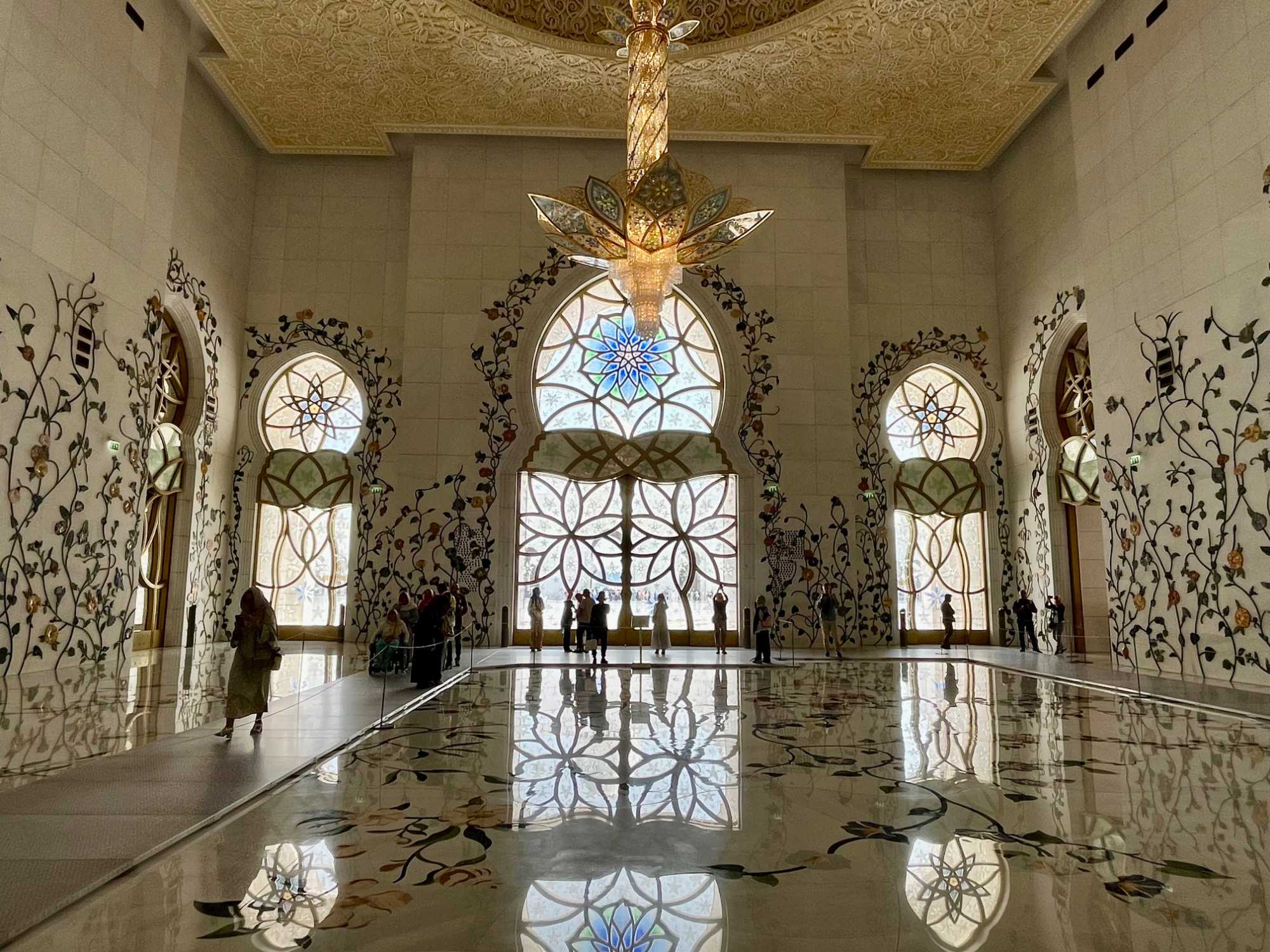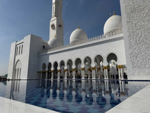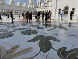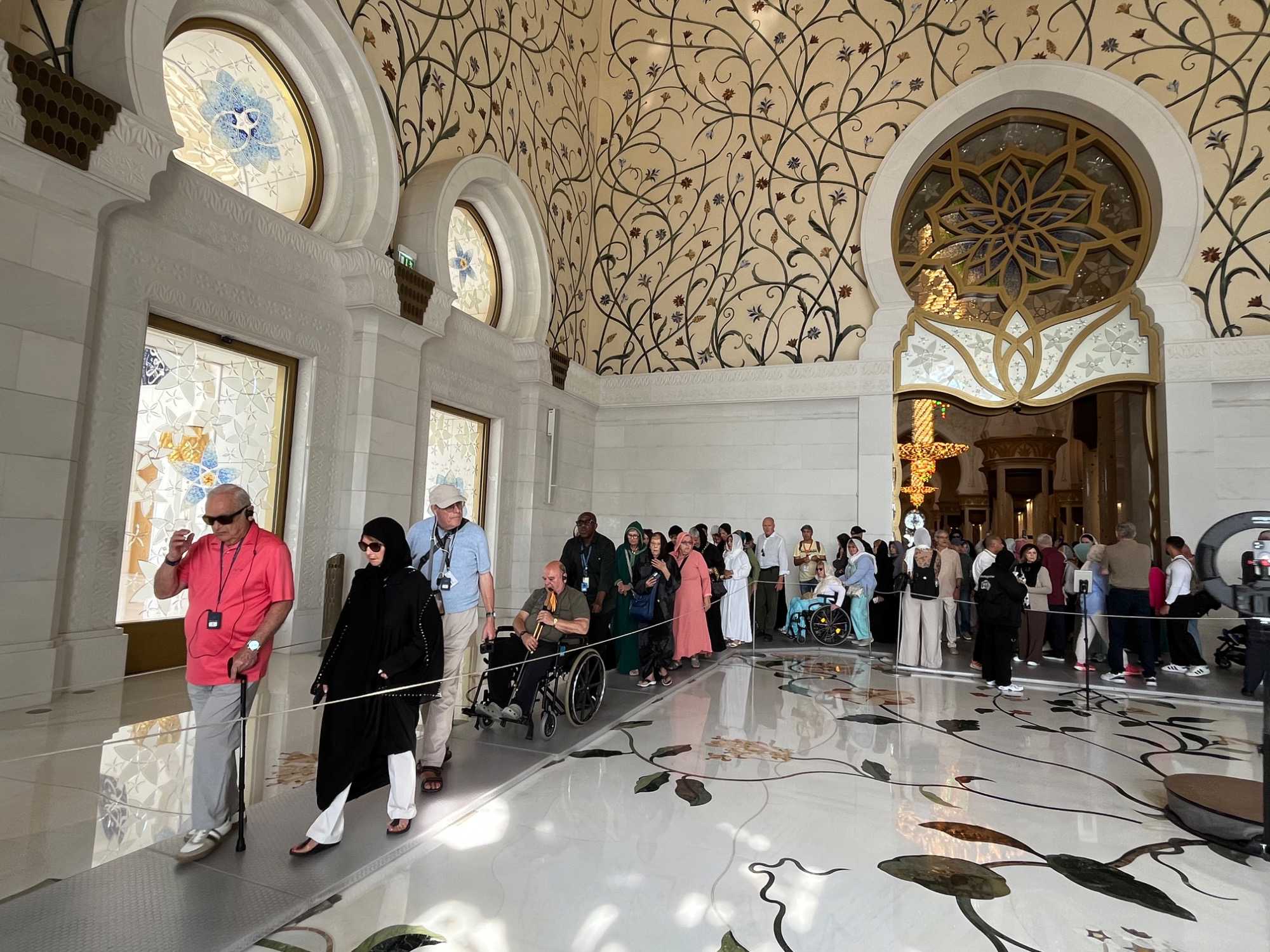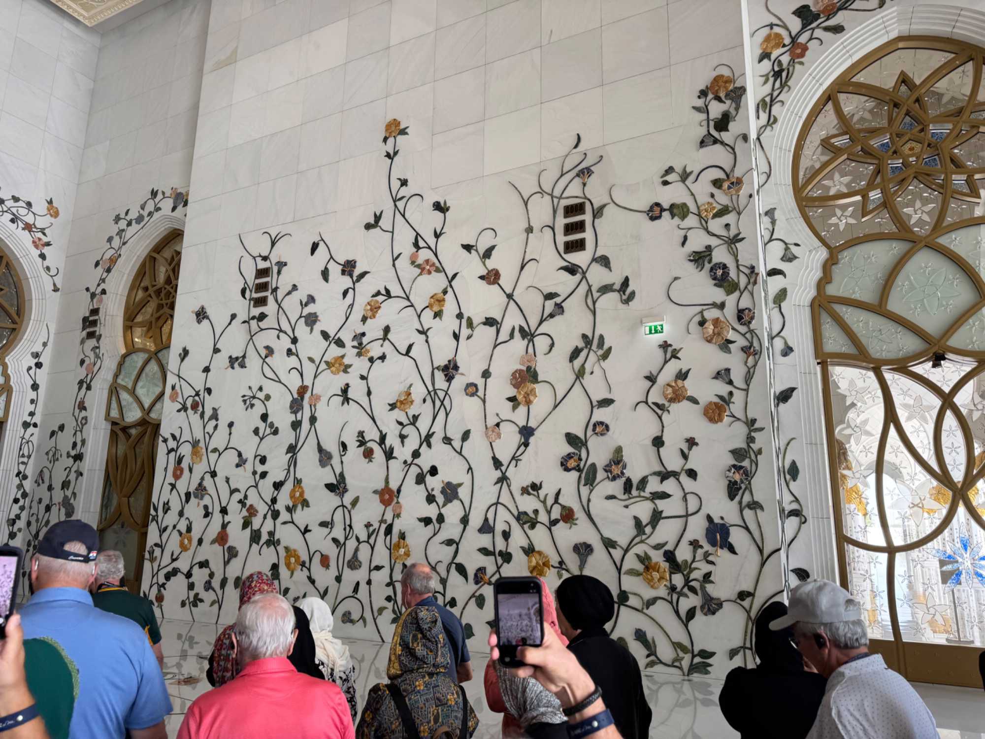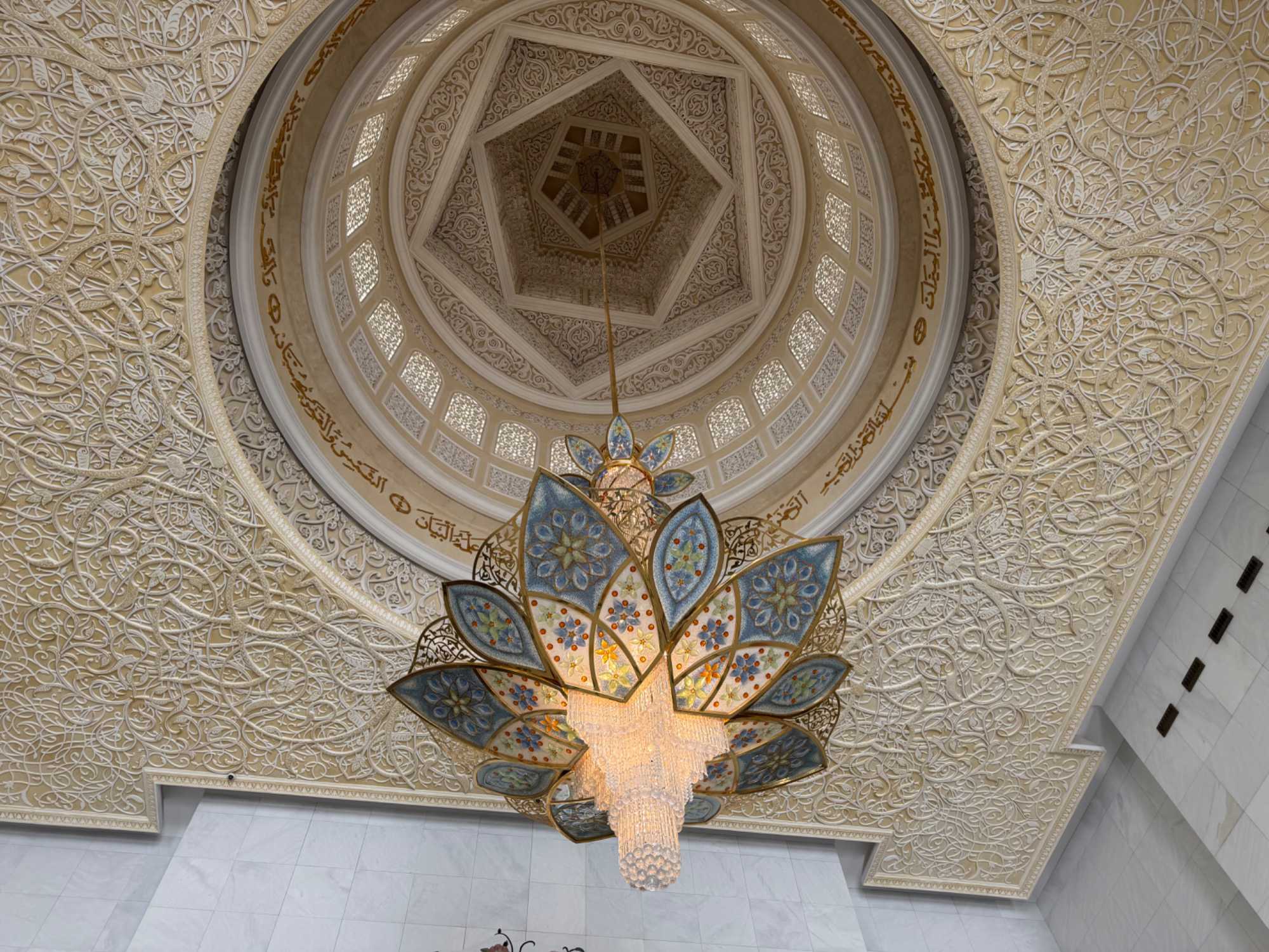 Vers 8 h 40, nous prenons la route vers la Grande Mosquée Sheikh Zayed, l’un des plus impressionnants chefs-d’œuvre architecturaux du monde islamique et véritable symbole spirituel des Émirats. Conçue comme un lieu d’unité et d’ouverture, elle peut accueillir jusqu’à 40 000 fidèles. L’arrivée sur le site est saisissante : 82 dômes immaculés, plus de 1 000 colonnes et des lustres ornés d’or 24 carats suscitent l’émerveillement dès le premier regard. La salle de prière principale abrite le plus grand tapis noué à la main au monde ainsi qu’un lustre monumental de 10 mètres de diamètre, 15 mètres de hauteur et pesant 12 tonnes. La sérénité du lieu, la noblesse des matériaux et la richesse symbolique confèrent à cette visite un caractère inoubliable. Le cheikh Zayed lui-même repose sur le site, ajoutant une dimension profondément émotive à l’expérience.