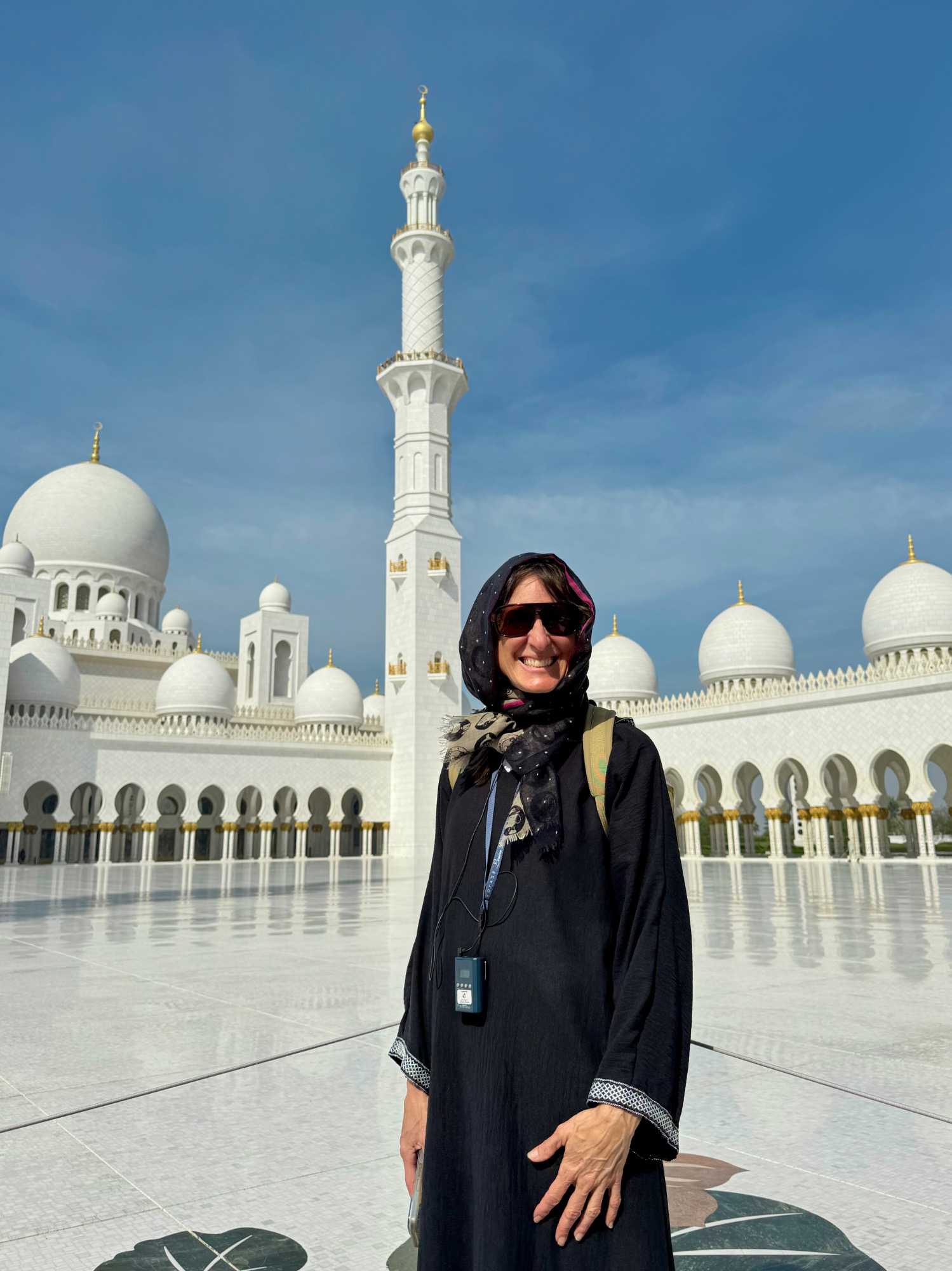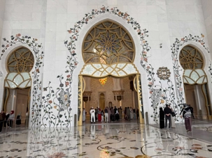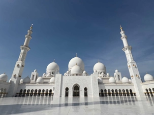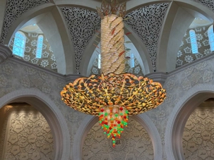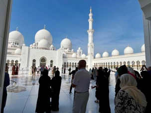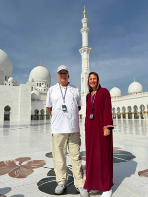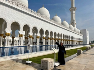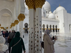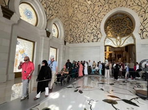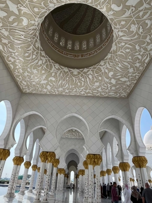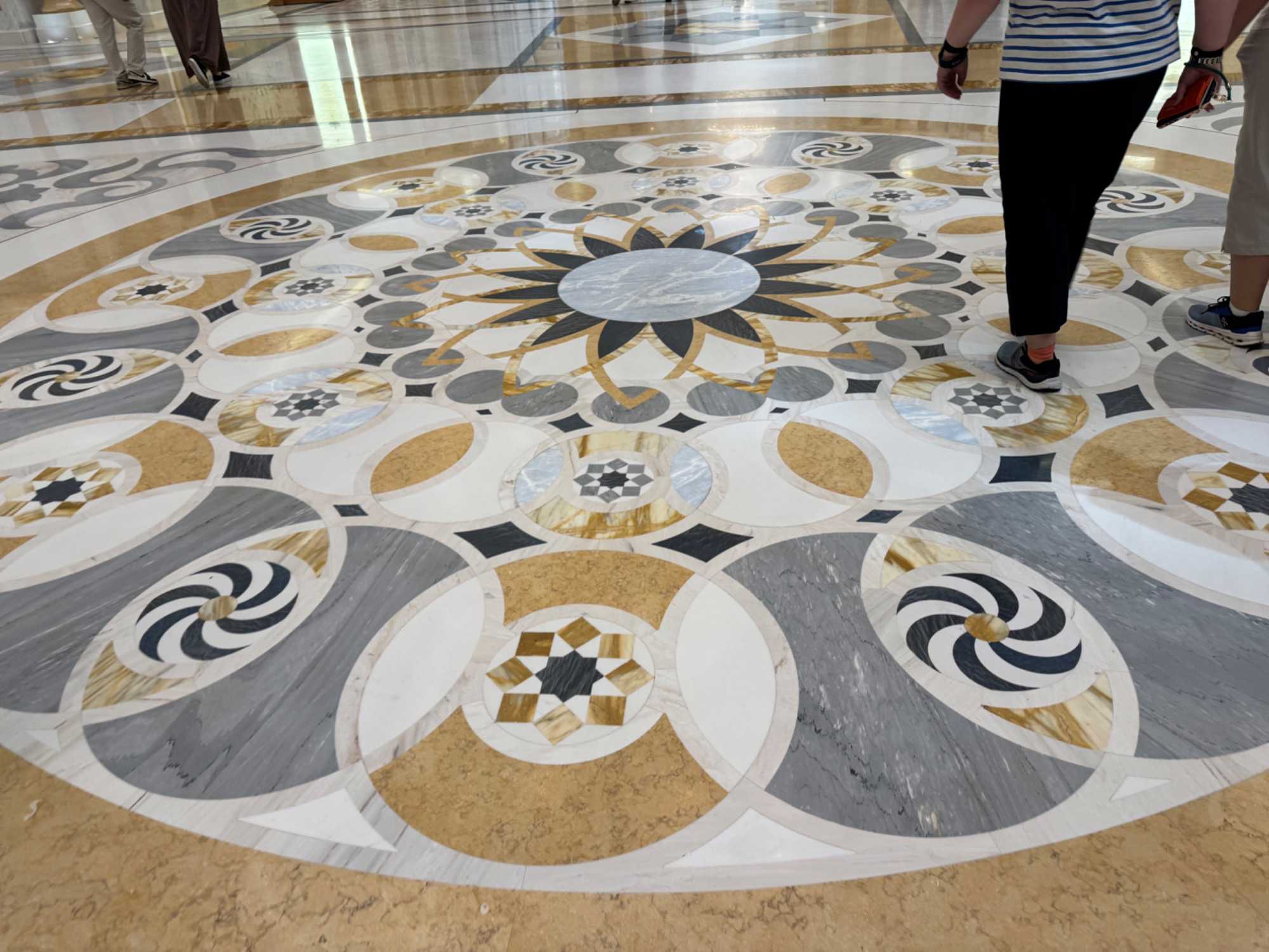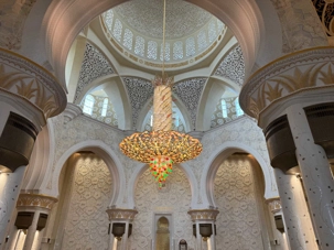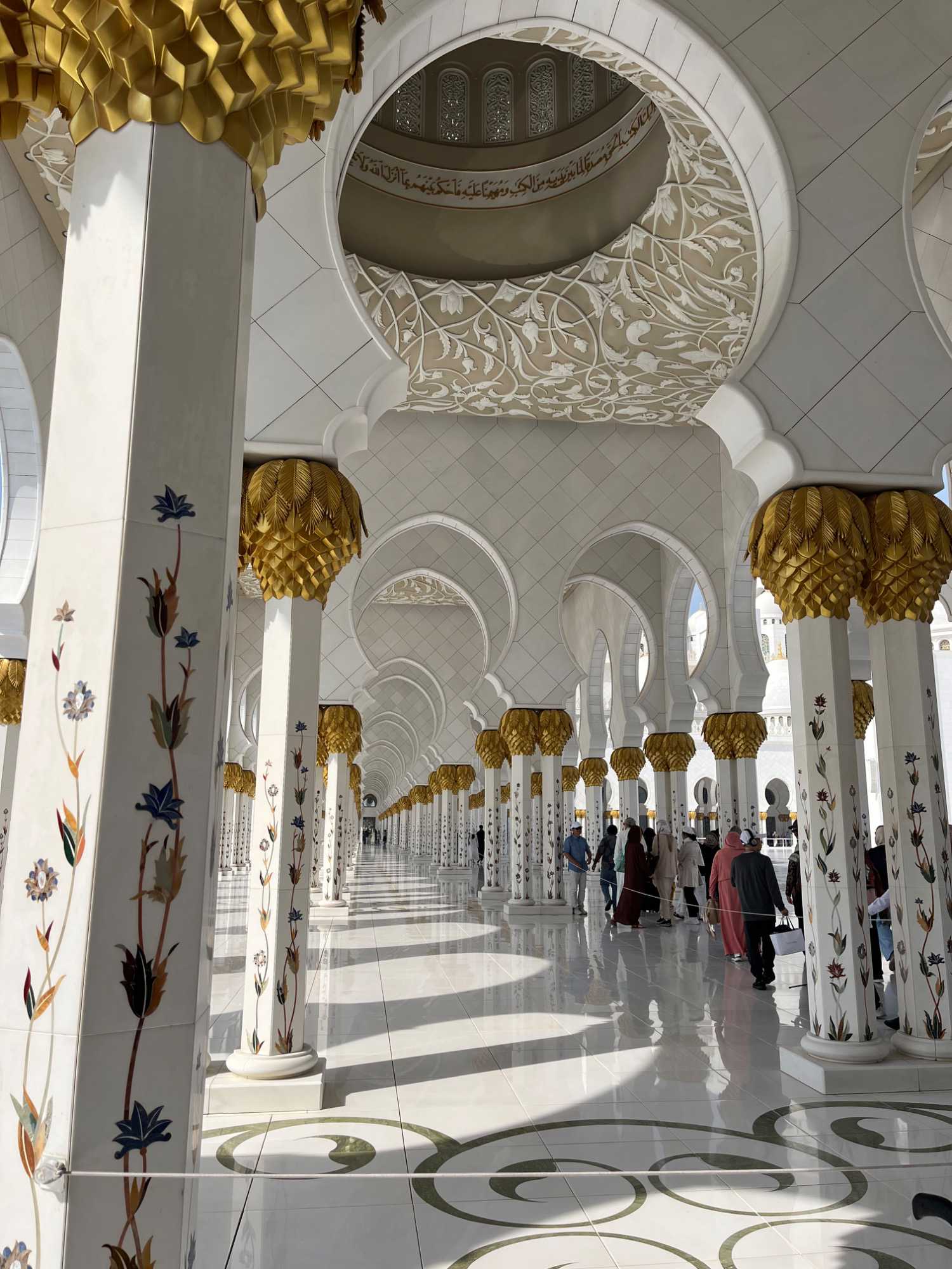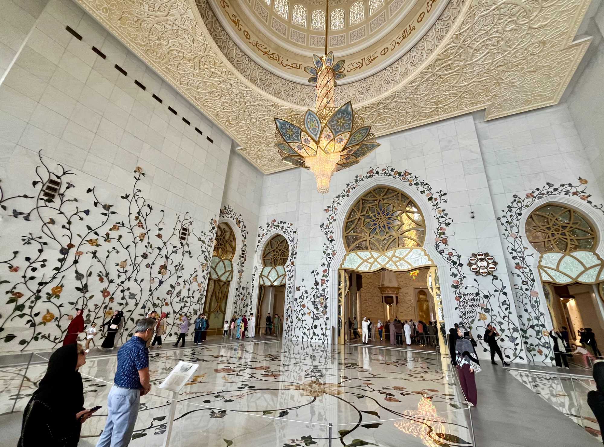 Vers 8 h 40, nous prenons la route vers la Grande Mosquée Sheikh Zayed, l’un des plus impressionnants chefs-d’œuvre architecturaux du monde islamique et véritable symbole spirituel des Émirats. Conçue comme un lieu d’unité et d’ouverture, elle peut accueillir jusqu’à 40 000 fidèles. L’arrivée sur le site est saisissante : 82 dômes immaculés, plus de 1 000 colonnes et des lustres ornés d’or 24 carats suscitent l’émerveillement dès le premier regard. La salle de prière principale abrite le plus grand tapis noué à la main au monde ainsi qu’un lustre monumental de 10 mètres de diamètre, 15 mètres de hauteur et pesant 12 tonnes. La sérénité du lieu, la noblesse des matériaux et la richesse symbolique confèrent à cette visite un caractère inoubliable. Le cheikh Zayed lui-même repose sur le site, ajoutant une dimension profondément émotive à l’expérience.