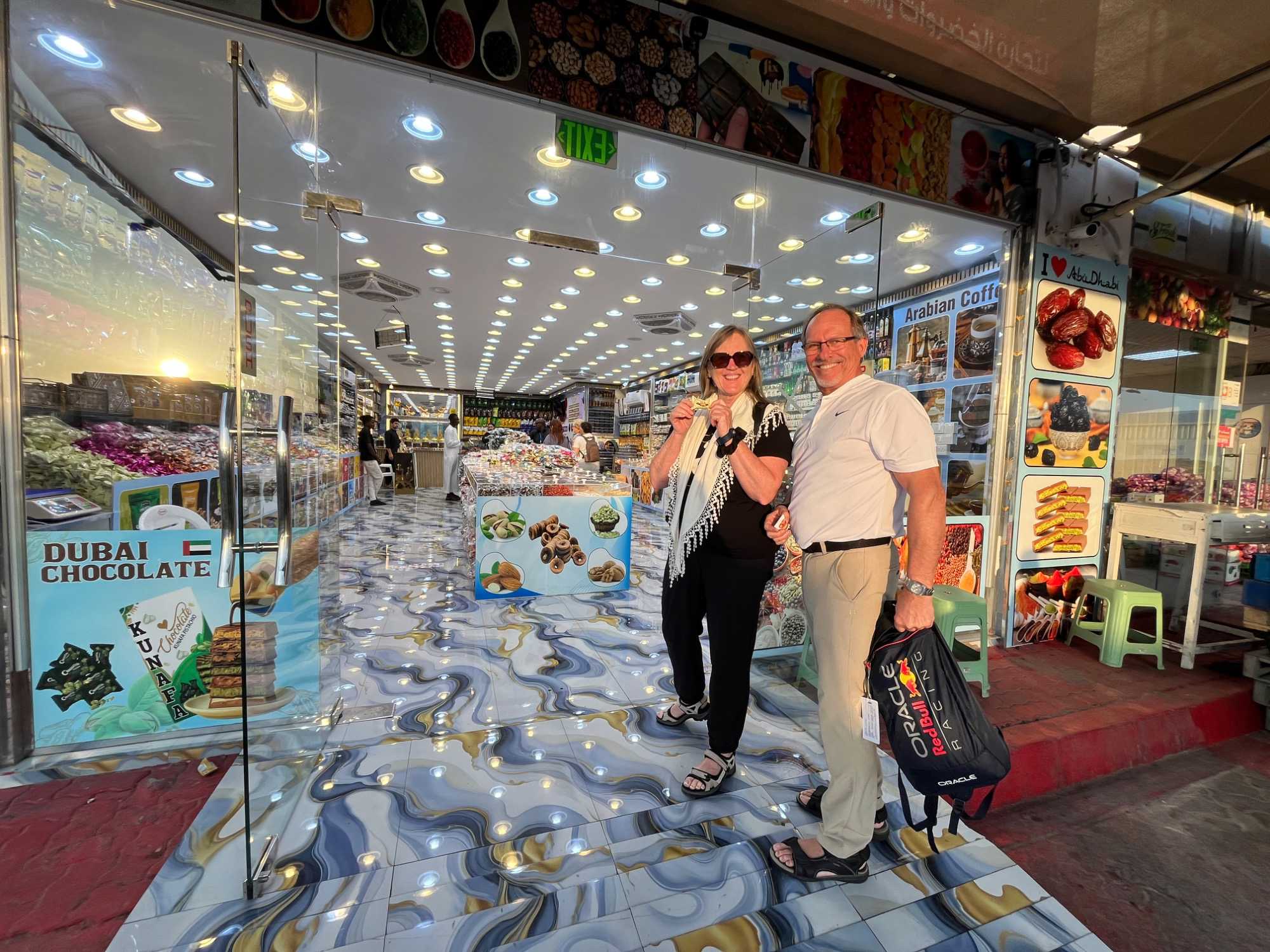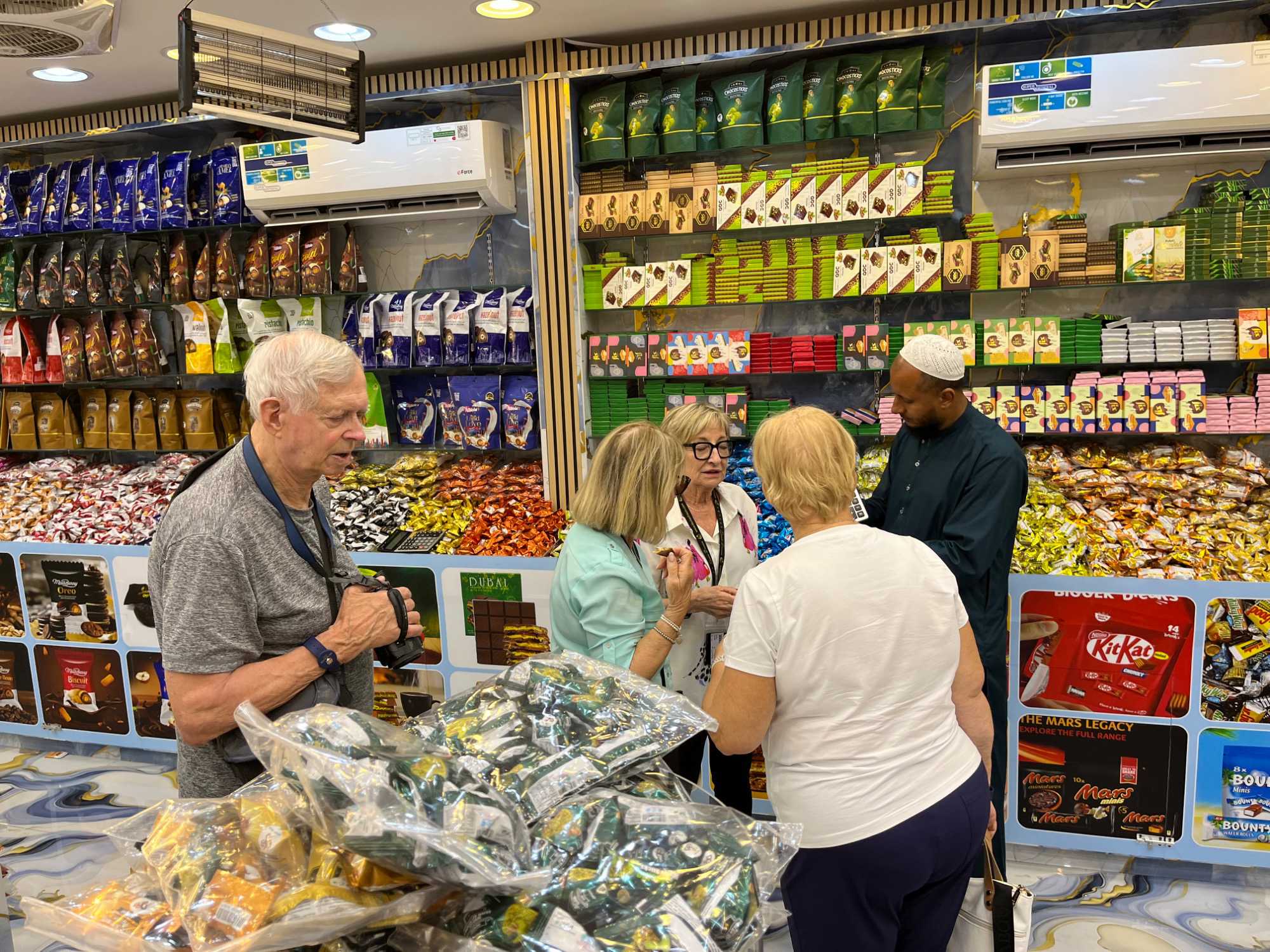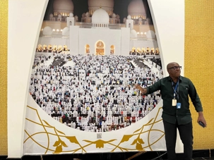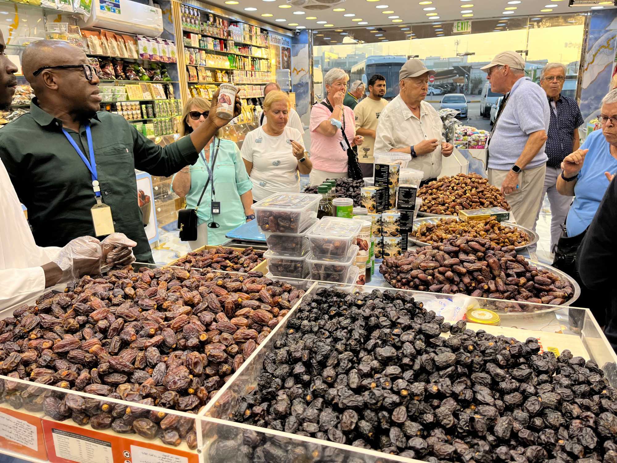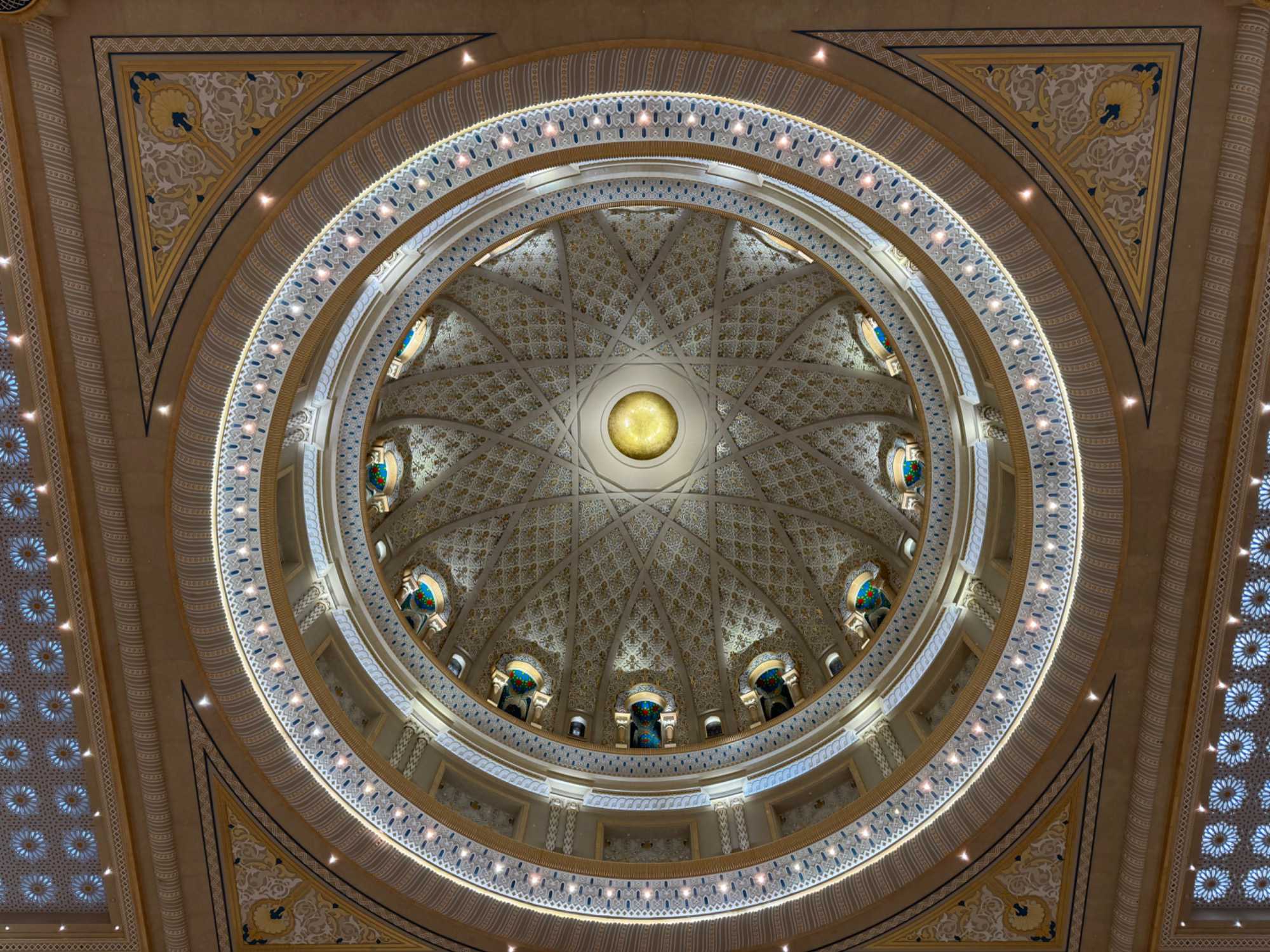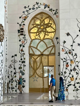 Vers 8 h 40, nous prenons la route vers la Grande Mosquée Sheikh Zayed, l’un des plus impressionnants chefs-d’œuvre architecturaux du monde islamique et véritable symbole spirituel des Émirats. Conçue comme un lieu d’unité et d’ouverture, elle peut accueillir jusqu’à 40 000 fidèles. L’arrivée sur le site est saisissante : 82 dômes immaculés, plus de 1 000 colonnes et des lustres ornés d’or 24 carats suscitent l’émerveillement dès le premier regard. La salle de prière principale abrite le plus grand tapis noué à la main au monde ainsi qu’un lustre monumental de 10 mètres de diamètre, 15 mètres de hauteur et pesant 12 tonnes. La sérénité du lieu, la noblesse des matériaux et la richesse symbolique confèrent à cette visite un caractère inoubliable. Le cheikh Zayed lui-même repose sur le site, ajoutant une dimension profondément émotive à l’expérience.