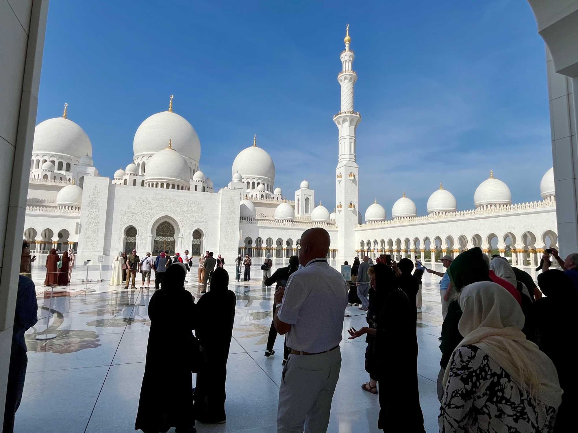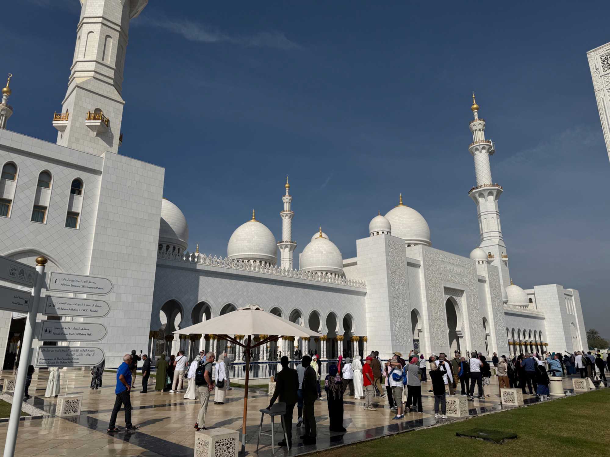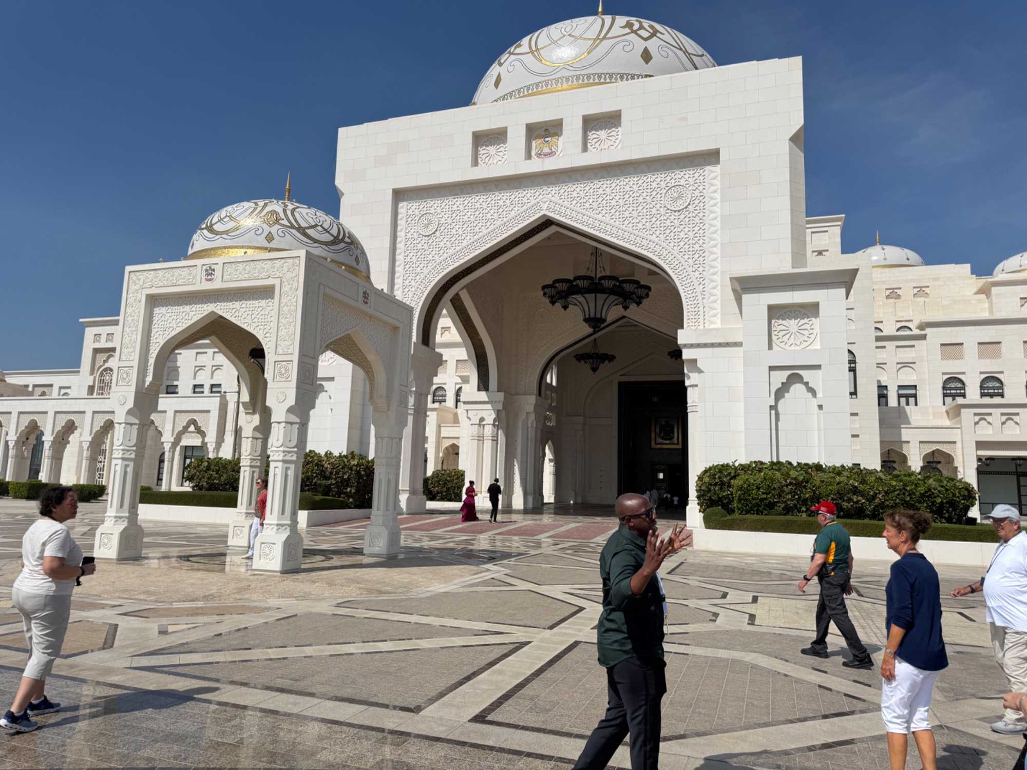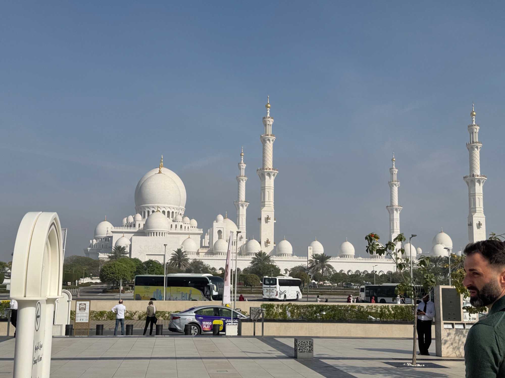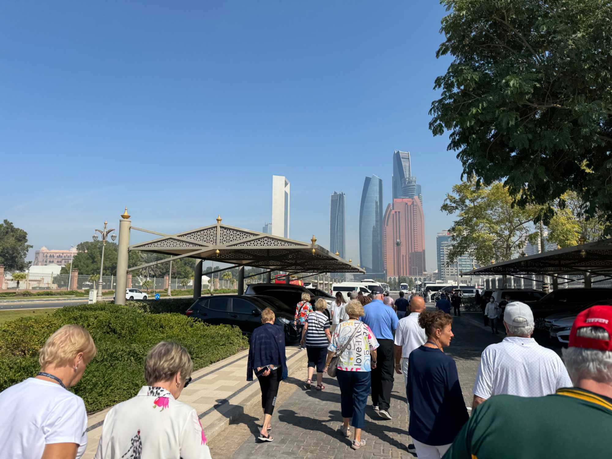Dès notre descente du navire, nous sommes chaleureusement accueillis par Achille, notre guide francophone, qui nous avait accompagnés lors de nos premiers jours à Dubaï. Nous sommes tous très heureux de le retrouver, car nous l’avions grandement apprécié. Ensemble, nous débutons un tour panoramique de la ville. Au fil des kilomètres, Abou Dhabi révèle l’ampleur de son développement, rendu possible notamment grâce à ses importantes réserves pétrolières, tout en demeurant fidèle à la vision de son fondateur, le cheikh Zayed bin Sultan Al Nahyan : un développement moderne solidement ancré dans les valeurs culturelles et religieuses du pays.