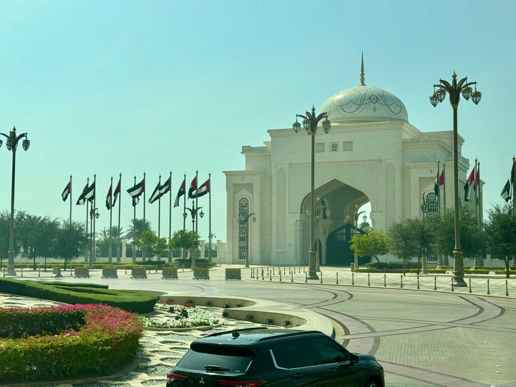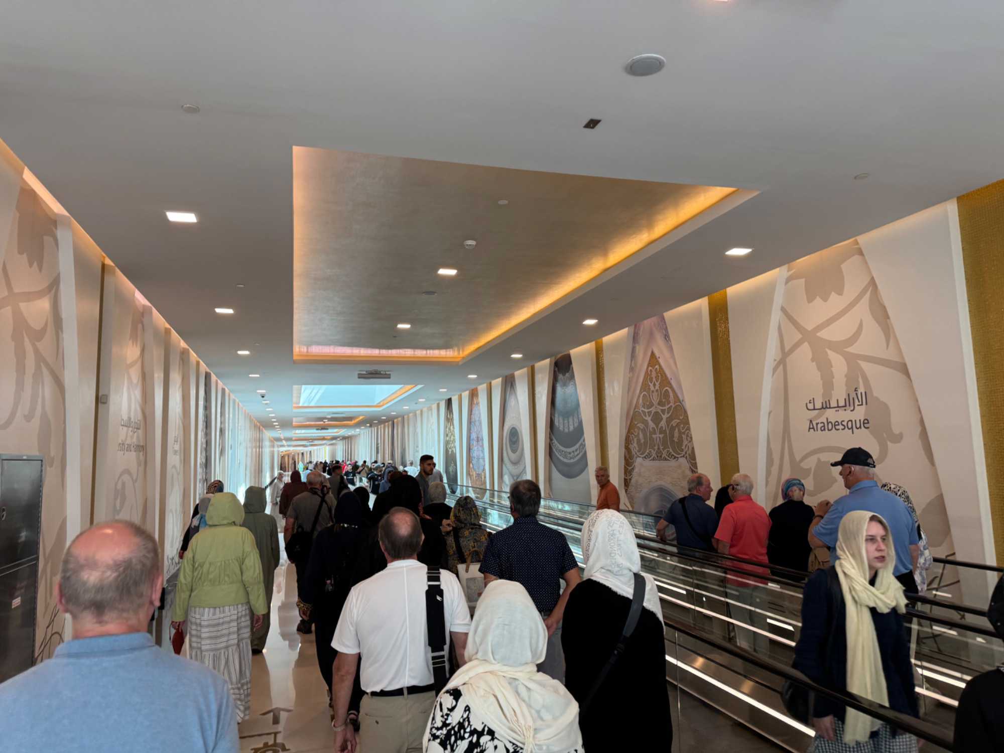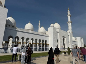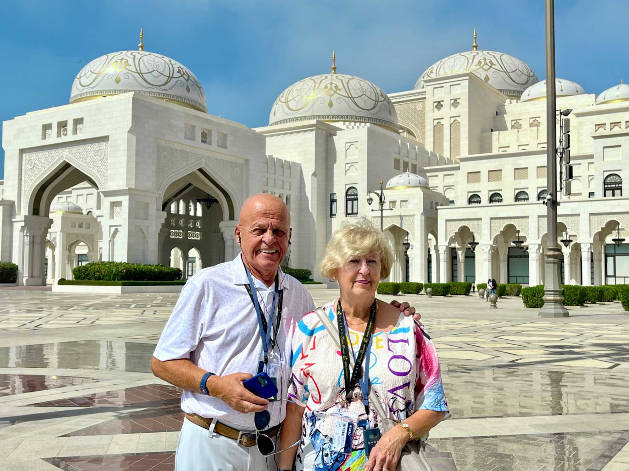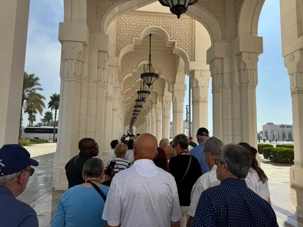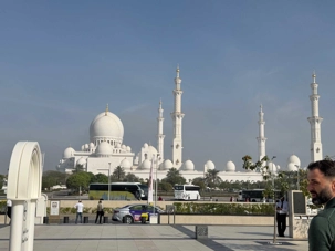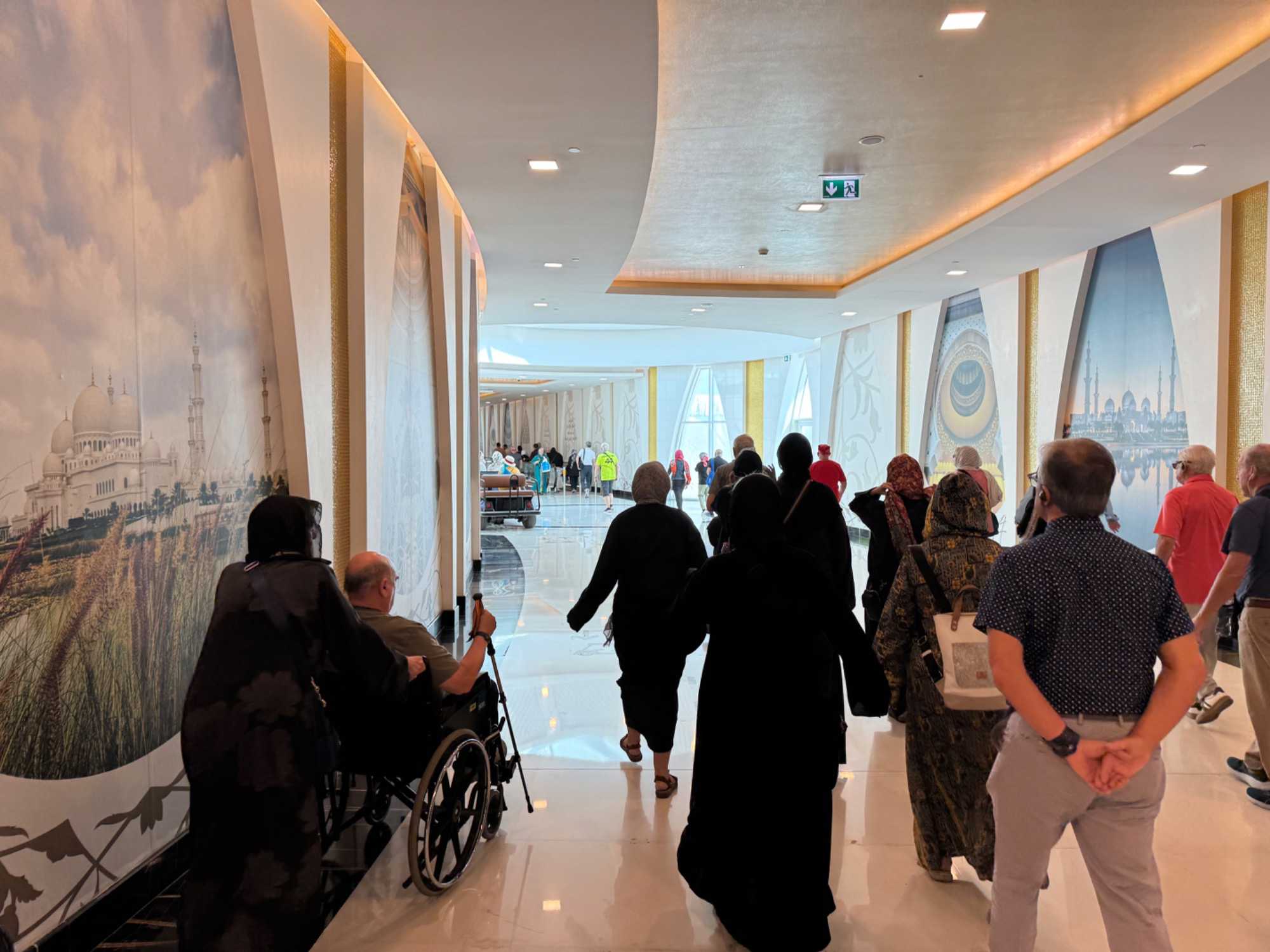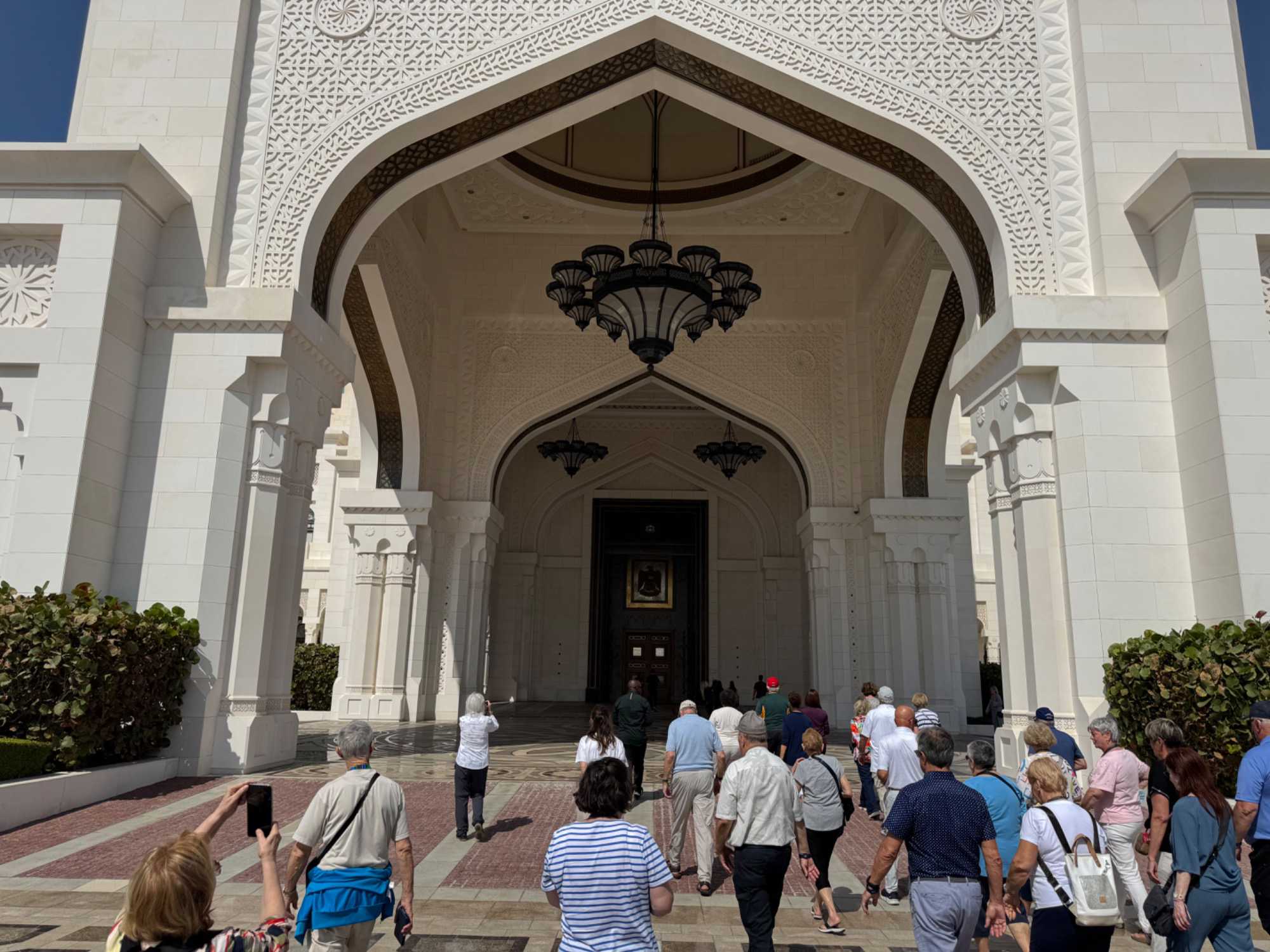 Dès notre descente du navire, nous sommes chaleureusement accueillis par Achille, notre guide francophone, qui nous avait accompagnés lors de nos premiers jours à Dubaï. Nous sommes tous très heureux de le retrouver, car nous l’avions grandement apprécié. Ensemble, nous débutons un tour panoramique de la ville. Au fil des kilomètres, Abou Dhabi révèle l’ampleur de son développement, rendu possible notamment grâce à ses importantes réserves pétrolières, tout en demeurant fidèle à la vision de son fondateur, le cheikh Zayed bin Sultan Al Nahyan : un développement moderne solidement ancré dans les valeurs culturelles et religieuses du pays.