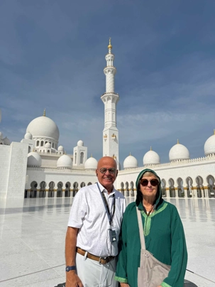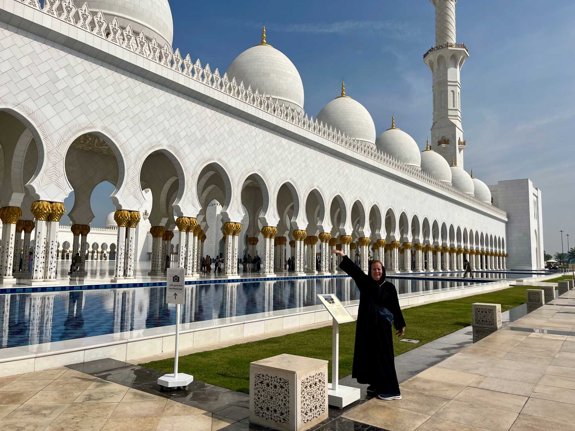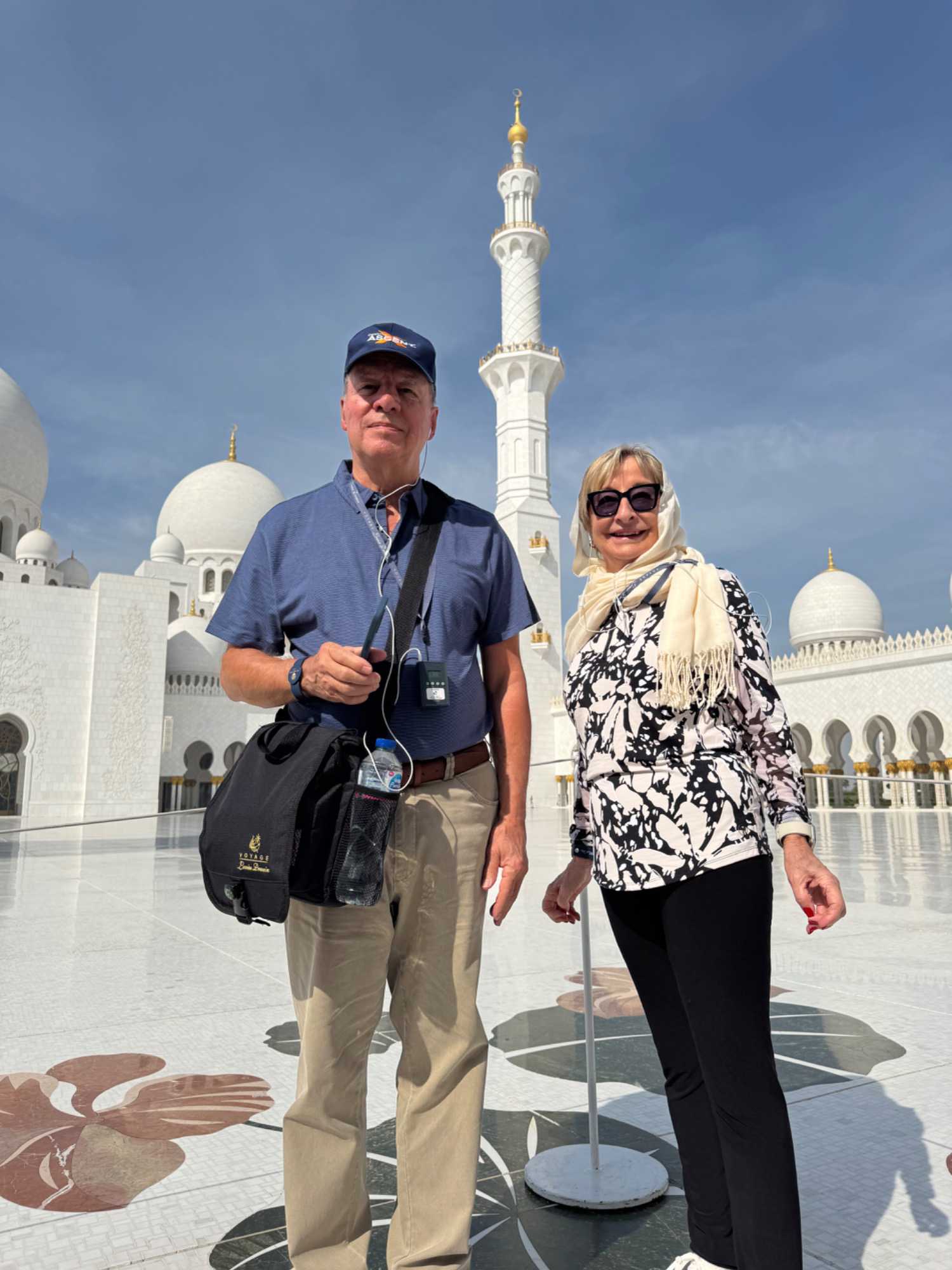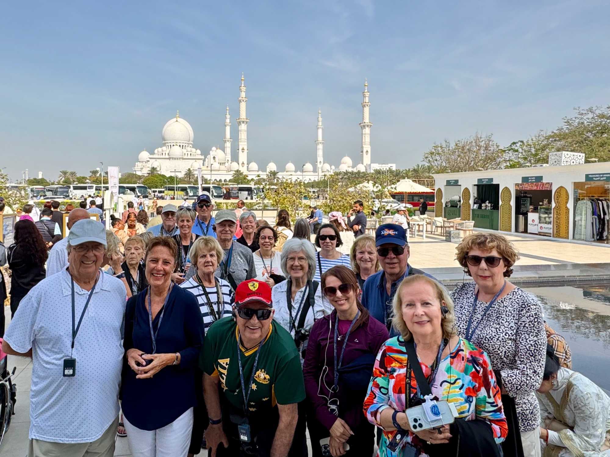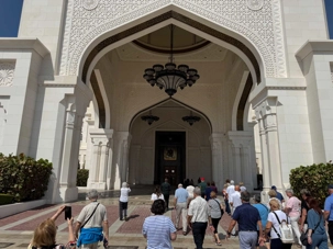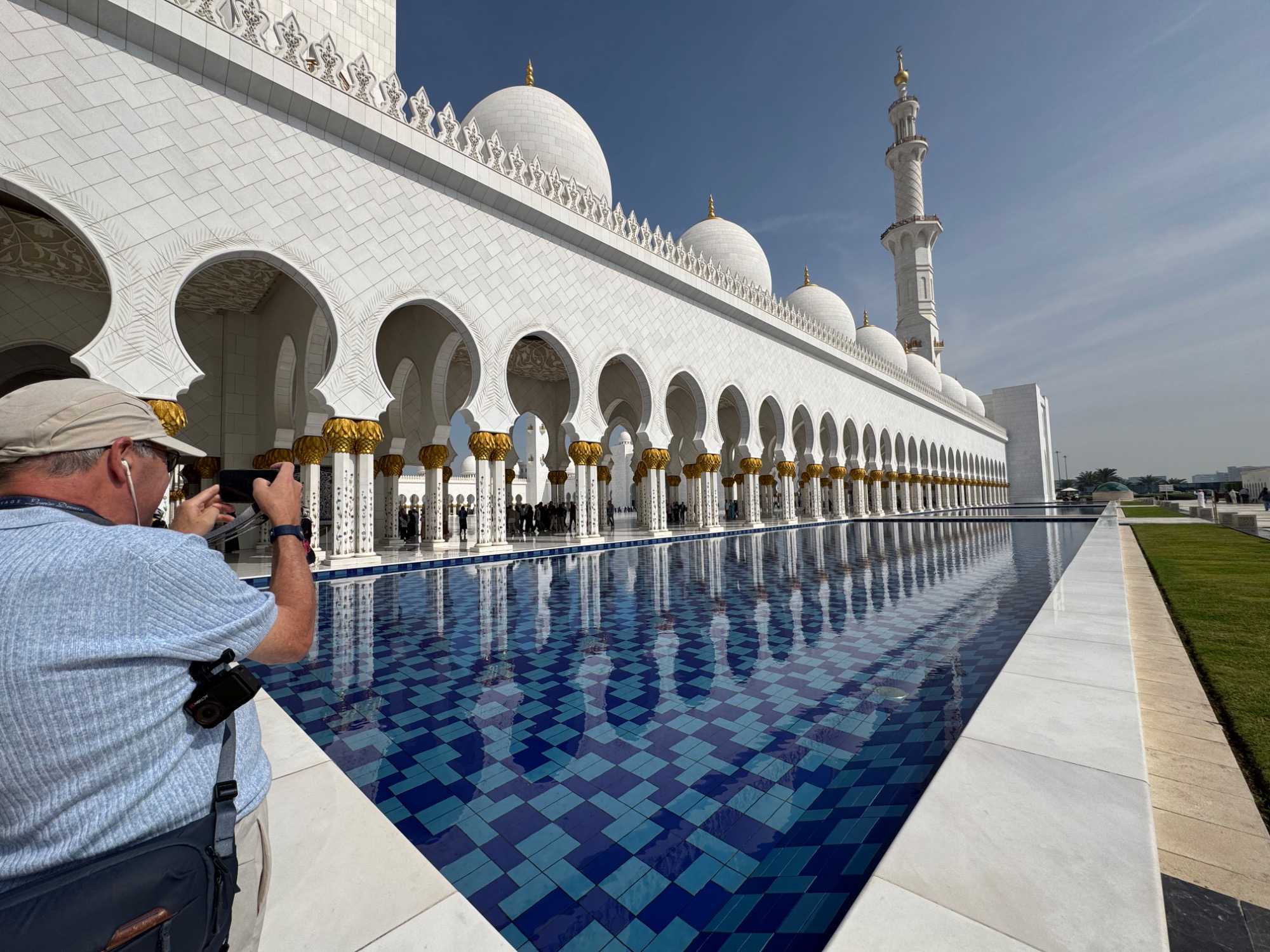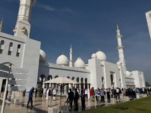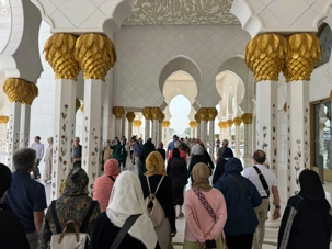 Dès notre descente du navire, nous sommes chaleureusement accueillis par Achille, notre guide francophone, qui nous avait accompagnés lors de nos premiers jours à Dubaï. Nous sommes tous très heureux de le retrouver, car nous l’avions grandement apprécié. Ensemble, nous débutons un tour panoramique de la ville. Au fil des kilomètres, Abou Dhabi révèle l’ampleur de son développement, rendu possible notamment grâce à ses importantes réserves pétrolières, tout en demeurant fidèle à la vision de son fondateur, le cheikh Zayed bin Sultan Al Nahyan : un développement moderne solidement ancré dans les valeurs culturelles et religieuses du pays.