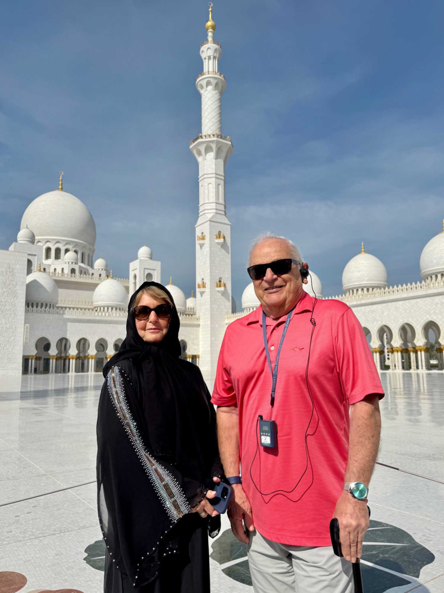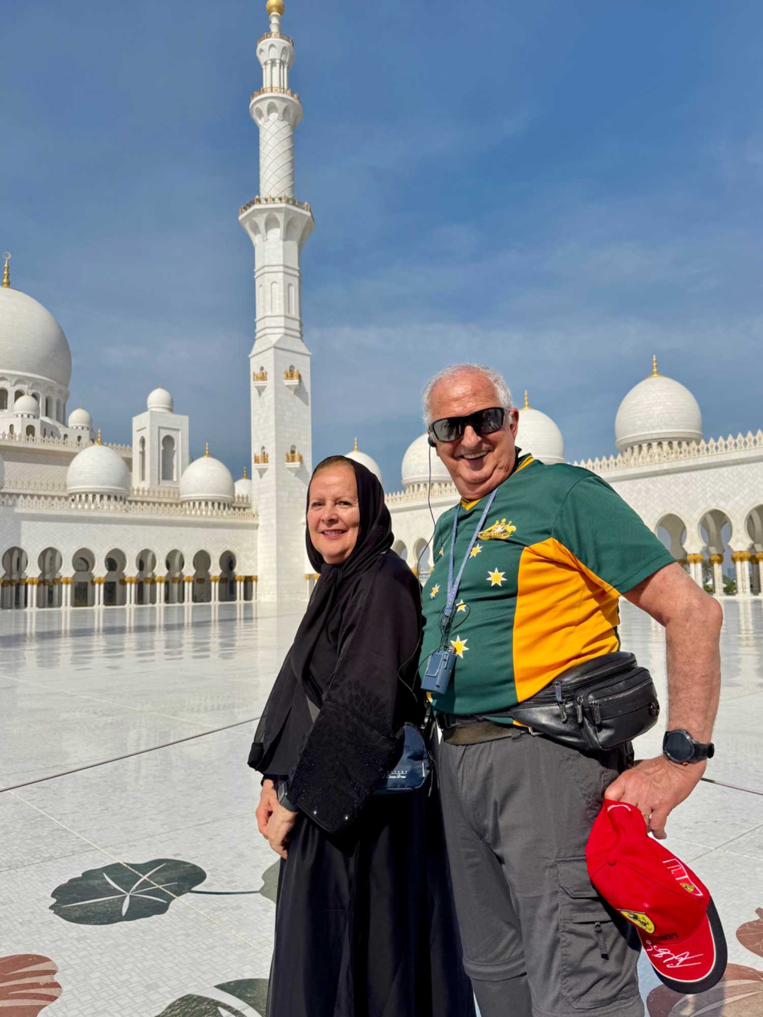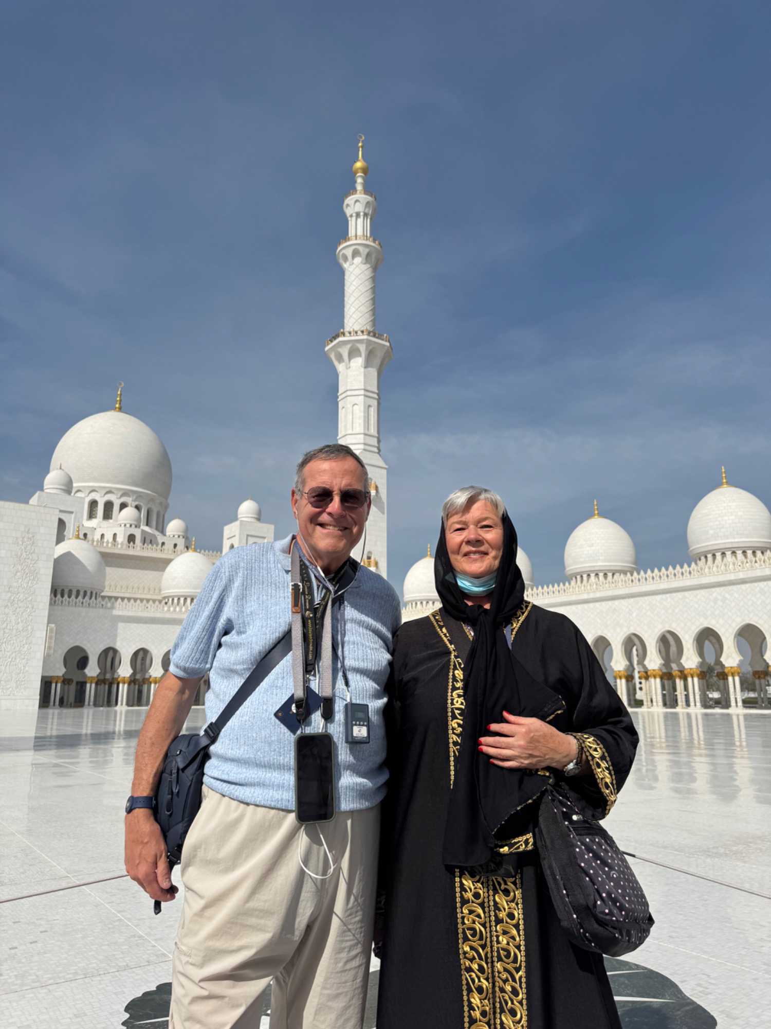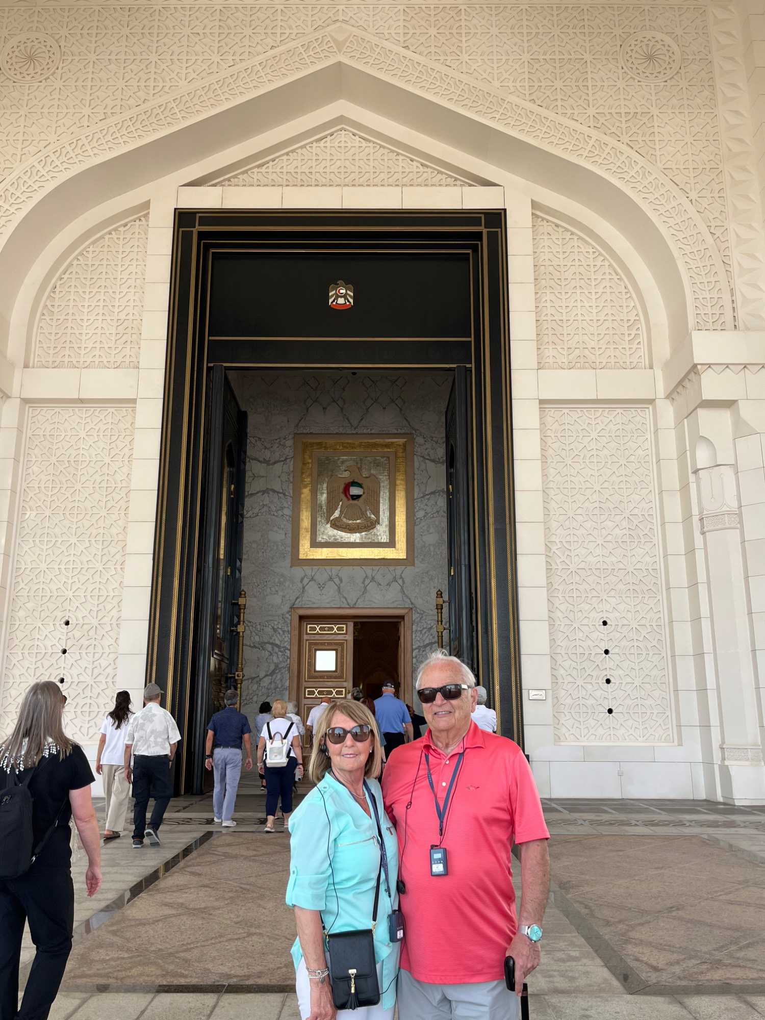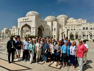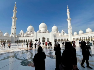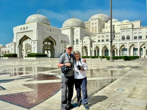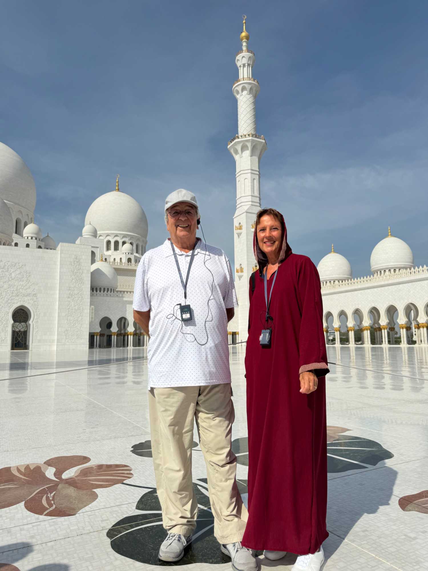 Dès notre descente du navire, nous sommes chaleureusement accueillis par Achille, notre guide francophone, qui nous avait accompagnés lors de nos premiers jours à Dubaï. Nous sommes tous très heureux de le retrouver, car nous l’avions grandement apprécié. Ensemble, nous débutons un tour panoramique de la ville. Au fil des kilomètres, Abou Dhabi révèle l’ampleur de son développement, rendu possible notamment grâce à ses importantes réserves pétrolières, tout en demeurant fidèle à la vision de son fondateur, le cheikh Zayed bin Sultan Al Nahyan : un développement moderne solidement ancré dans les valeurs culturelles et religieuses du pays.