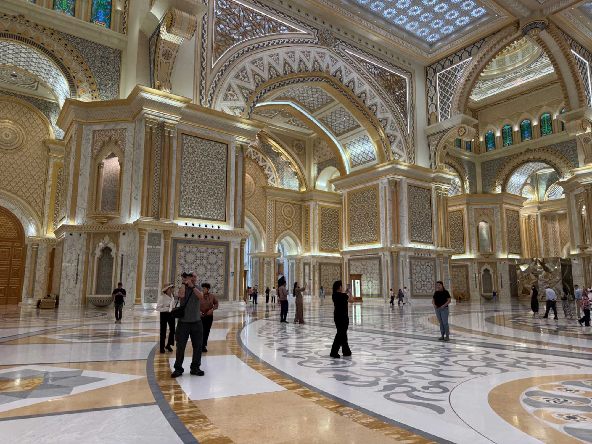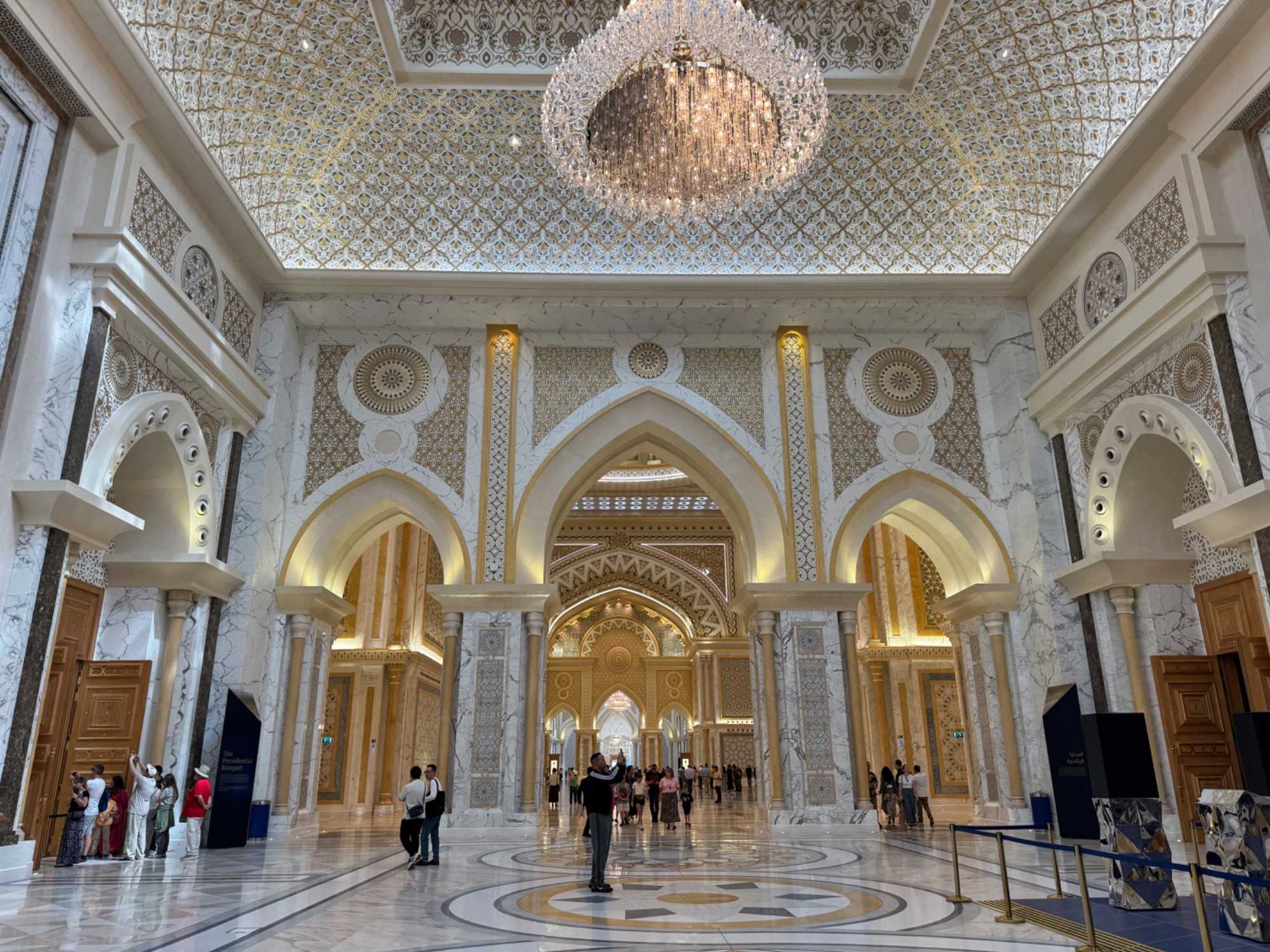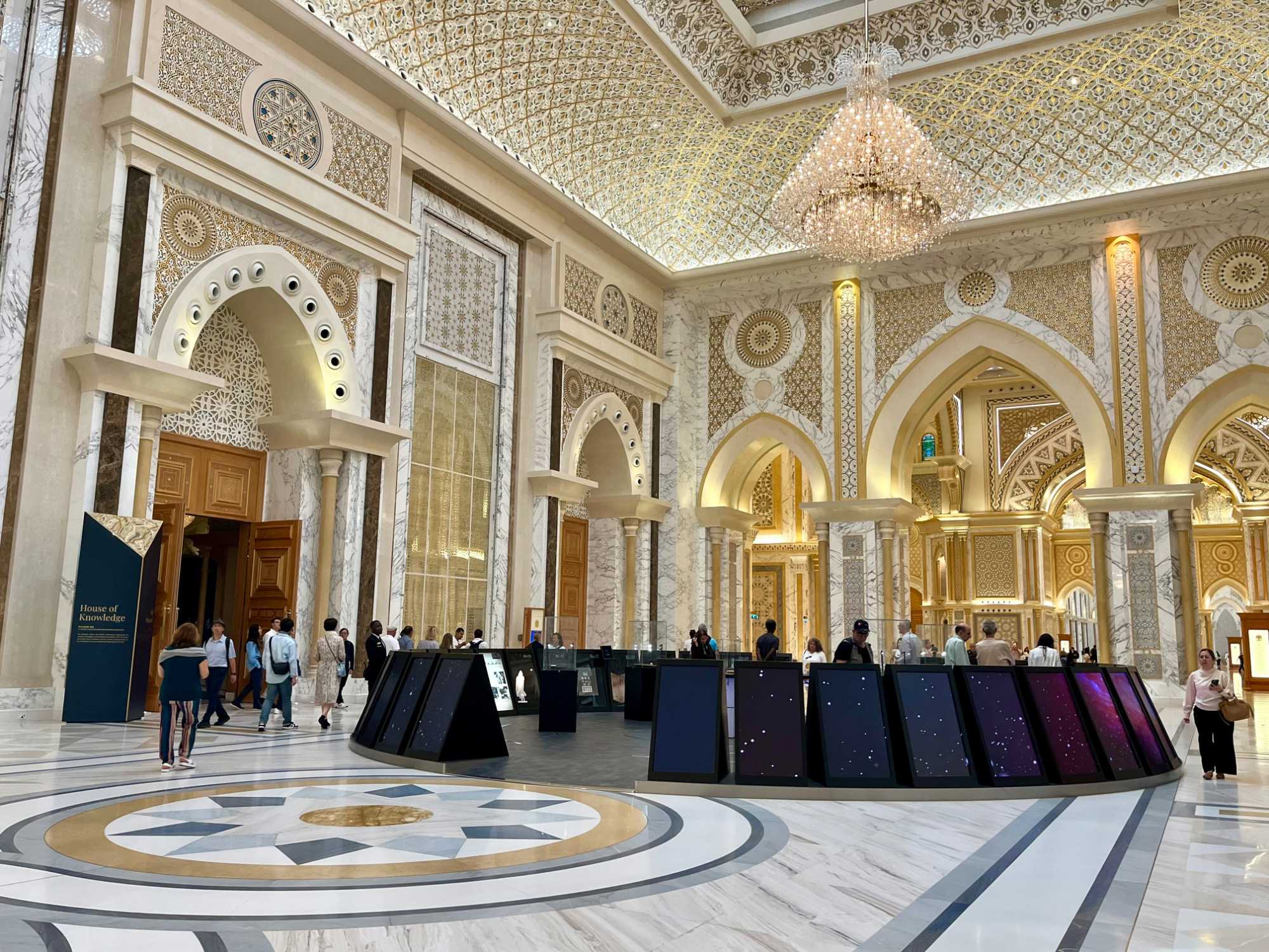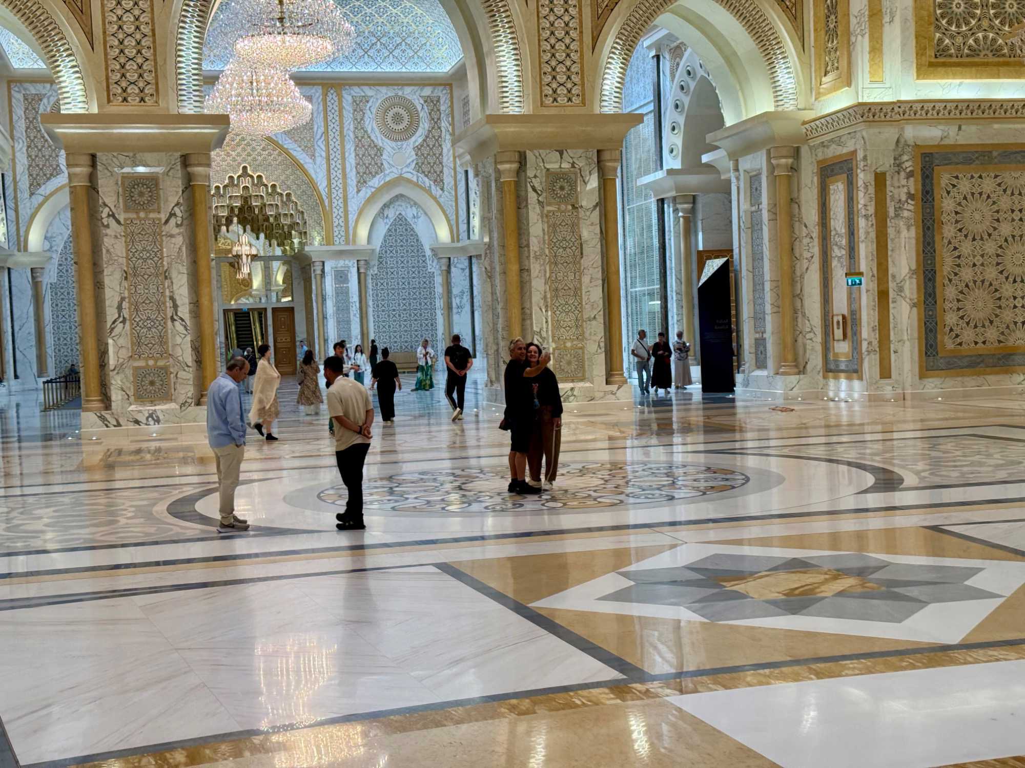 Nous poursuivons ensuite avec la visite du Qasr Al Watan, le palais présidentiel d’Abou Dhabi, ouvert au public depuis 2019. Achevé en 2015, cet édifice est bien plus qu’un bâtiment officiel : il rend hommage au patrimoine, à l’art et au savoir du monde arabe. Les vastes salles de marbre, les dômes majestueux, les décors dorés et l’impressionnante bibliothèque offrent un aperçu captivant de l’histoire, de la gouvernance et des valeurs qui ont façonné la région. Chaque espace témoigne d’un profond respect pour la connaissance et sa transmission.