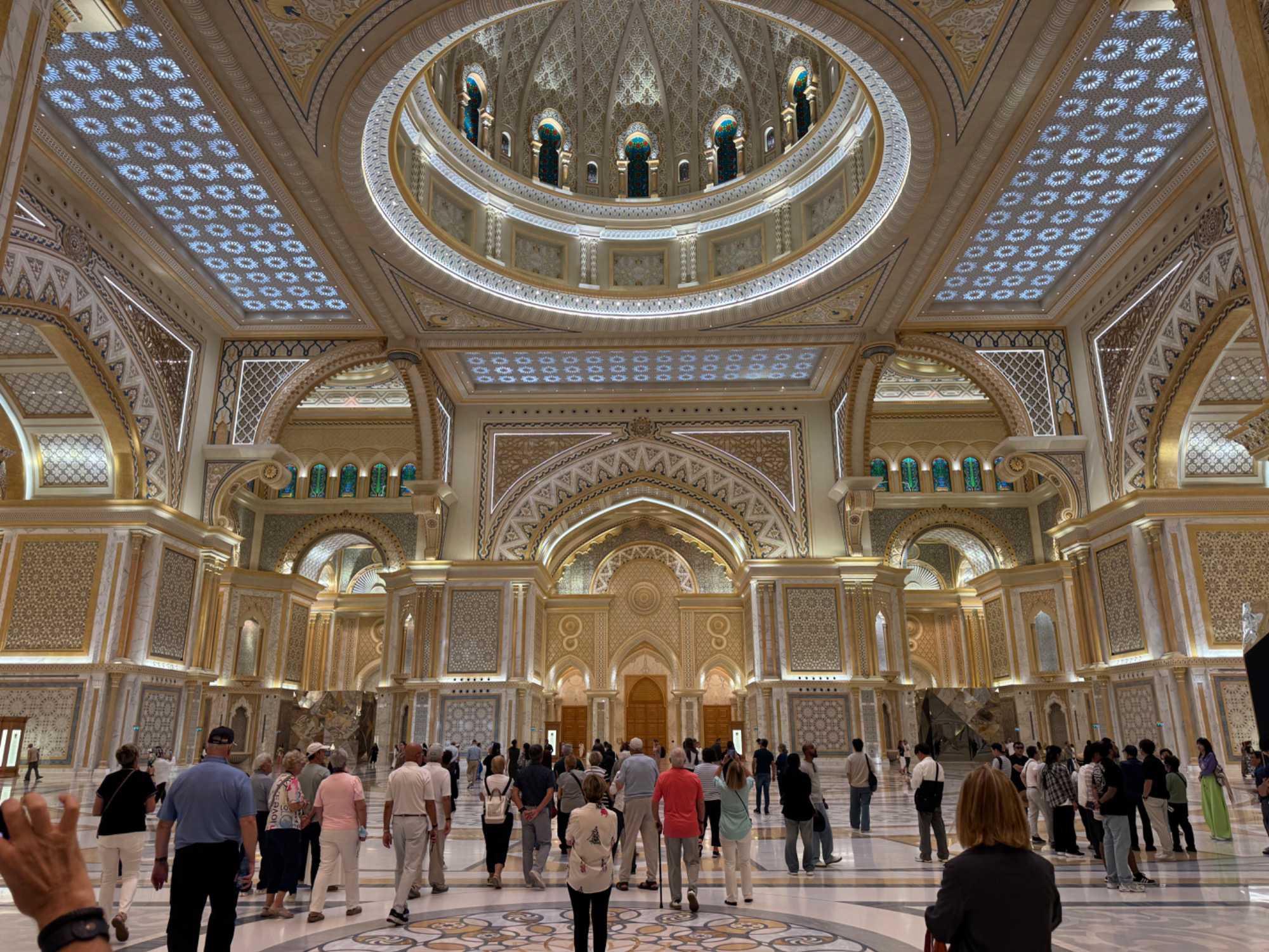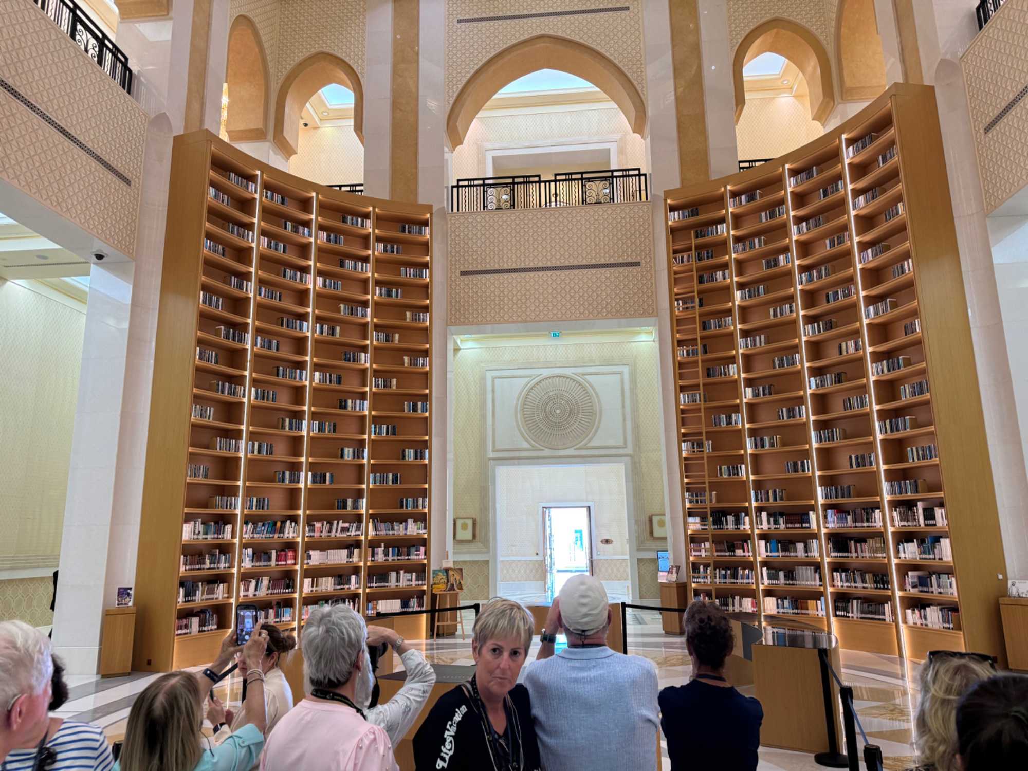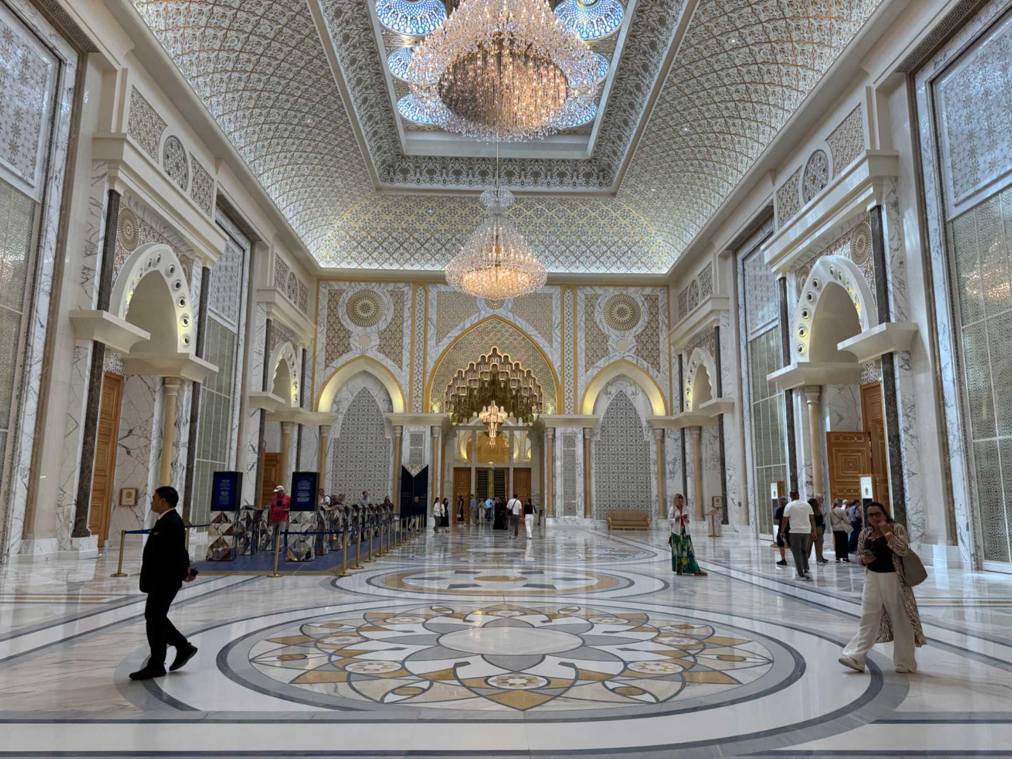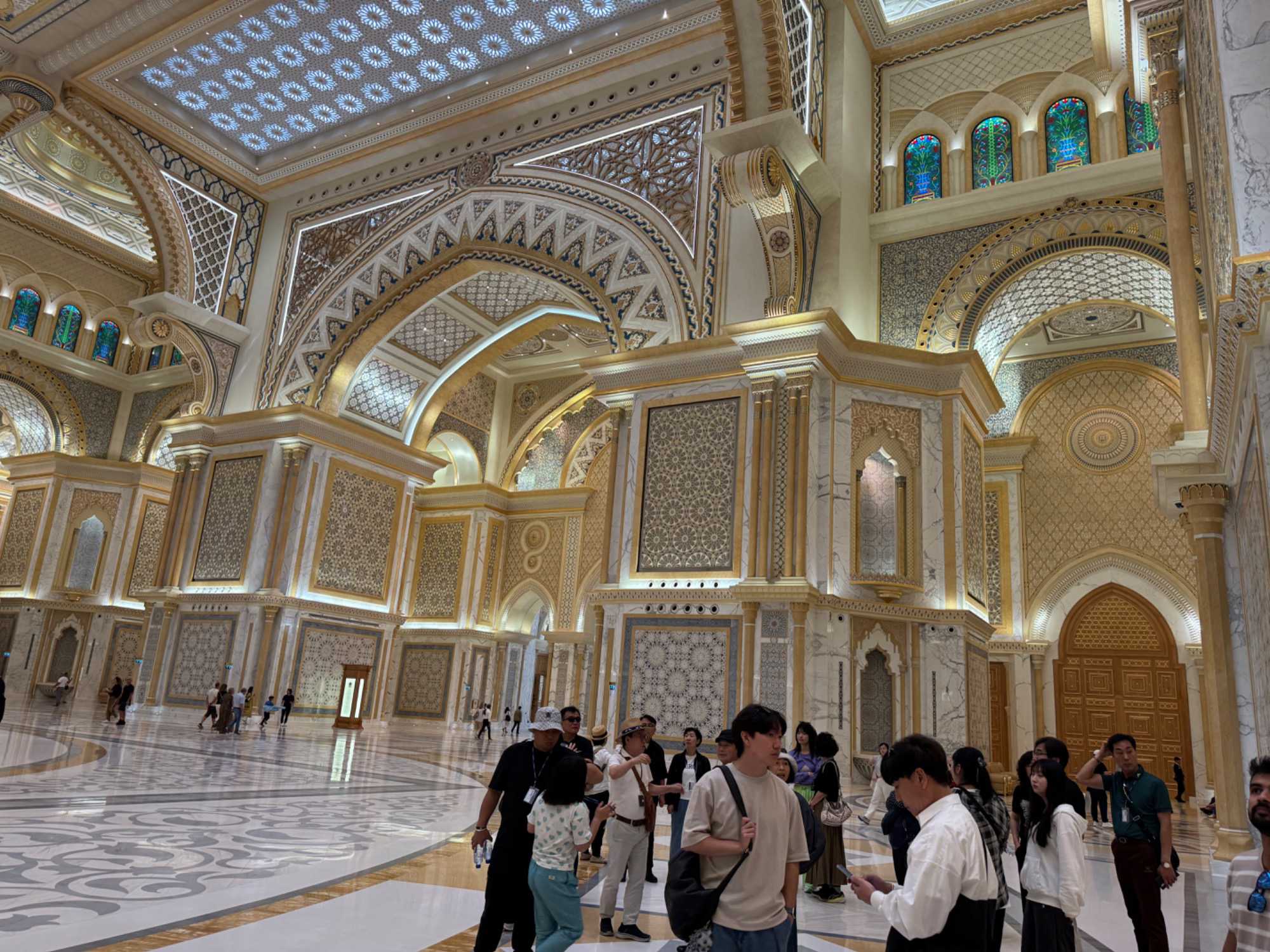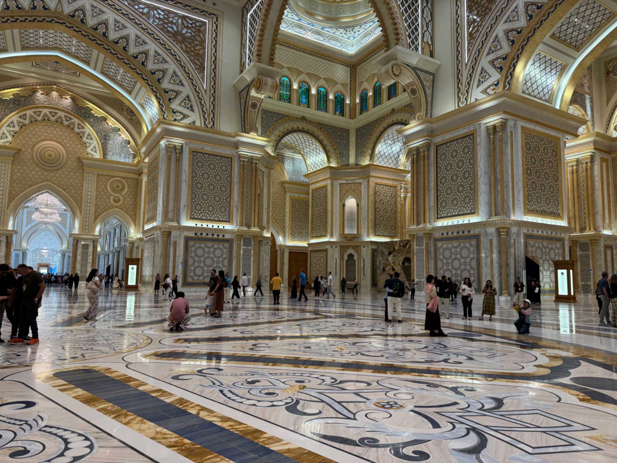 Nous poursuivons ensuite avec la visite du Qasr Al Watan, le palais présidentiel d’Abou Dhabi, ouvert au public depuis 2019. Achevé en 2015, cet édifice est bien plus qu’un bâtiment officiel : il rend hommage au patrimoine, à l’art et au savoir du monde arabe. Les vastes salles de marbre, les dômes majestueux, les décors dorés et l’impressionnante bibliothèque offrent un aperçu captivant de l’histoire, de la gouvernance et des valeurs qui ont façonné la région. Chaque espace témoigne d’un profond respect pour la connaissance et sa transmission.