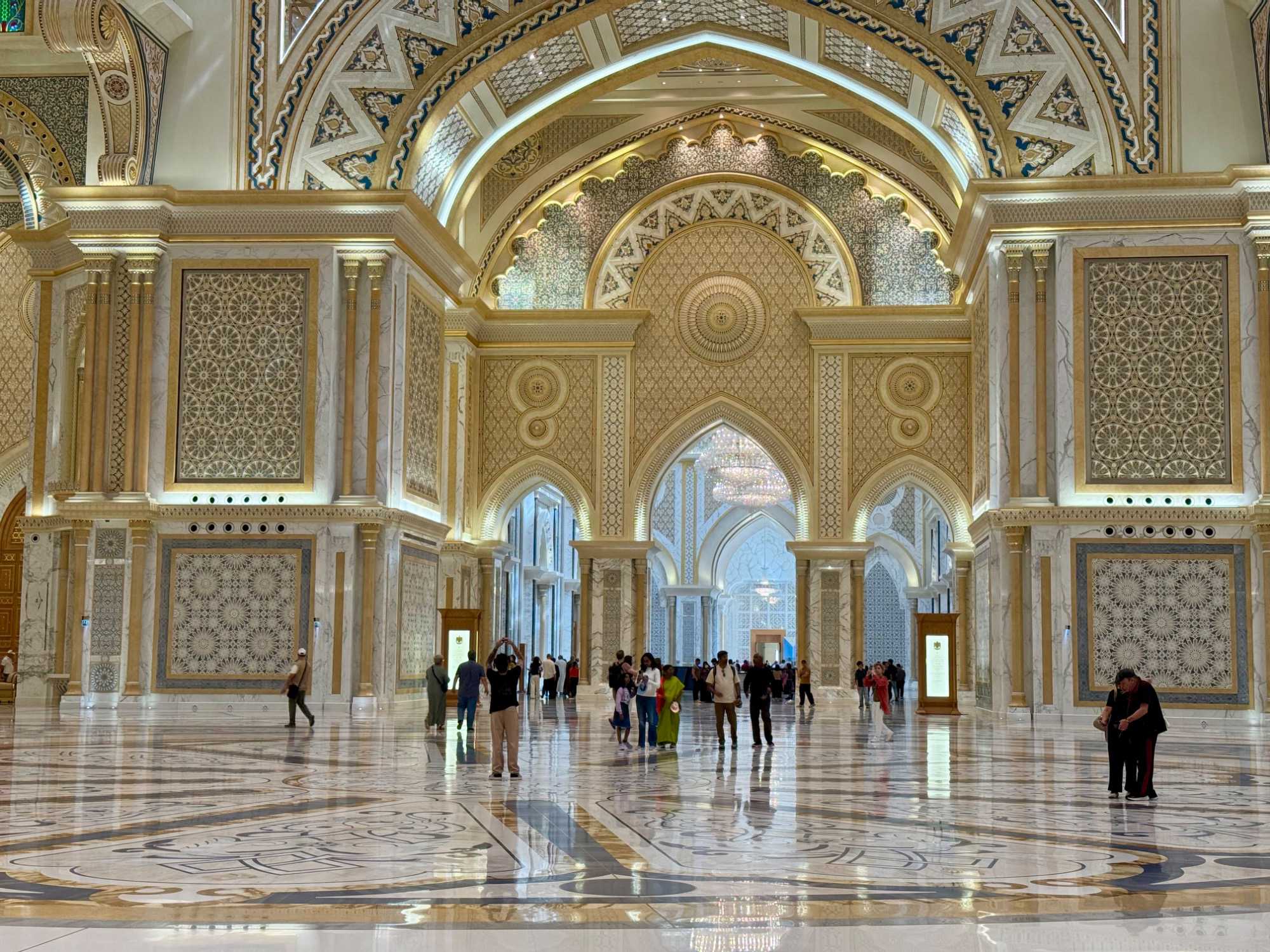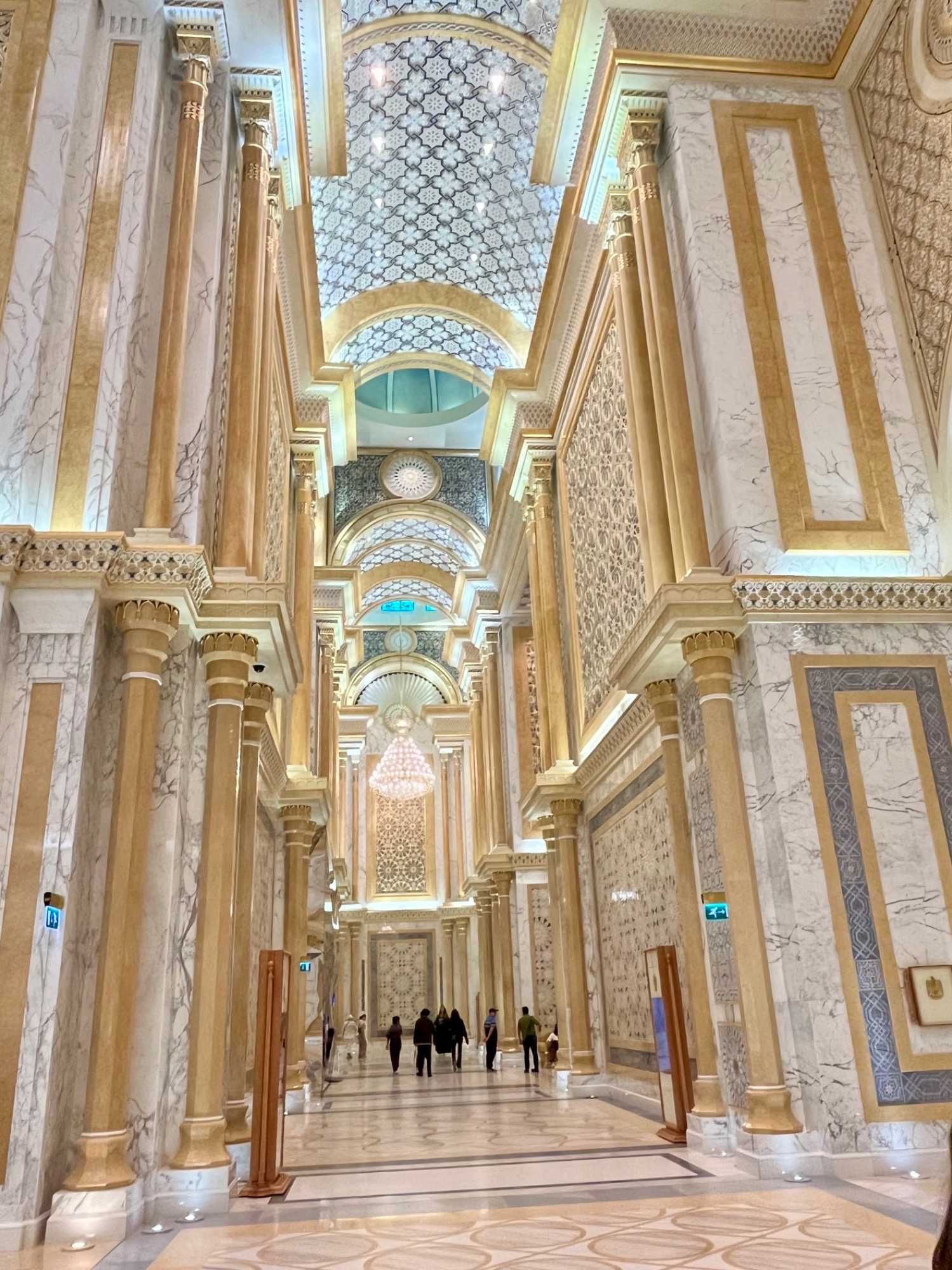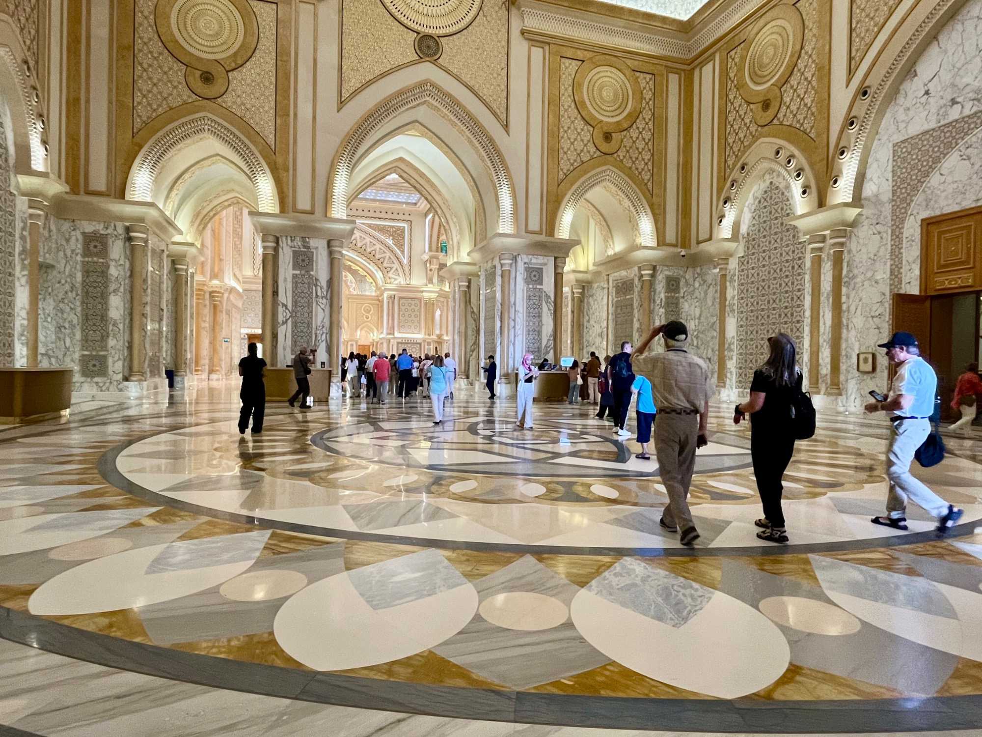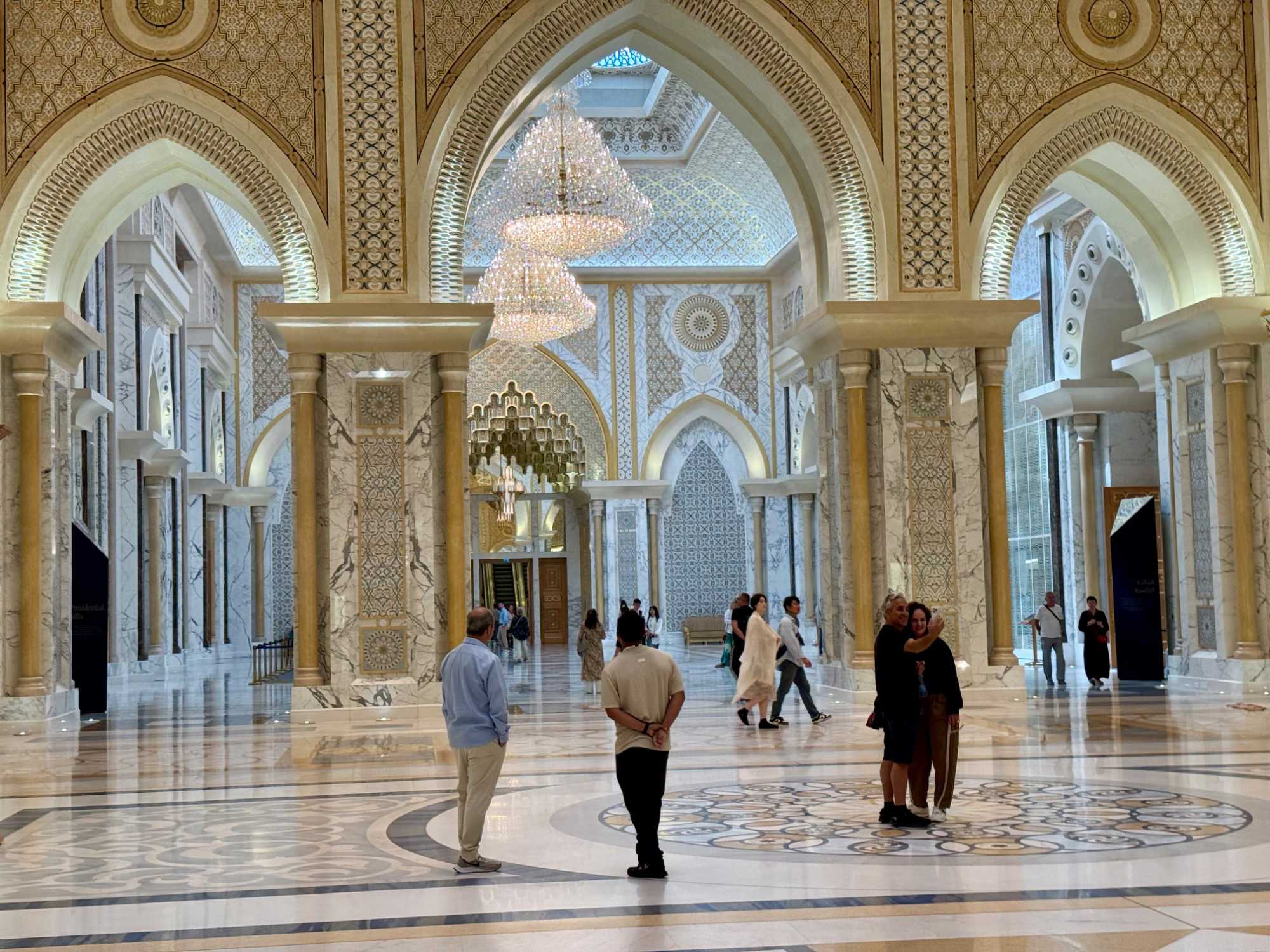 Nous poursuivons ensuite avec la visite du Qasr Al Watan, le palais présidentiel d’Abou Dhabi, ouvert au public depuis 2019. Achevé en 2015, cet édifice est bien plus qu’un bâtiment officiel : il rend hommage au patrimoine, à l’art et au savoir du monde arabe. Les vastes salles de marbre, les dômes majestueux, les décors dorés et l’impressionnante bibliothèque offrent un aperçu captivant de l’histoire, de la gouvernance et des valeurs qui ont façonné la région. Chaque espace témoigne d’un profond respect pour la connaissance et sa transmission.
