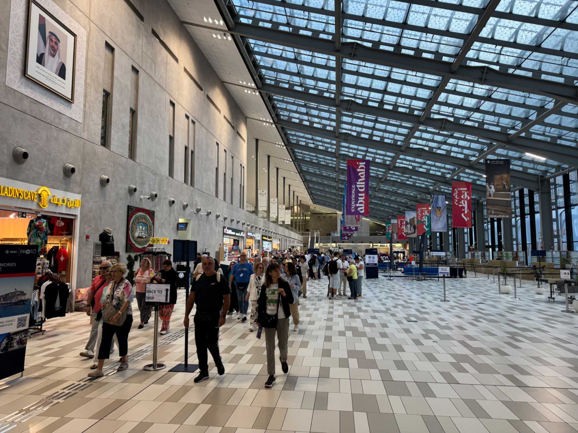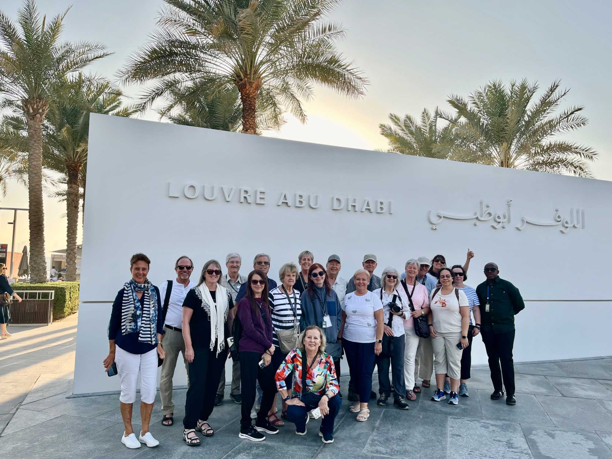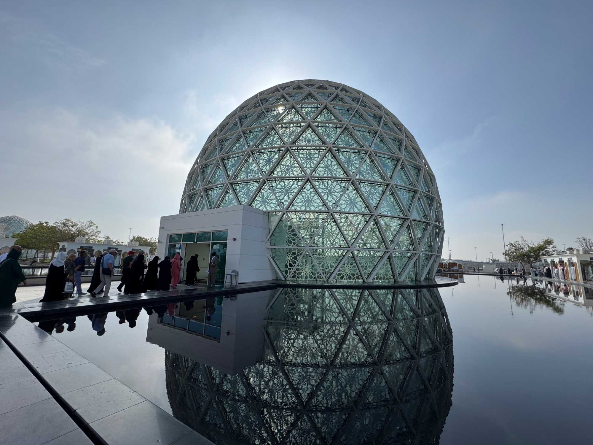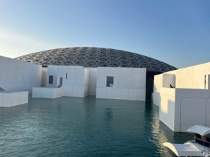 Avant de regagner le navire, un arrêt photo nous permet d’admirer l’architecture spectaculaire du Louvre Abou Dhabi, conçu par l’architecte Jean Nouvel. Son immense dôme ajouré crée un jeu de lumière remarquable, offrant une expérience visuelle unique.