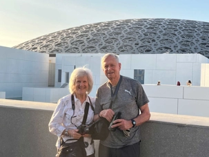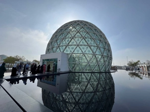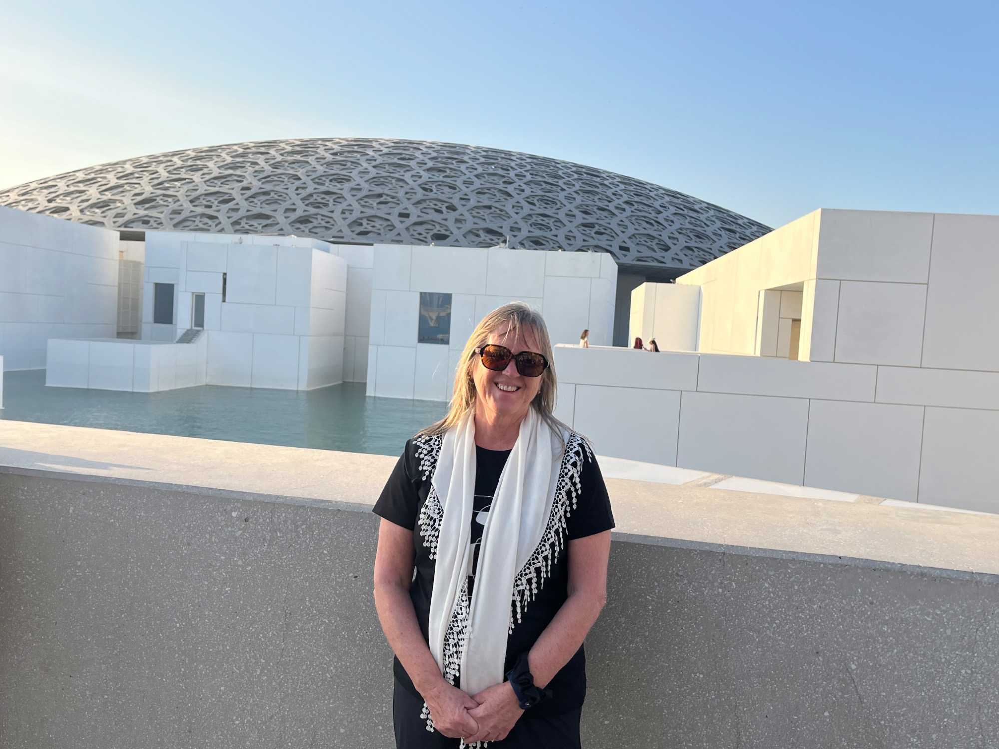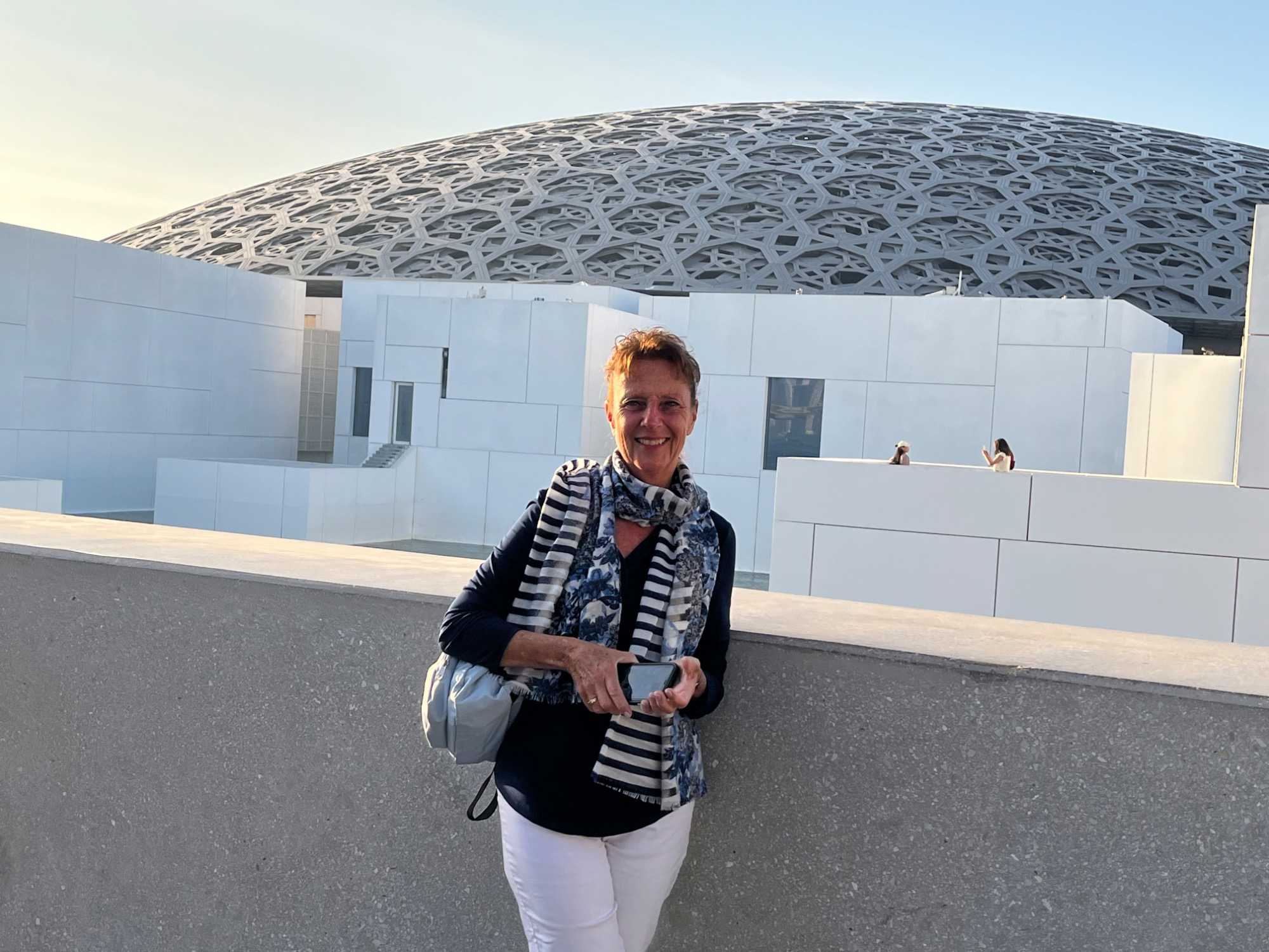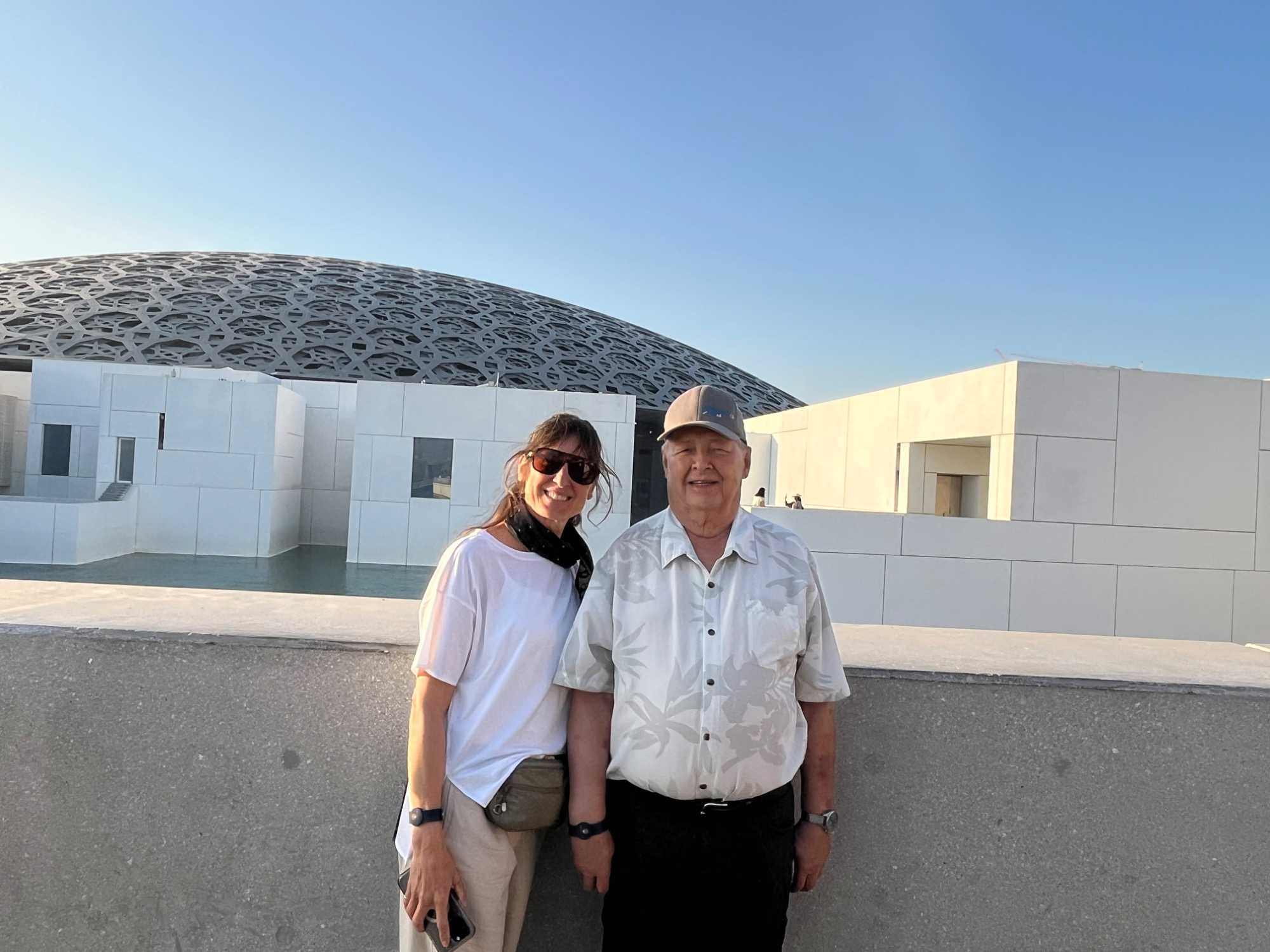 Avant de regagner le navire, un arrêt photo nous permet d’admirer l’architecture spectaculaire du Louvre Abou Dhabi, conçu par l’architecte Jean Nouvel. Son immense dôme ajouré crée un jeu de lumière remarquable, offrant une expérience visuelle unique.