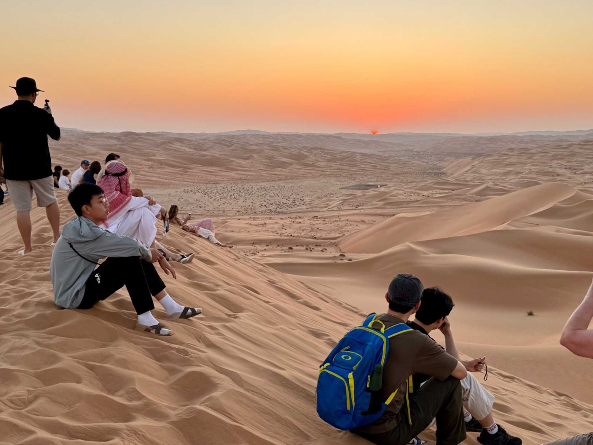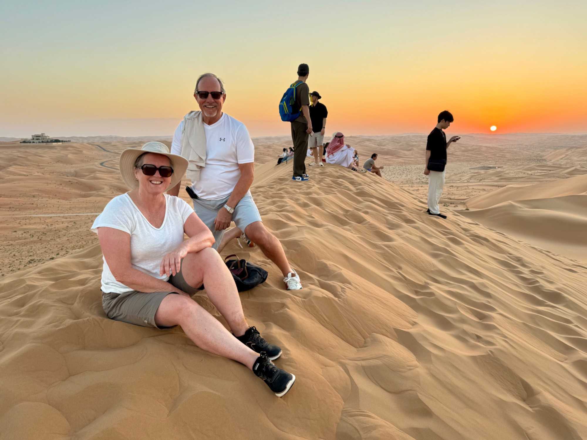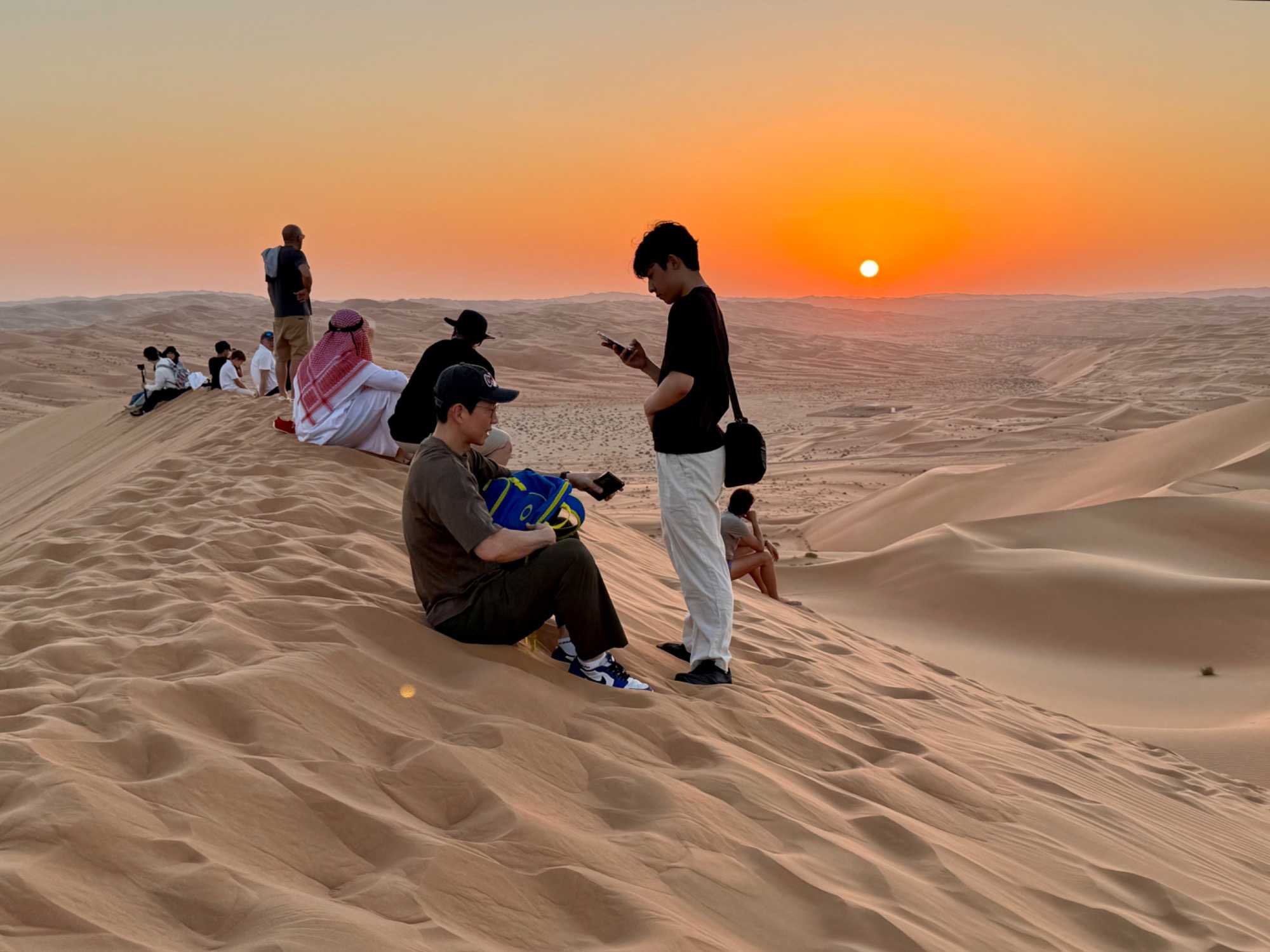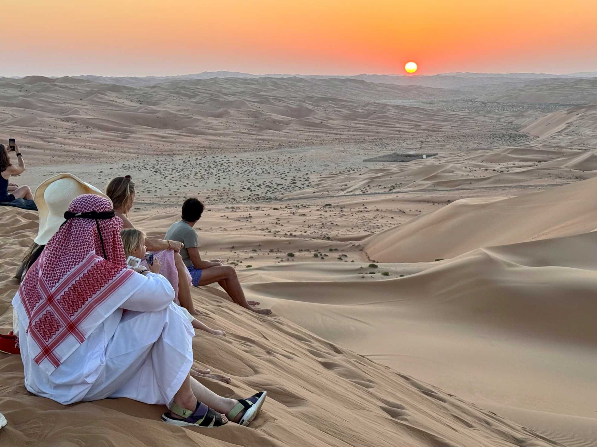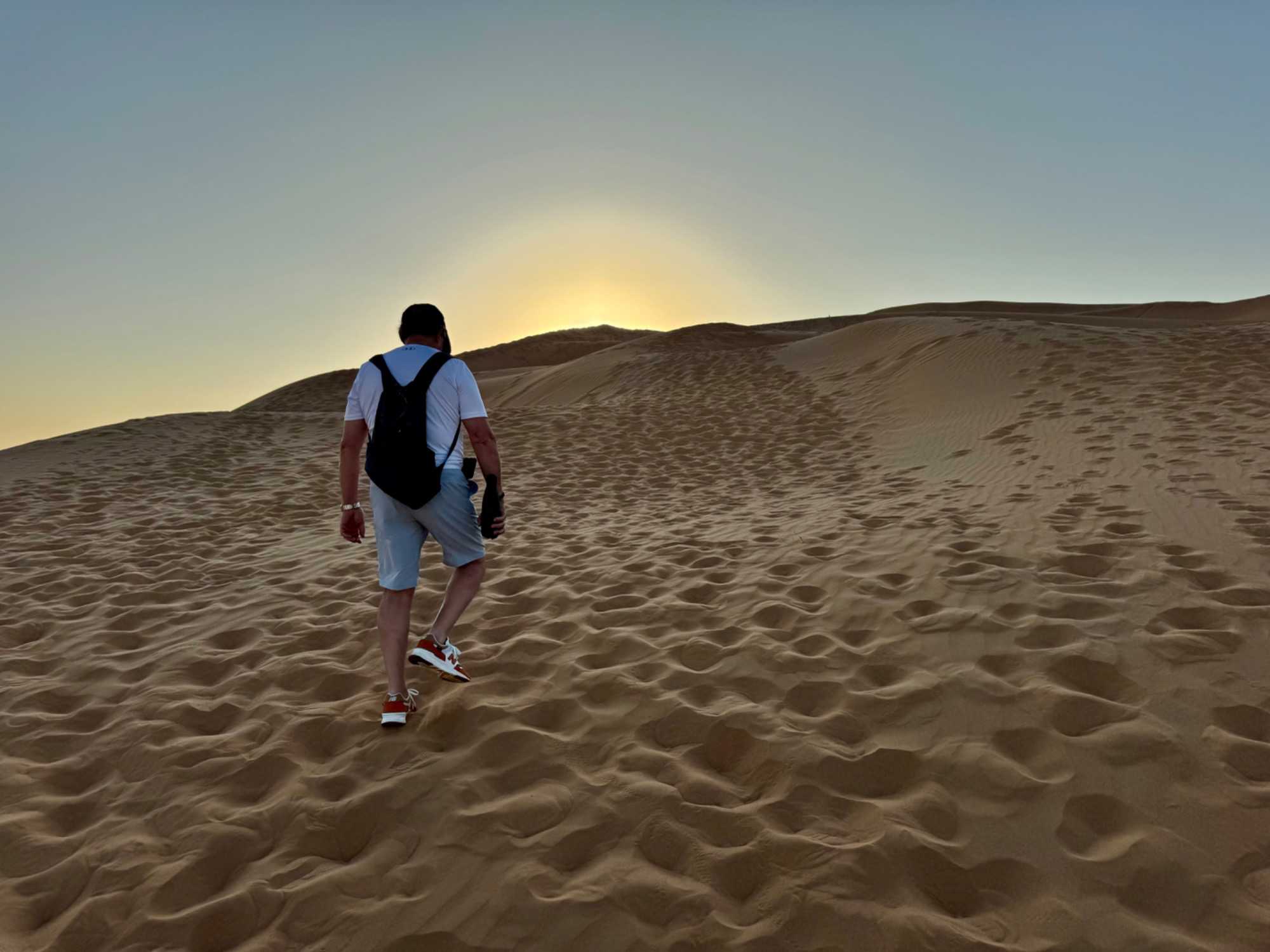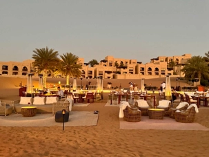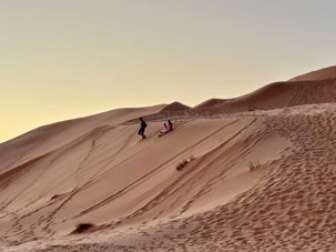 En fin d’après-midi, certains voyageurs plus aventureux décident de gravir la dune de sable qui surplombe le resort afin d’assister au coucher du soleil. L’effort est récompensé par un spectacle grandiose : le soleil embrase l’horizon, teintant les dunes de nuances orangées et rosées. Les autres l’admirent confortablement depuis leur balcon, profitant d’un point de vue tout aussi spectaculaire sur cette mer de sable illuminée. Chacun vit ce moment à sa façon, mais tous partagent la même émotion.