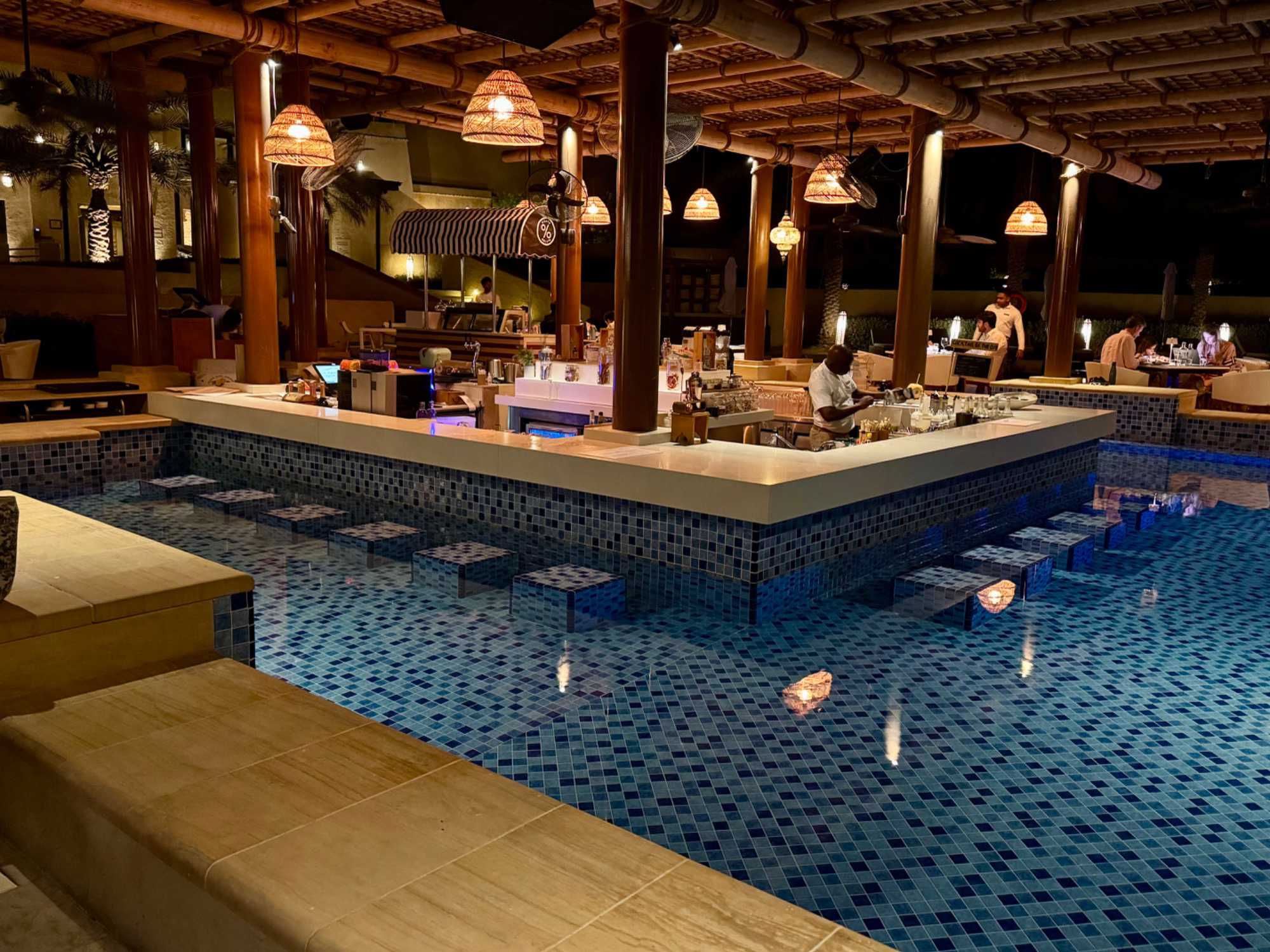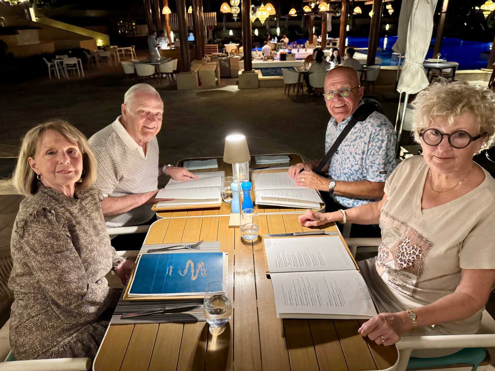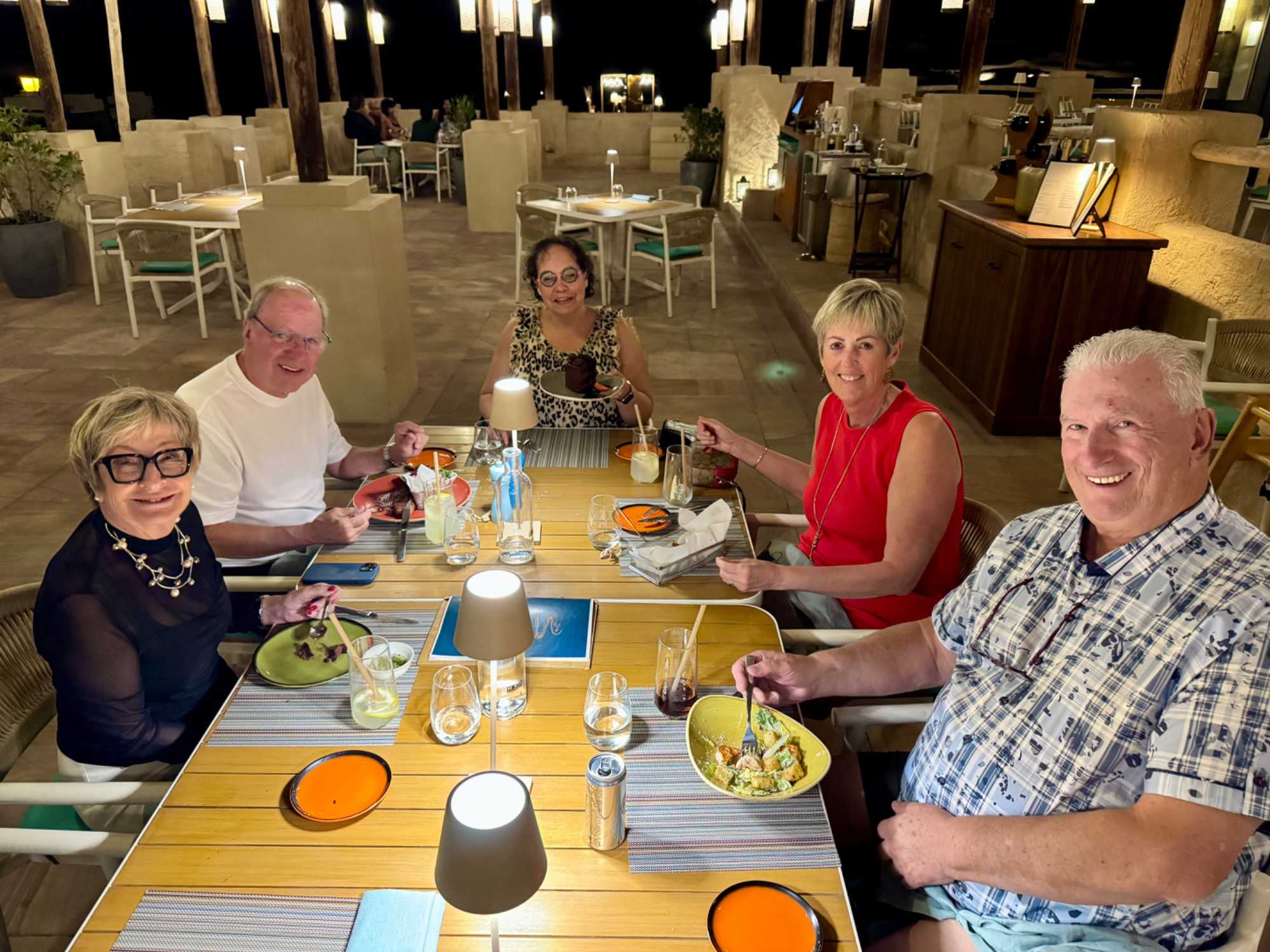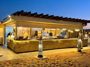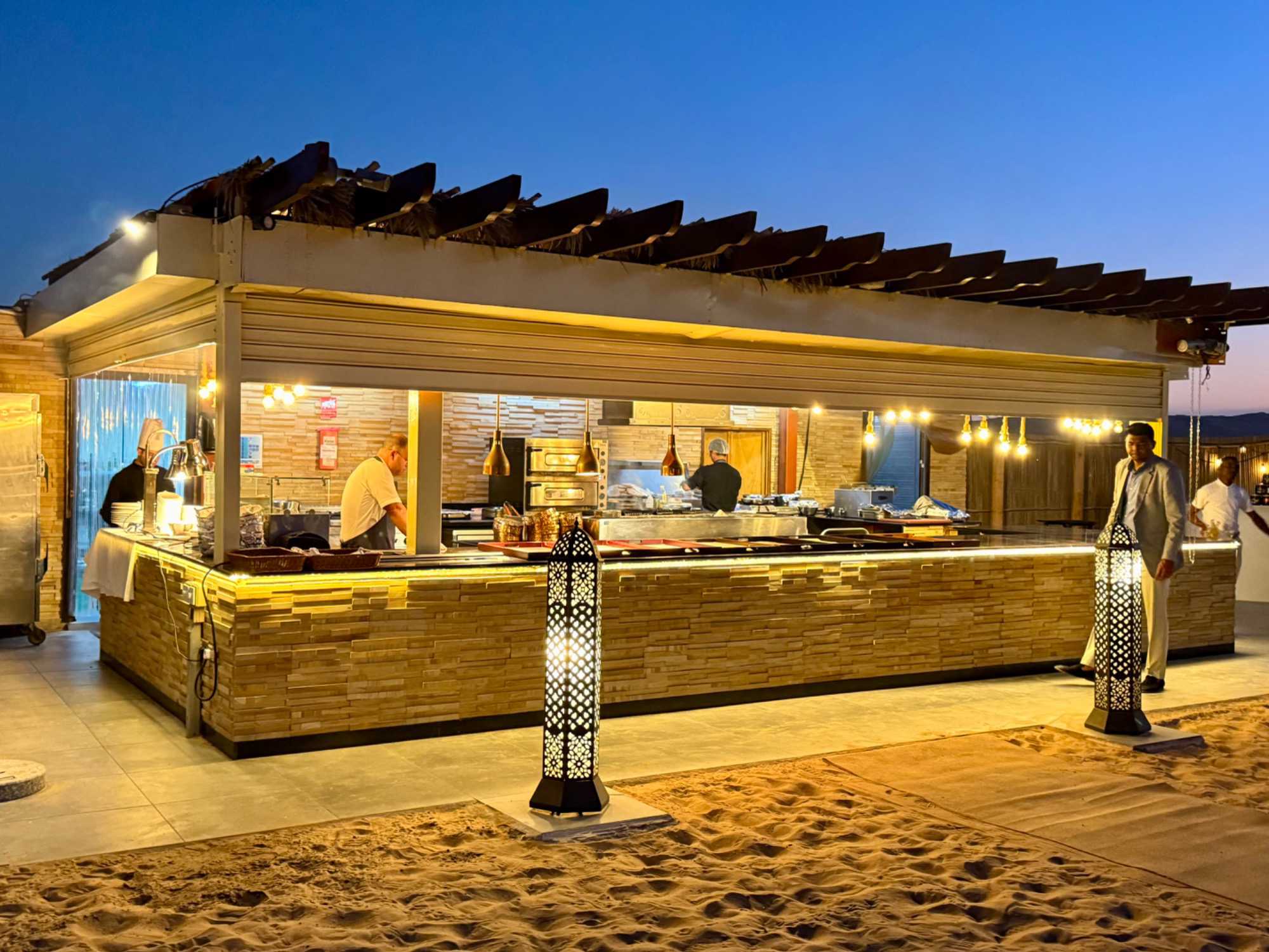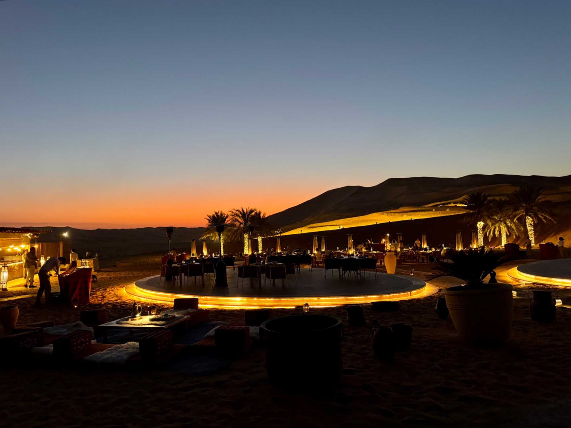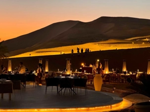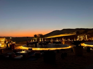 La journée se termine par un souper copieux à la carte, servi aux abords de la piscine dans une atmosphère élégante et détendue. Les mets raffinés, les parfums d’épices et la douceur de la soirée composent un moment de pur plaisir. Tandis que la nuit tombe doucement sur le désert, le ciel se pare d’étoiles et le silence enveloppant renforce la magie de l’instant.