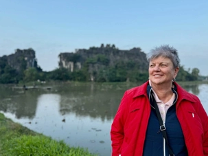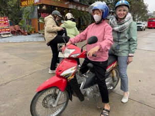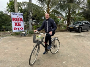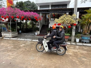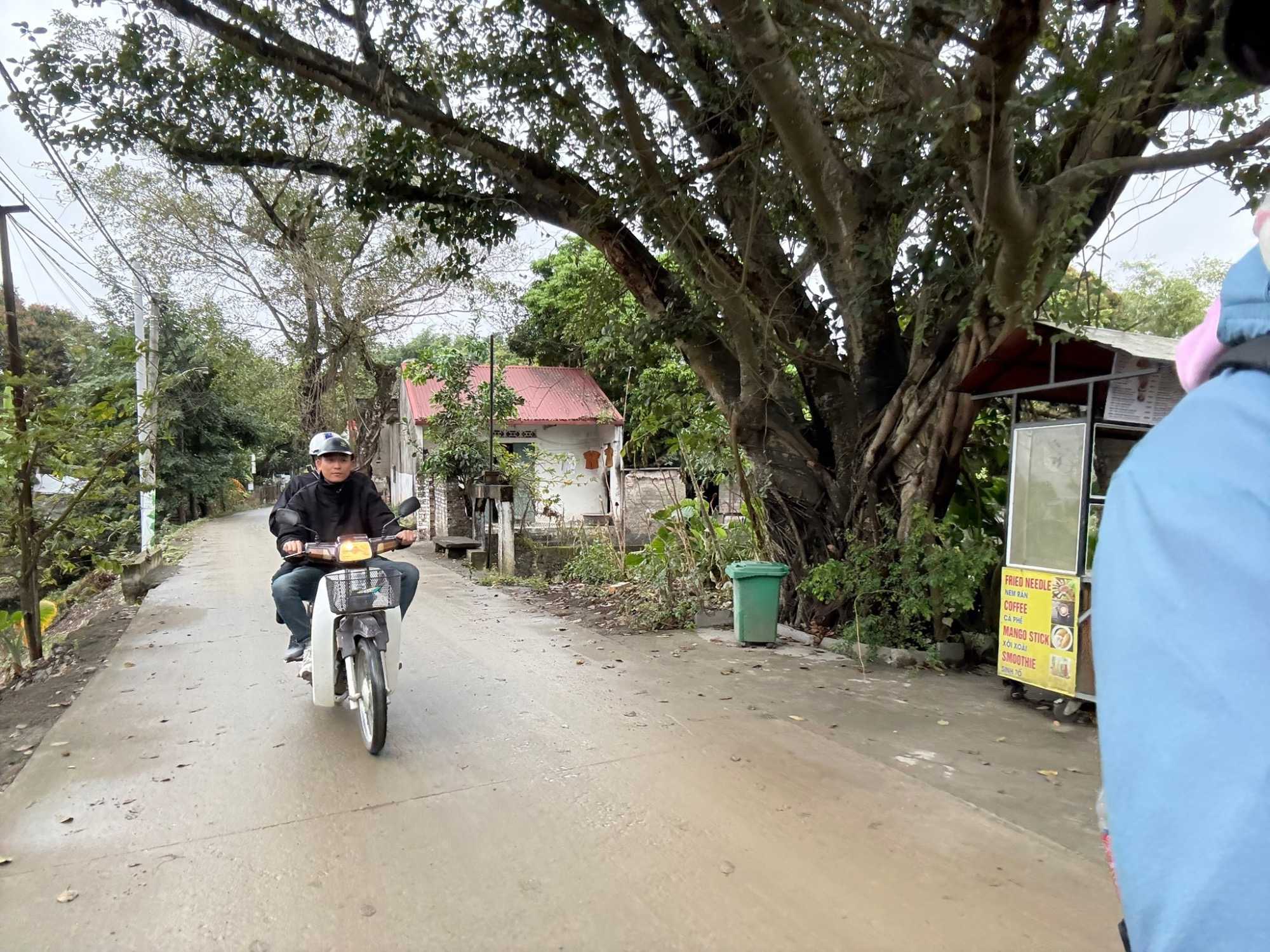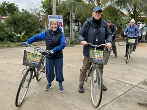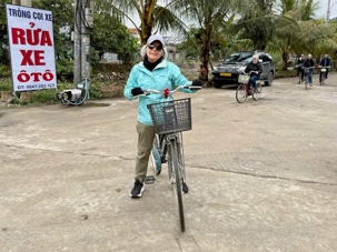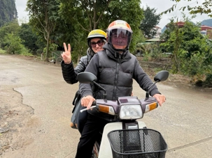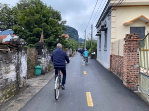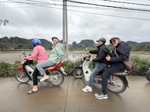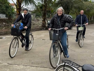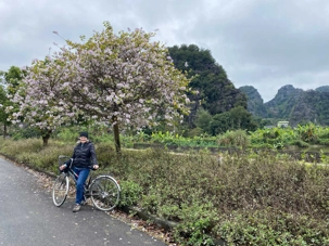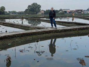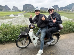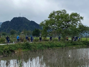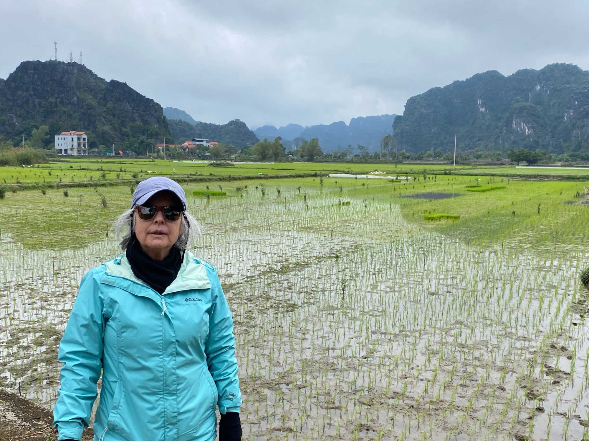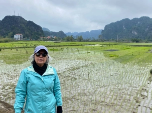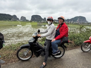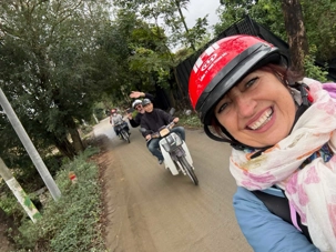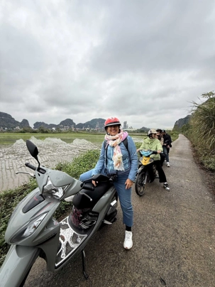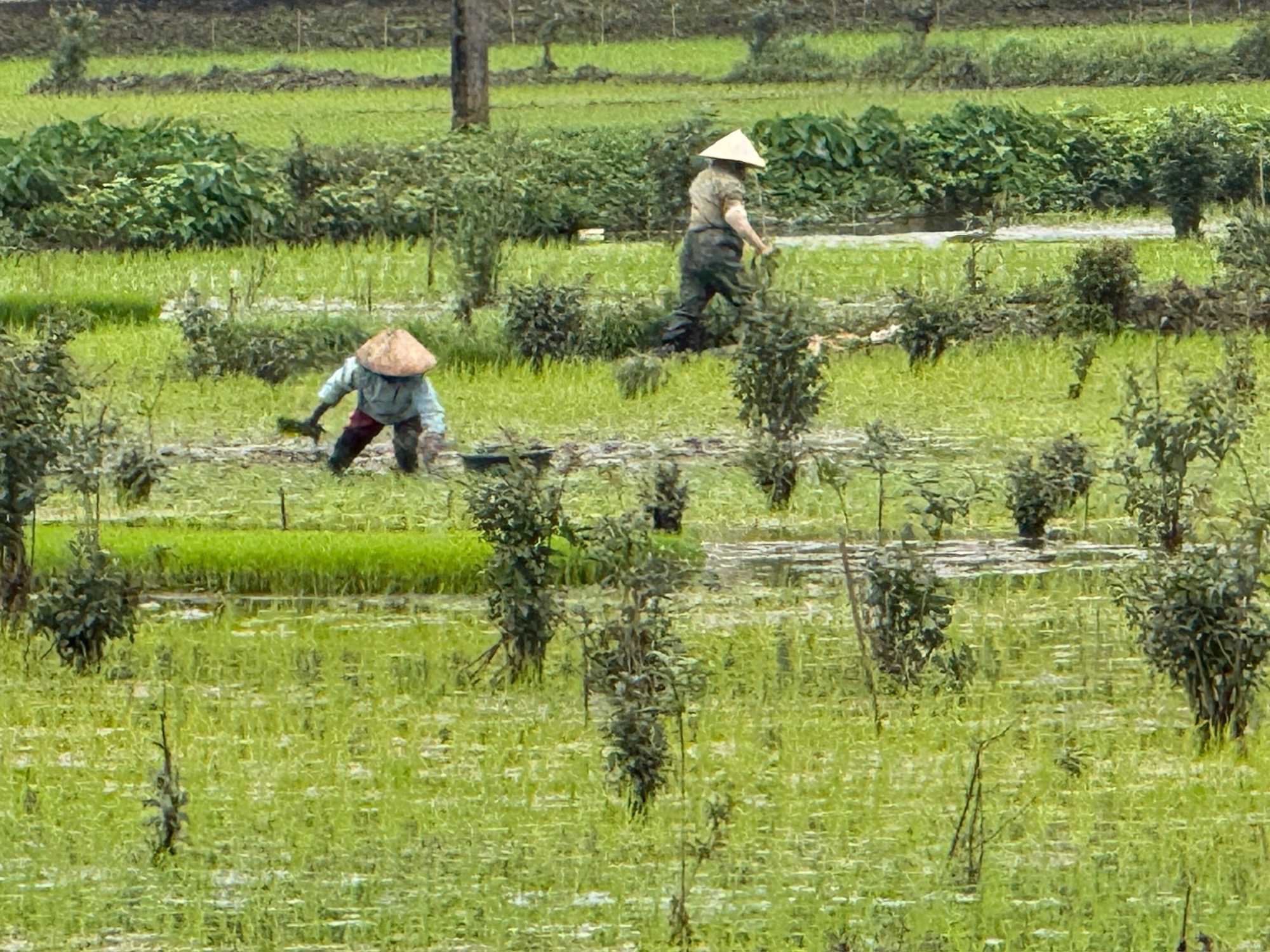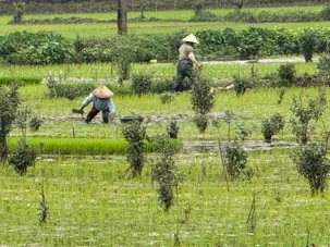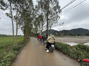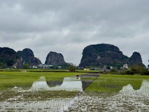 Puis, nous poursuivons notre visites, en répartissant notre groupe; avec une promenade à vélo, et en scooter pour certains, à la découverte de l’arrière-pays et à la rencontre de la vie des habitants locaux dans un décor absolument délicieux pour le plaisir des yeux; avec toutes ces collines entourées de rizières. Nous sommes à la saison de la plantation, à la main de chacune des tiges-pousses de riz. Nous observons plusieurs paysans à l’action, dans ces champs inondés.