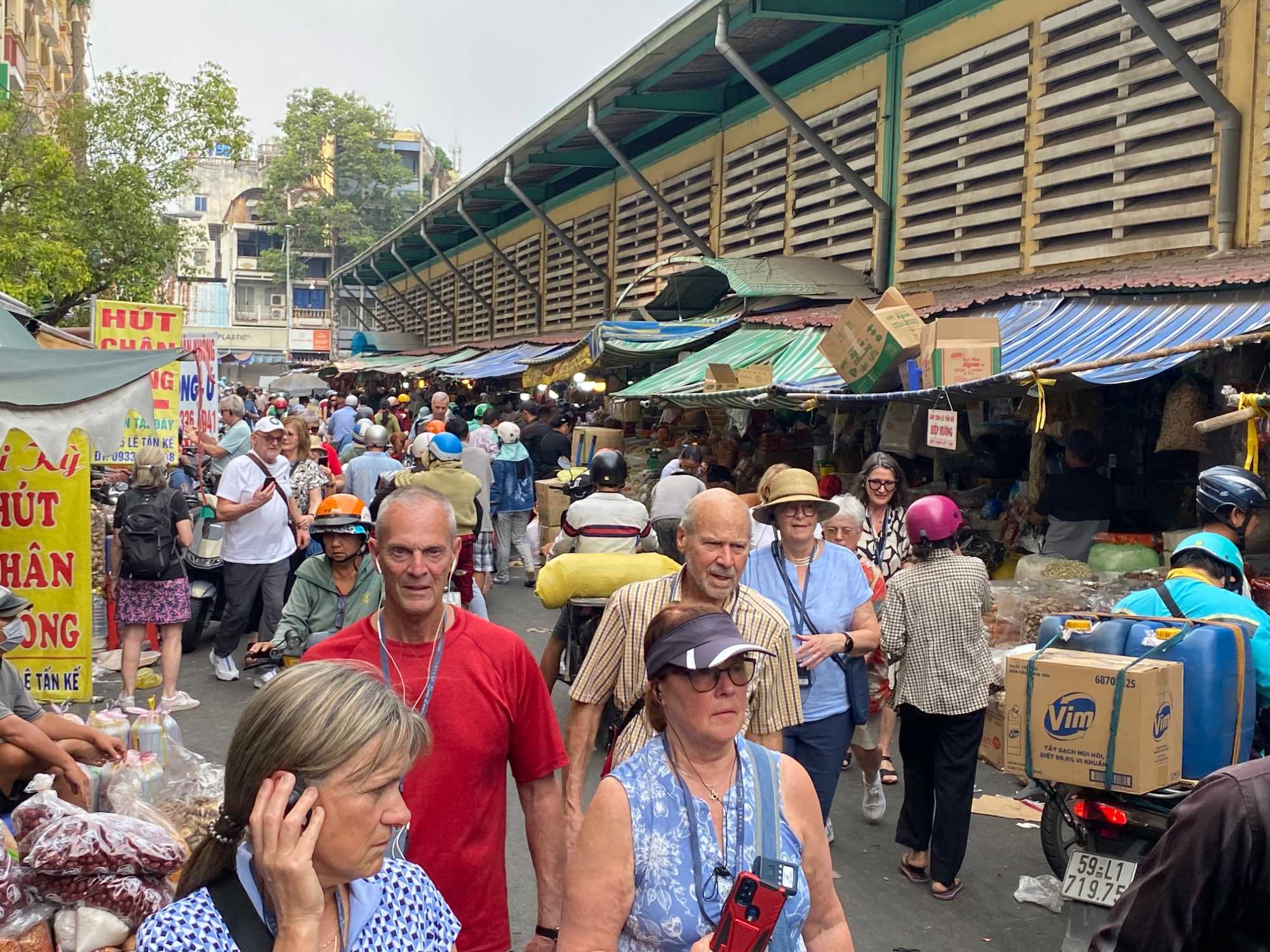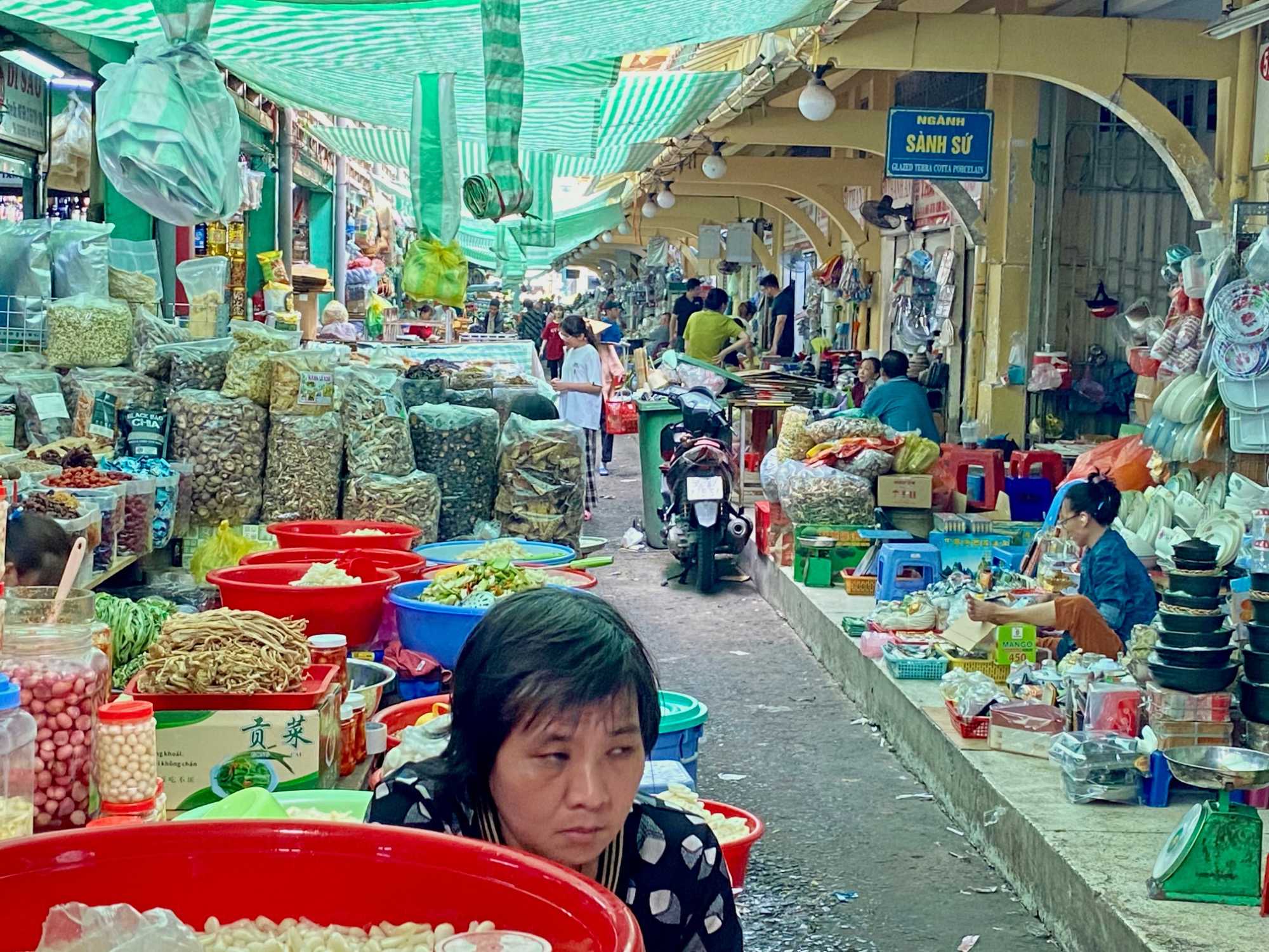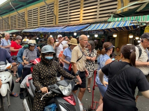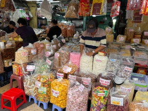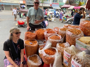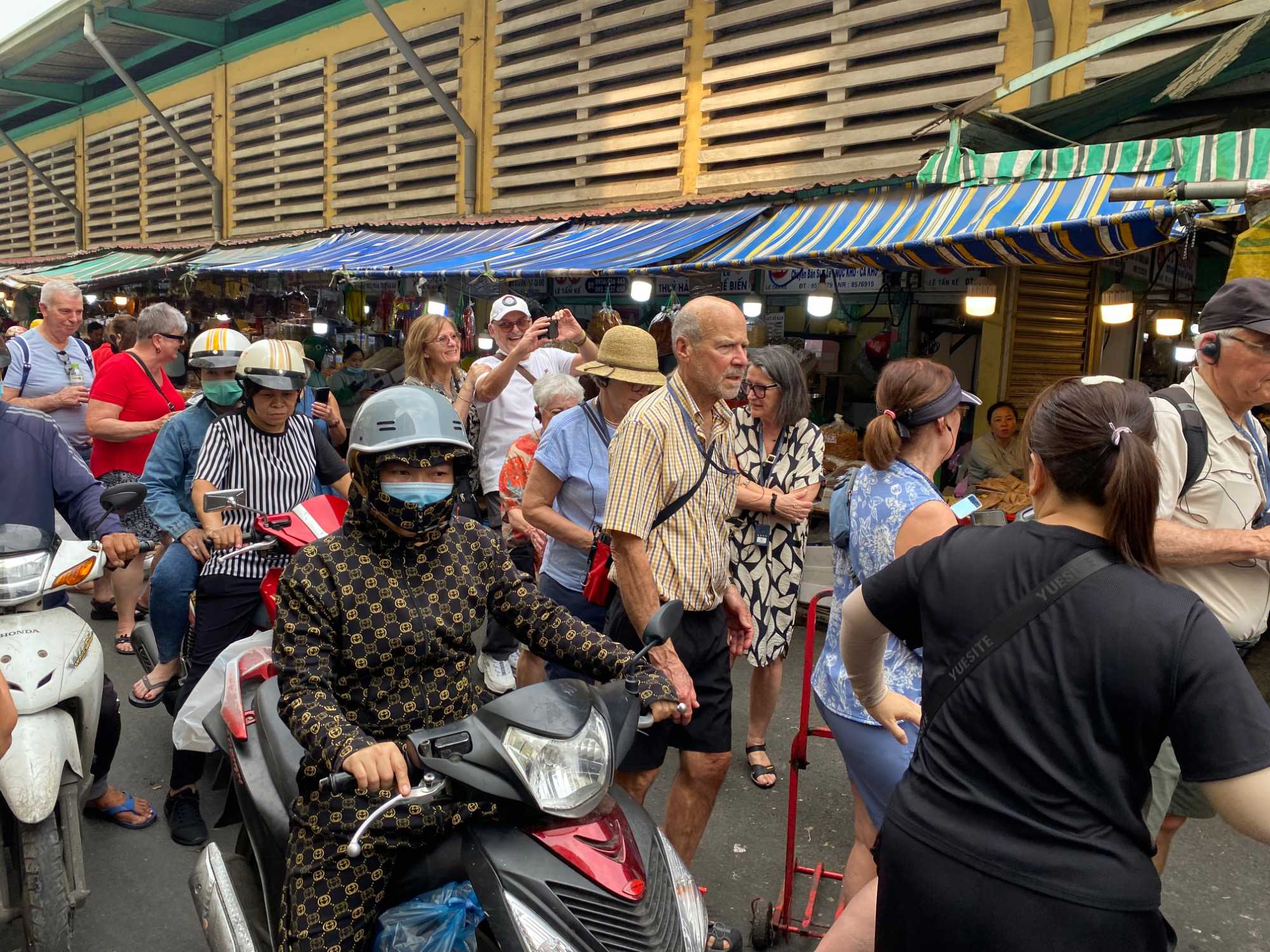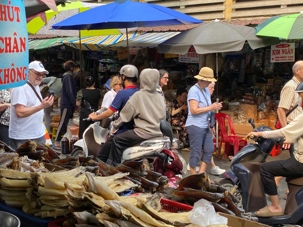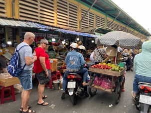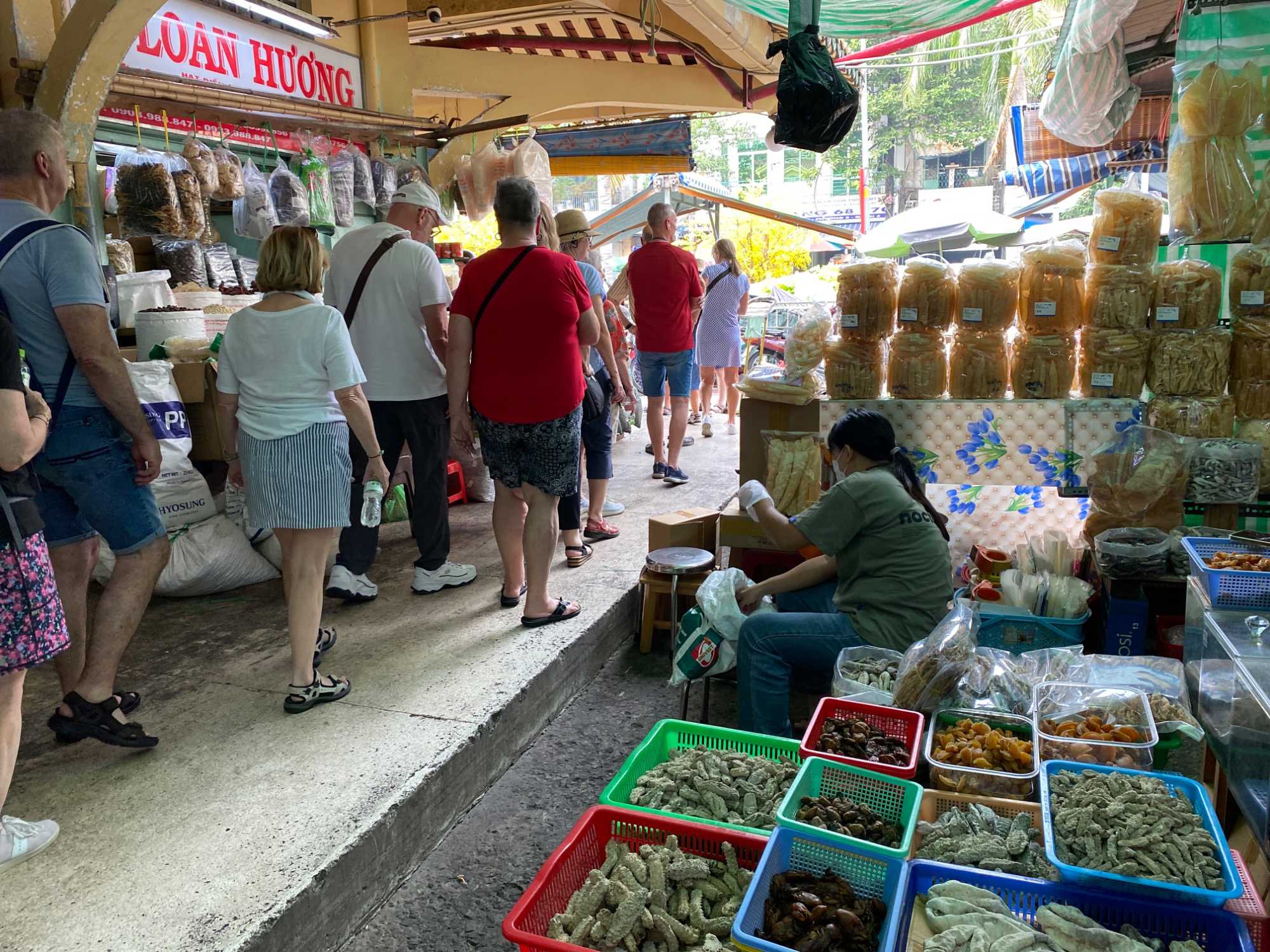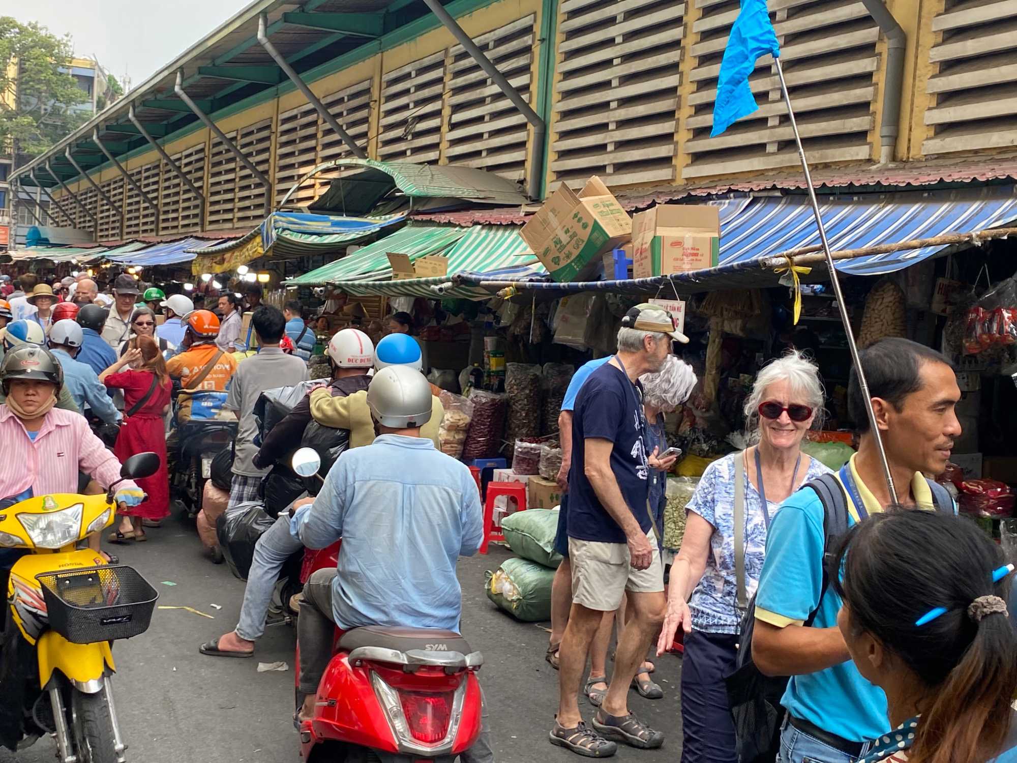 Nous débutons par une balade dans le quartier chinois, Cholon, où nous visitons le Marché Binh Tay. Ce vaste centre commercial traditionnel regroupe une multitude de petites échoppes tenues majoritairement par des commerçants d’origine chinoise. L’émerveillement est au rendez-vous devant l’impressionnante variété de produits : épices, tissus, herbes médicinales, objets traditionnels… un véritable labyrinthe organisé par sections — produits alimentaires, fruits, crevettes et poissons séchés. .. et objets de tout genre. L’endroit est animé par un va-et-vient incessant de marchands et de clients, à pied comme en scooter. La densité de la foule rend la circulation difficile !