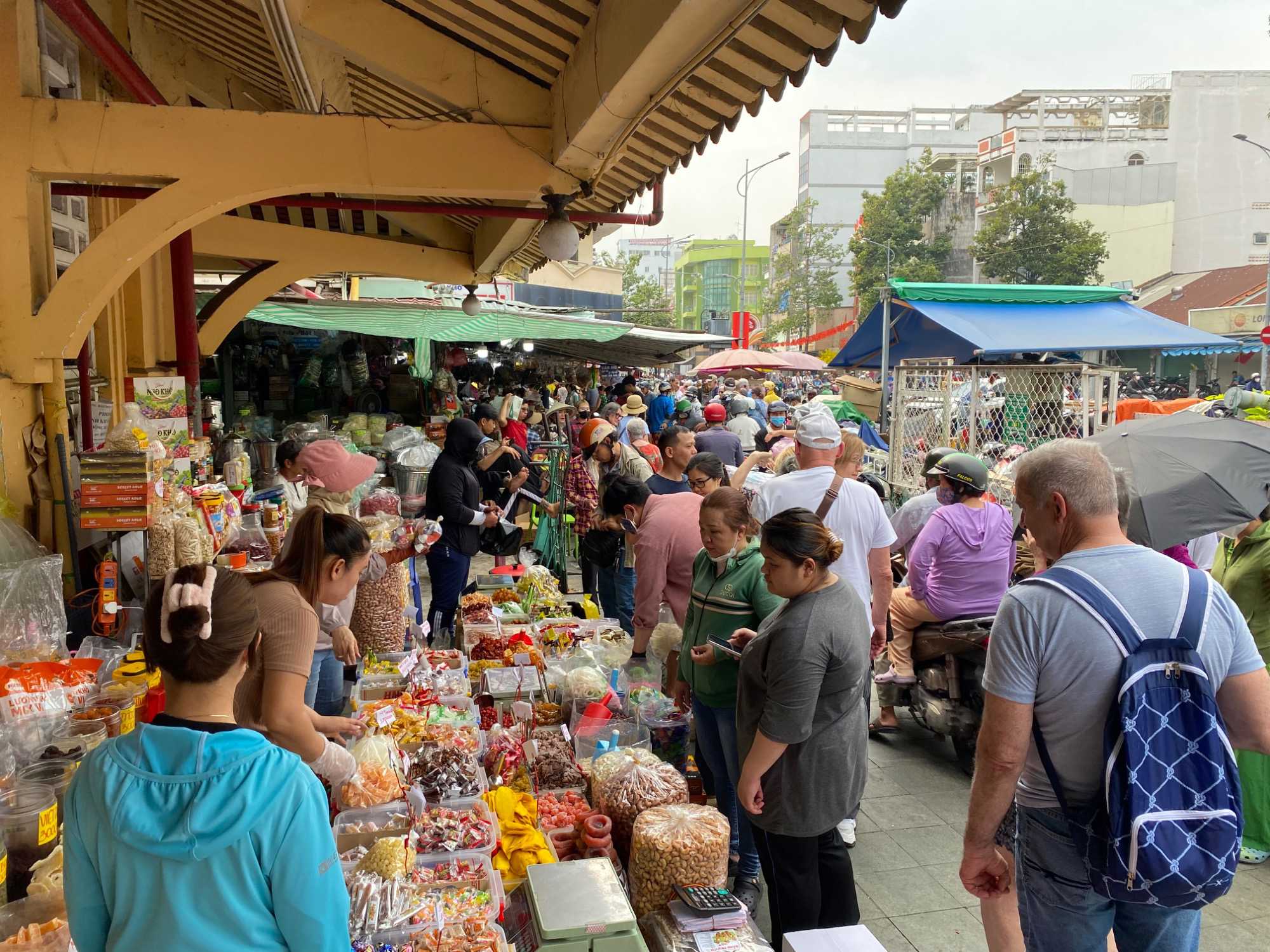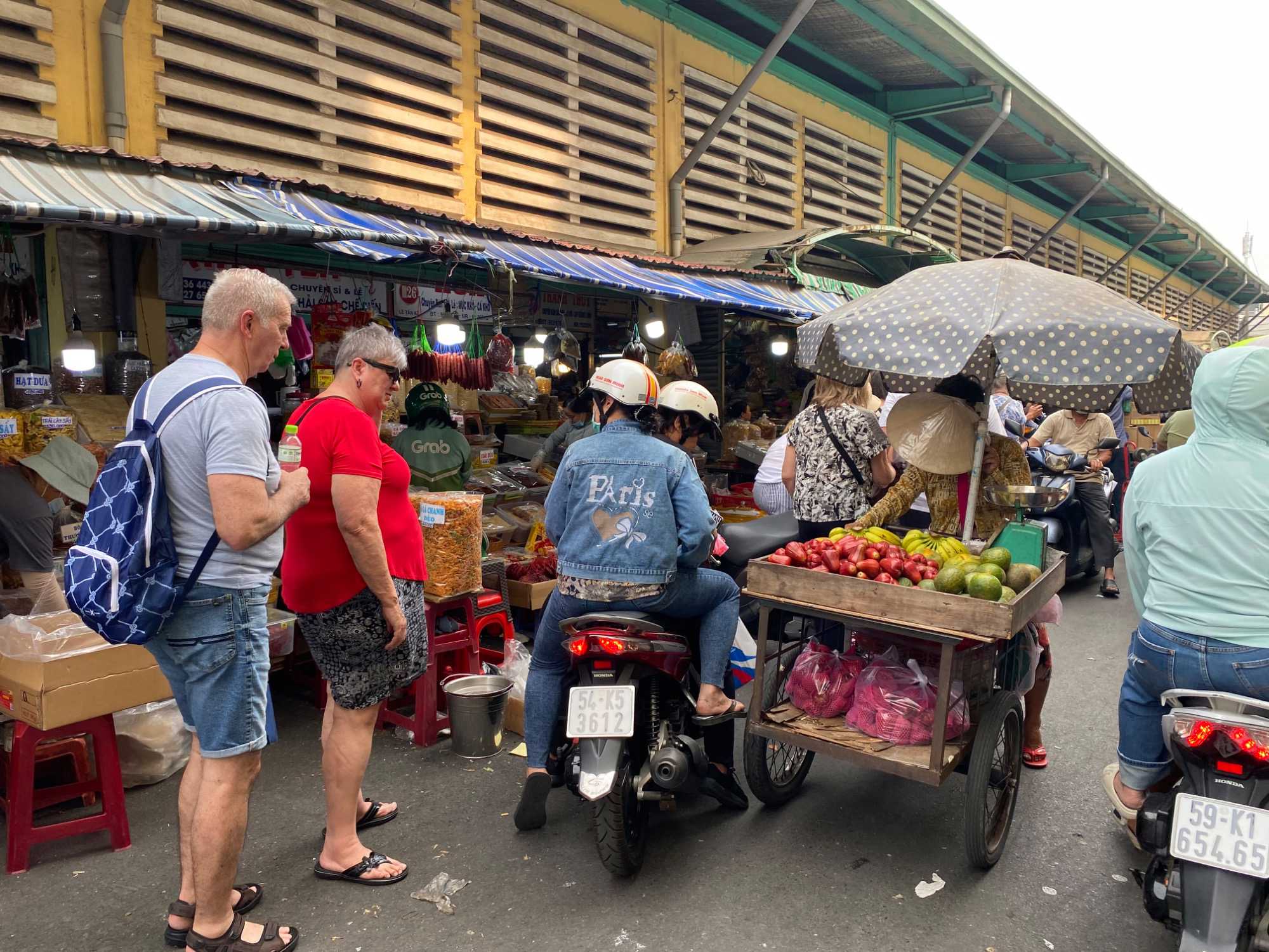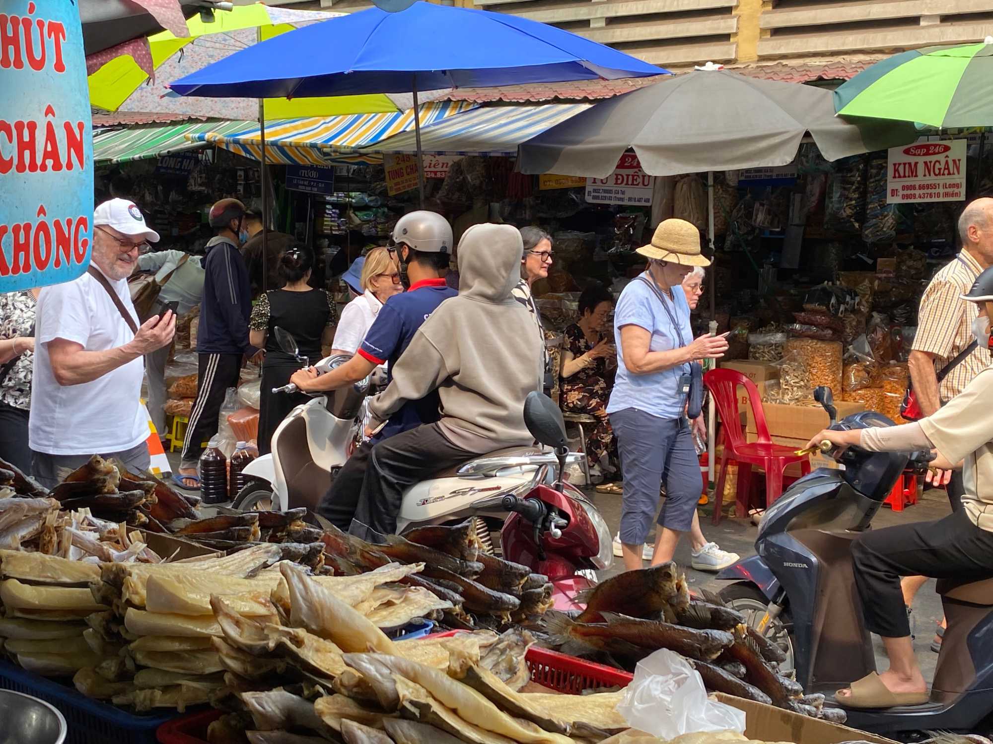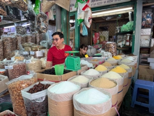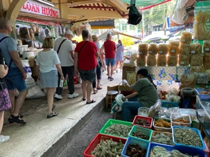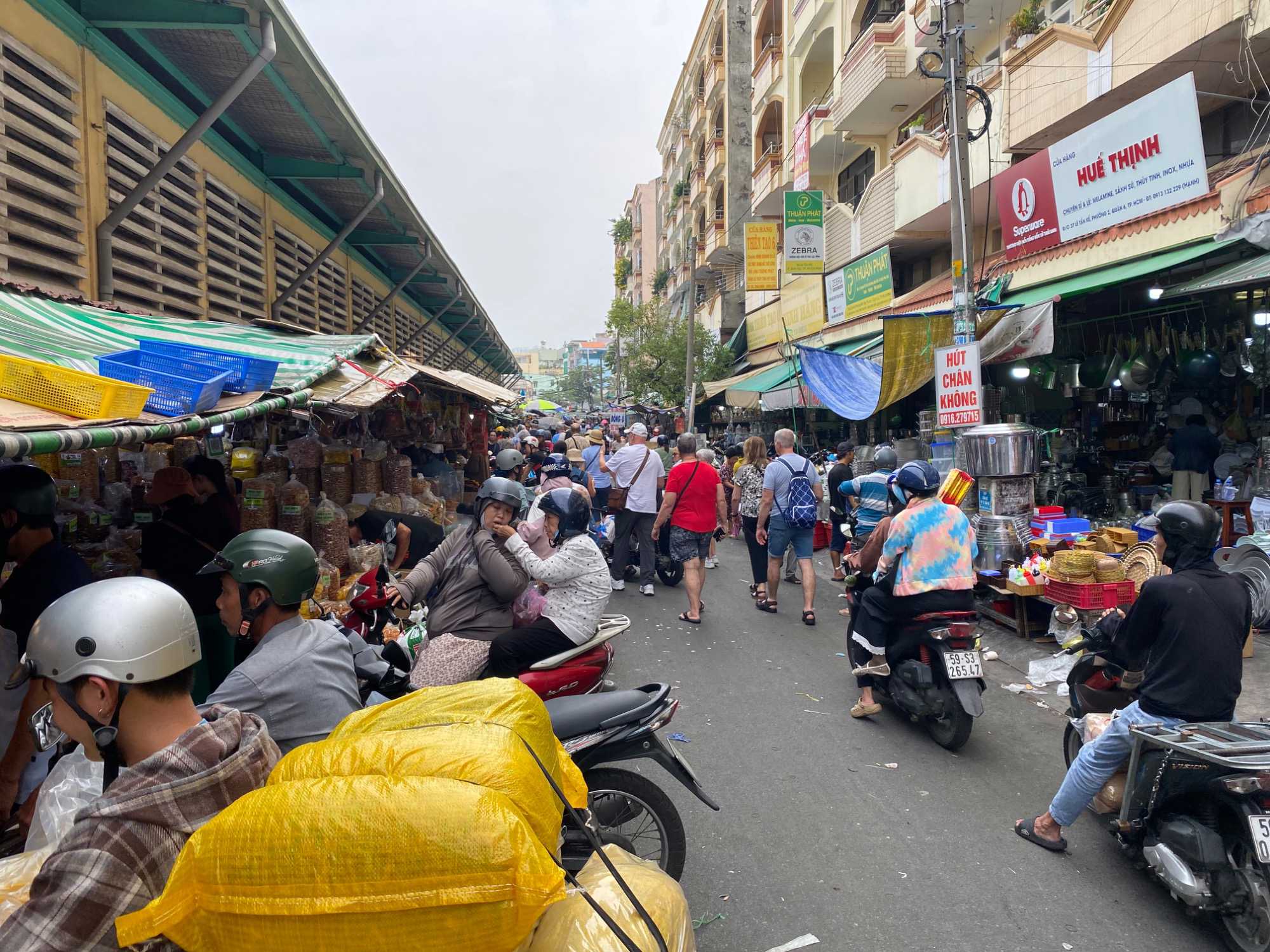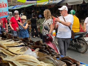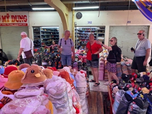Nous débutons par une balade dans le quartier chinois, Cholon, où nous visitons le Marché Binh Tay. Ce vaste centre commercial traditionnel regroupe une multitude de petites échoppes tenues majoritairement par des commerçants d’origine chinoise. L’émerveillement est au rendez-vous devant l’impressionnante variété de produits : épices, tissus, herbes médicinales, objets traditionnels… un véritable labyrinthe organisé par sections — produits alimentaires, fruits, crevettes et poissons séchés. .. et objets de tout genre. L’endroit est animé par un va-et-vient incessant de marchands et de clients, à pied comme en scooter. La densité de la foule rend la circulation difficile !
