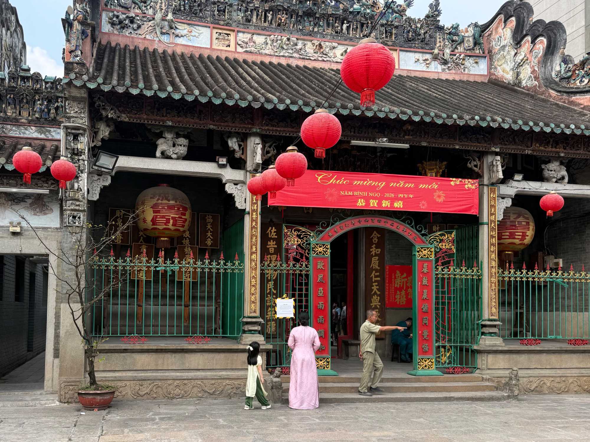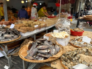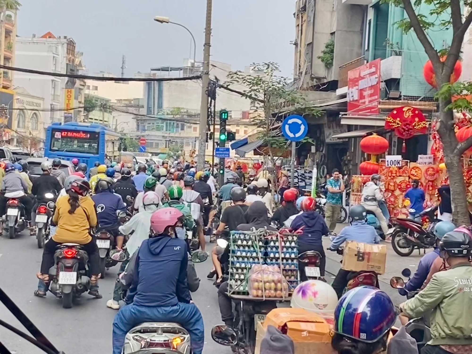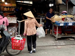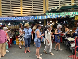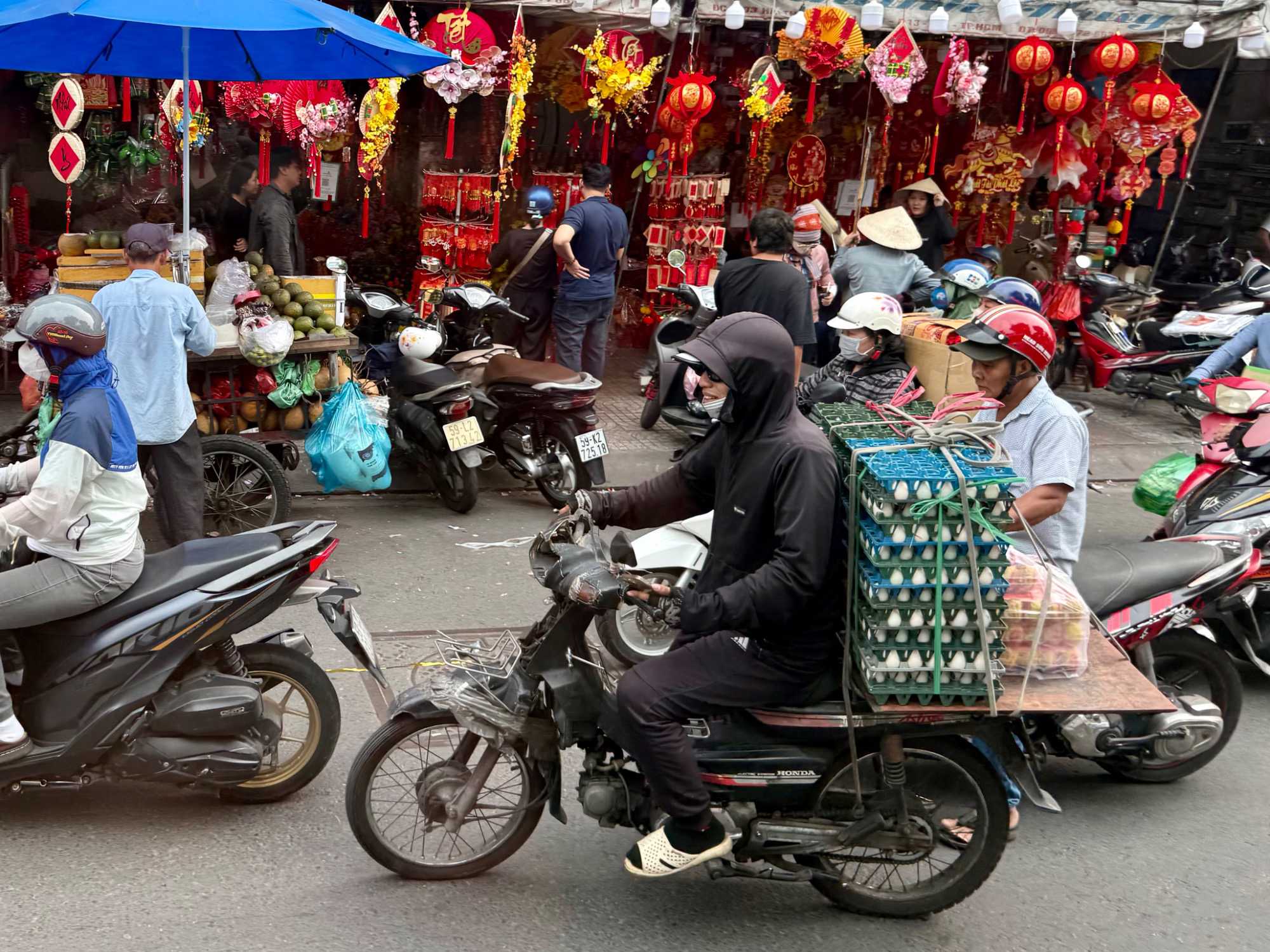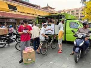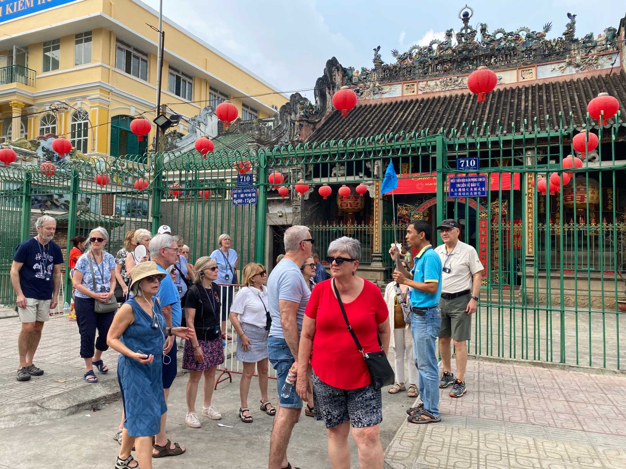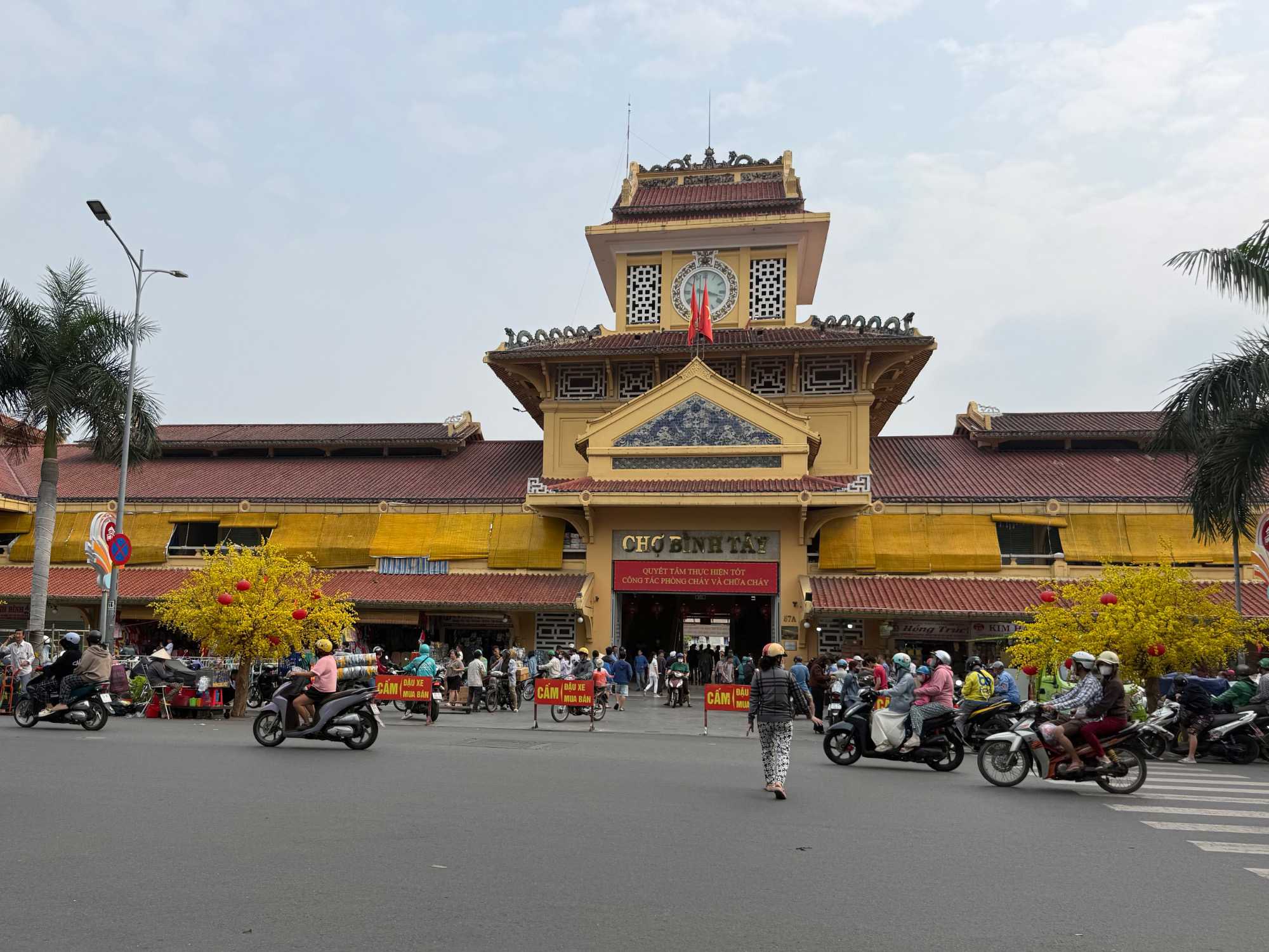 Nous débutons par une balade dans le quartier chinois, Cholon, où nous visitons le Marché Binh Tay. Ce vaste centre commercial traditionnel regroupe une multitude de petites échoppes tenues majoritairement par des commerçants d’origine chinoise. L’émerveillement est au rendez-vous devant l’impressionnante variété de produits : épices, tissus, herbes médicinales, objets traditionnels… un véritable labyrinthe organisé par sections — produits alimentaires, fruits, crevettes et poissons séchés. .. et objets de tout genre. L’endroit est animé par un va-et-vient incessant de marchands et de clients, à pied comme en scooter. La densité de la foule rend la circulation difficile !