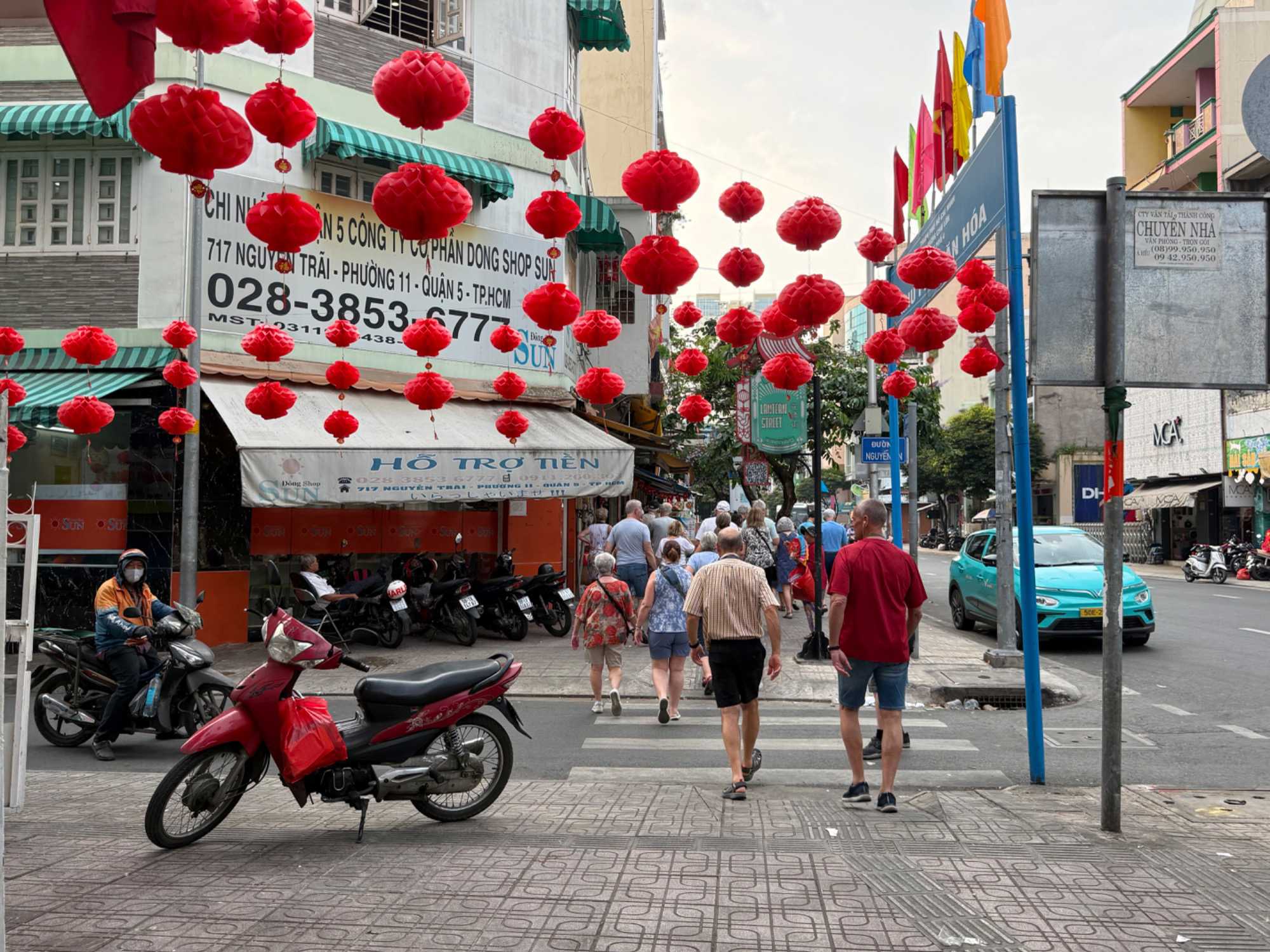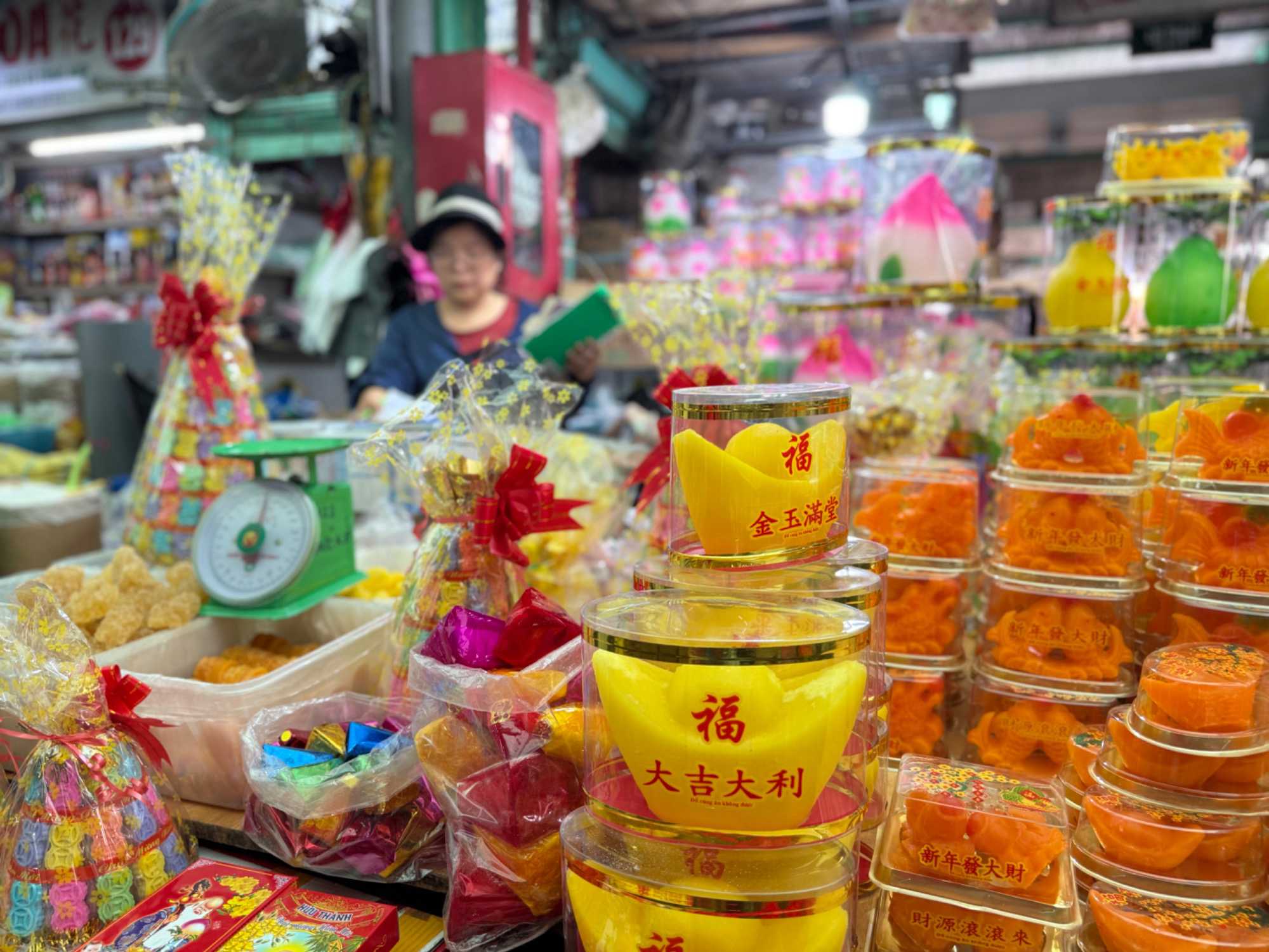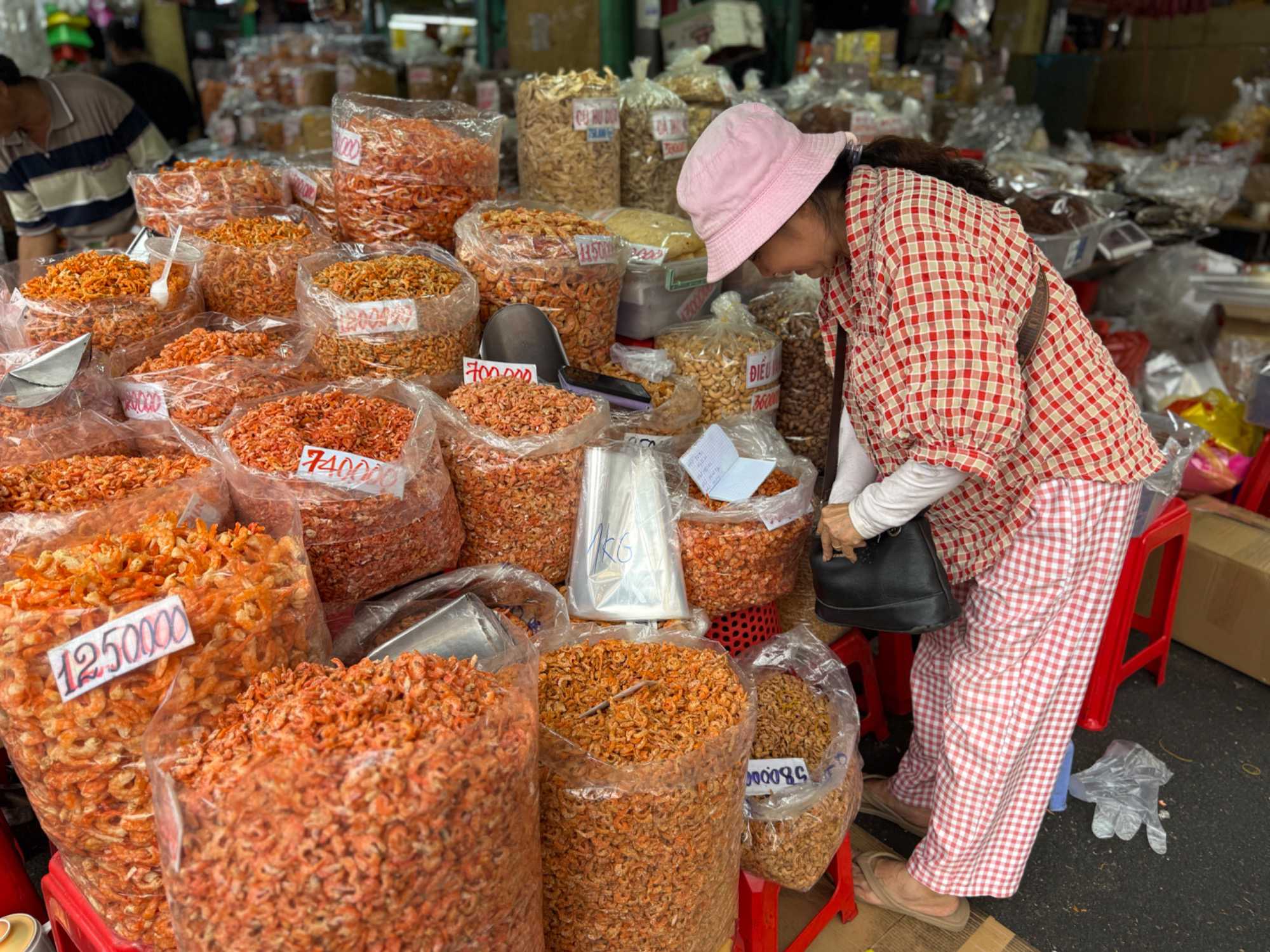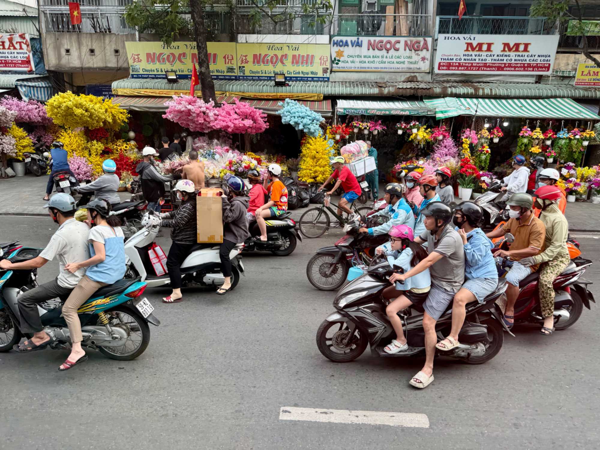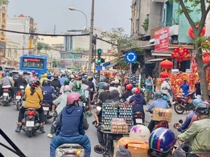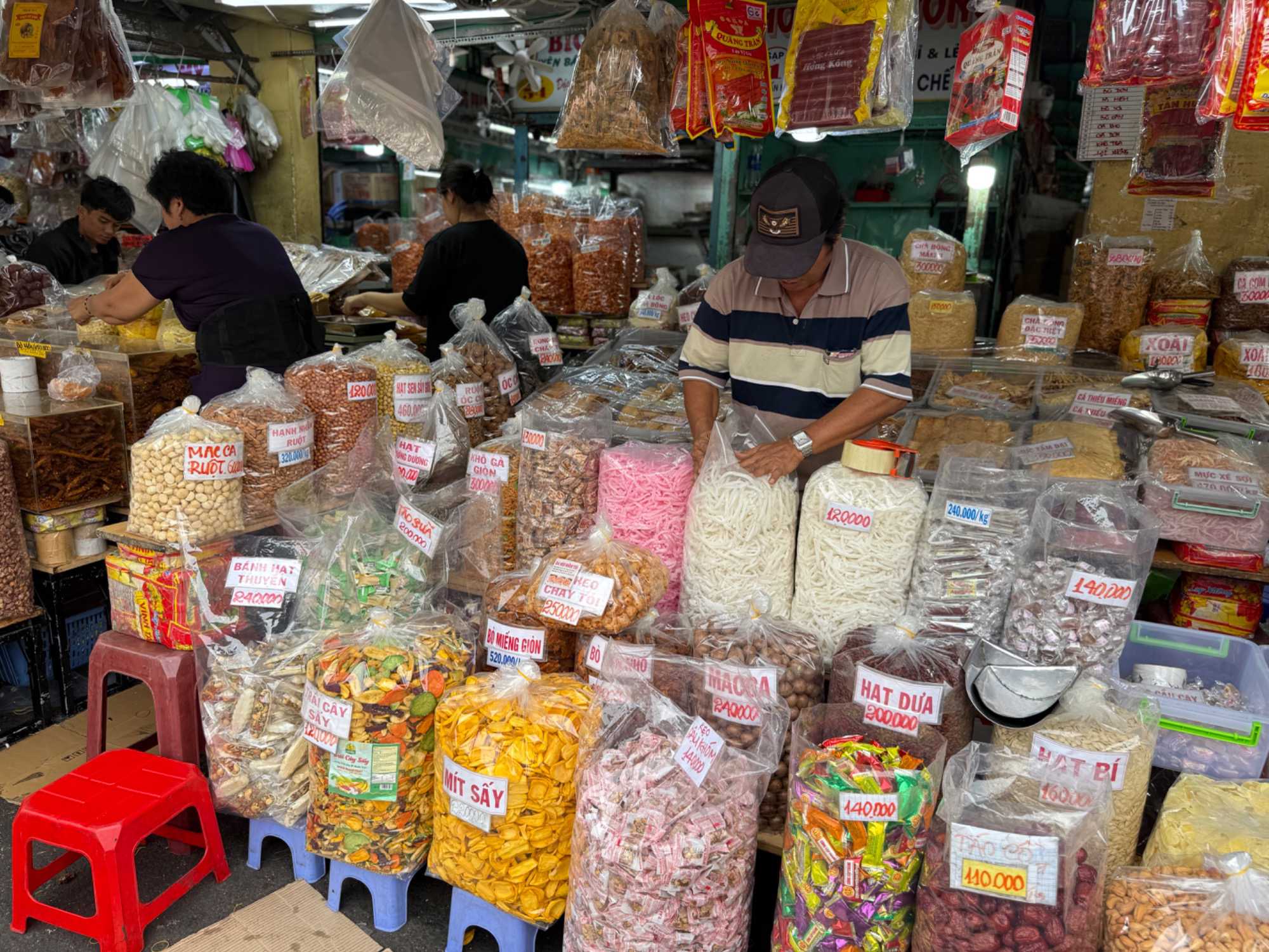 Nous débutons par une balade dans le quartier chinois, Cholon, où nous visitons le Marché Binh Tay. Ce vaste centre commercial traditionnel regroupe une multitude de petites échoppes tenues majoritairement par des commerçants d’origine chinoise. L’émerveillement est au rendez-vous devant l’impressionnante variété de produits : épices, tissus, herbes médicinales, objets traditionnels… un véritable labyrinthe organisé par sections — produits alimentaires, fruits, crevettes et poissons séchés. .. et objets de tout genre. L’endroit est animé par un va-et-vient incessant de marchands et de clients, à pied comme en scooter. La densité de la foule rend la circulation difficile !