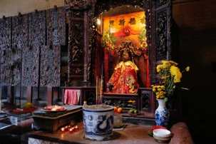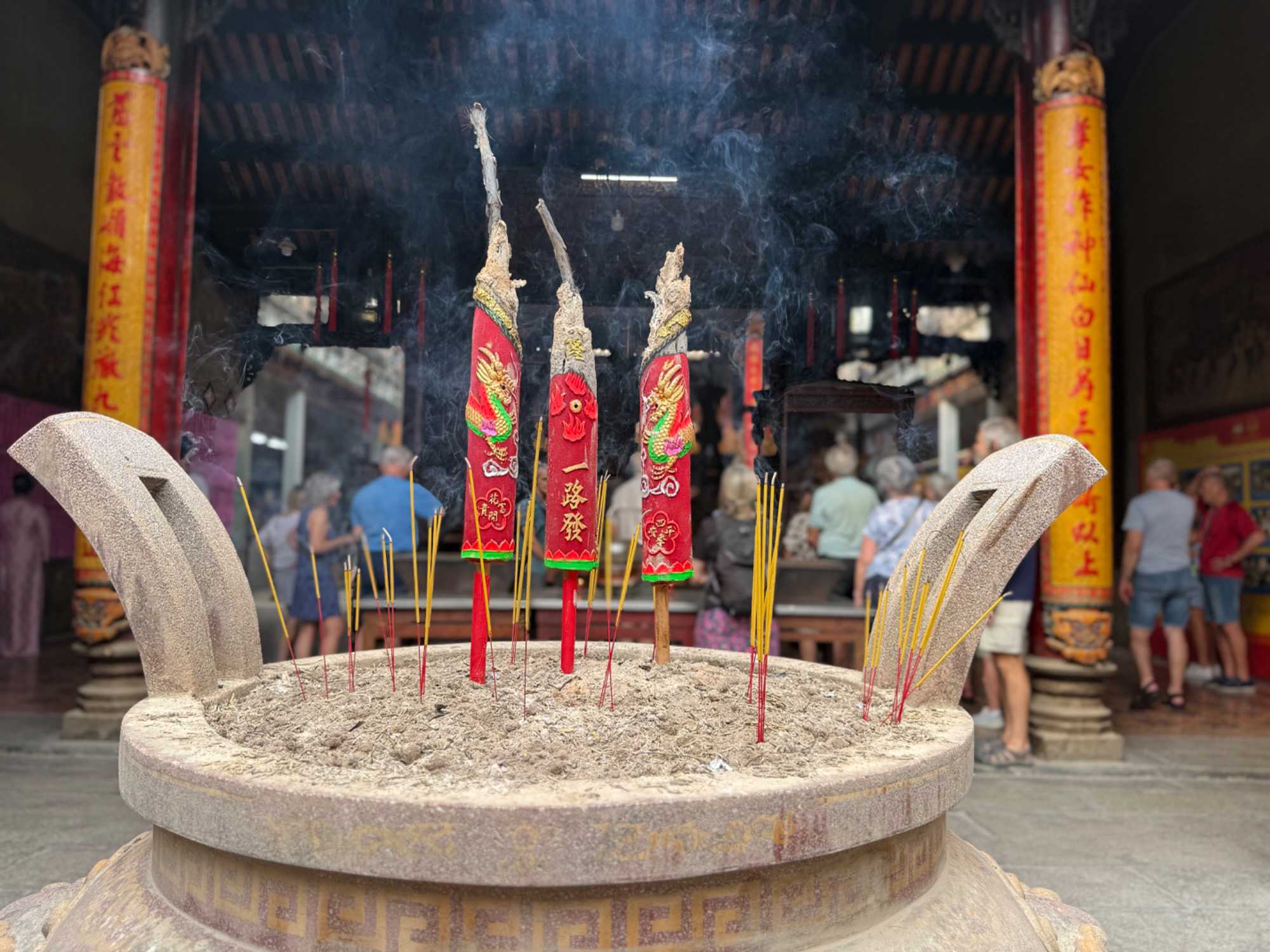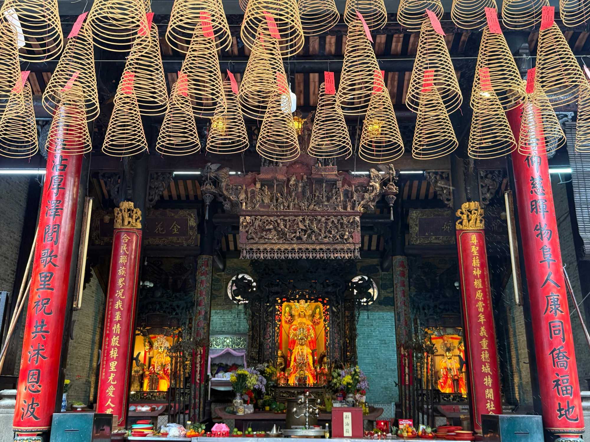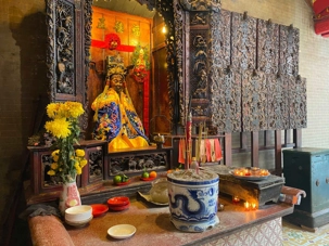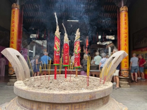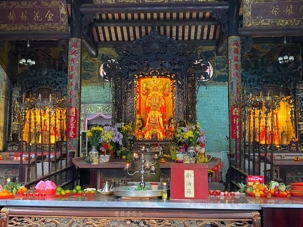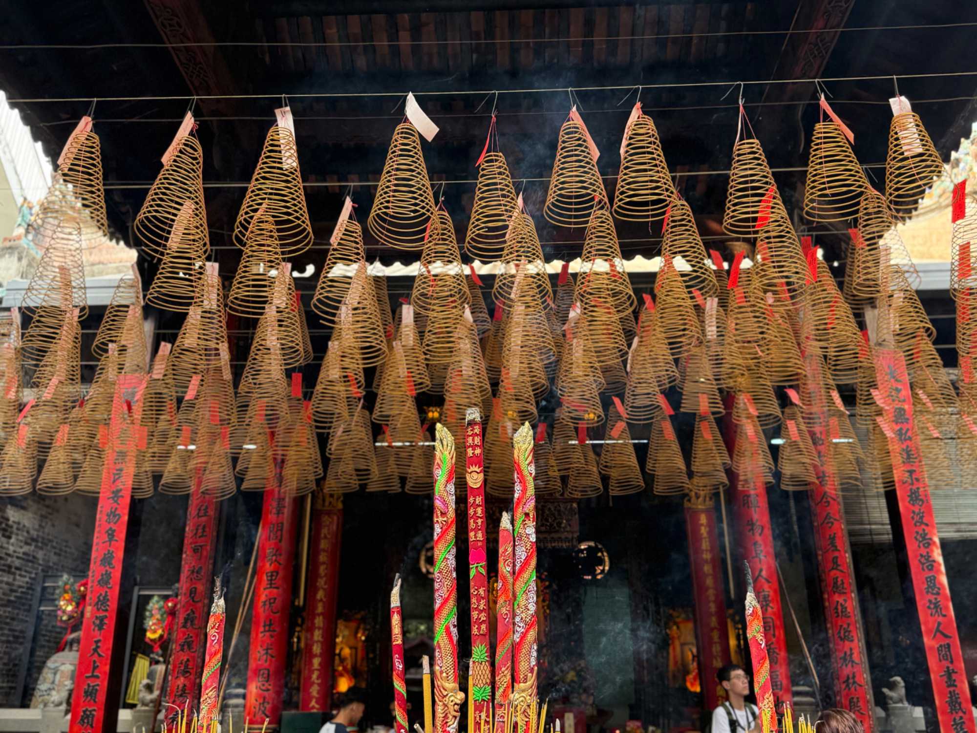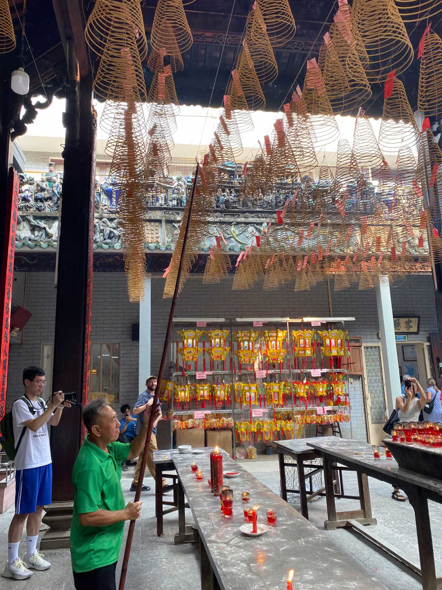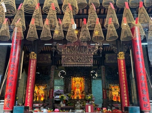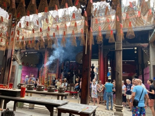 Nous poursuivons avec la visite de la Pagode Thien Hau ( 1680 ), dédiée à la déesse de la mer Mazu, protectrice des marins. Selon la tradition, certains écrivent une intention qu’ils attachent à une grande spirale d’encens suspendue au centre du temple. Celle-ci brûlera durant une semaine, portant leur intention vers les cieux dans l’espoir qu’elle soit exaucée.