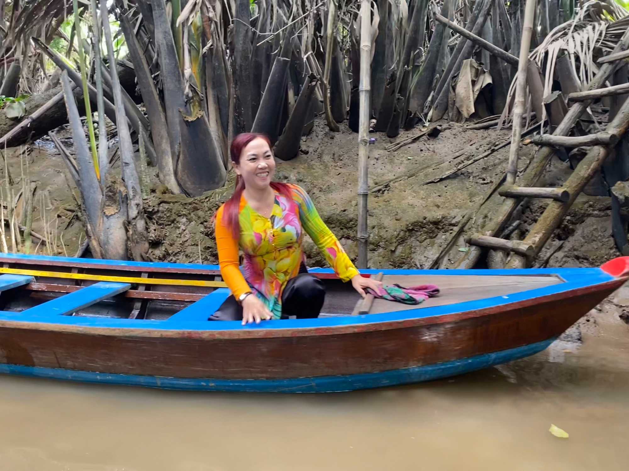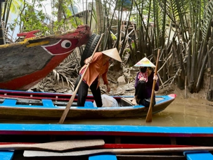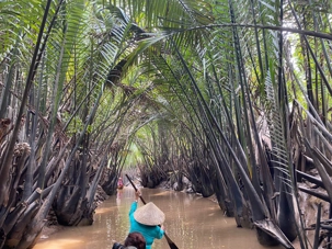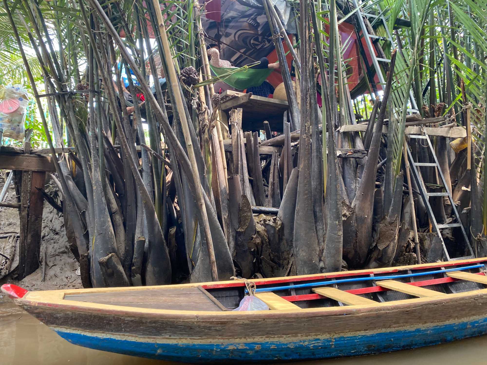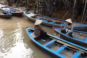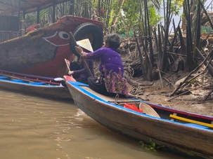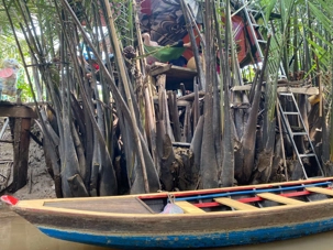 C’est une petite embarcation traditionnelle fabriquée en bois, avec un fond plat qui permet de naviguer facilement en eaux peu profondes. Propulsé à la rame par les villageois il est utilisé au quotidien pour le transport de personnes, de marchandises ou pour la pêche. Ça nous permet de vivre une expérience authentique et paisible, glissant doucement au fil de l’eau, bordé par de gigantesques palmiers, au cœur d’une végétation luxuriante et d’une vie locale intimement liée au fleuve.