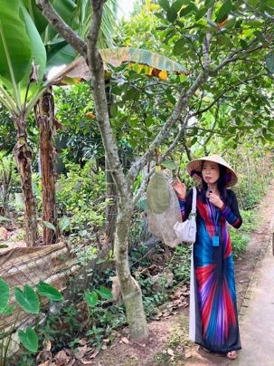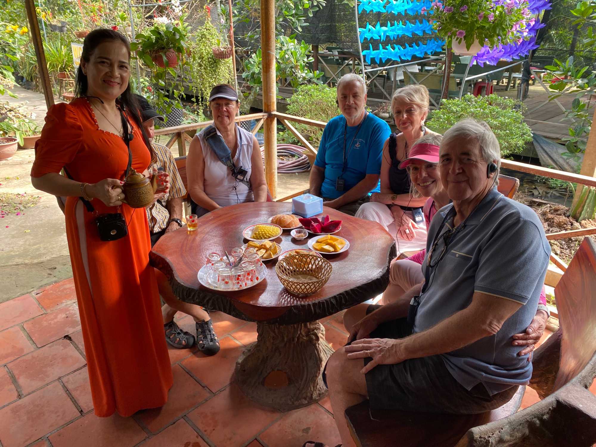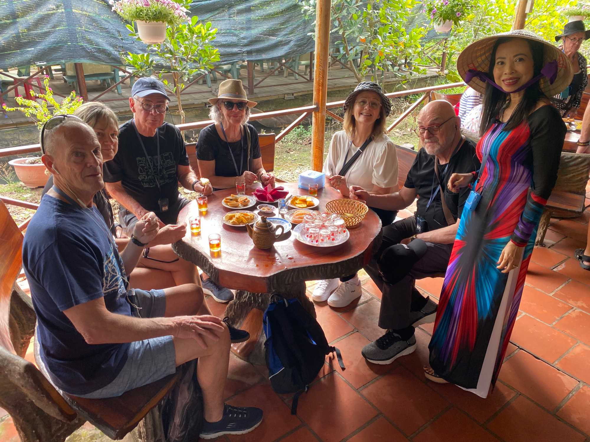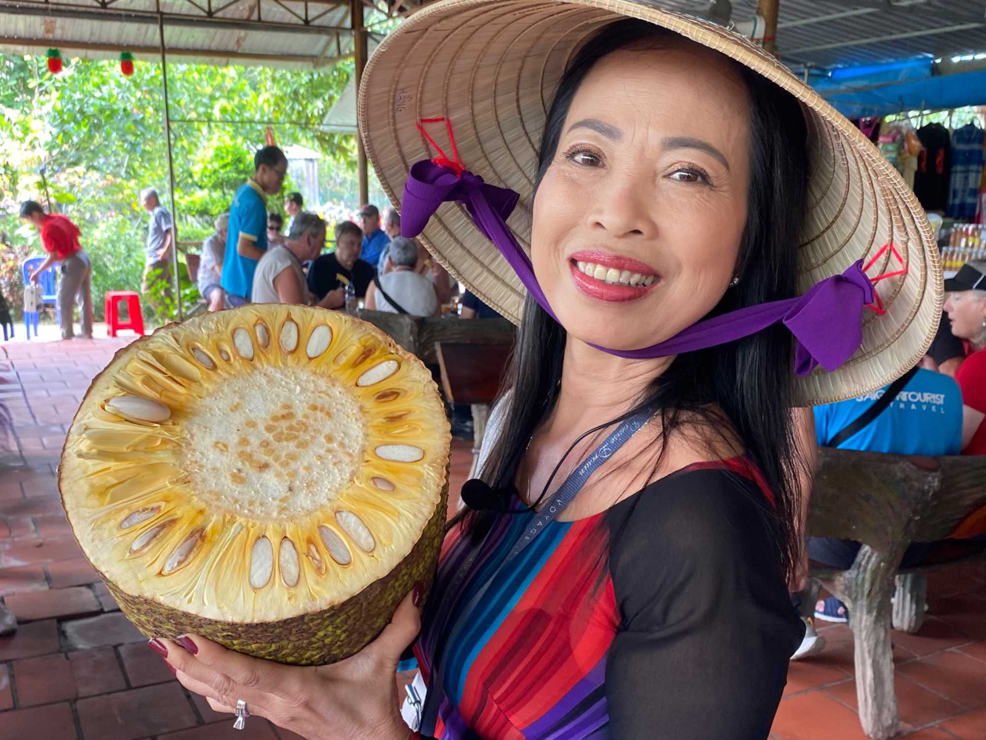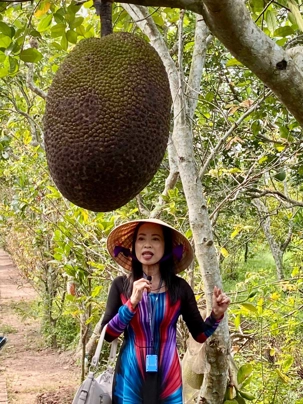 En compagnie de notre nouvelle guide local n nous conduit sur l’île du dragon Thoi Son, la plus grande des quatre île situé en face de la ville de My Tho, pour une dégustation de fruits tropicaux qui abondent dans cette région si fertile. On prend place dans un petit restaurant pour savourer le pamplemousse, le jackfruit, la mangue, la sapotille, l’ananas et