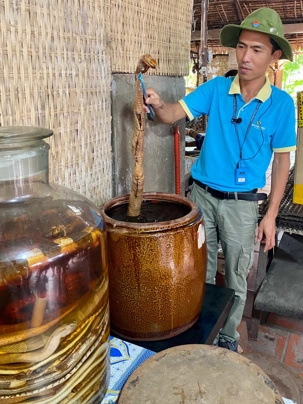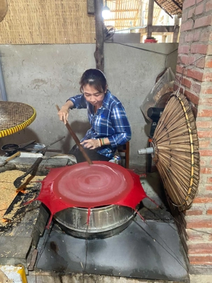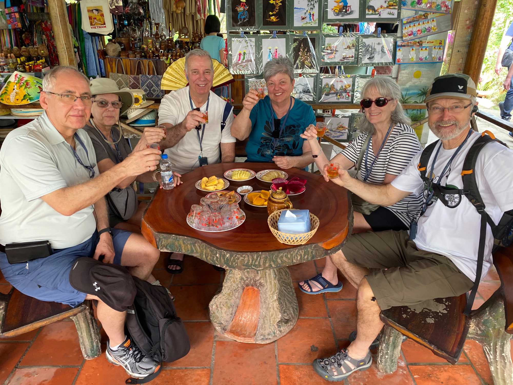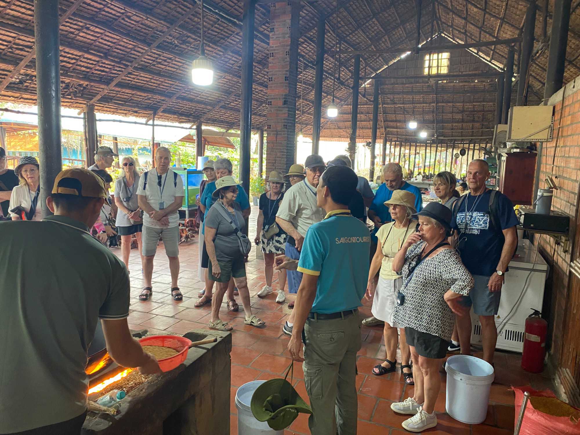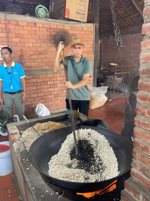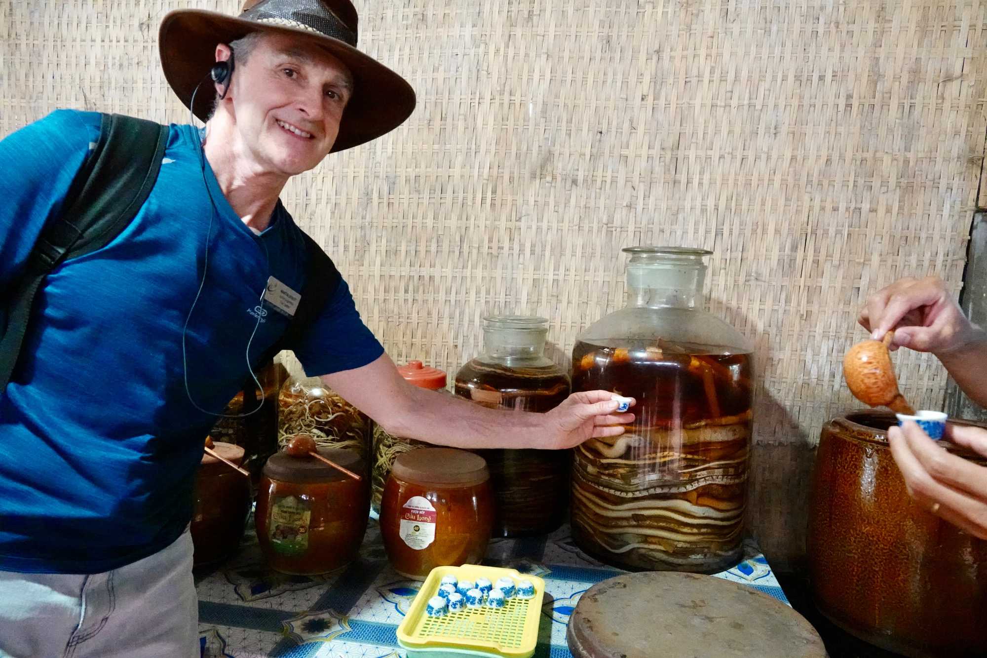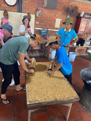 Puis, nous longeons une petite rivière Co Chien, qui nous place dans les loges pour observer le style de vie au quotidien des habitants pour se rendre à Vinh Long pour visiter une fabrique artisanale où nous apprendrons avec démonstration, les techniques de conception du riz soufflé, des caramels à base de lait de coco, des galettes minces de riz utilisées pour les nems et craquelin… On nous offre le délicieux thé de jasmin avec une dégustation de tous ces petites gâteries sucrées. Et le tant qu’à y être; plusieurs goûteront à l’alcool de riz avec macération de serpent de tout genre et d’herbes médicinales. Un voyage qui nous permet de découvrir toute cette diversité culturelle!!