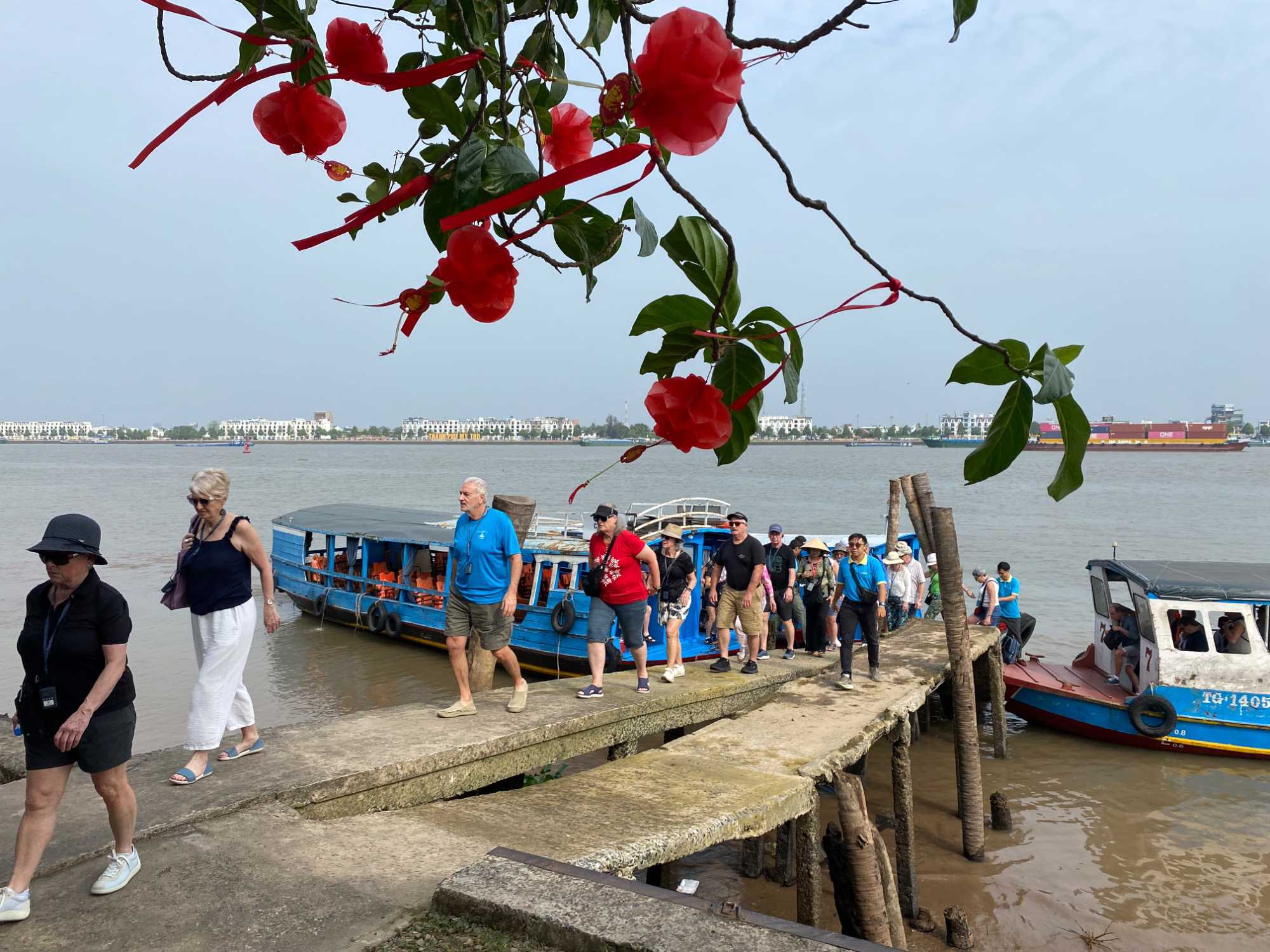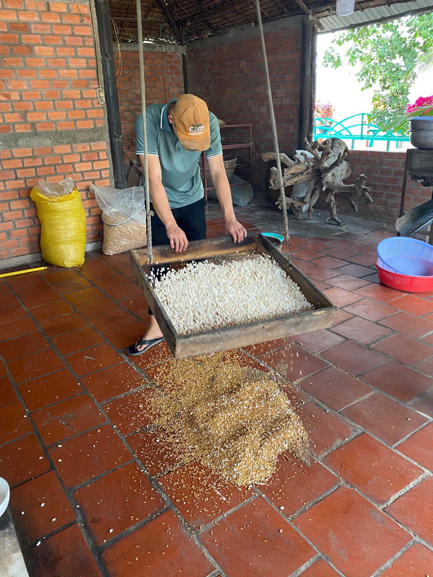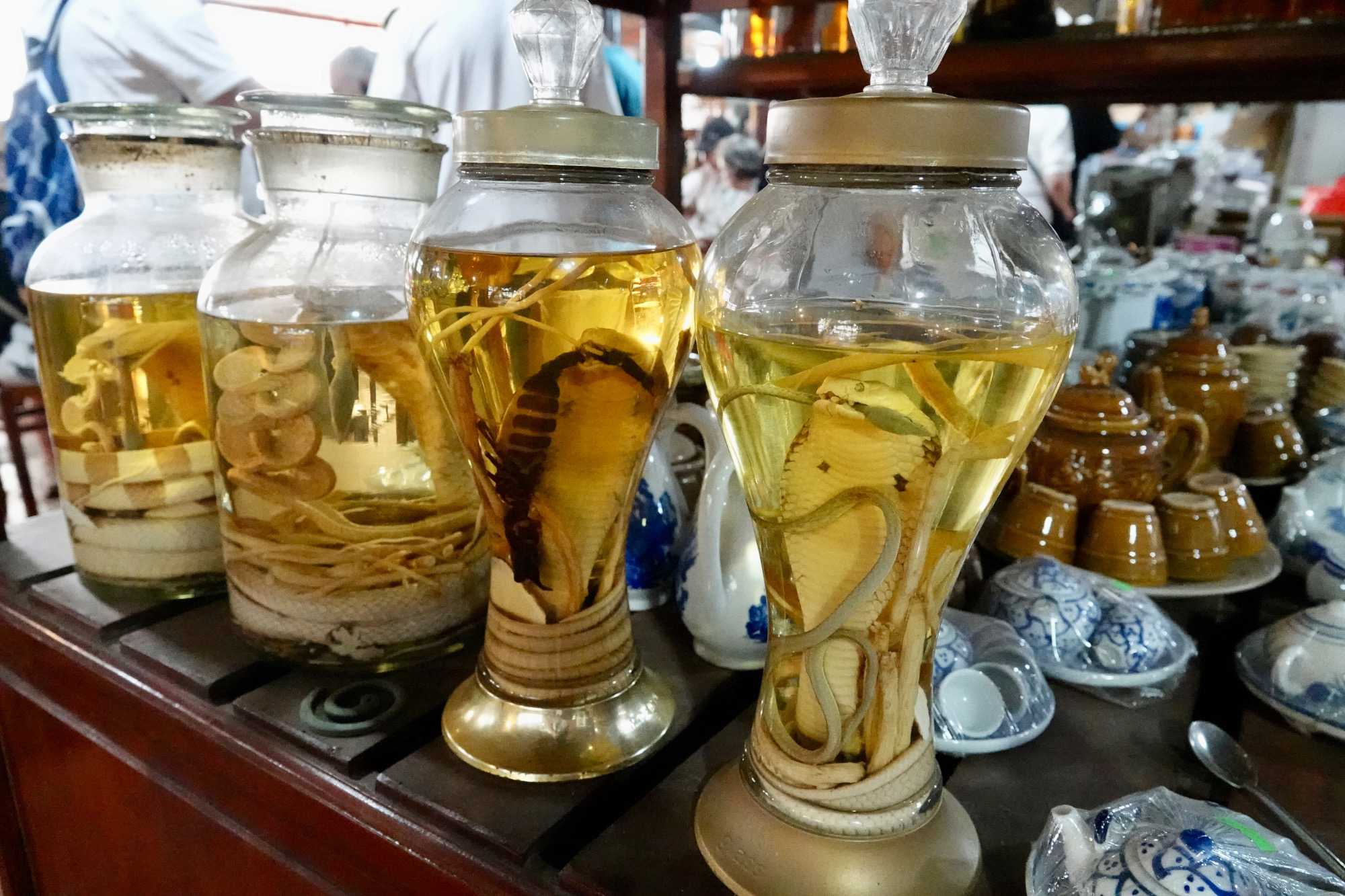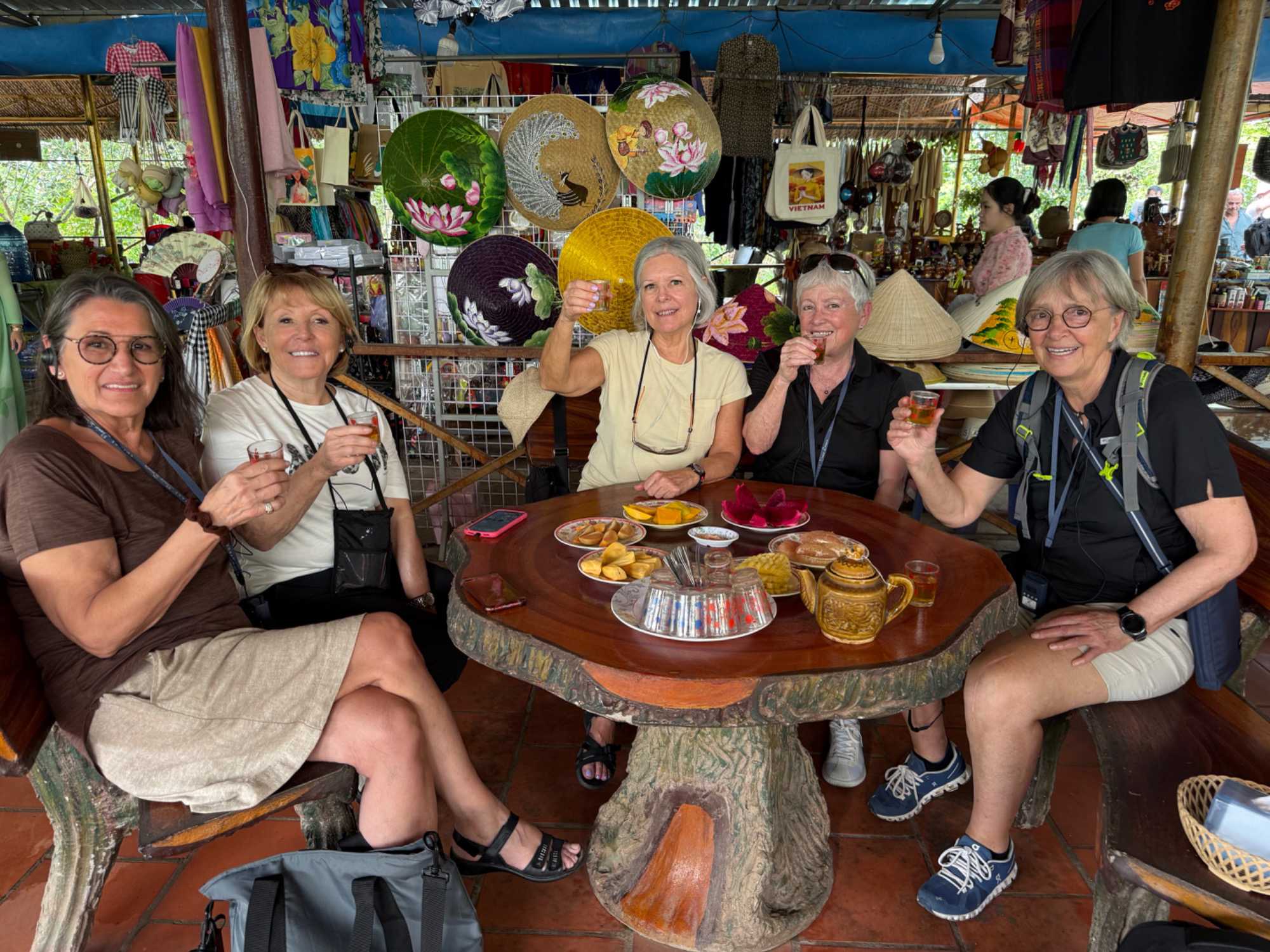 Puis, nous longeons une petite rivière Co Chien, qui nous place dans les loges pour observer le style de vie au quotidien des habitants pour se rendre à Vinh Long pour visiter une fabrique artisanale où nous apprendrons avec démonstration, les techniques de conception du riz soufflé, des caramels à base de lait de coco, des galettes minces de riz utilisées pour les nems et craquelin… On nous offre le délicieux thé de jasmin avec une dégustation de tous ces petites gâteries sucrées. Et le tant qu’à y être; plusieurs goûteront à l’alcool de riz avec macération de serpent de tout genre et d’herbes médicinales. Un voyage qui nous permet de découvrir toute cette diversité culturelle!!
