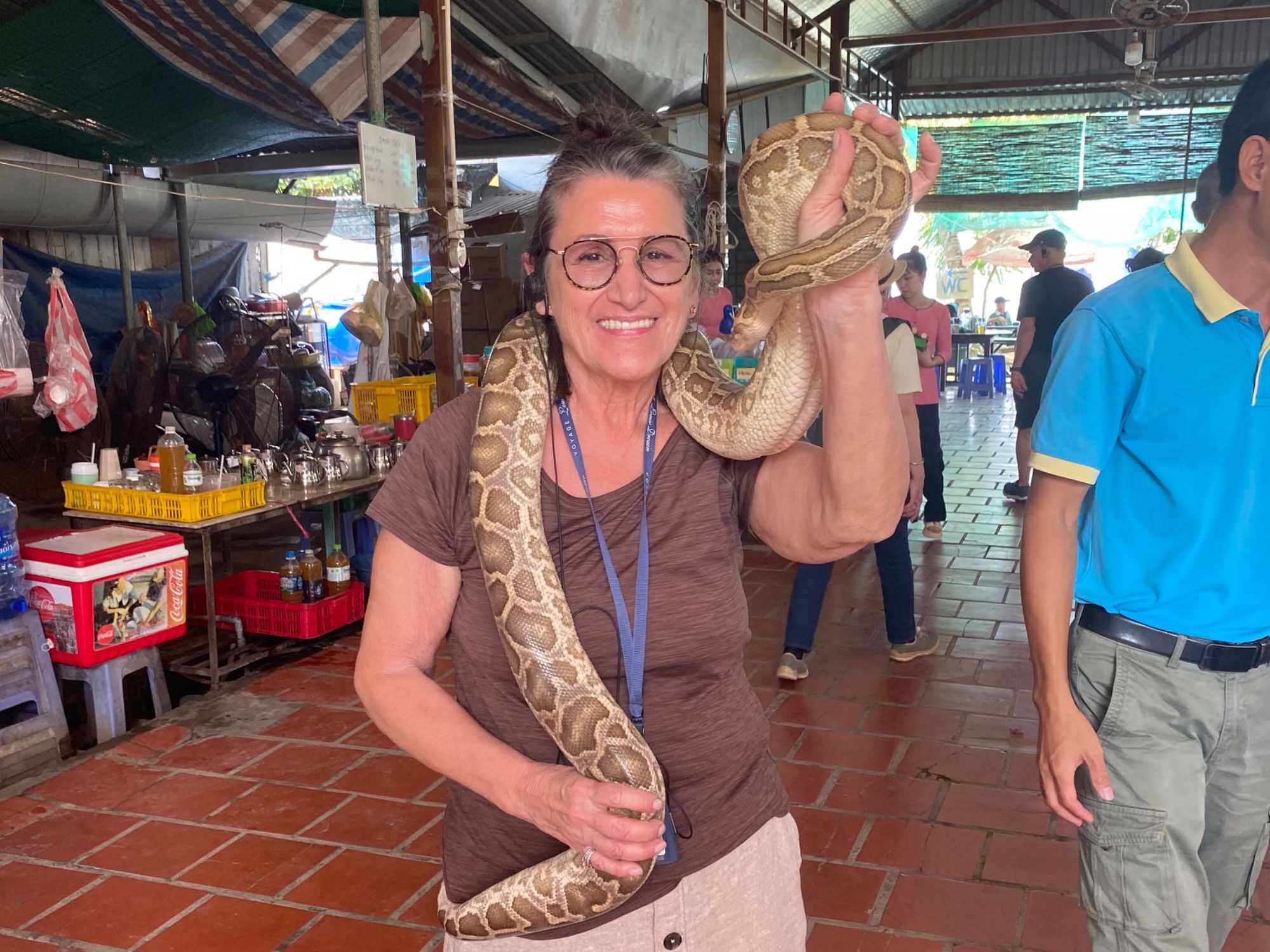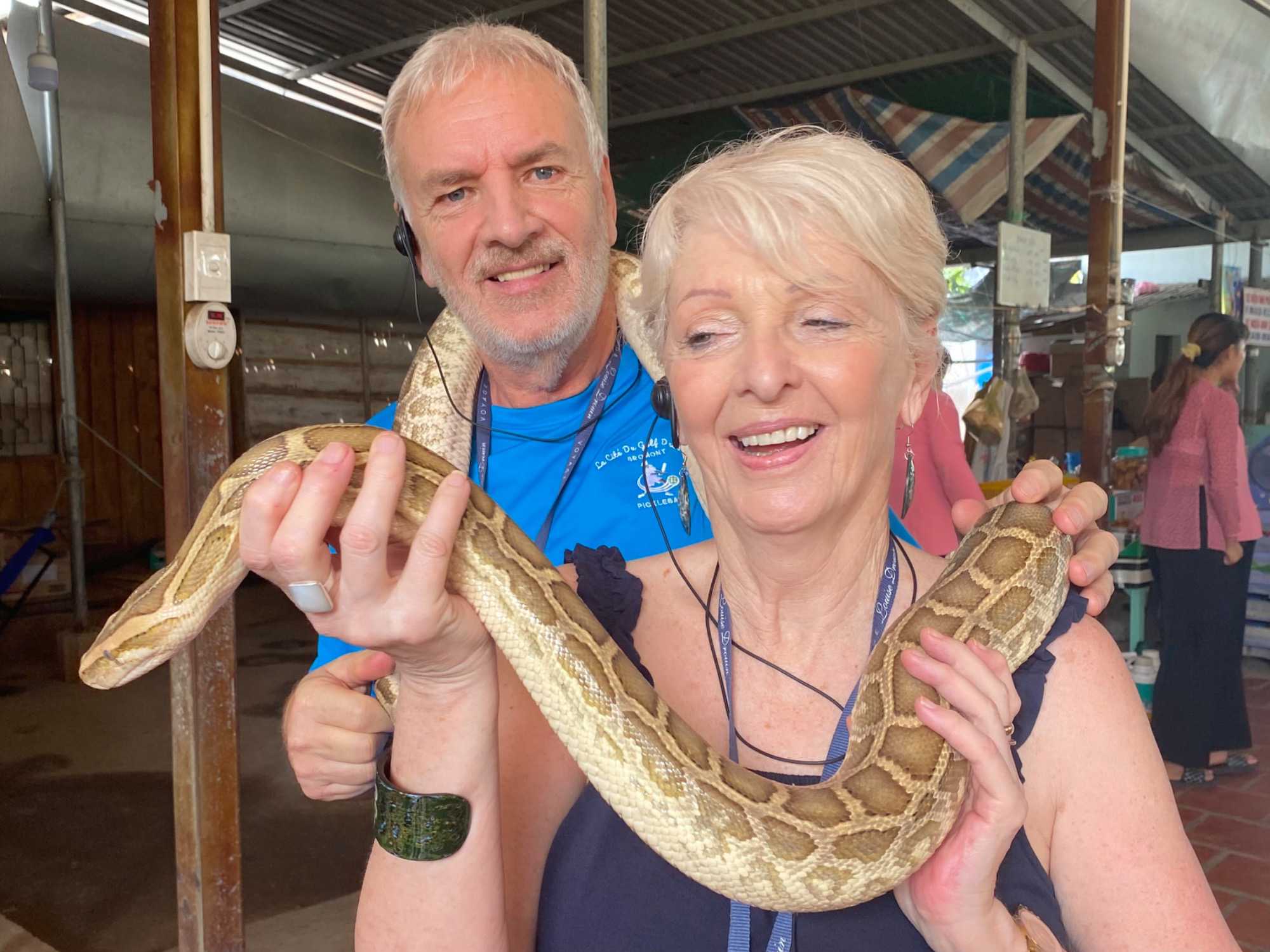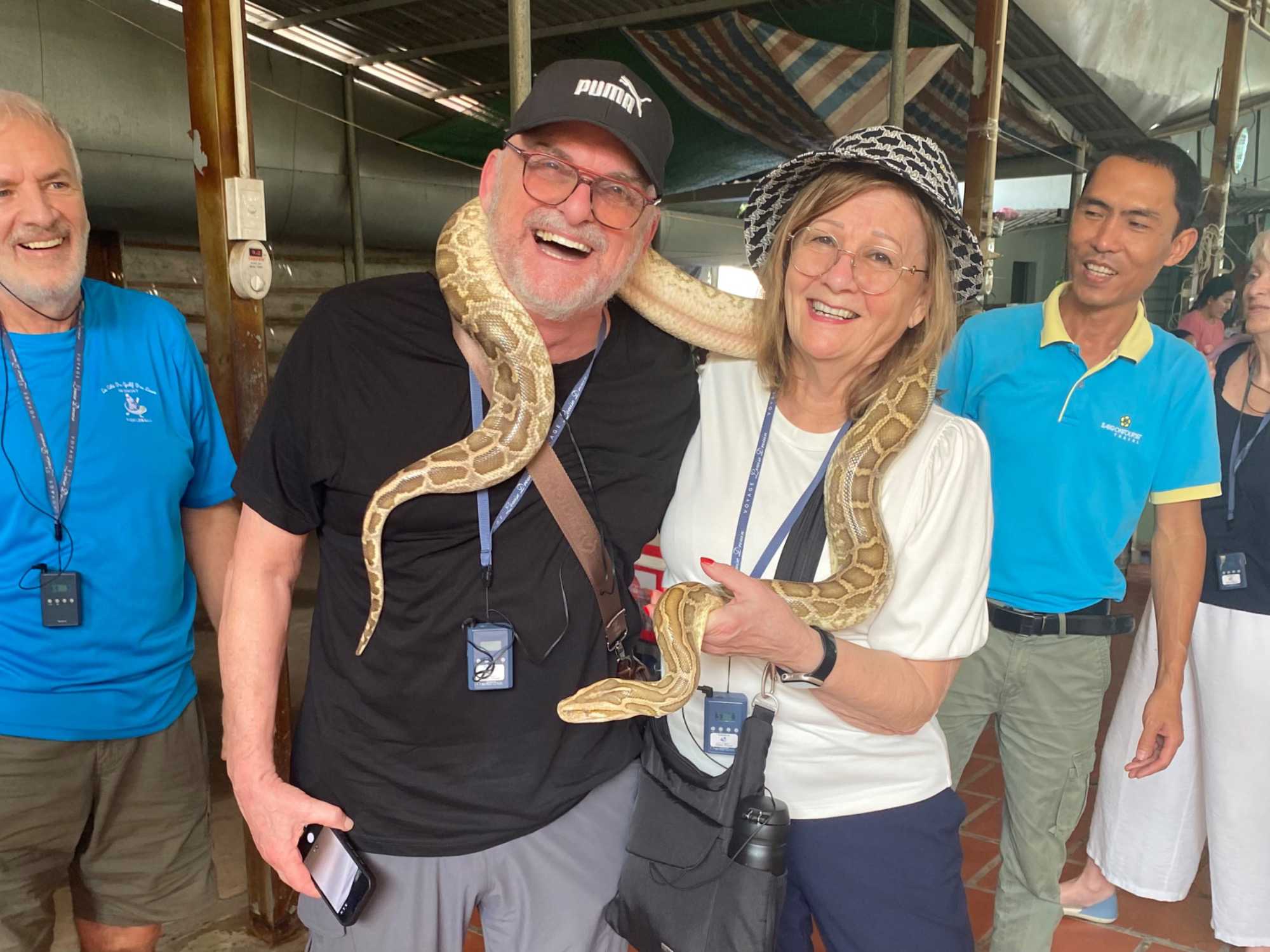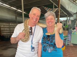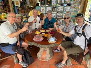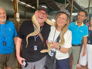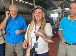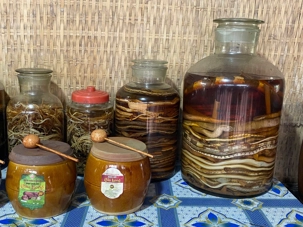 Nous poursuivons notre exploration de la région en allant chez un apiculteur, qui nous accueille pour la dégustation de ses produits aux multiples vertus. Nous dégustons un thé au miel, auquel nous y ajoutons une demi-cuillère de la précieuse gelée royale, du propolis (pollen) et du miel, tout en croustillant des bananes séchées. Après explications de tous les bienfaits de cette médecine naturelle aux propriétés de jouvence, nous en profitons pour faire quelques achats pour bénéficier de cette opportunité onéreuse à des prix très bas. Avec la présence de plusieurs reptiles de la région, quoi de mieux que en observer de plus près. Certains repousserons leur limite en se laissant enlacer par un énorme serpent.