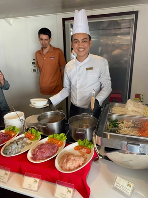Pour dîner, nous retournons à bord de notre bateau pour partager à nouveau un excellent repas. Quel privilège nous avons de savourer autant de saveur.