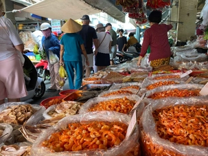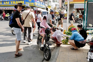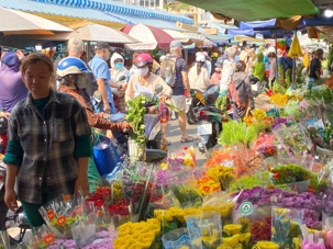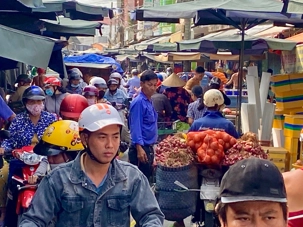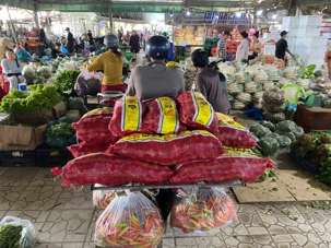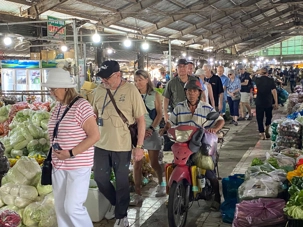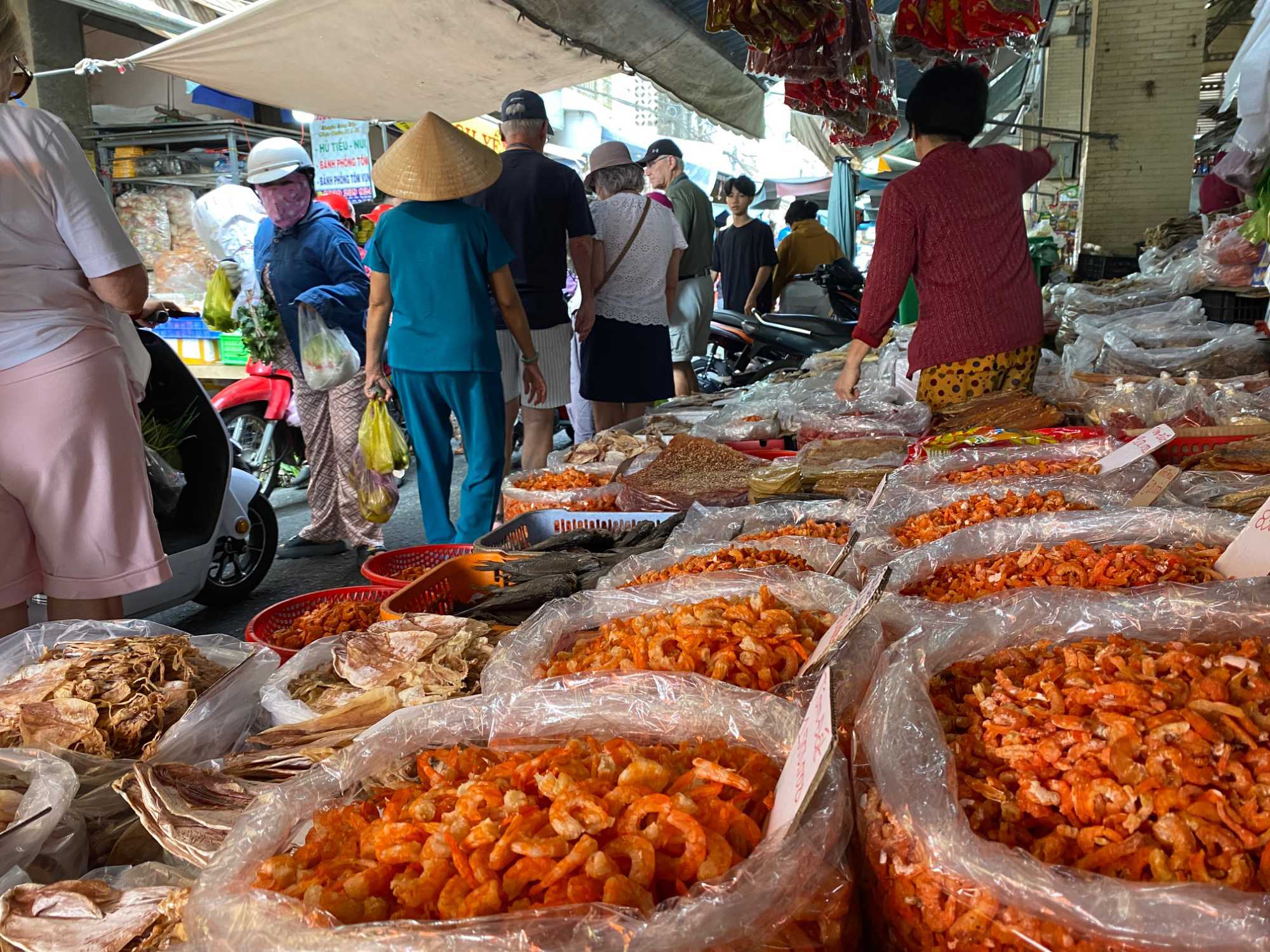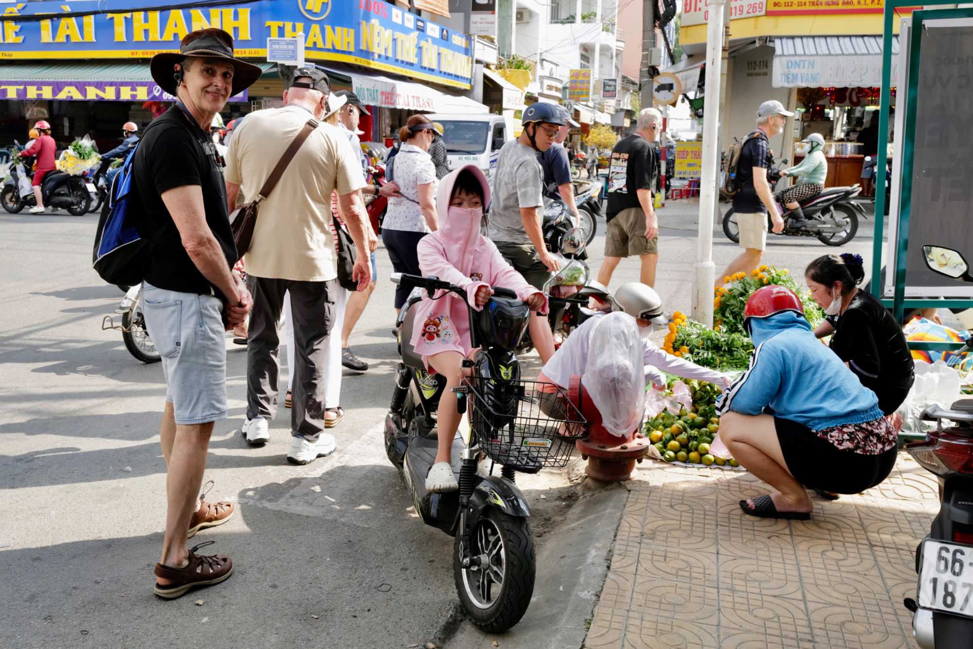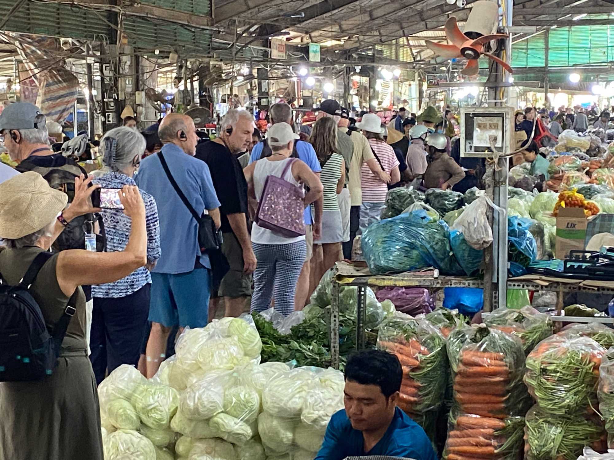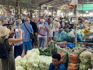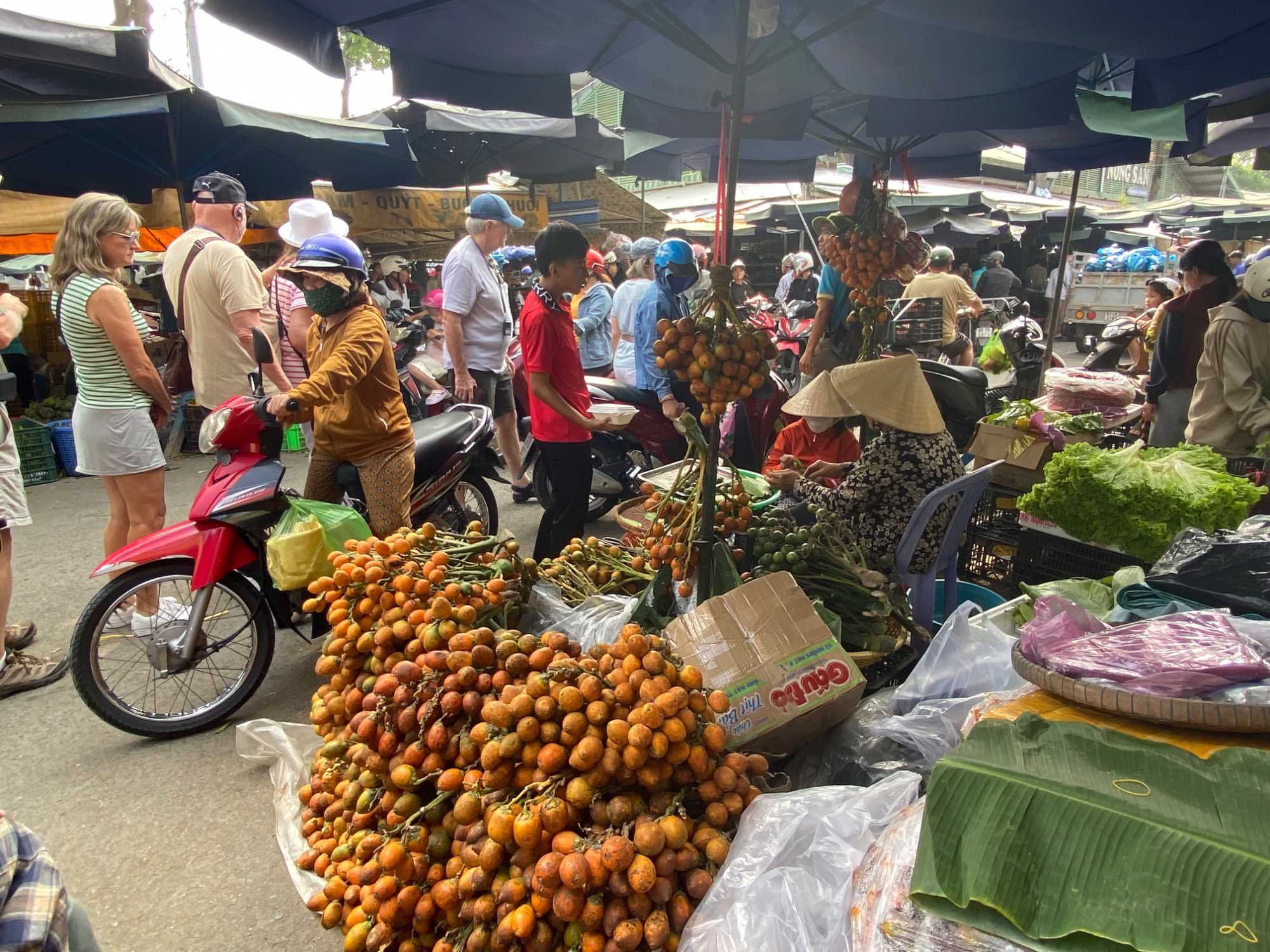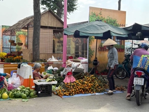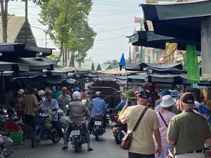 Puis, nous déambulons vers le marché animé de la ville. En prévision des festivités du Têt; le nouvel an vietnamien , un bouillonnement incessant d’activités humaines se déroule sous nos yeux. Les rues était noires de monde. On avait du mal à avancer tellement il y avait de gens partout. Ça criait, ça discutait, ça négociait dans tous les sens. Les scooters passaient au milieu de la foule, klaxonnaient, s’arrêtaient devant un stand. Certains clients ne descendaient même pas : ils tendaient la main, prenaient leur sac de légumes, payaient, et repartaient aussitôt, en se frayant difficilement un chemin à travers la densité de cette masse humaine..