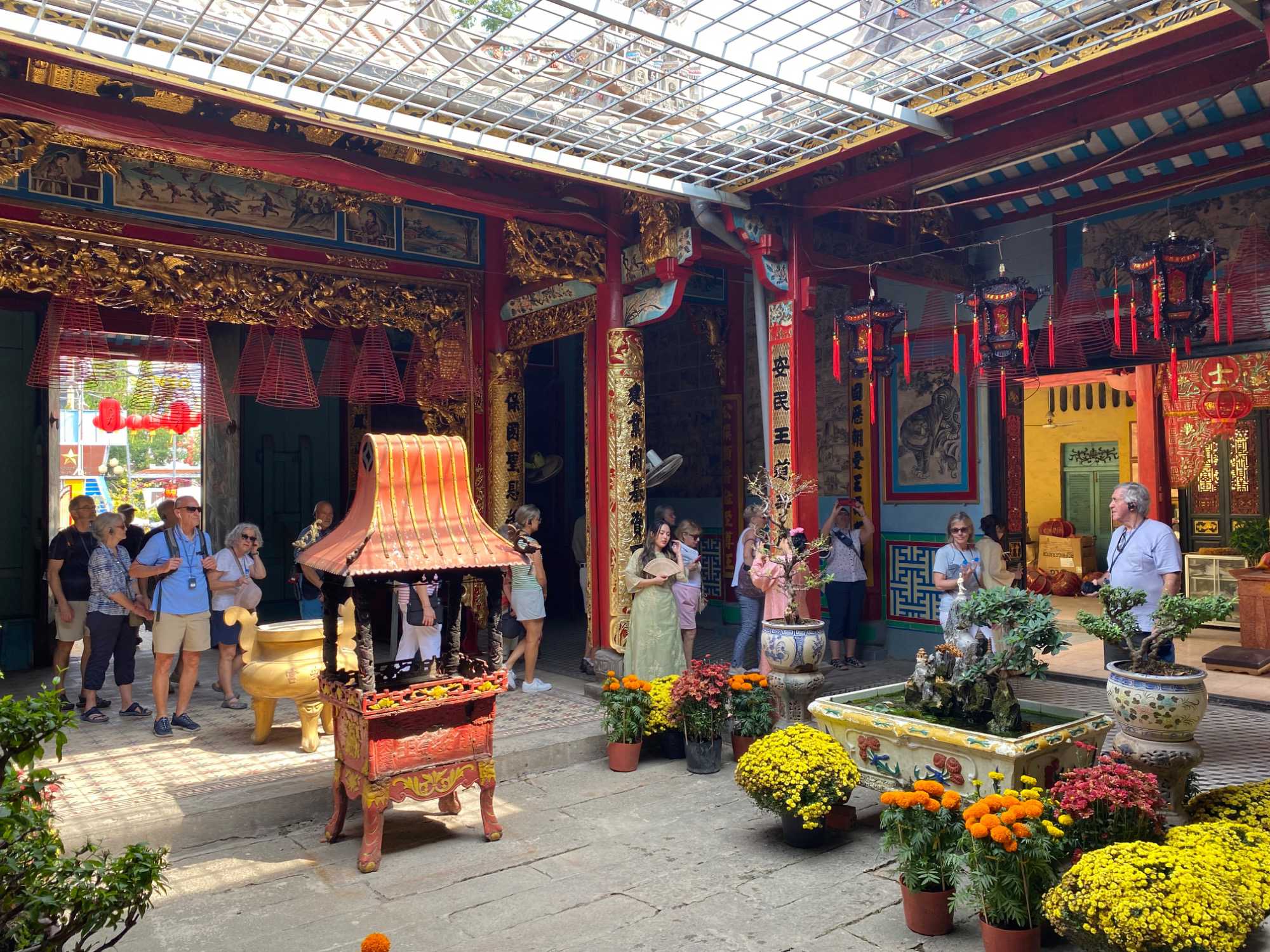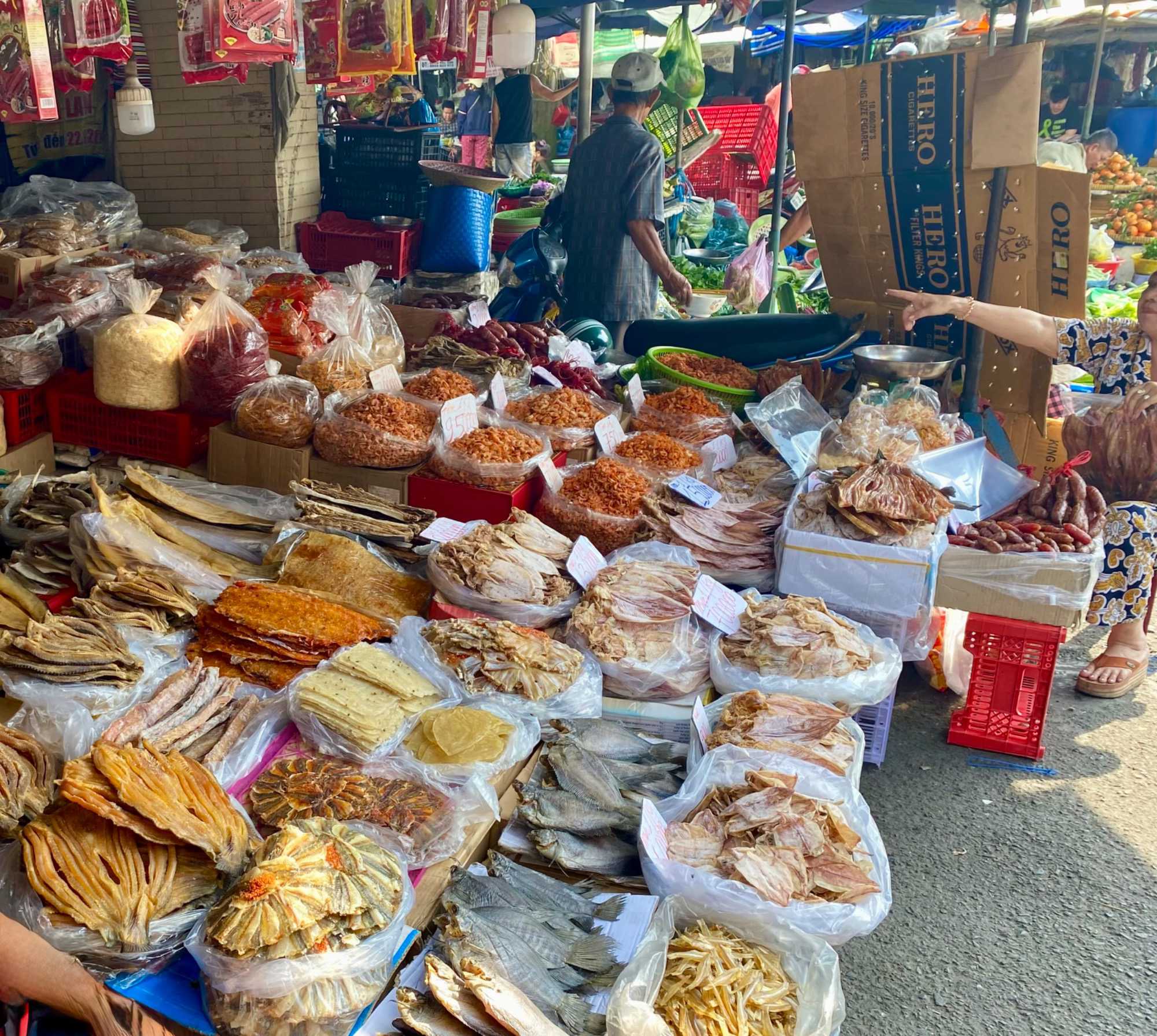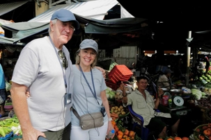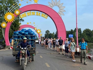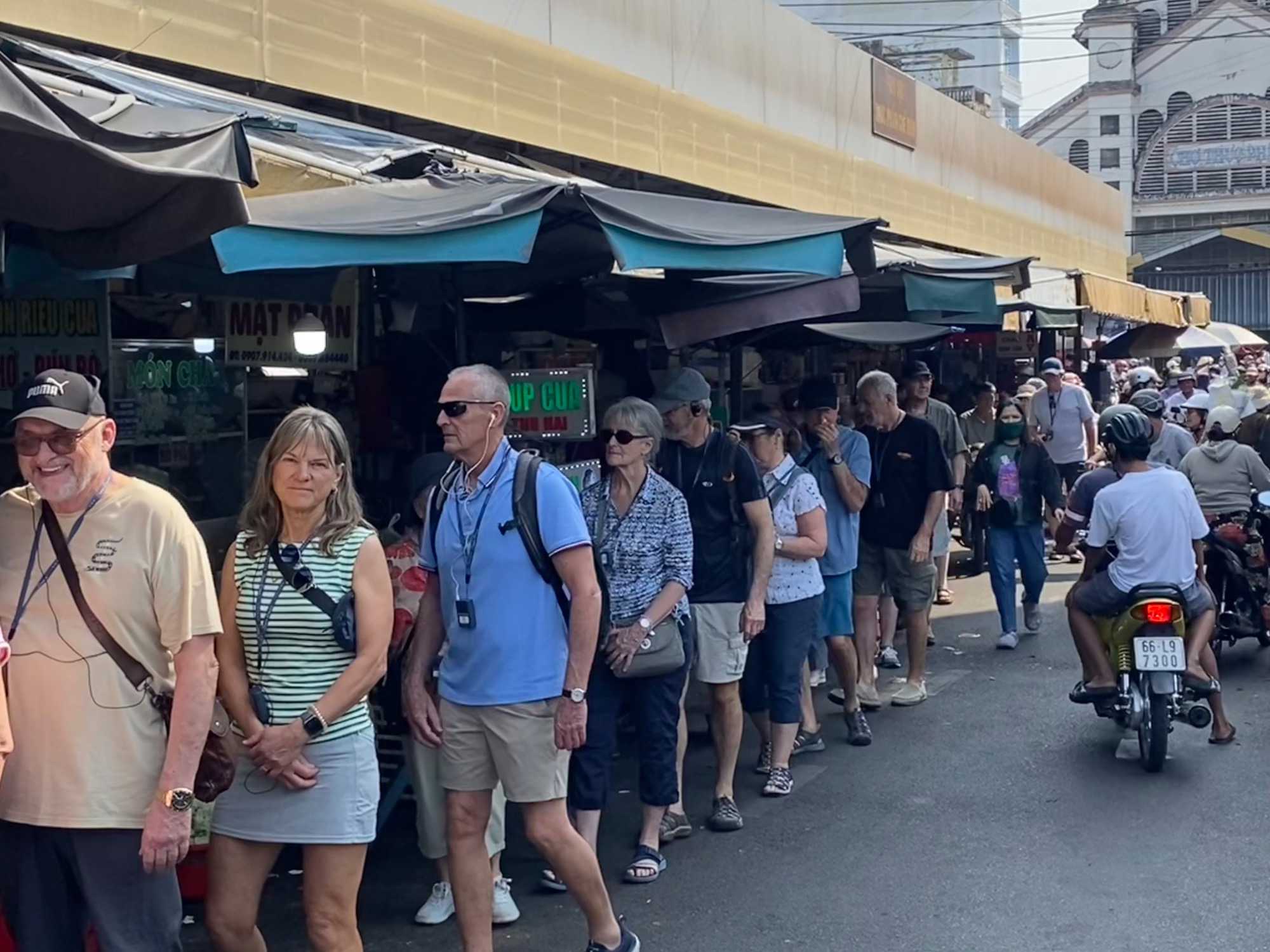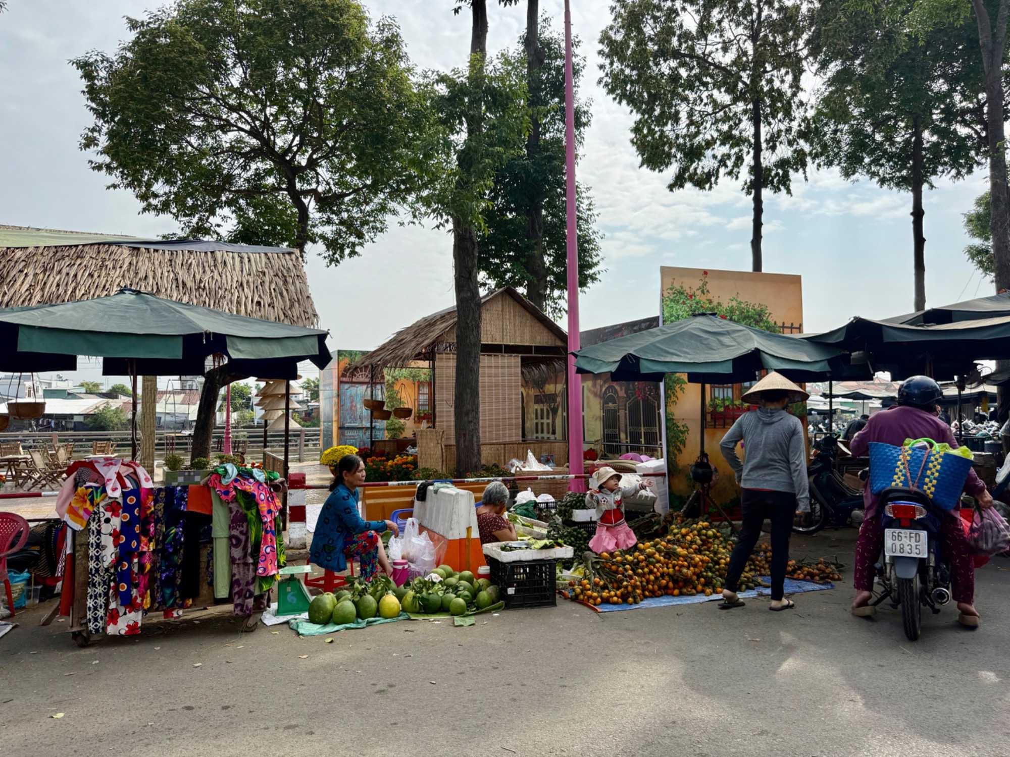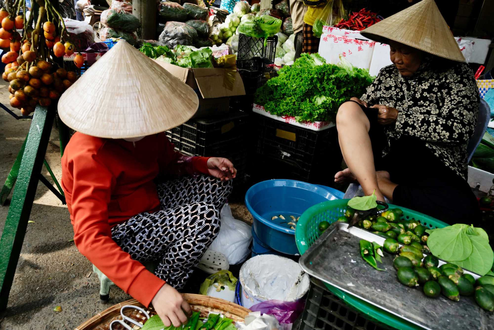 Puis, nous déambulons vers le marché animé de la ville. En prévision des festivités du Têt; le nouvel an vietnamien , un bouillonnement incessant d’activités humaines se déroule sous nos yeux. Les rues était noires de monde. On avait du mal à avancer tellement il y avait de gens partout. Ça criait, ça discutait, ça négociait dans tous les sens. Les scooters passaient au milieu de la foule, klaxonnaient, s’arrêtaient devant un stand. Certains clients ne descendaient même pas : ils tendaient la main, prenaient leur sac de légumes, payaient, et repartaient aussitôt, en se frayant difficilement un chemin à travers la densité de cette masse humaine..