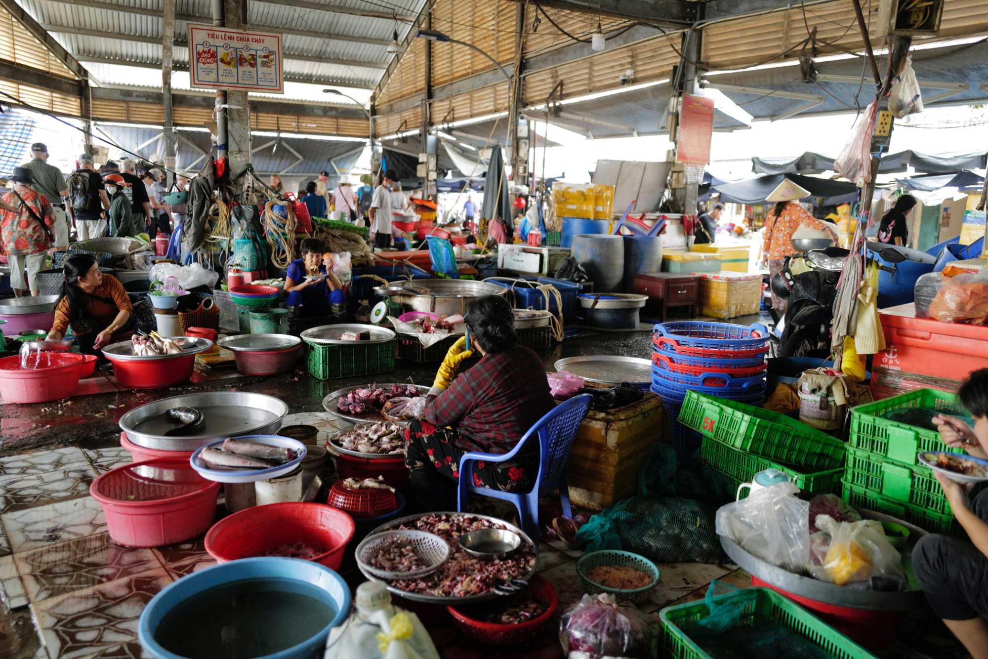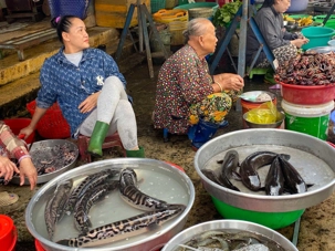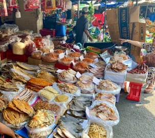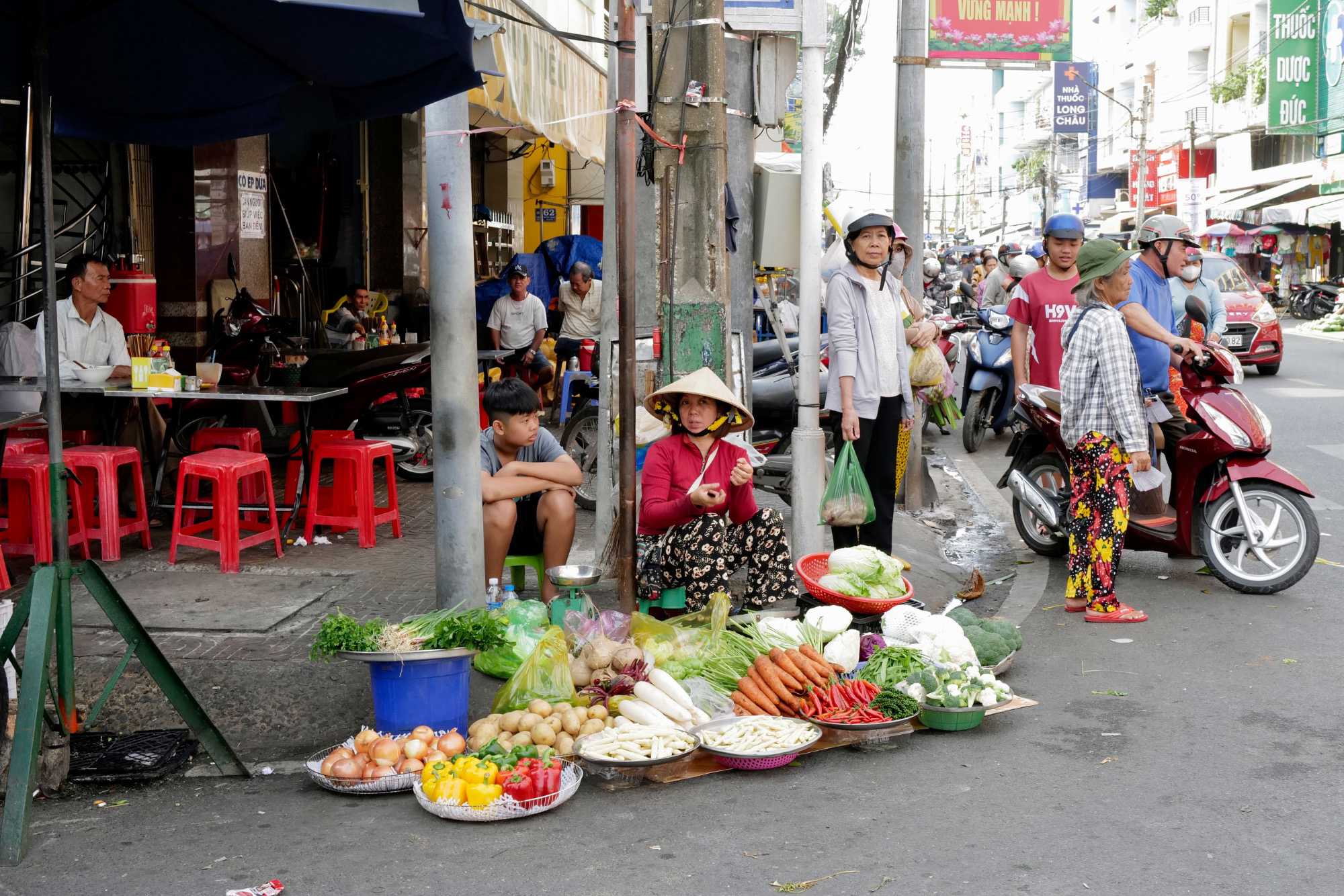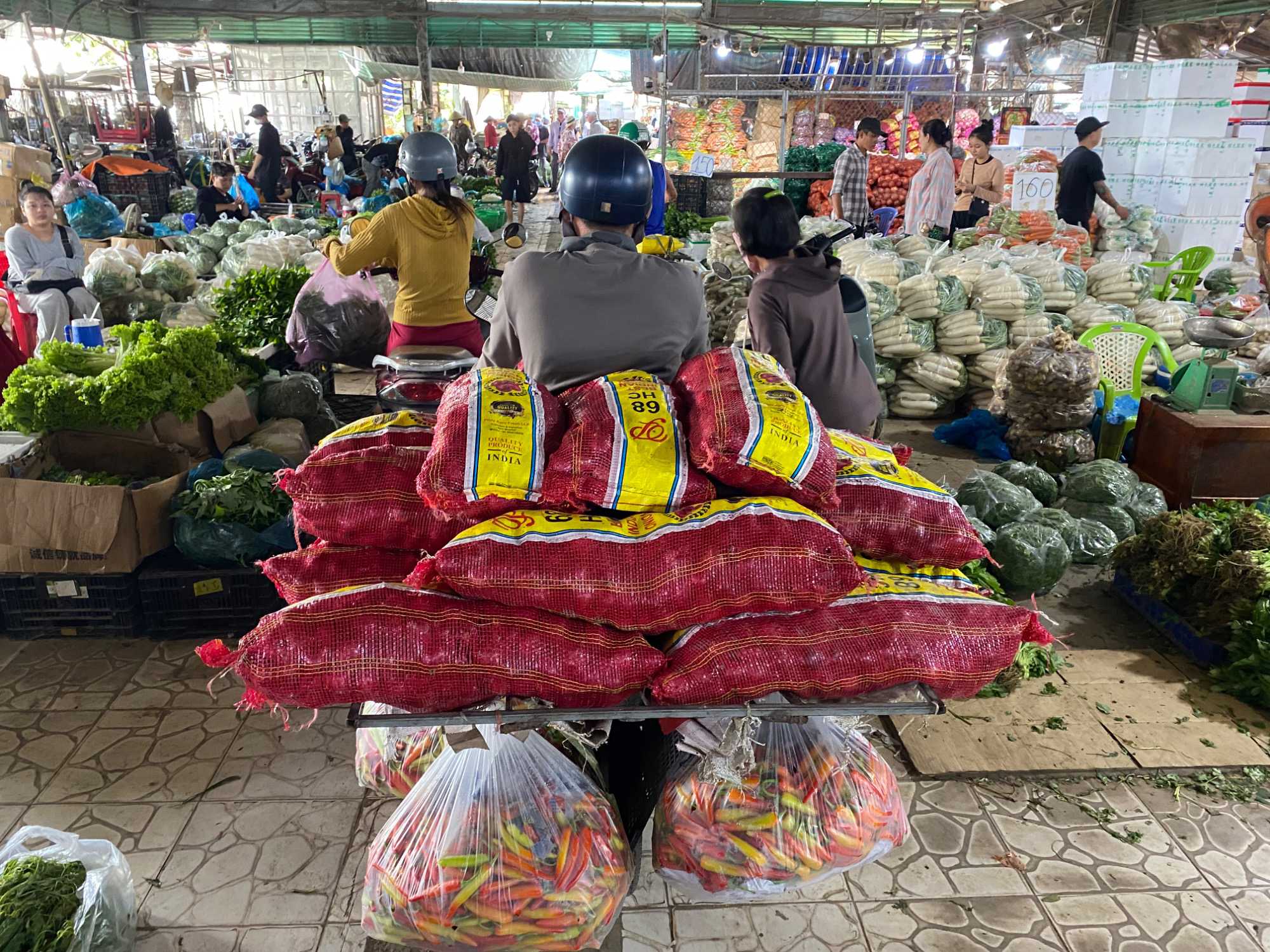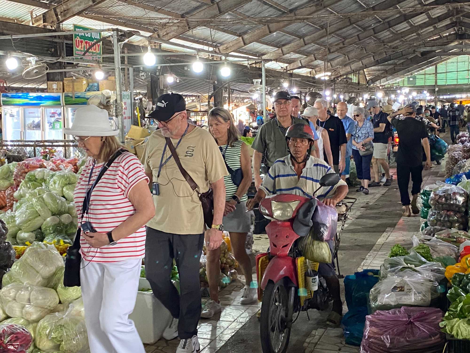 Puis, nous déambulons vers le marché animé de la ville. En prévision des festivités du Têt; le nouvel an vietnamien , un bouillonnement incessant d’activités humaines se déroule sous nos yeux. Les rues était noires de monde. On avait du mal à avancer tellement il y avait de gens partout. Ça criait, ça discutait, ça négociait dans tous les sens. Les scooters passaient au milieu de la foule, klaxonnaient, s’arrêtaient devant un stand. Certains clients ne descendaient même pas : ils tendaient la main, prenaient leur sac de légumes, payaient, et repartaient aussitôt, en se frayant difficilement un chemin à travers la densité de cette masse humaine..