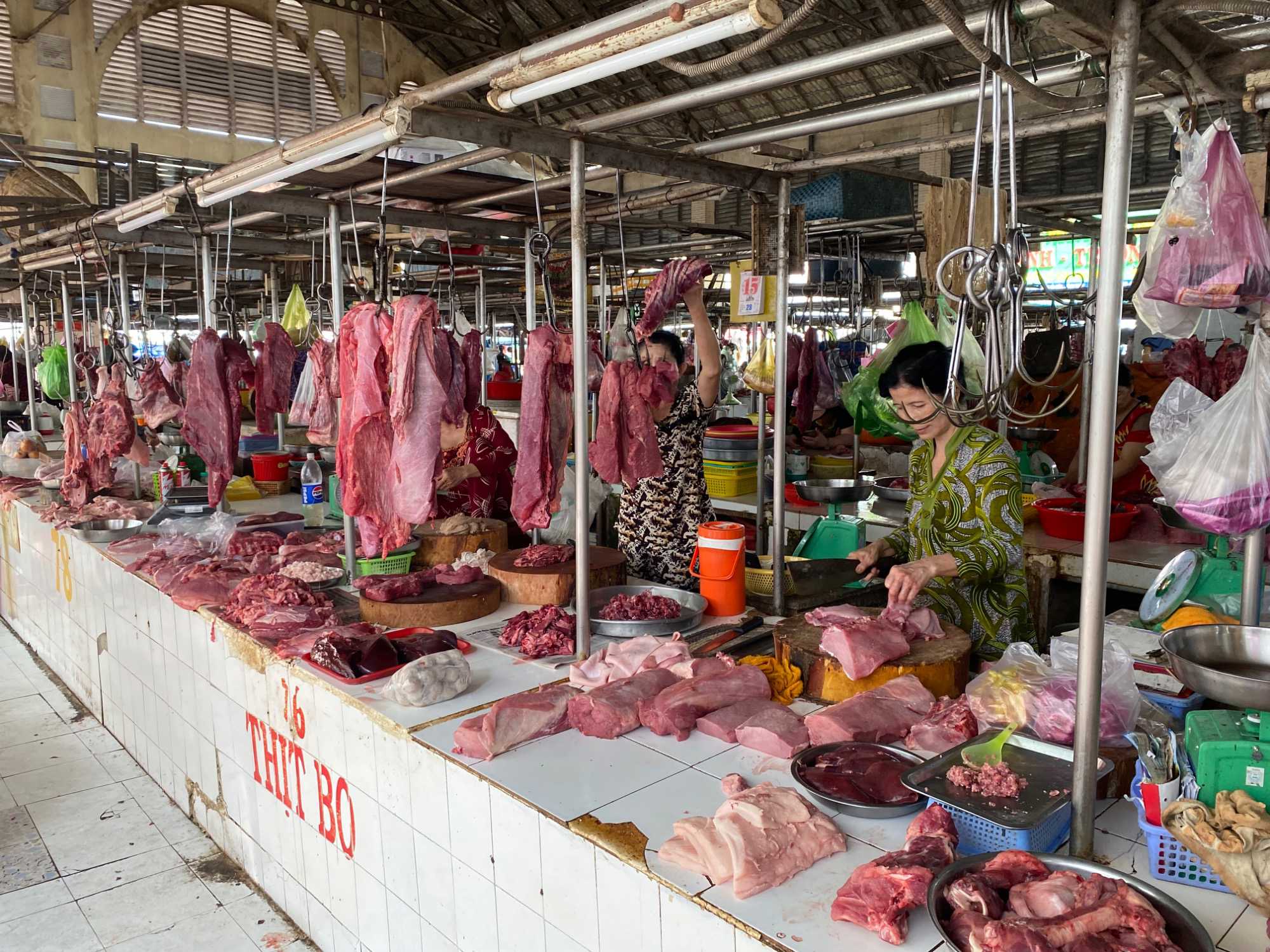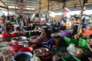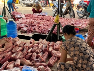 À côté, le marché de la viande était encore plus impressionnant. Des morceaux pendaient à des crochets, les bouchers découpaient avec de grands couteaux. Nous avions peine à circuler tellement c’était dense de monde. C’était bruyant, un peu désordonné, mais plein de vie. Un marché comme on n’en voit pas tous les jours; assez que ça dépassait notre imagination. Nous pouvons mettre cette expérience dans la catégorie du: il faut le voir pour le croire! C’a marqué la mémoire de chacun de nous! Les photos vous donneront un aperçu!