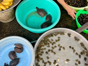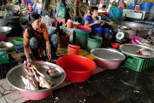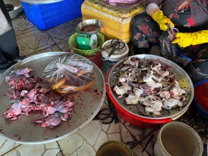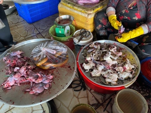 Plus loin, il y avait les marchands de poissons. La variété retenait notre curiosité. L’odeur était forte, ça sentait la mer. Vraiment spécial; même que dans un coin, une femme arrachait la peau de grenouilles encore vivantes. Elle allait vite, comme si c’était un geste normal. Certains regardaient, d’autres préféraient passer leur chemin. On est sérieusement sorti de notre zone de confort, en observant du jamais vu!
