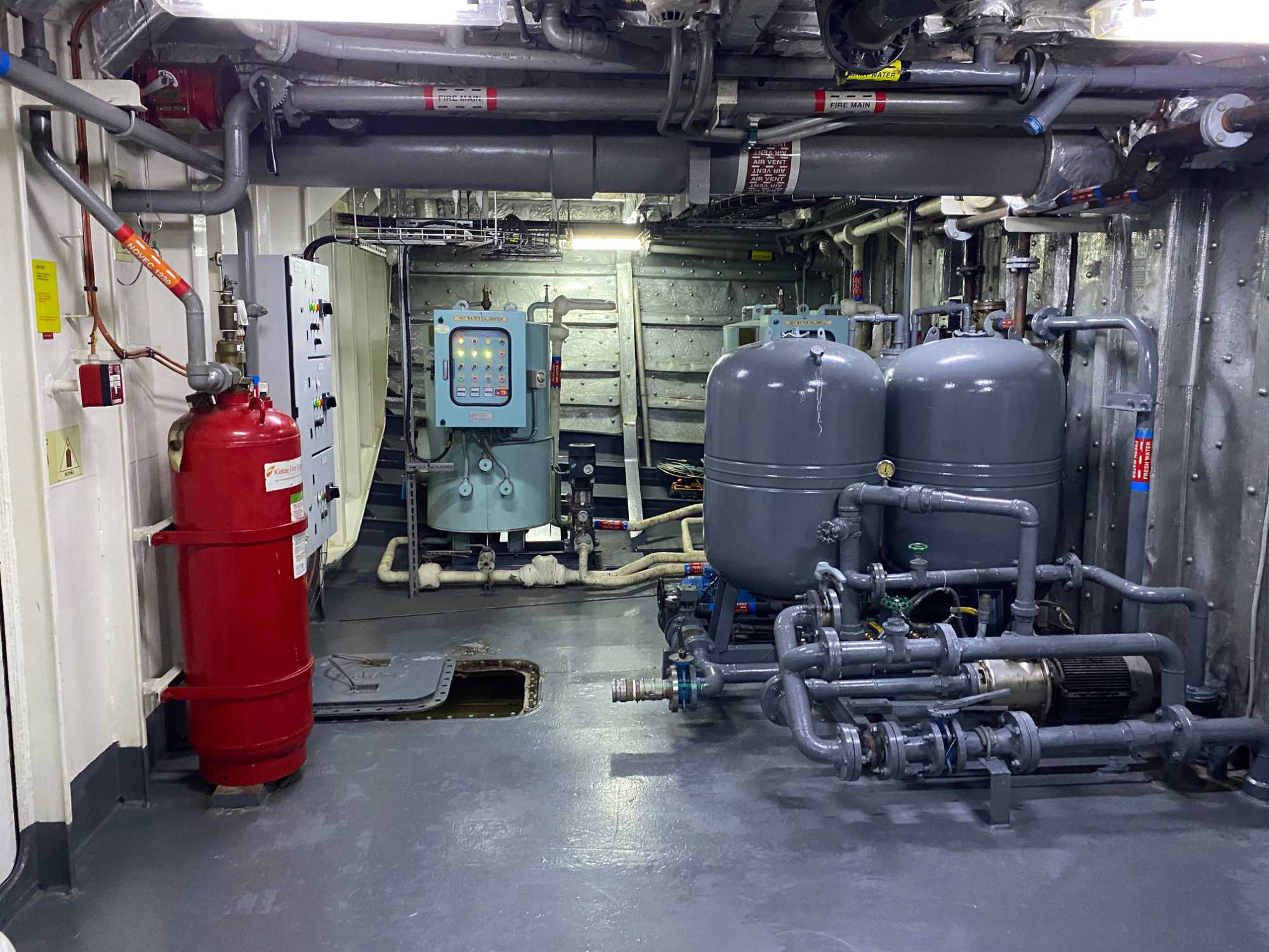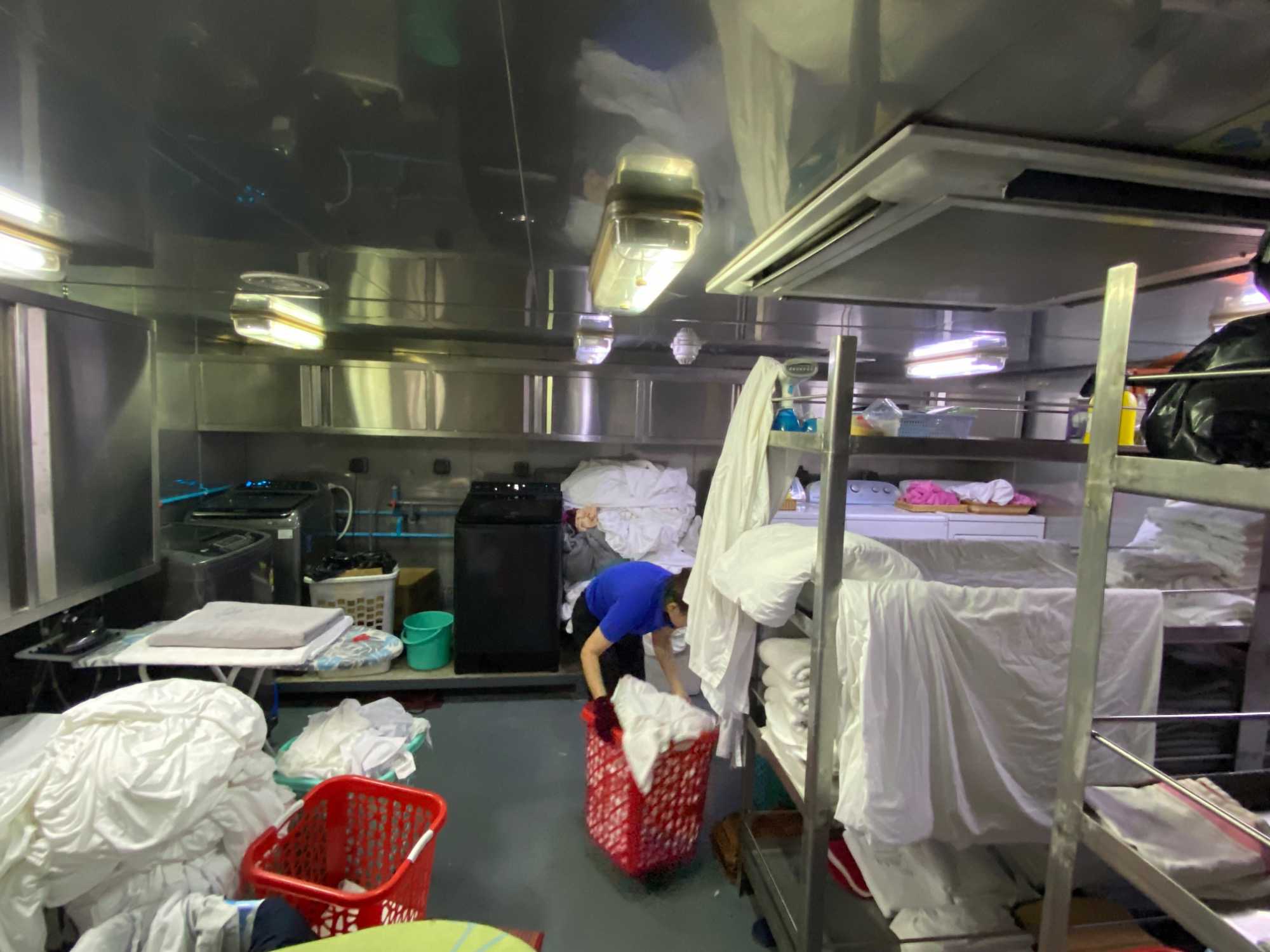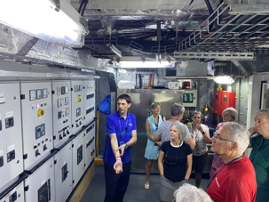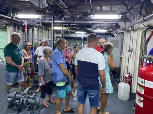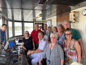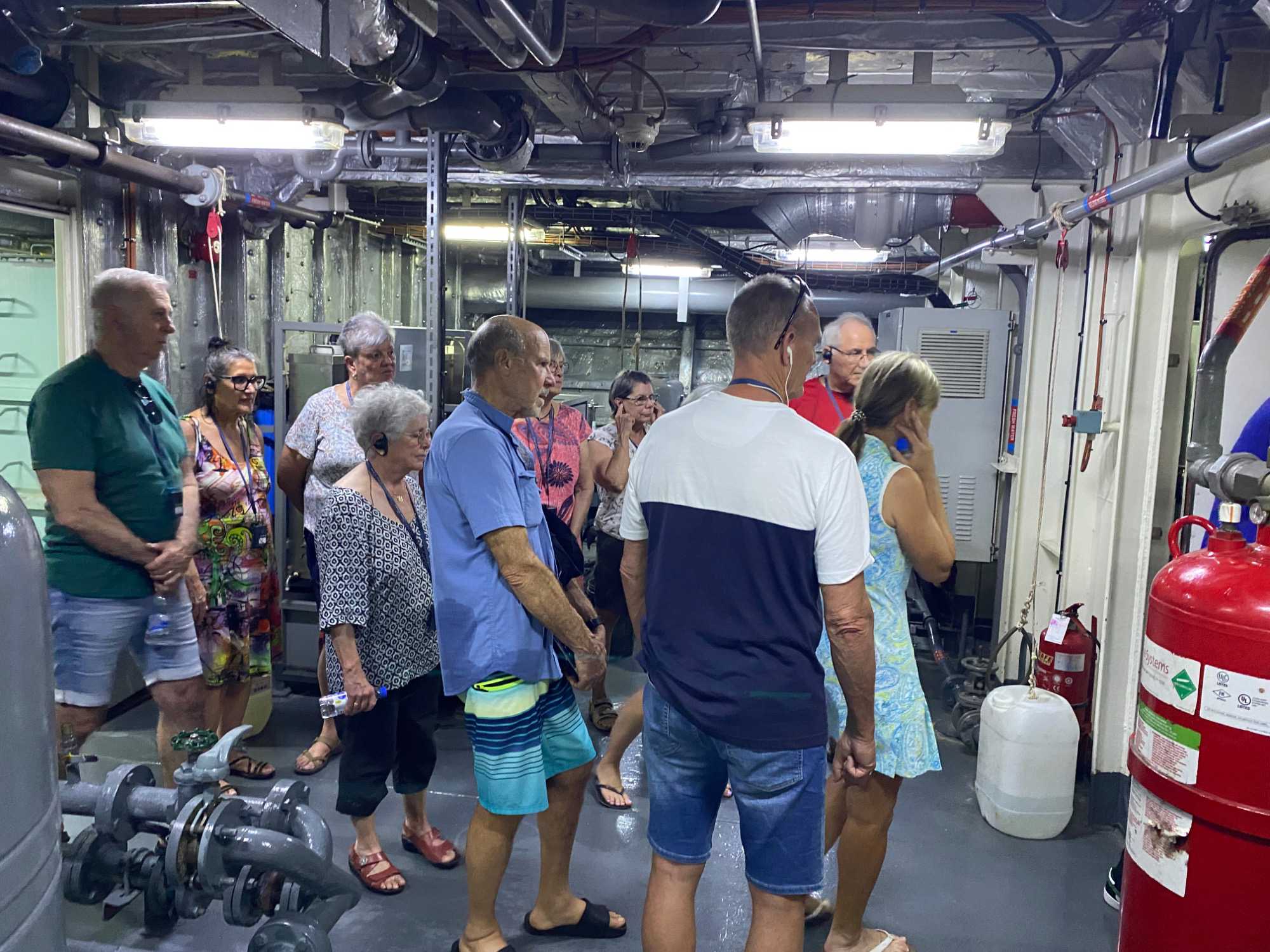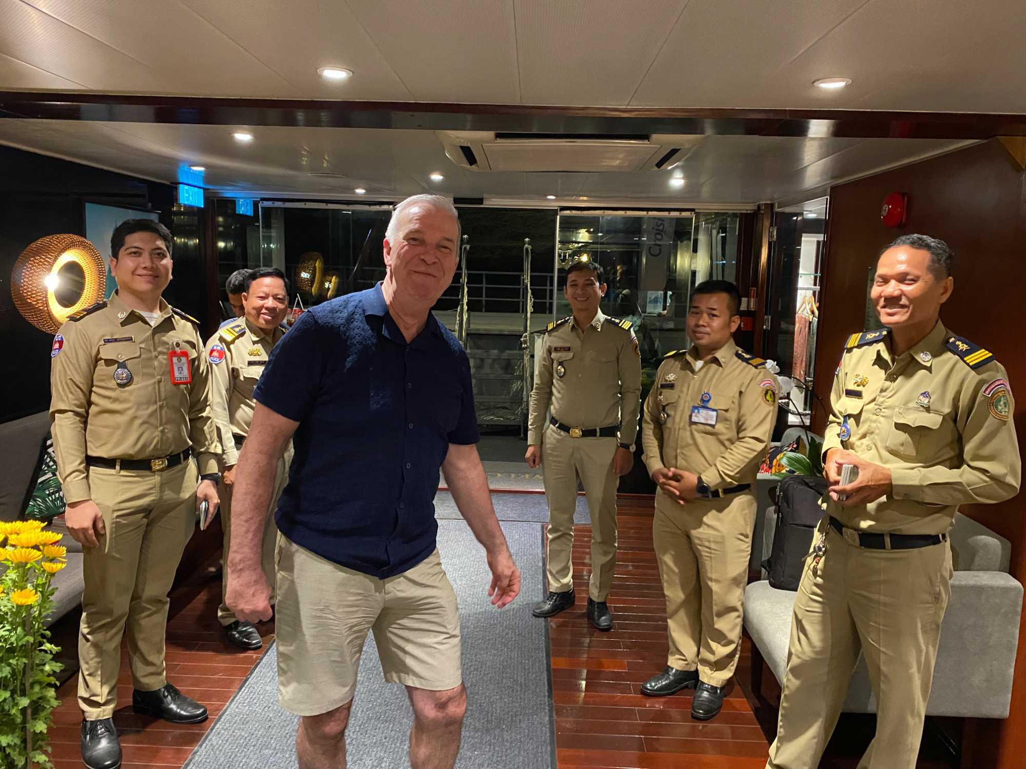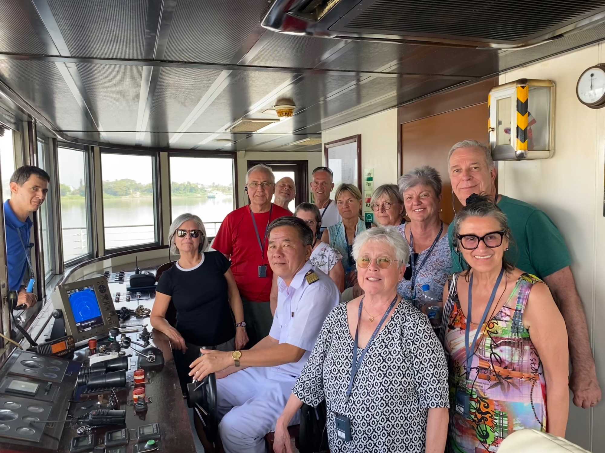 Plusieurs participent à la visite du bateau, offert par le personnel de Croisi-europe. Passant par le poste de pilotage, les salles mécaniques, les espaces réservés au personnel, la buanderie… C’est toujours intéressant de satisfaire notre curiosité afin d’en apprendre davantage sur les spécifications techniques du potentiel de ce bateau Indochine II, construit à Saigon en 2017, battant pavillon Cambodgien. Largeur: 14 m, longueur: 66 m, Hauteur: 9,5 m, avec un tirant d’eau de 1,6 m. À titre informatif; le courant naturel du fleuve Mékong est de 20 Km/h.