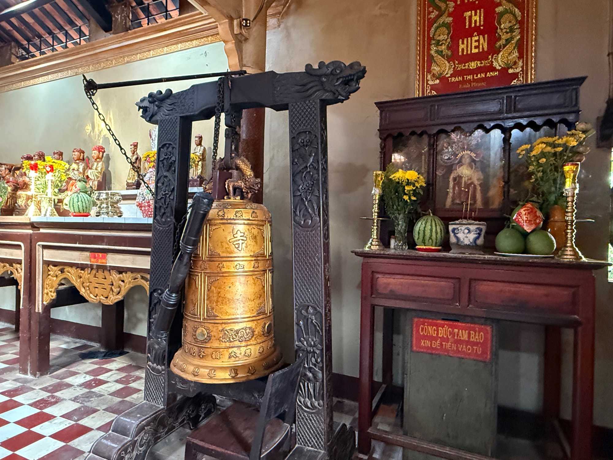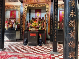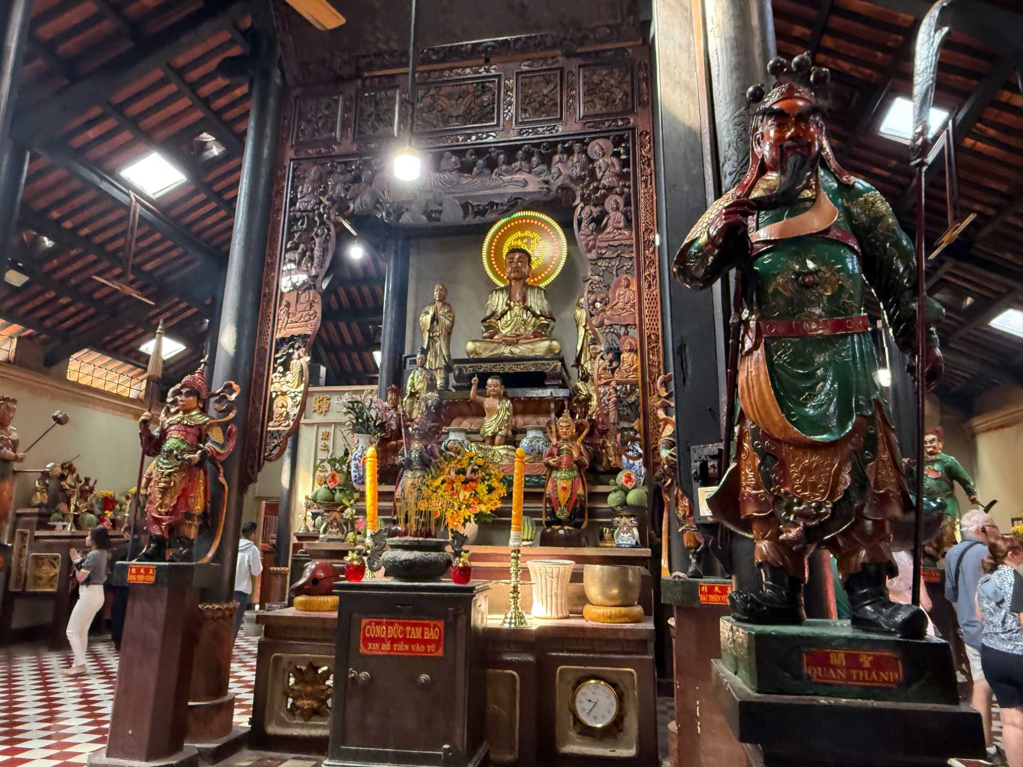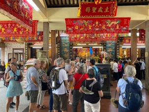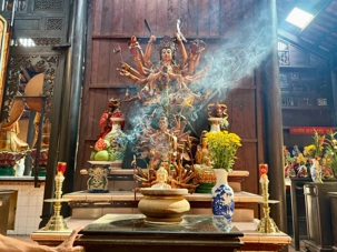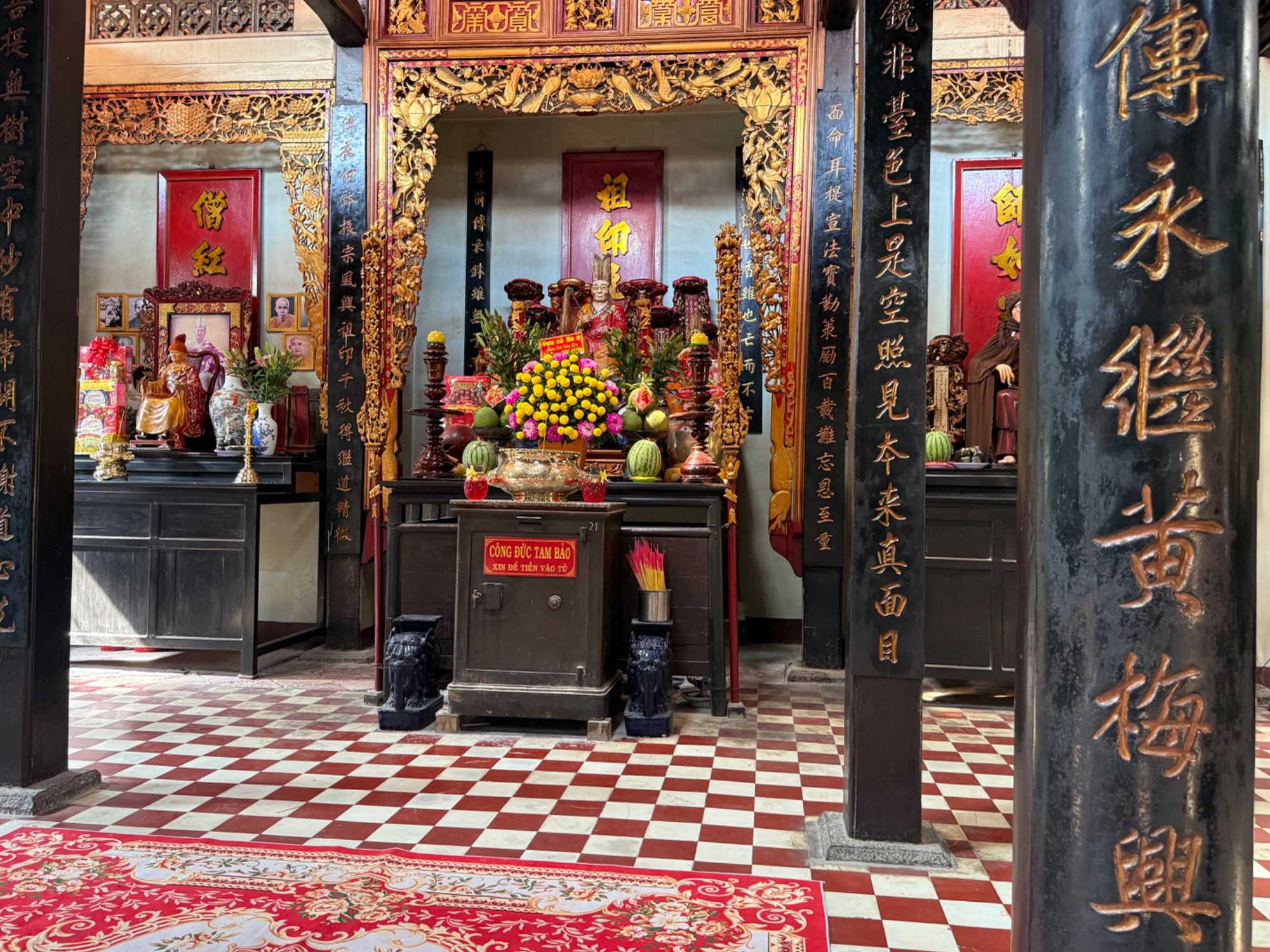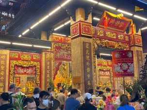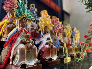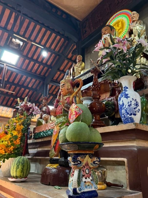 À l’intérieur, l’atmosphère est dynamique: l’air est chargé de l’odeur d’encens, les offrandes de fruits, de fleurs et de mets comme les porcs entiers rôtis s’accumulent devant l’autel principal.La statue est vêtue de riches habits brodés et parée de bijoux offerts par les fidèles, trône au centre du sanctuaire.