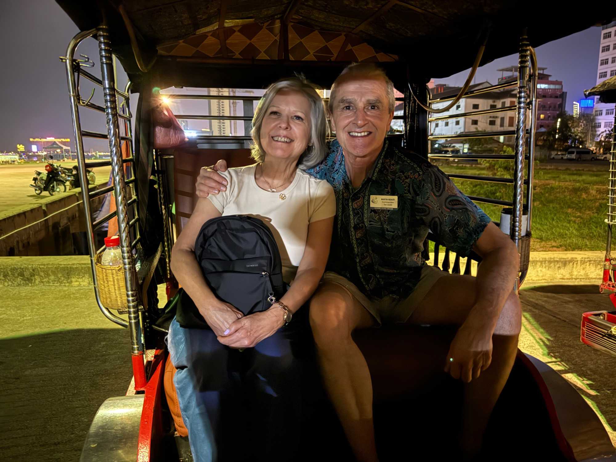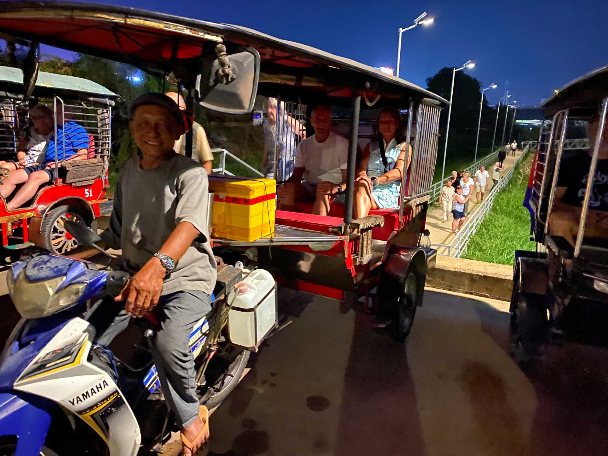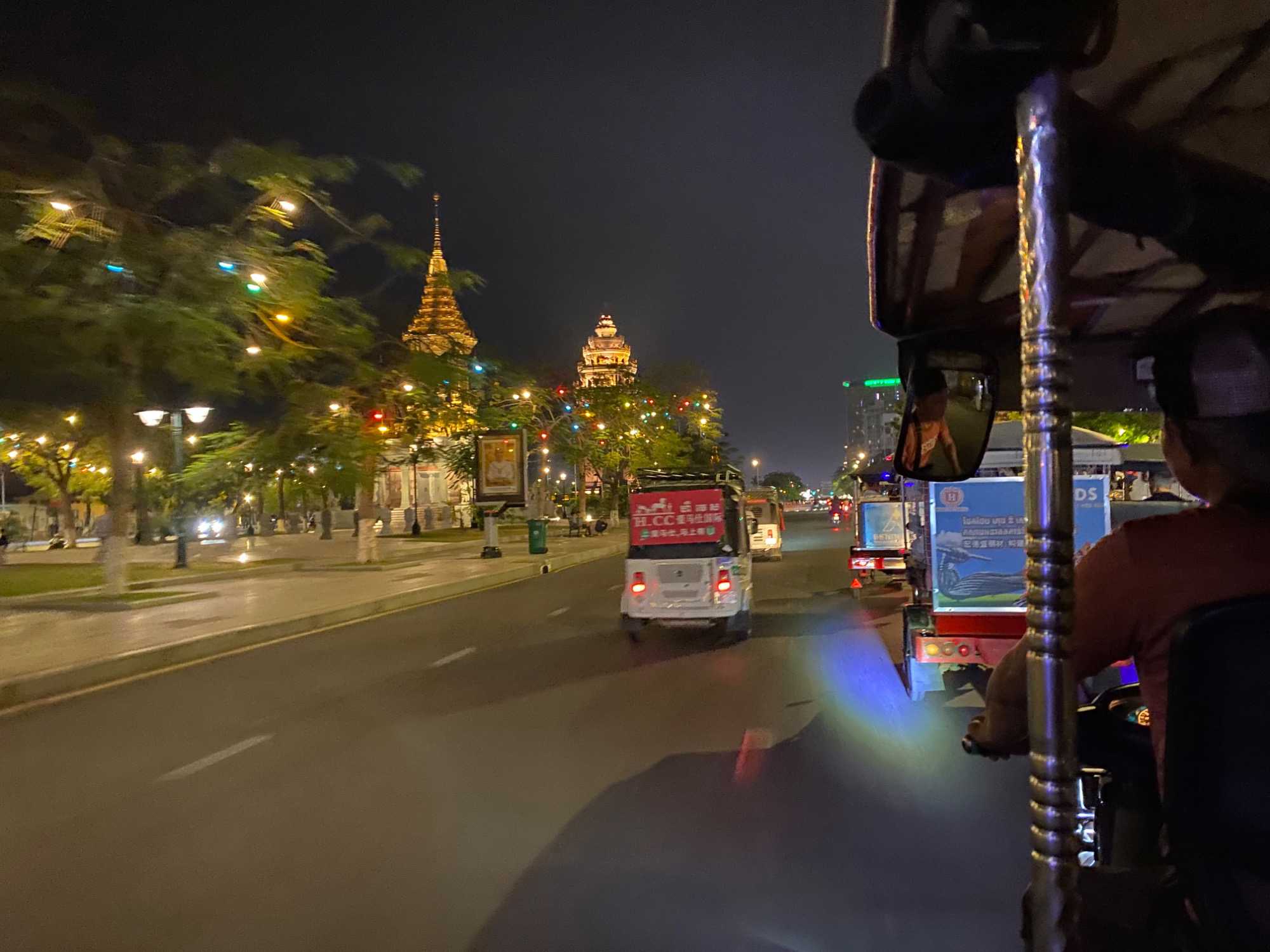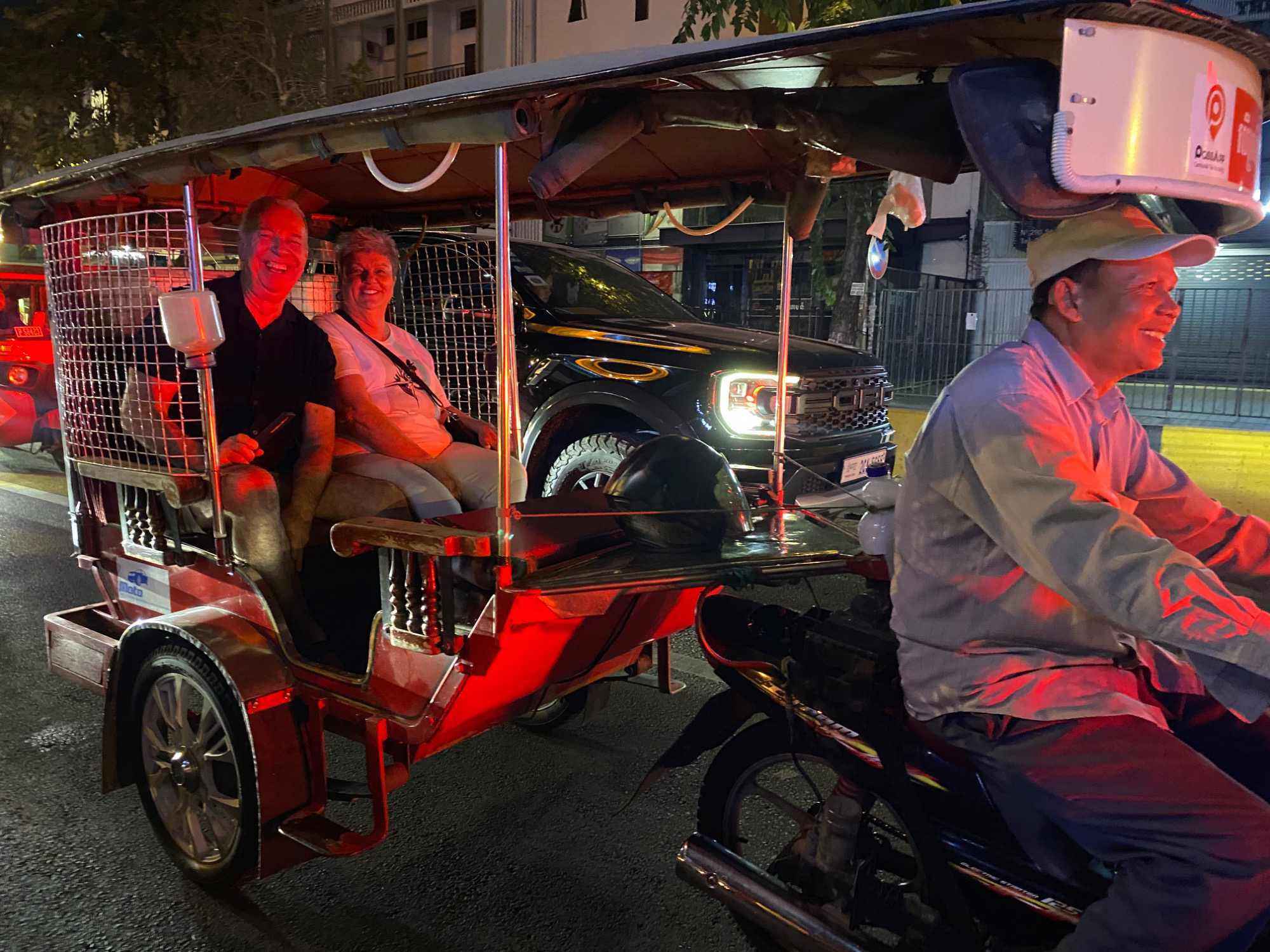 Arrivée à Phnom Penh, c’est le temps d’une aventure nocturne en Tuk-Tuk, à la découverte de cette ville animée et scintillante. Deux personnes par engin, et nous voilà cheveux au vent à sillonner les rues en admirant les principaux attraits illuminés. Une ballade dynamique et festive, où chacun retrouve son coeur d’enfant!
