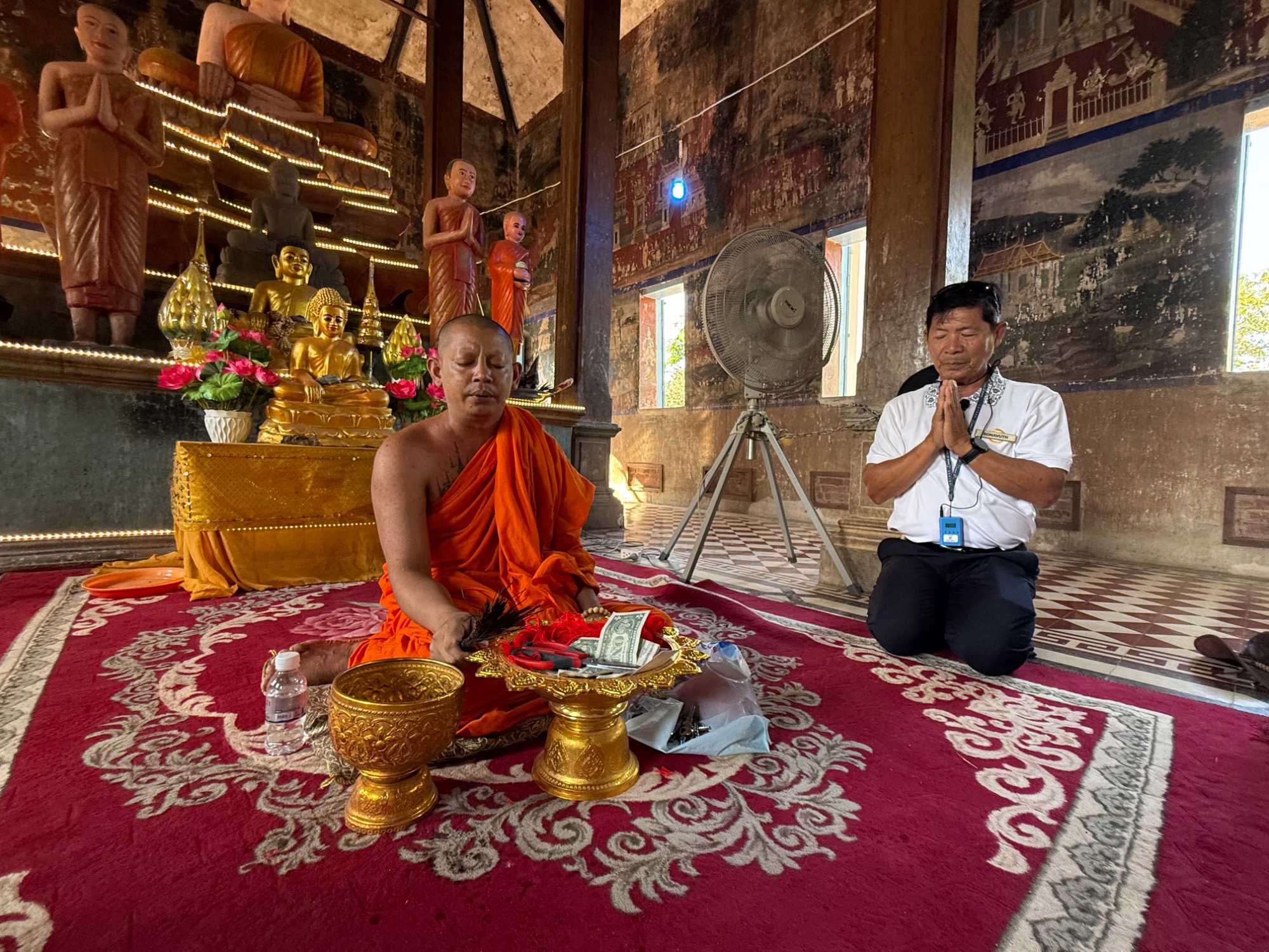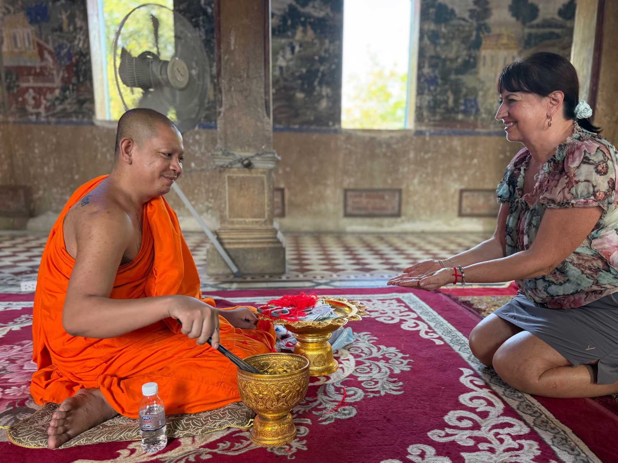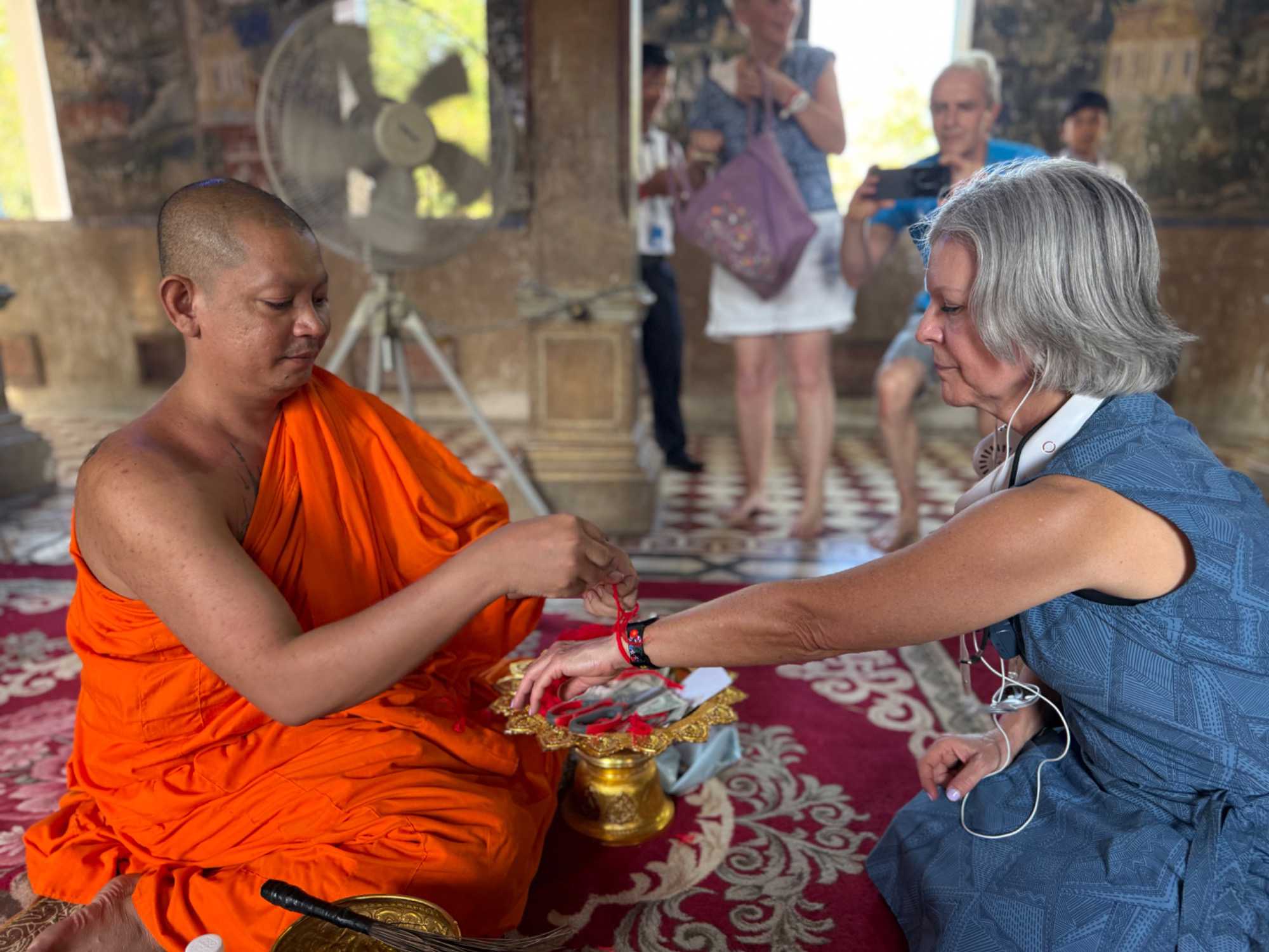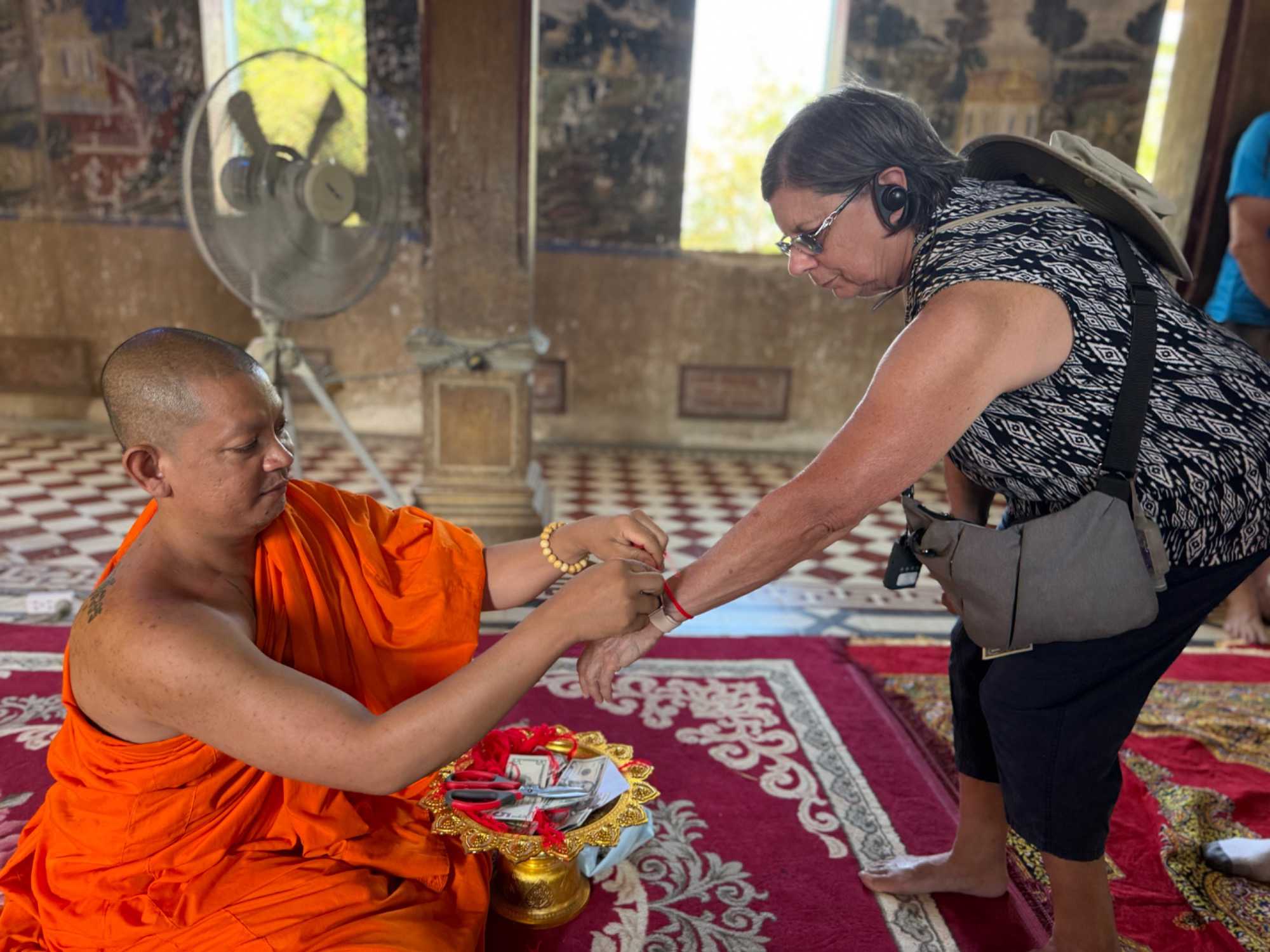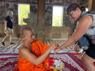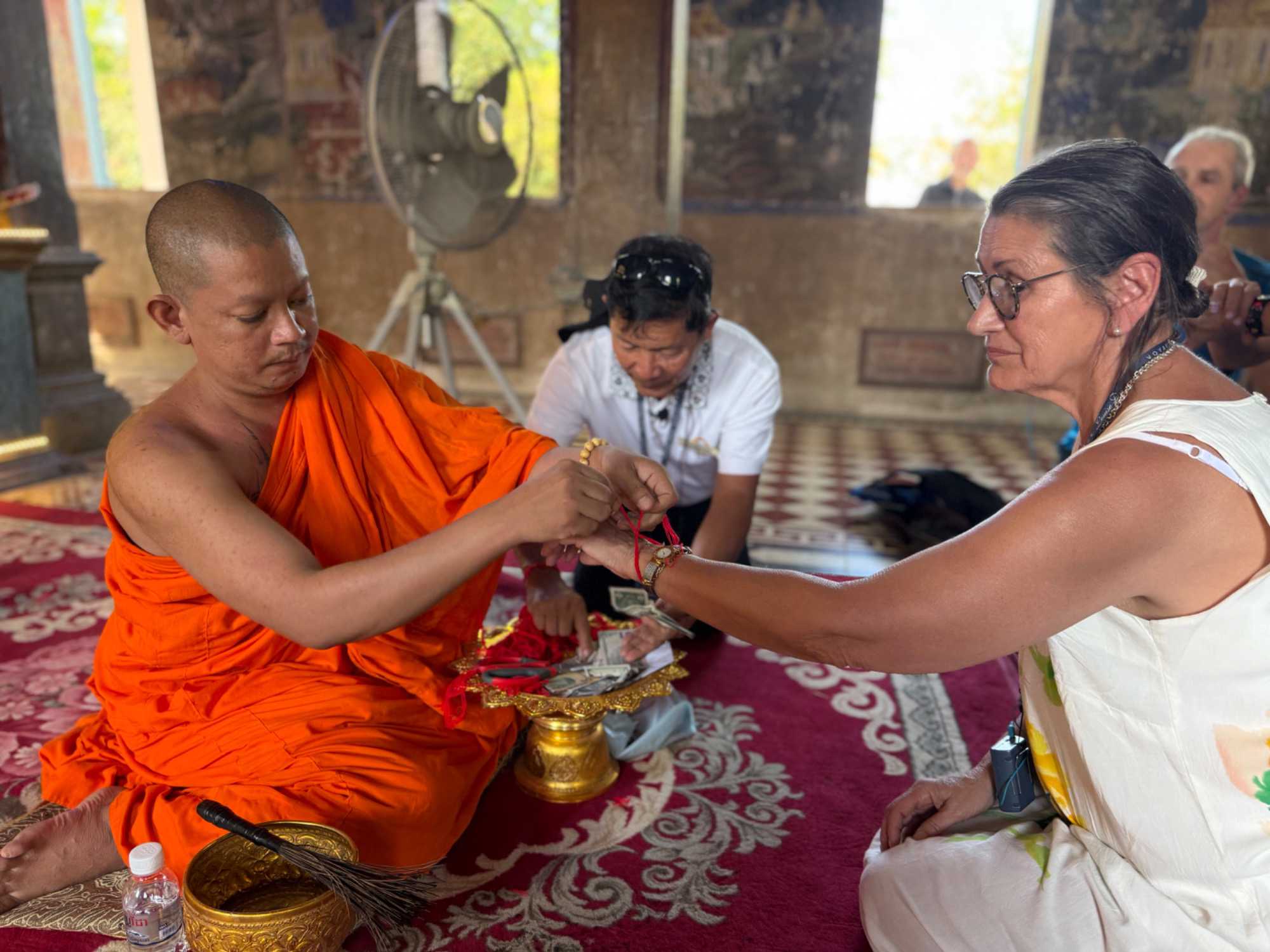 Nous naviguons quelques heures pour rejoindre Kampong Tralach, afin d’apprendre davantage sur le coté spirituel des habitants. Le Cambodge est bouddhiste à 95%, chrétien 2%, musulman 2% et 1% d’anémistes. De là, nous empruntons un tuk-tuk, par groupe de 4, qui sillonne les paysages agricoles, entourés de rizières, pour aller visiter la pagode. Wat Kampong Tralach Leu et son monastère datant du 19è siècle. L’extérieur a été rafraichi, tandis qu’à l’intérieur où y aperçoit des peintures de l’époque qui mériteraient de grande restauration. Un moine était présent et nous a fait une cérémonie de bénédiction avec ses chants qui résonnaient dans nos coeurs, suivi d’un rituel où il attache un fil rouge au poignet droit pour les hommes, gauches pour les femmes.