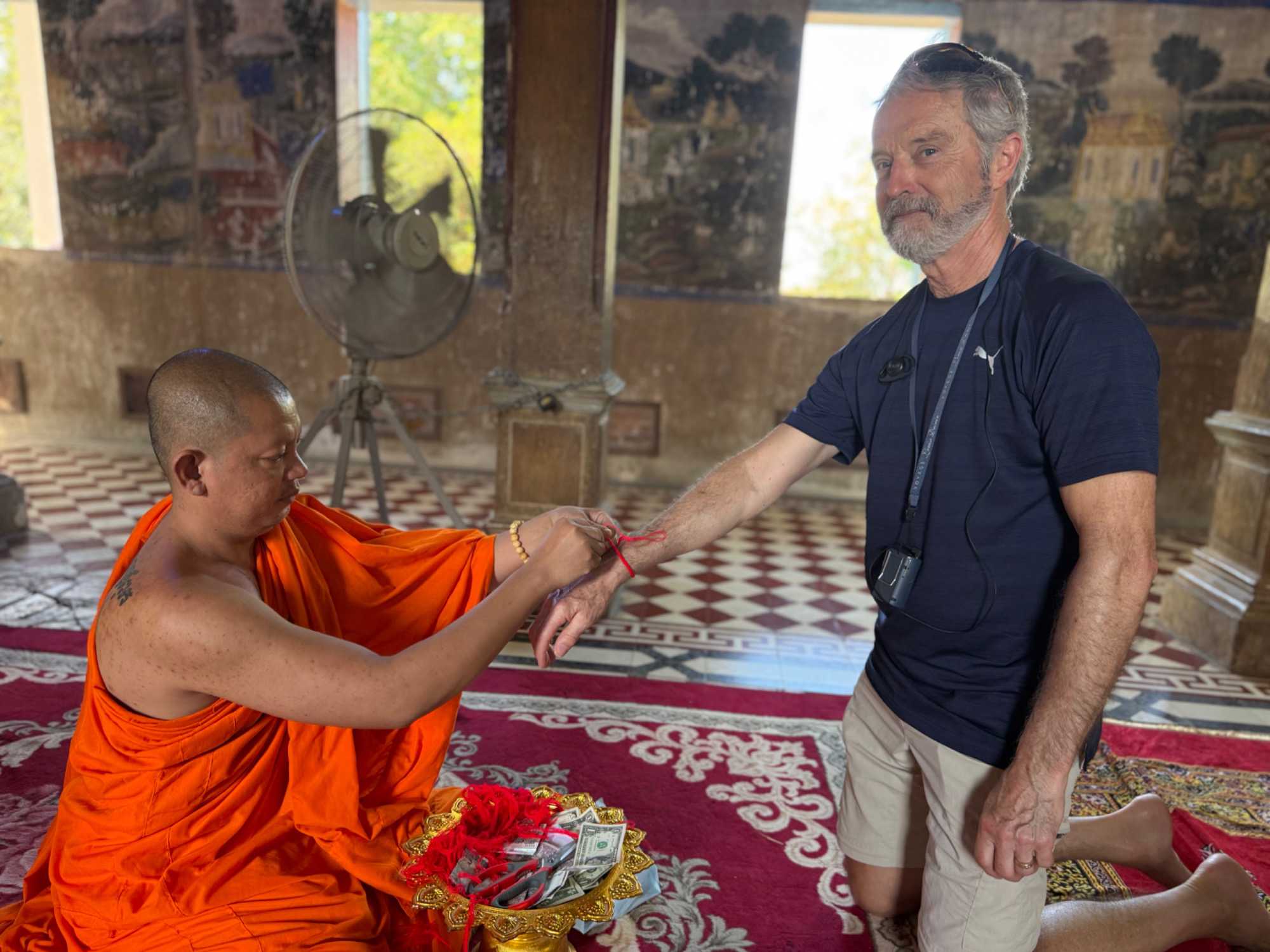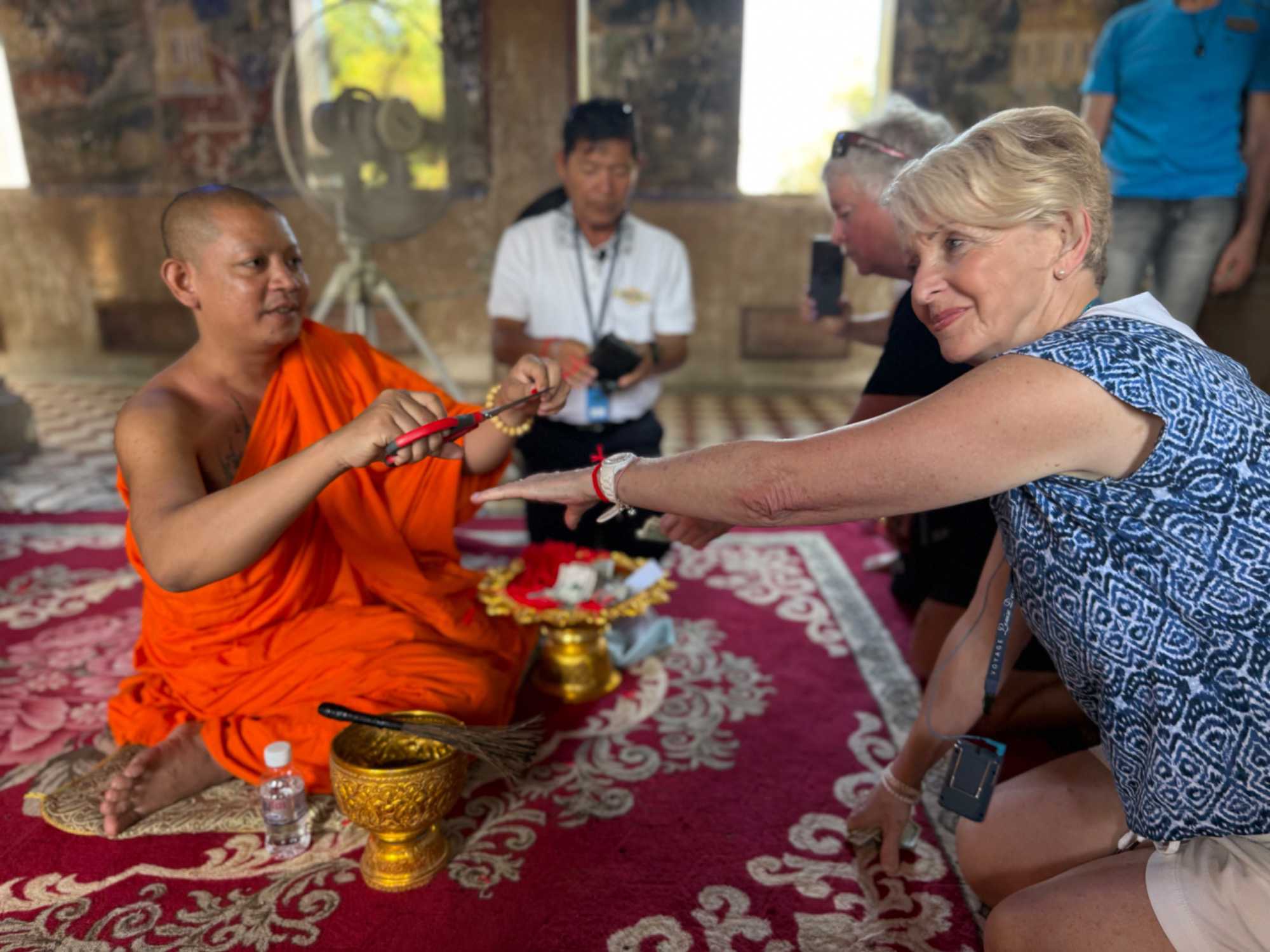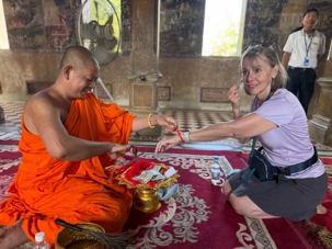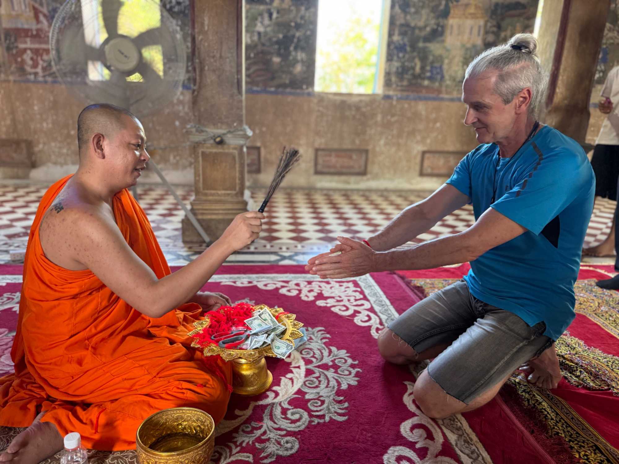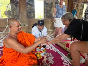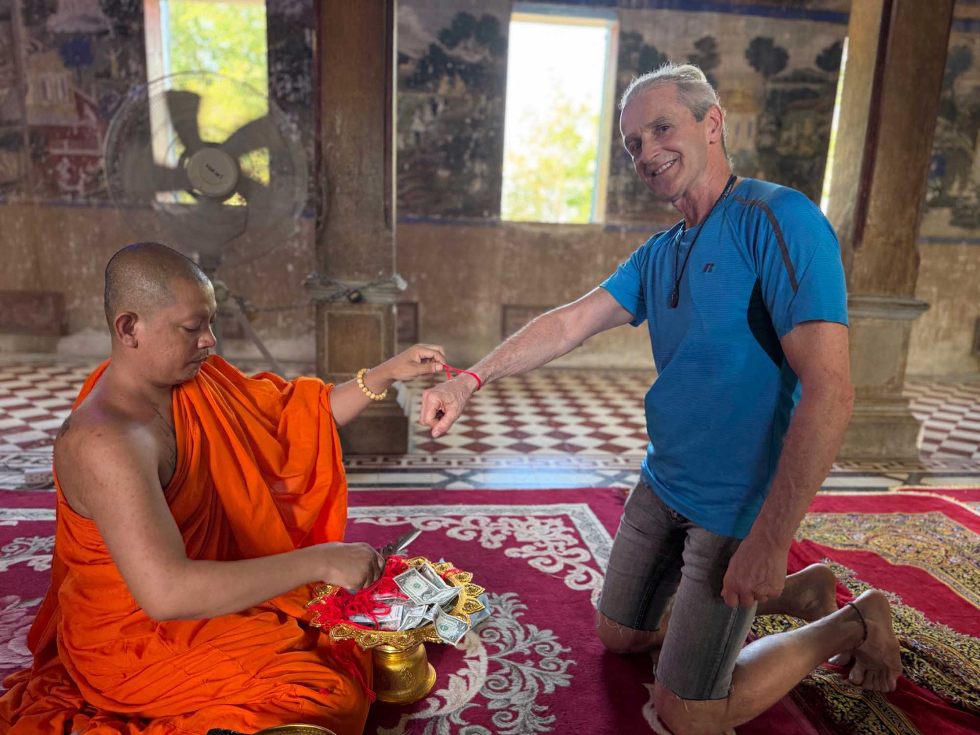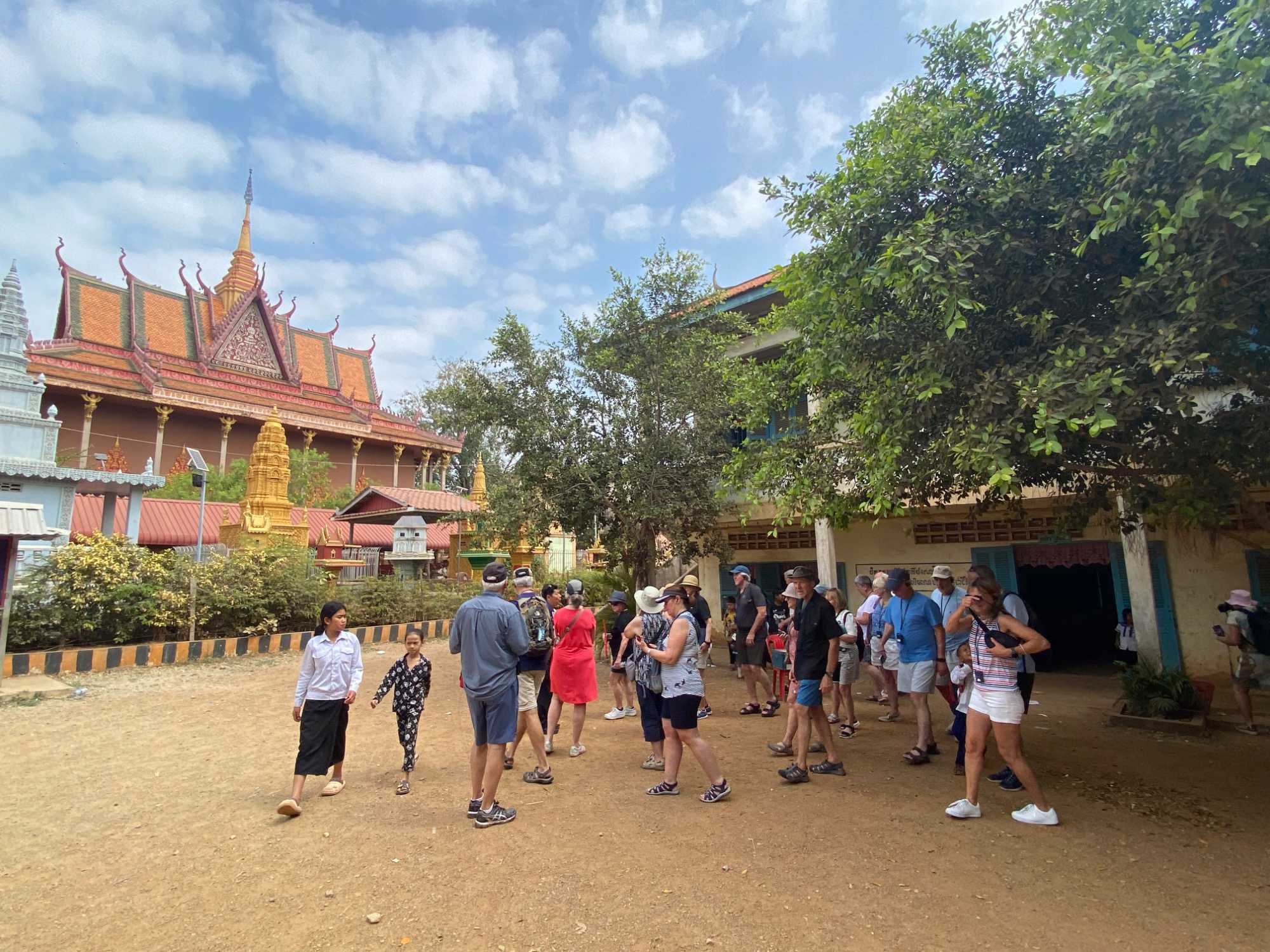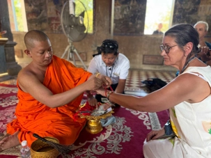 Nous naviguons quelques heures pour rejoindre Kampong Tralach, afin d’apprendre davantage sur le coté spirituel des habitants. Le Cambodge est bouddhiste à 95%, chrétien 2%, musulman 2% et 1% d’anémistes. De là, nous empruntons un tuk-tuk, par groupe de 4, qui sillonne les paysages agricoles, entourés de rizières, pour aller visiter la pagode. Wat Kampong Tralach Leu et son monastère datant du 19è siècle. L’extérieur a été rafraichi, tandis qu’à l’intérieur où y aperçoit des peintures de l’époque qui mériteraient de grande restauration. Un moine était présent et nous a fait une cérémonie de bénédiction avec ses chants qui résonnaient dans nos coeurs, suivi d’un rituel où il attache un fil rouge au poignet droit pour les hommes, gauches pour les femmes.