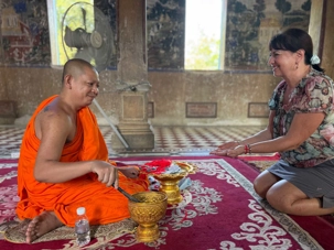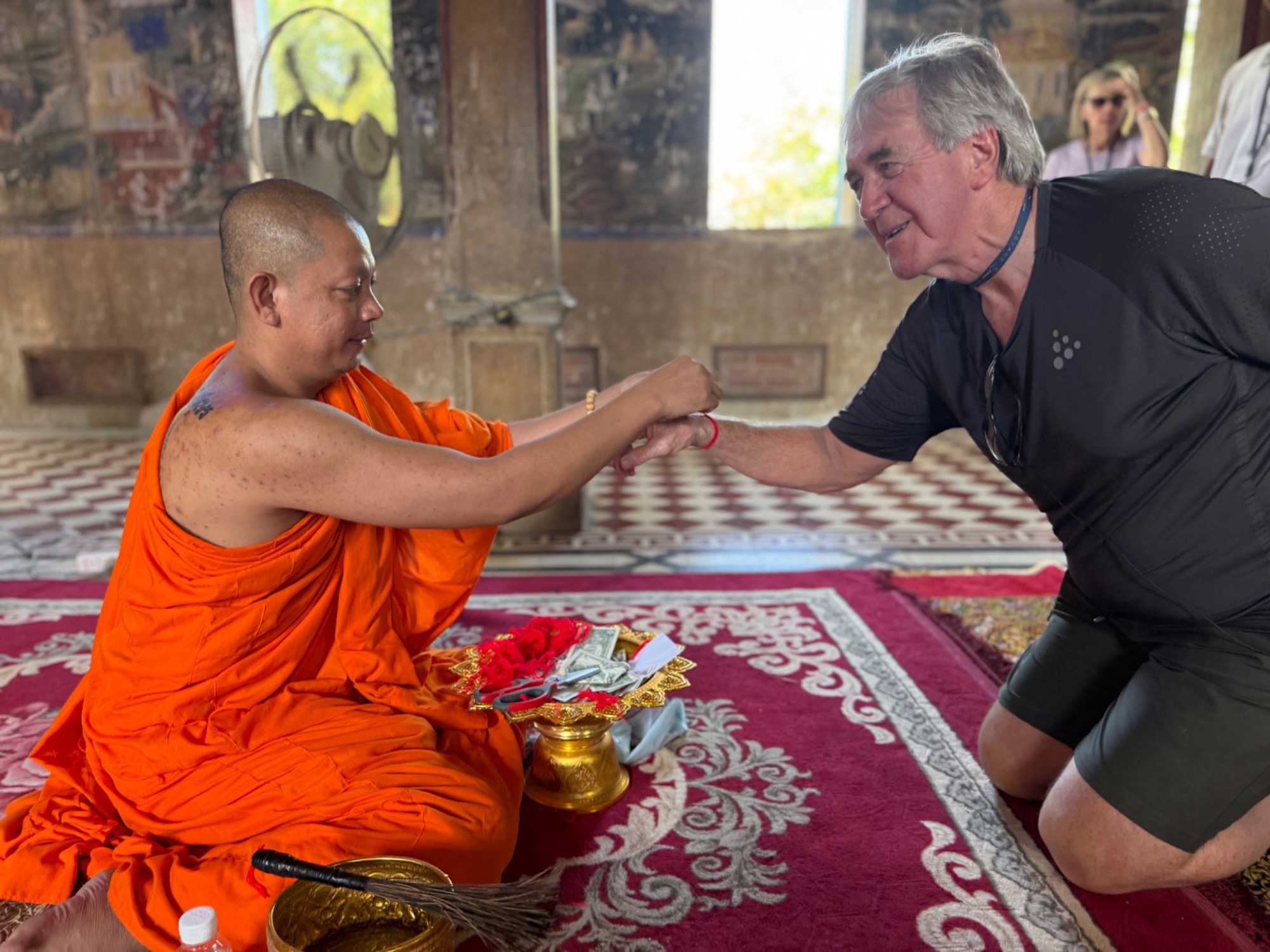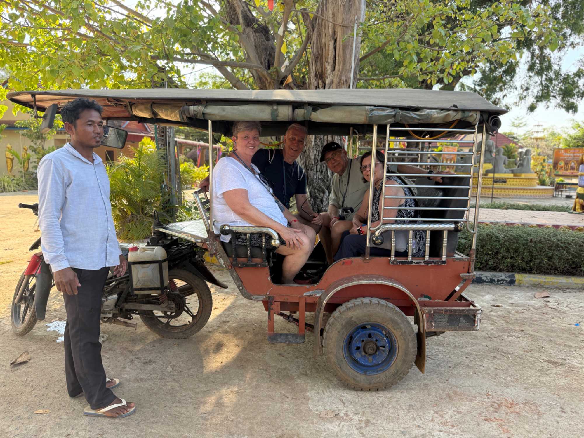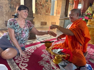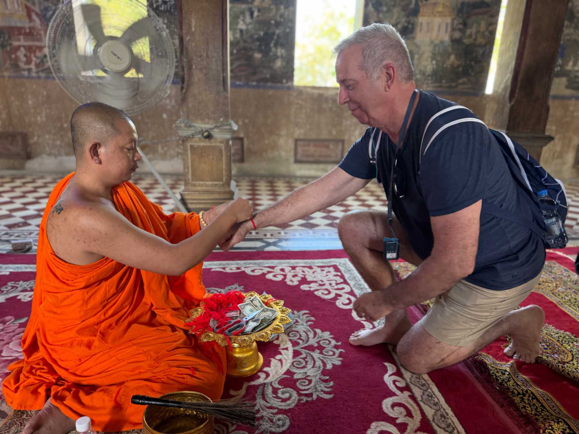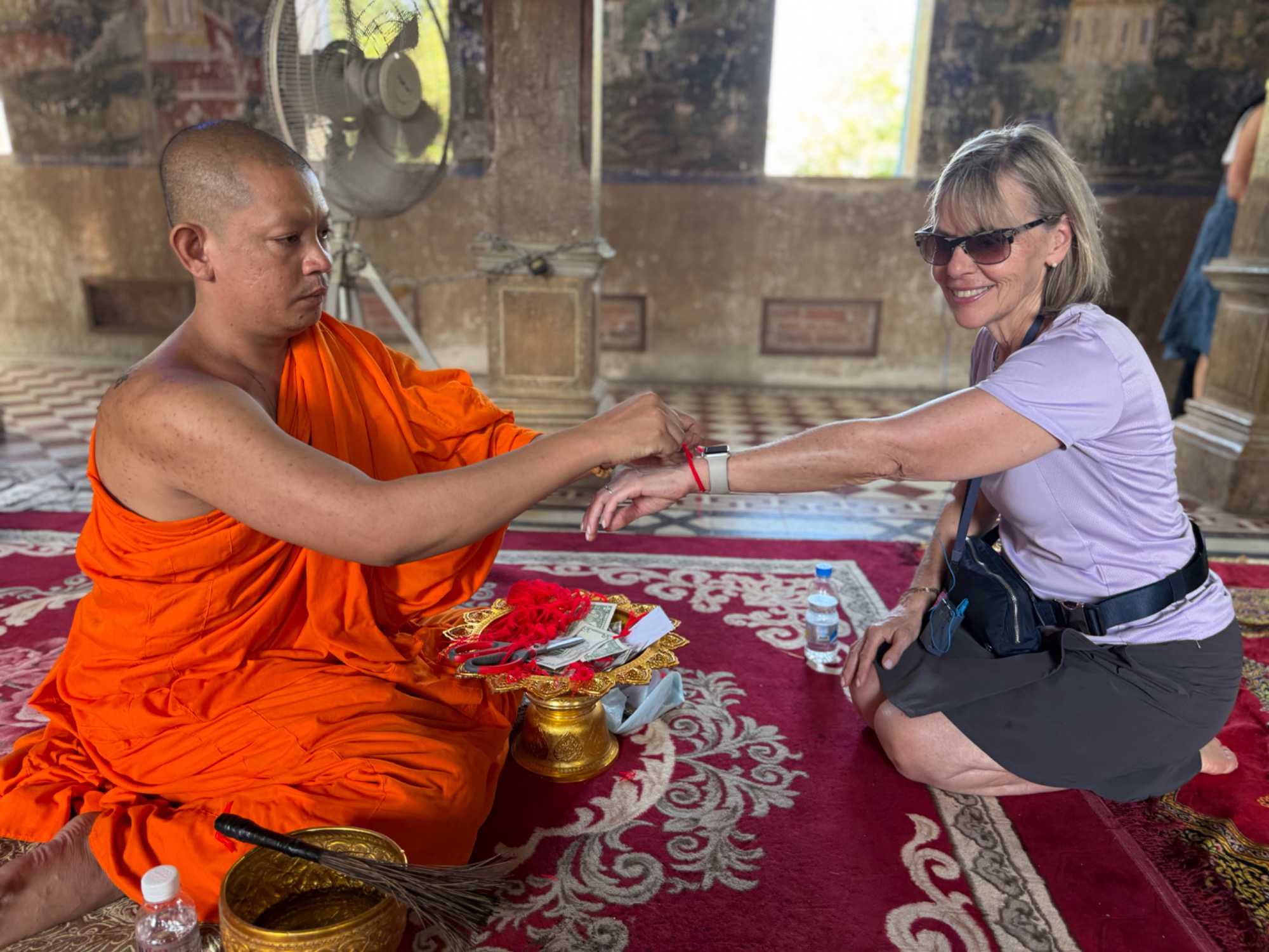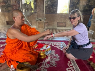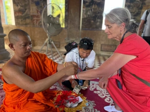 Nous naviguons quelques heures pour rejoindre Kampong Tralach, afin d’apprendre davantage sur le coté spirituel des habitants. Le Cambodge est bouddhiste à 95%, chrétien 2%, musulman 2% et 1% d’anémistes. De là, nous empruntons un tuk-tuk, par groupe de 4, qui sillonne les paysages agricoles, entourés de rizières, pour aller visiter la pagode. Wat Kampong Tralach Leu et son monastère datant du 19è siècle. L’extérieur a été rafraichi, tandis qu’à l’intérieur où y aperçoit des peintures de l’époque qui mériteraient de grande restauration. Un moine était présent et nous a fait une cérémonie de bénédiction avec ses chants qui résonnaient dans nos coeurs, suivi d’un rituel où il attache un fil rouge au poignet droit pour les hommes, gauches pour les femmes.