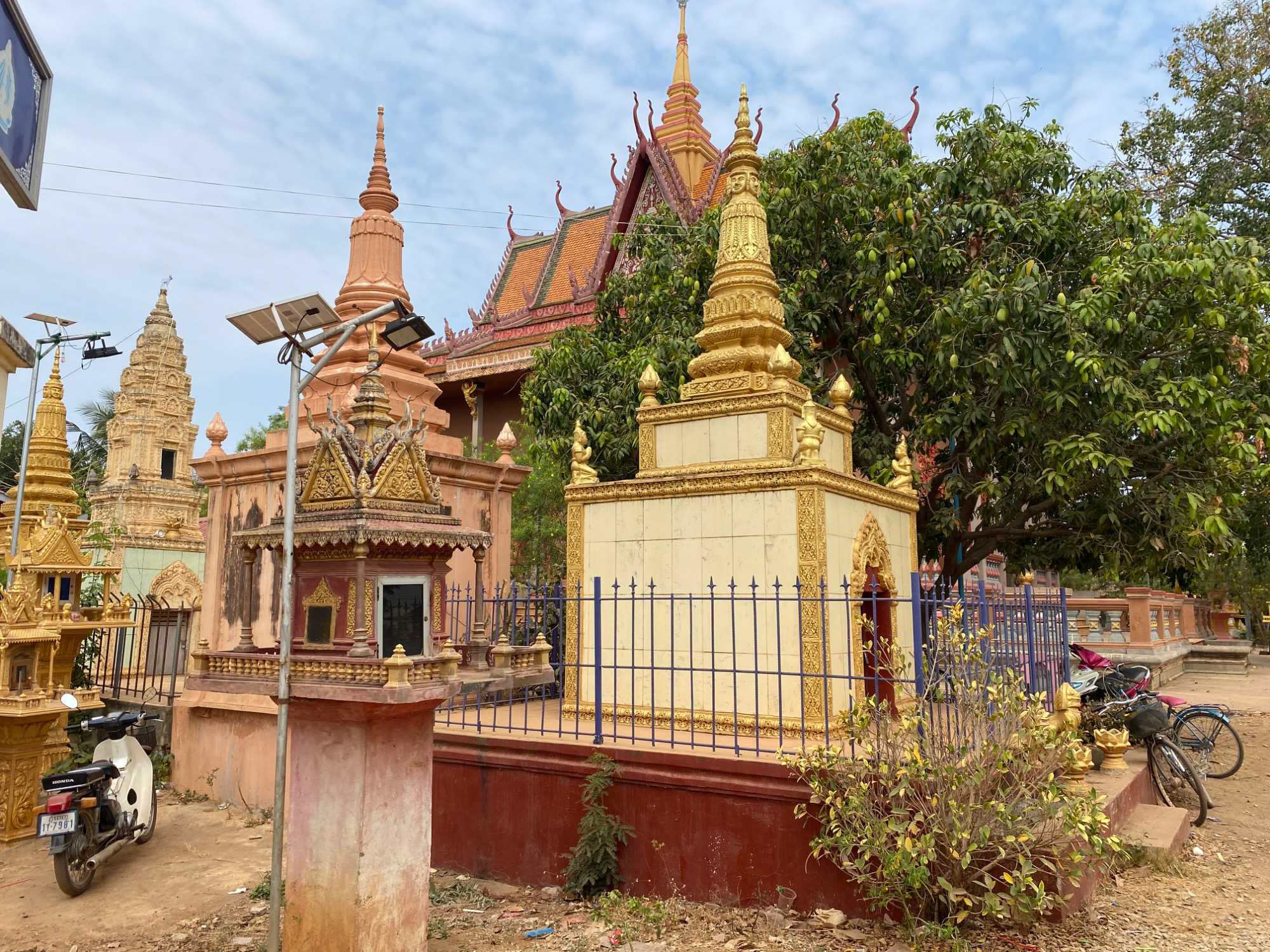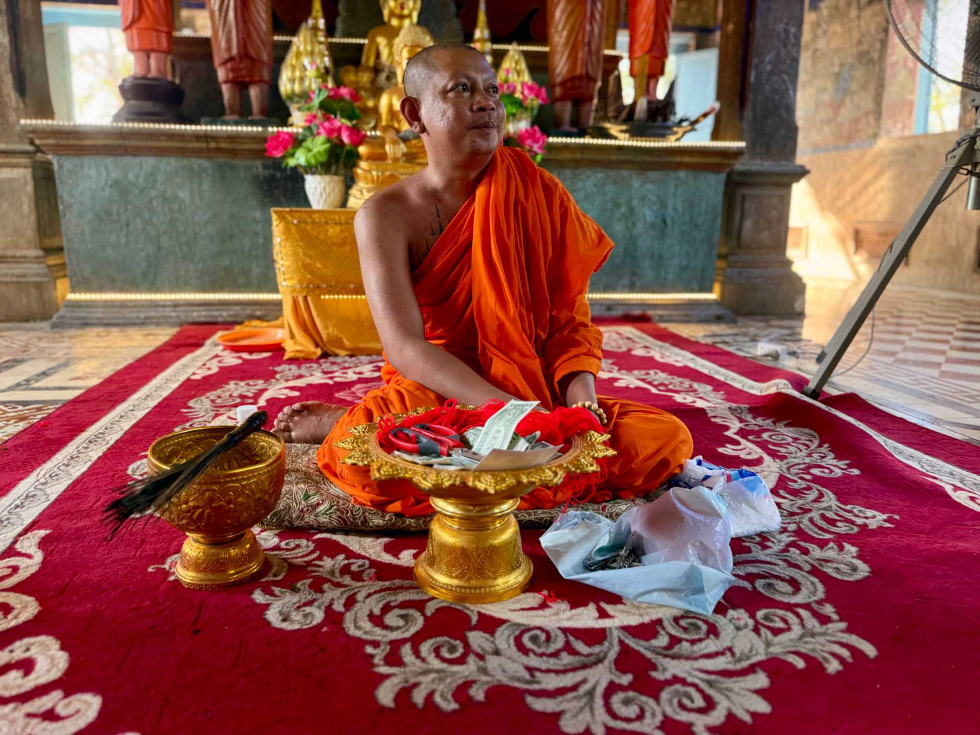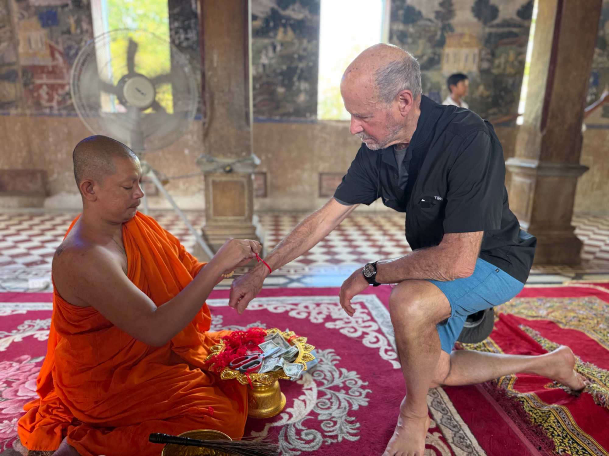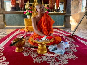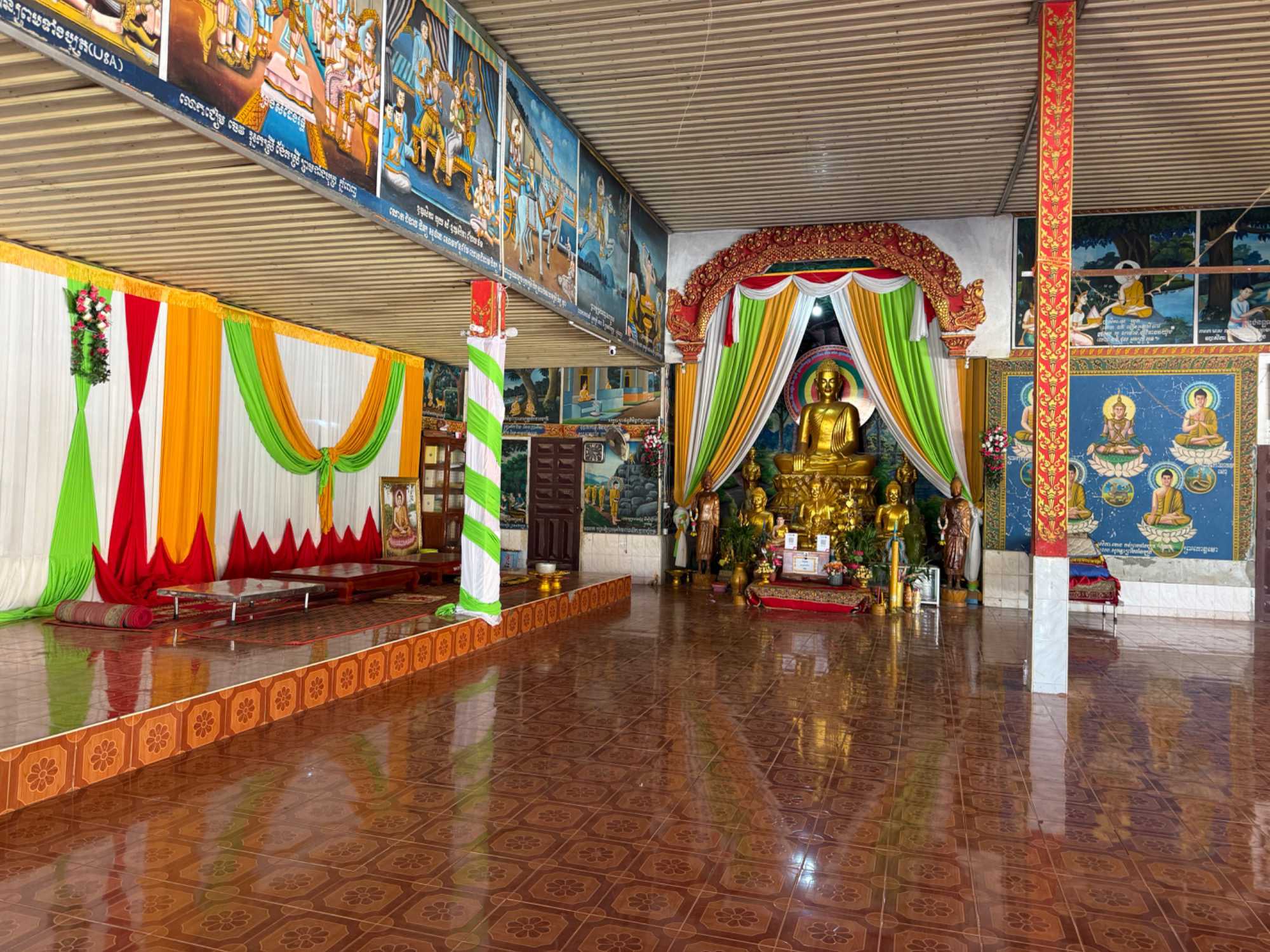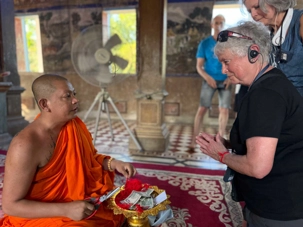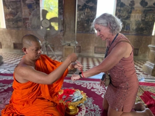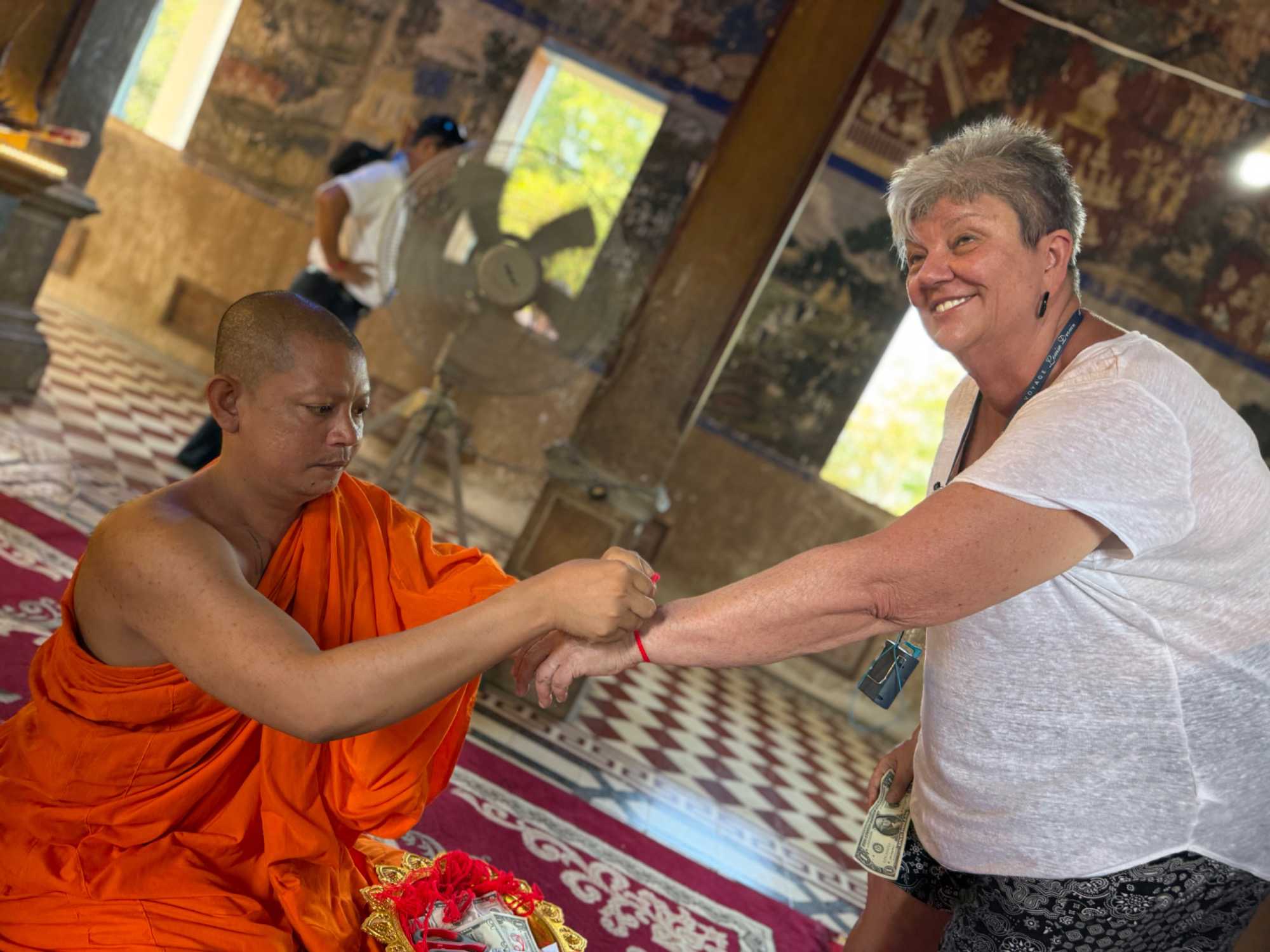Nous naviguons quelques heures pour rejoindre Kampong Tralach, afin d’apprendre davantage sur le coté spirituel des habitants. Le Cambodge est bouddhiste à 95%, chrétien 2%, musulman 2% et 1% d’anémistes. De là, nous empruntons un tuk-tuk, par groupe de 4, qui sillonne les paysages agricoles, entourés de rizières, pour aller visiter la pagode. Wat Kampong Tralach Leu et son monastère datant du 19è siècle. L’extérieur a été rafraichi, tandis qu’à l’intérieur où y aperçoit des peintures de l’époque qui mériteraient de grande restauration. Un moine était présent et nous a fait une cérémonie de bénédiction avec ses chants qui résonnaient dans nos coeurs, suivi d’un rituel où il attache un fil rouge au poignet droit pour les hommes, gauches pour les femmes.