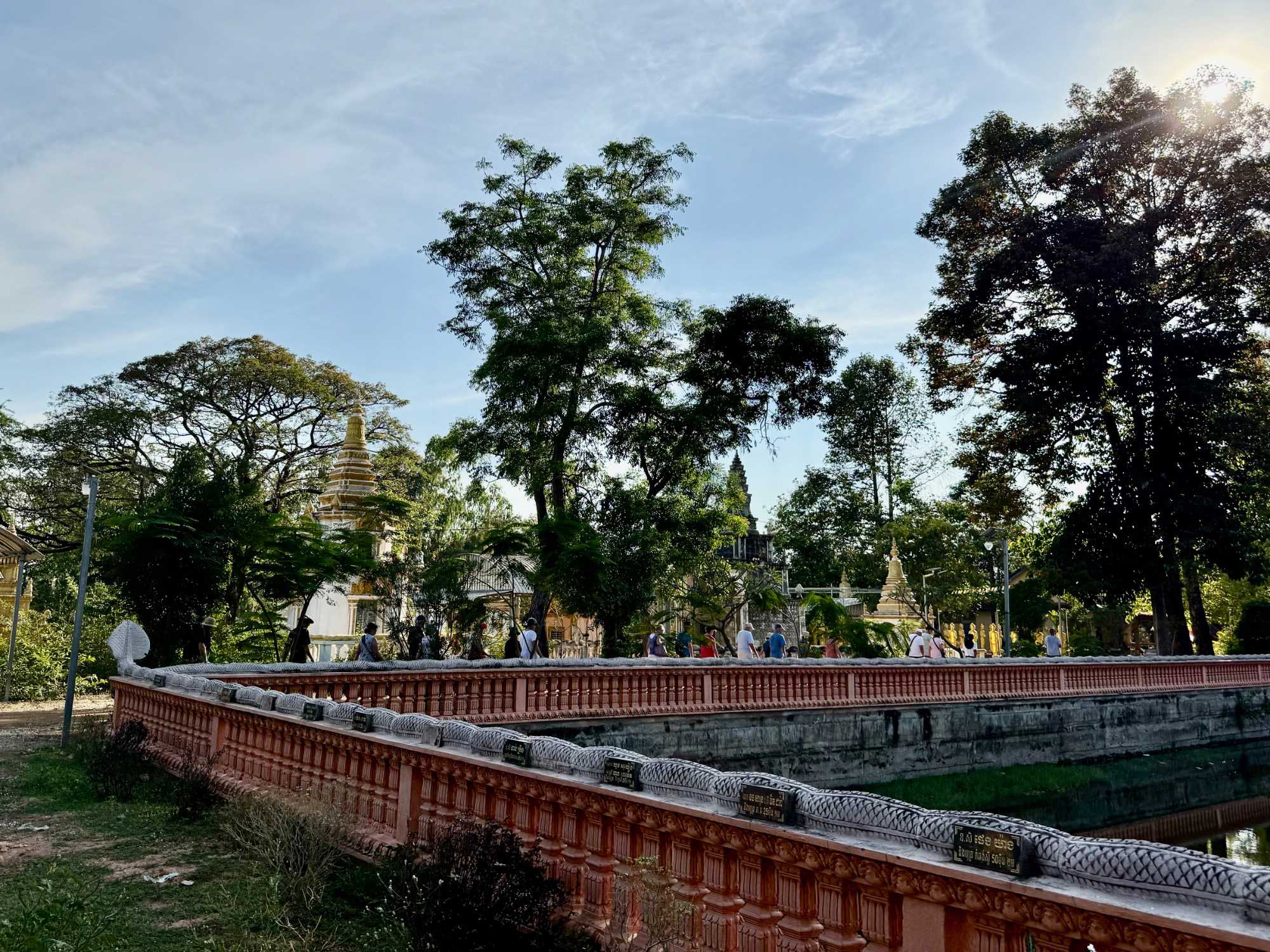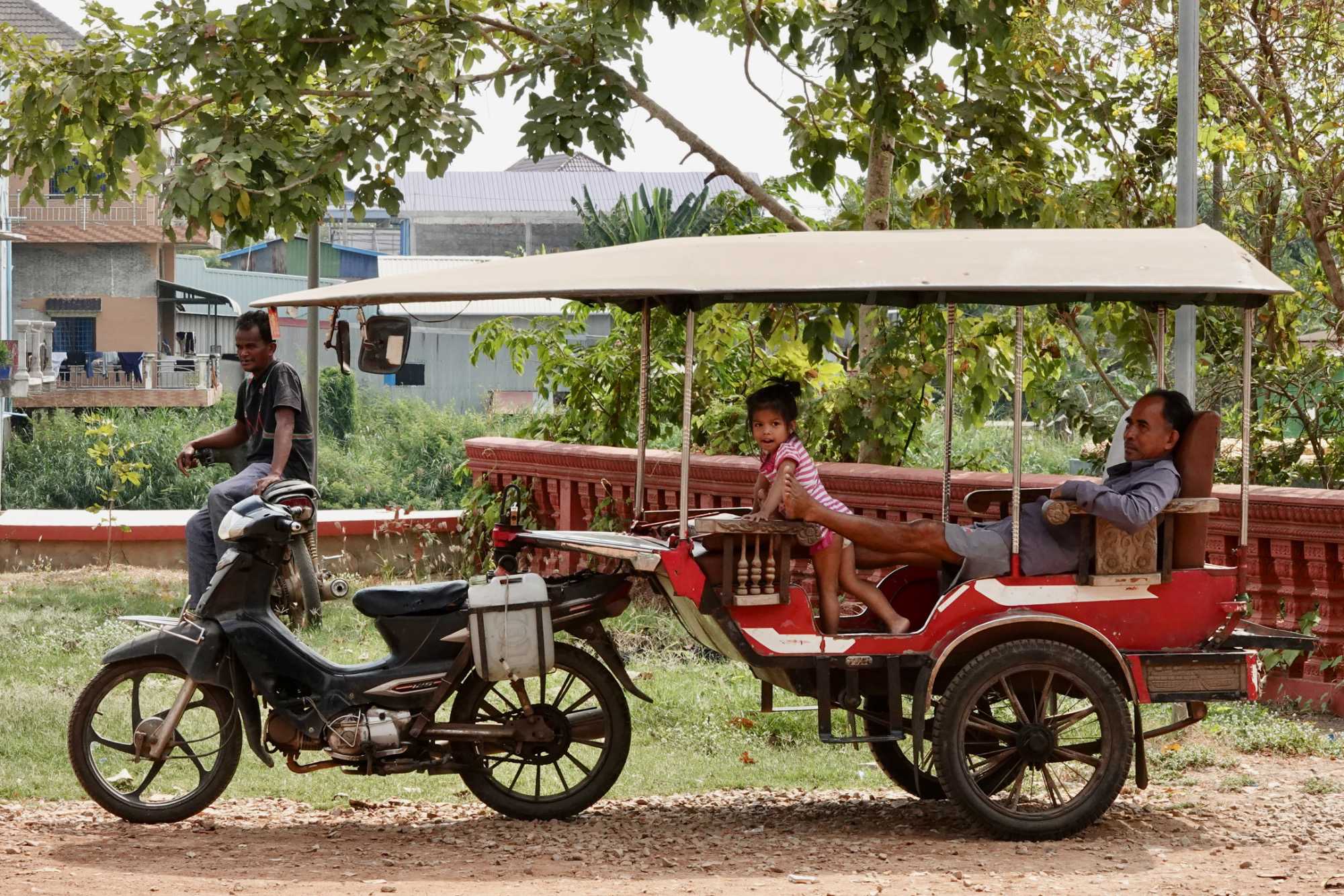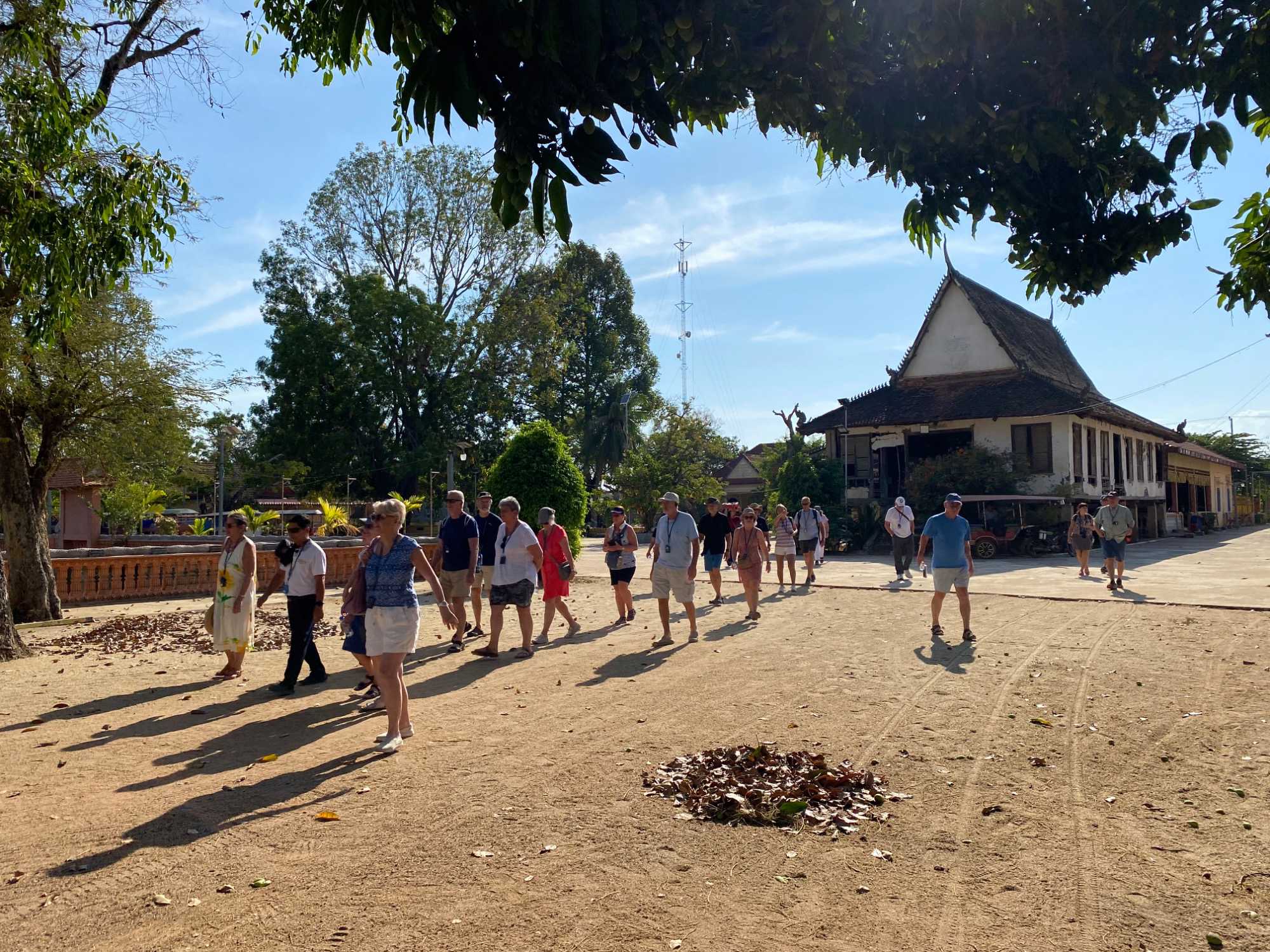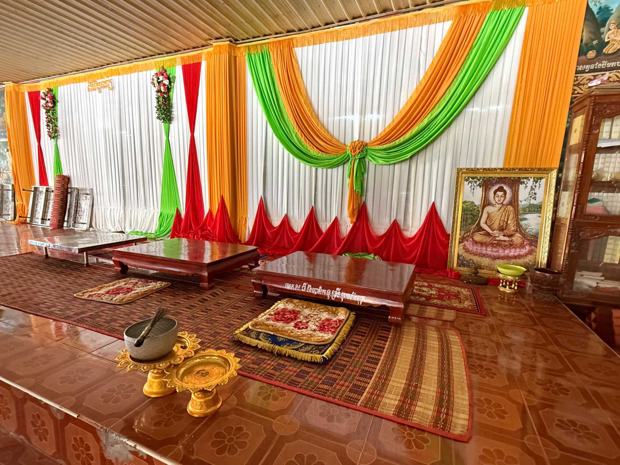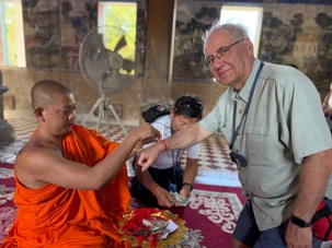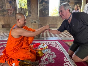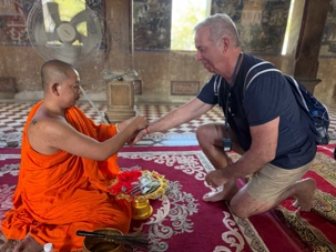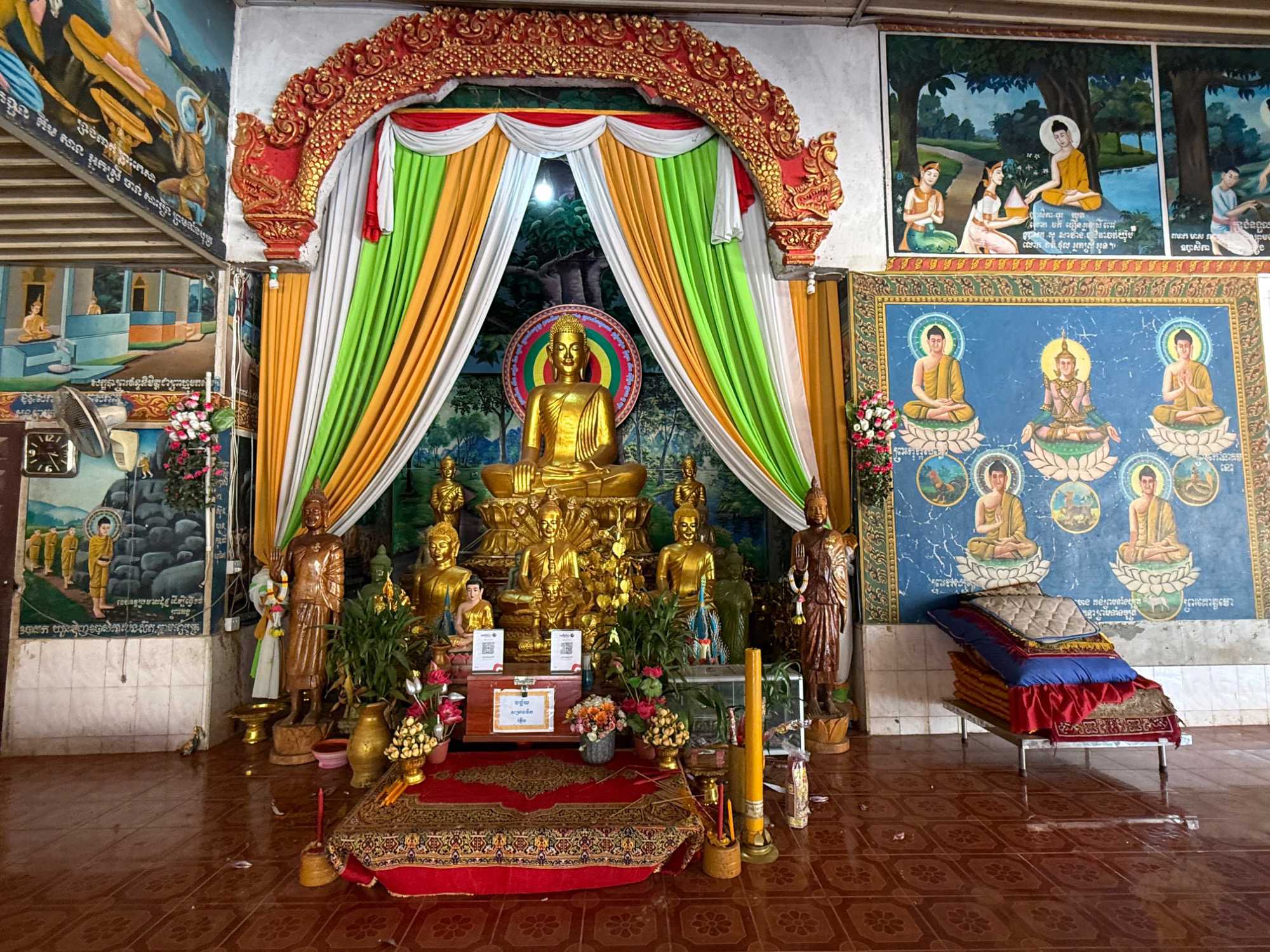 Nous naviguons quelques heures pour rejoindre Kampong Tralach, afin d’apprendre davantage sur le coté spirituel des habitants. Le Cambodge est bouddhiste à 95%, chrétien 2%, musulman 2% et 1% d’anémistes. De là, nous empruntons un tuk-tuk, par groupe de 4, qui sillonne les paysages agricoles, entourés de rizières, pour aller visiter la pagode. Wat Kampong Tralach Leu et son monastère datant du 19è siècle. L’extérieur a été rafraichi, tandis qu’à l’intérieur où y aperçoit des peintures de l’époque qui mériteraient de grande restauration. Un moine était présent et nous a fait une cérémonie de bénédiction avec ses chants qui résonnaient dans nos coeurs, suivi d’un rituel où il attache un fil rouge au poignet droit pour les hommes, gauches pour les femmes.