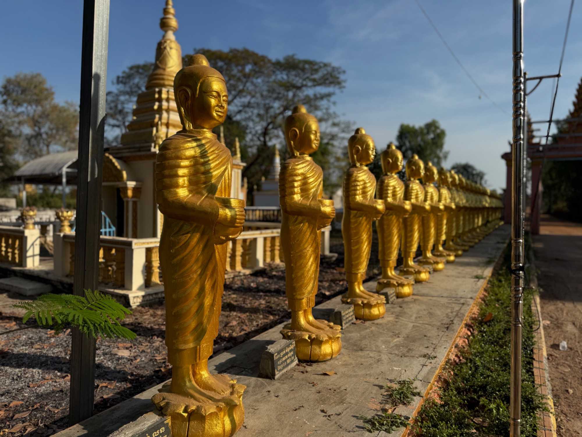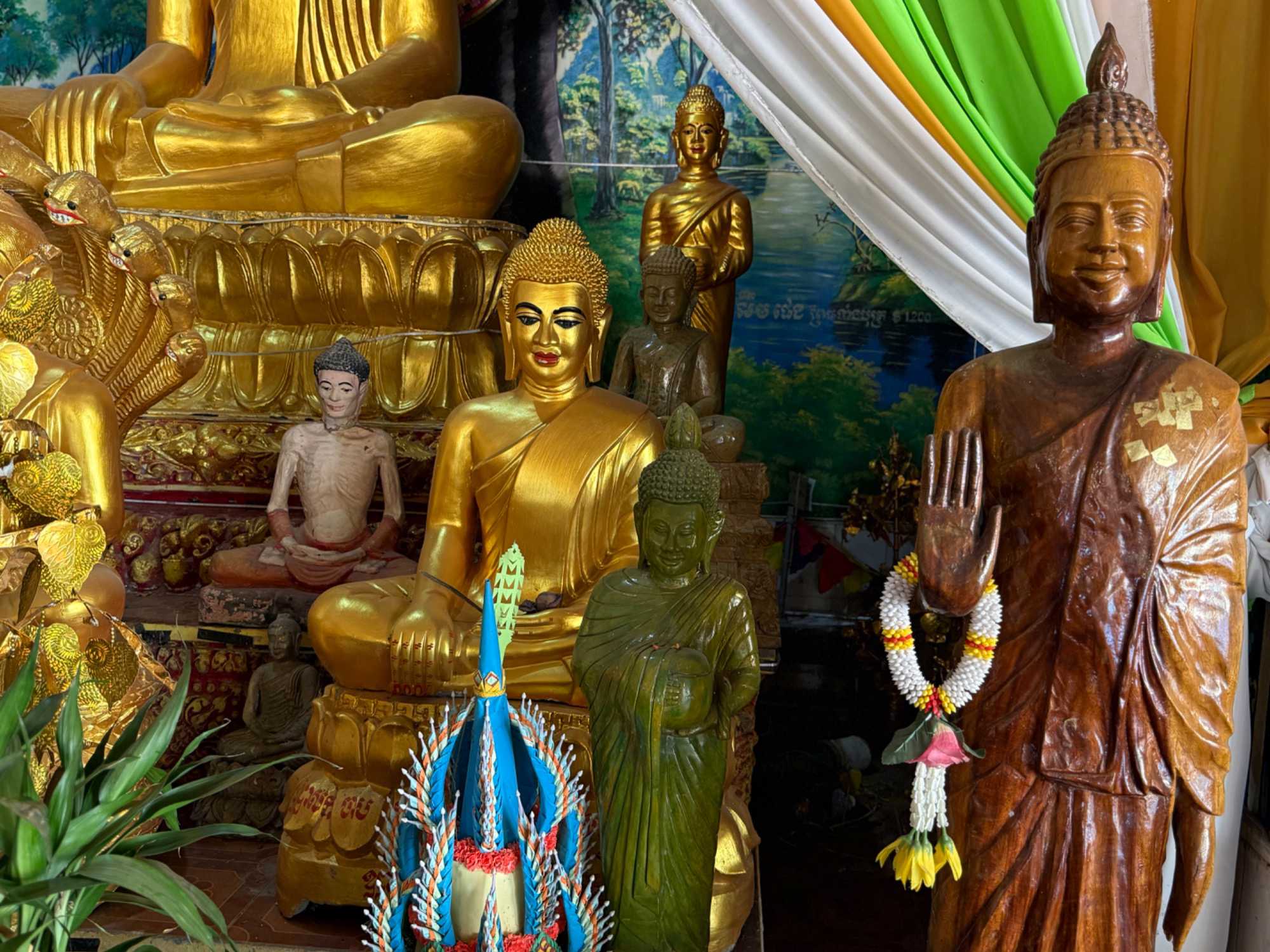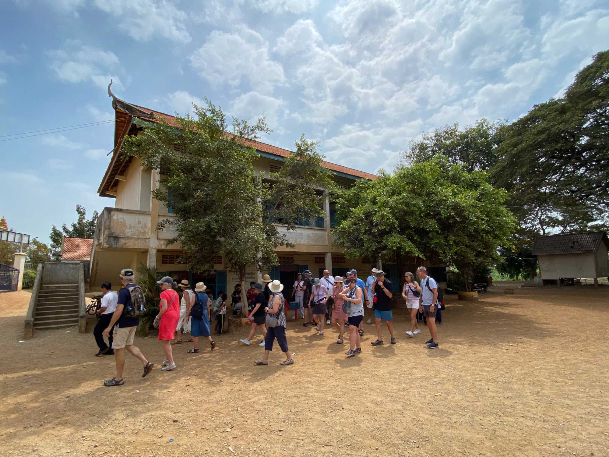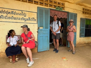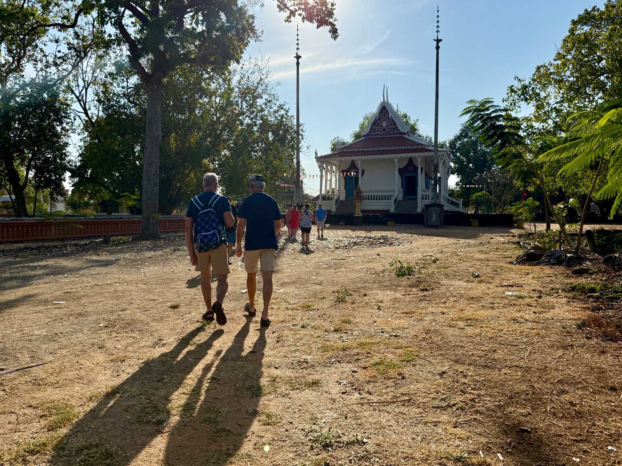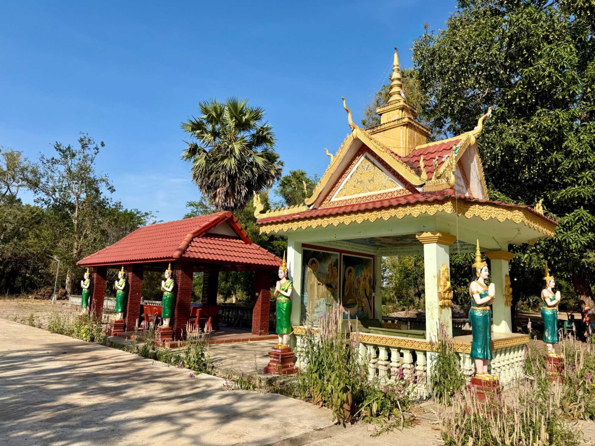 Nous naviguons quelques heures pour rejoindre Kampong Tralach, afin d’apprendre davantage sur le coté spirituel des habitants. Le Cambodge est bouddhiste à 95%, chrétien 2%, musulman 2% et 1% d’anémistes. De là, nous empruntons un tuk-tuk, par groupe de 4, qui sillonne les paysages agricoles, entourés de rizières, pour aller visiter la pagode. Wat Kampong Tralach Leu et son monastère datant du 19è siècle. L’extérieur a été rafraichi, tandis qu’à l’intérieur où y aperçoit des peintures de l’époque qui mériteraient de grande restauration. Un moine était présent et nous a fait une cérémonie de bénédiction avec ses chants qui résonnaient dans nos coeurs, suivi d’un rituel où il attache un fil rouge au poignet droit pour les hommes, gauches pour les femmes.