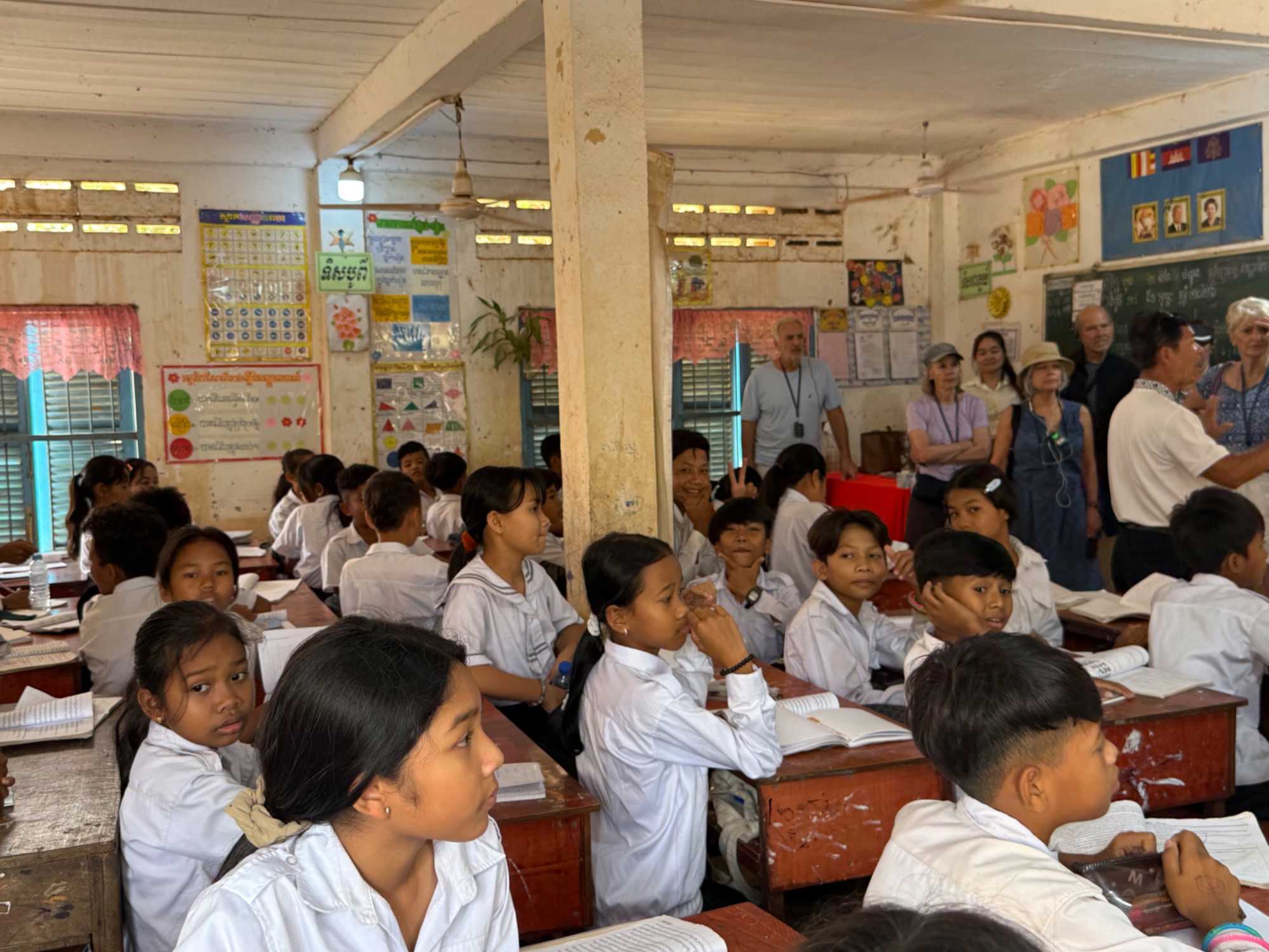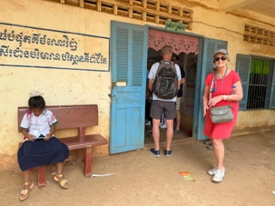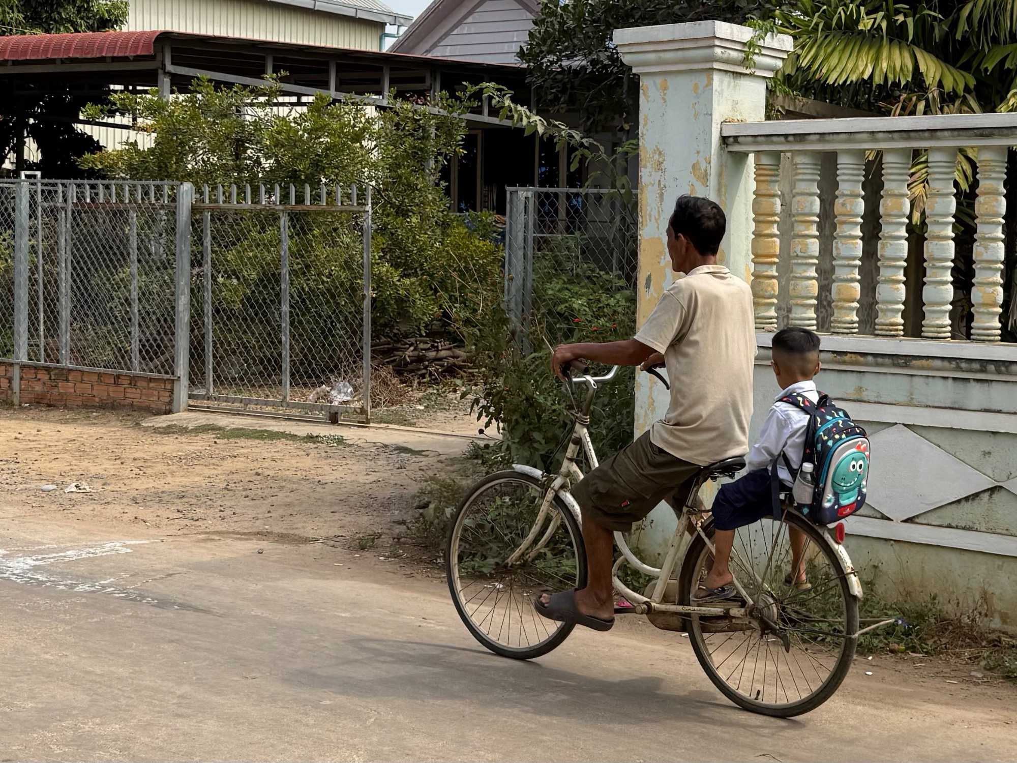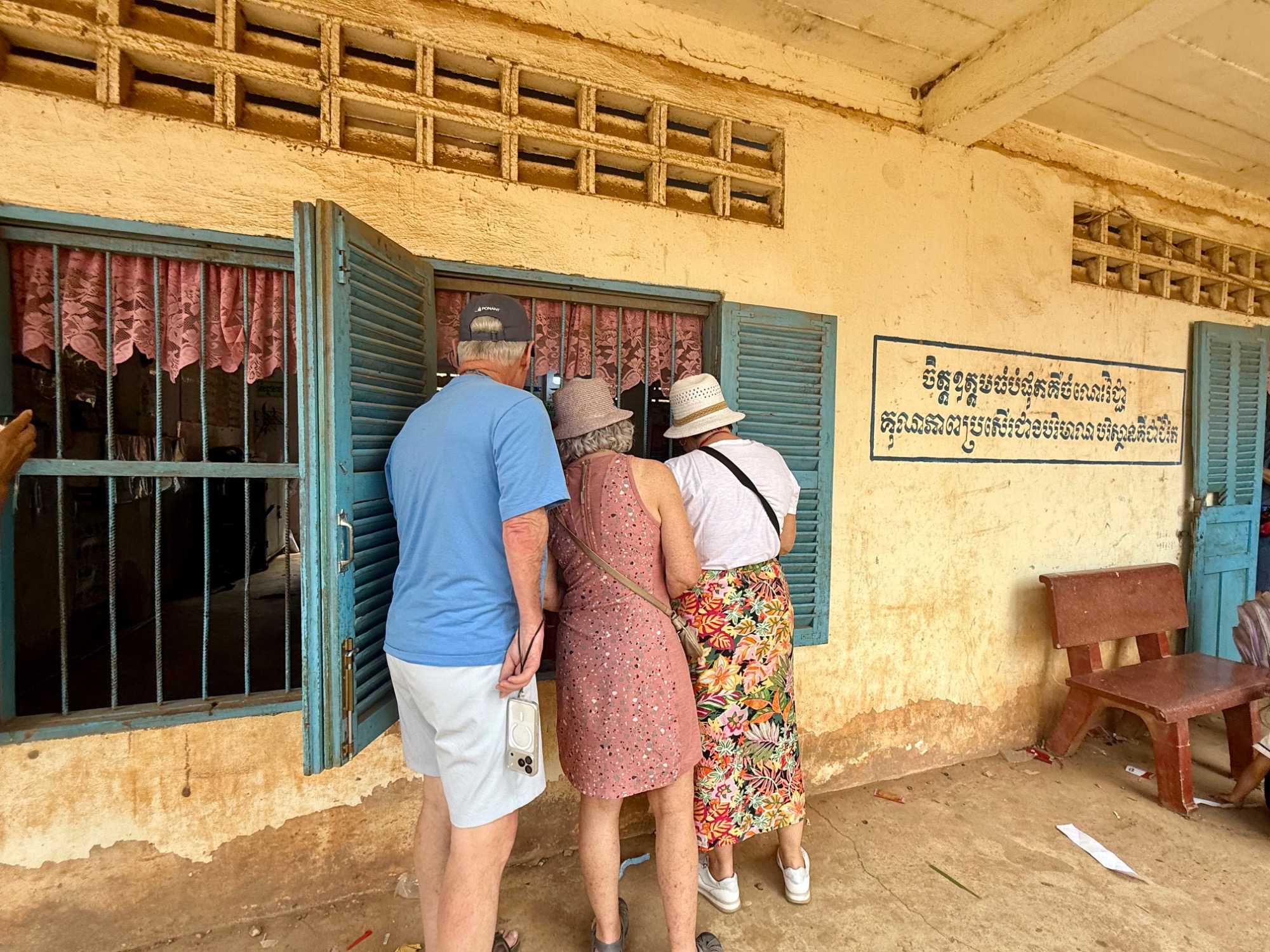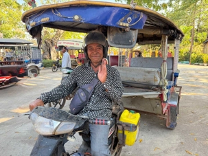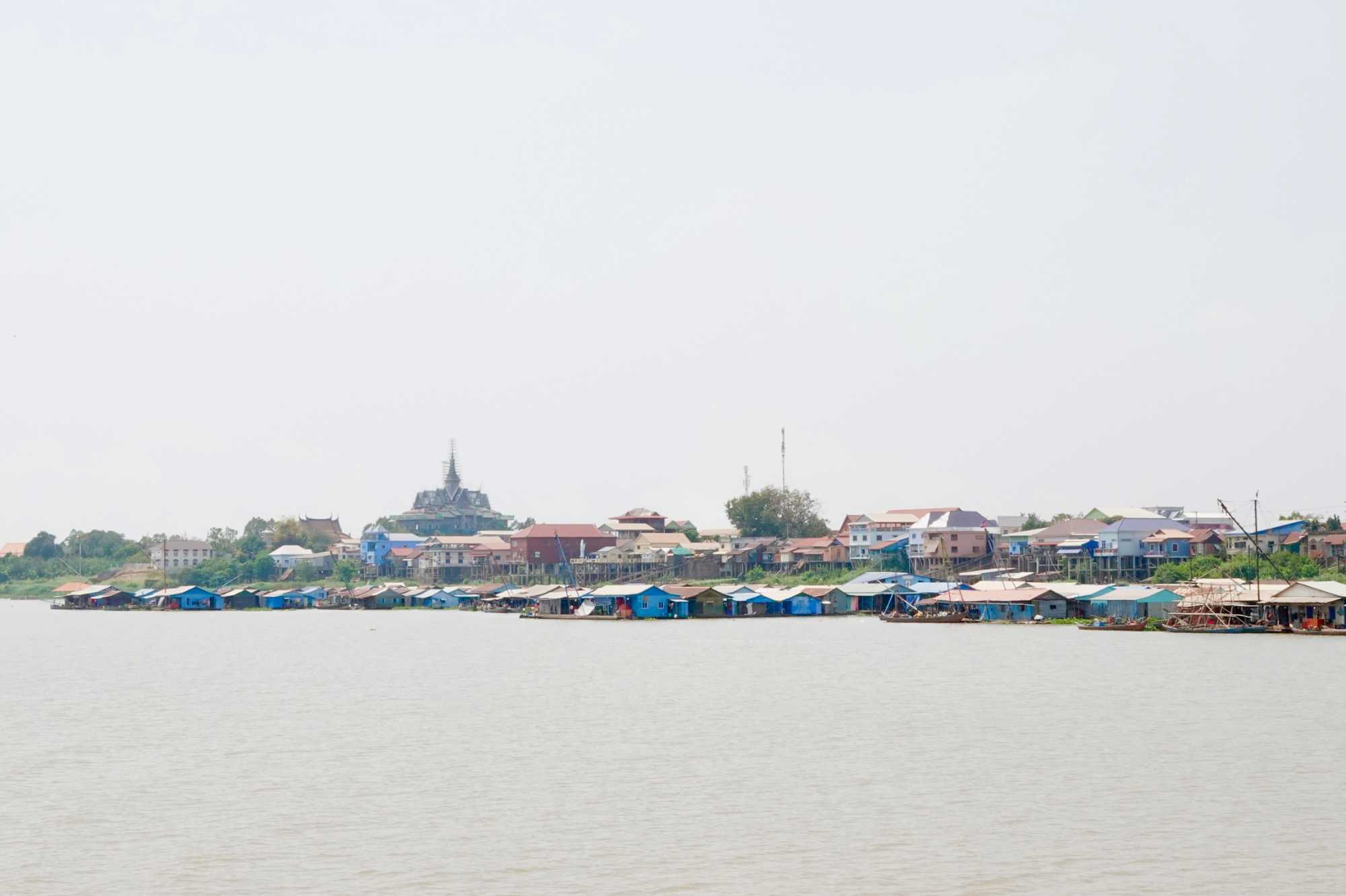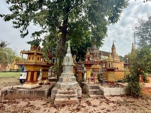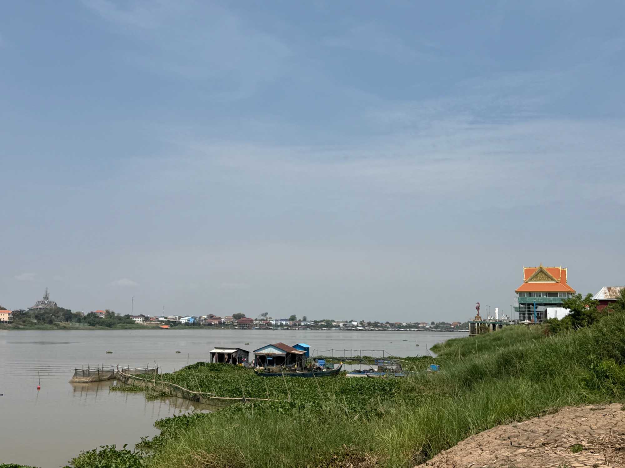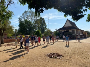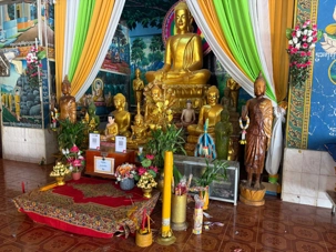 Nous naviguons quelques heures pour rejoindre Kampong Tralach, afin d’apprendre davantage sur le coté spirituel des habitants. Le Cambodge est bouddhiste à 95%, chrétien 2%, musulman 2% et 1% d’anémistes. De là, nous empruntons un tuk-tuk, par groupe de 4, qui sillonne les paysages agricoles, entourés de rizières, pour aller visiter la pagode. Wat Kampong Tralach Leu et son monastère datant du 19è siècle. L’extérieur a été rafraichi, tandis qu’à l’intérieur où y aperçoit des peintures de l’époque qui mériteraient de grande restauration. Un moine était présent et nous a fait une cérémonie de bénédiction avec ses chants qui résonnaient dans nos coeurs, suivi d’un rituel où il attache un fil rouge au poignet droit pour les hommes, gauches pour les femmes.