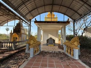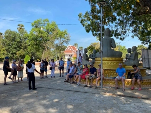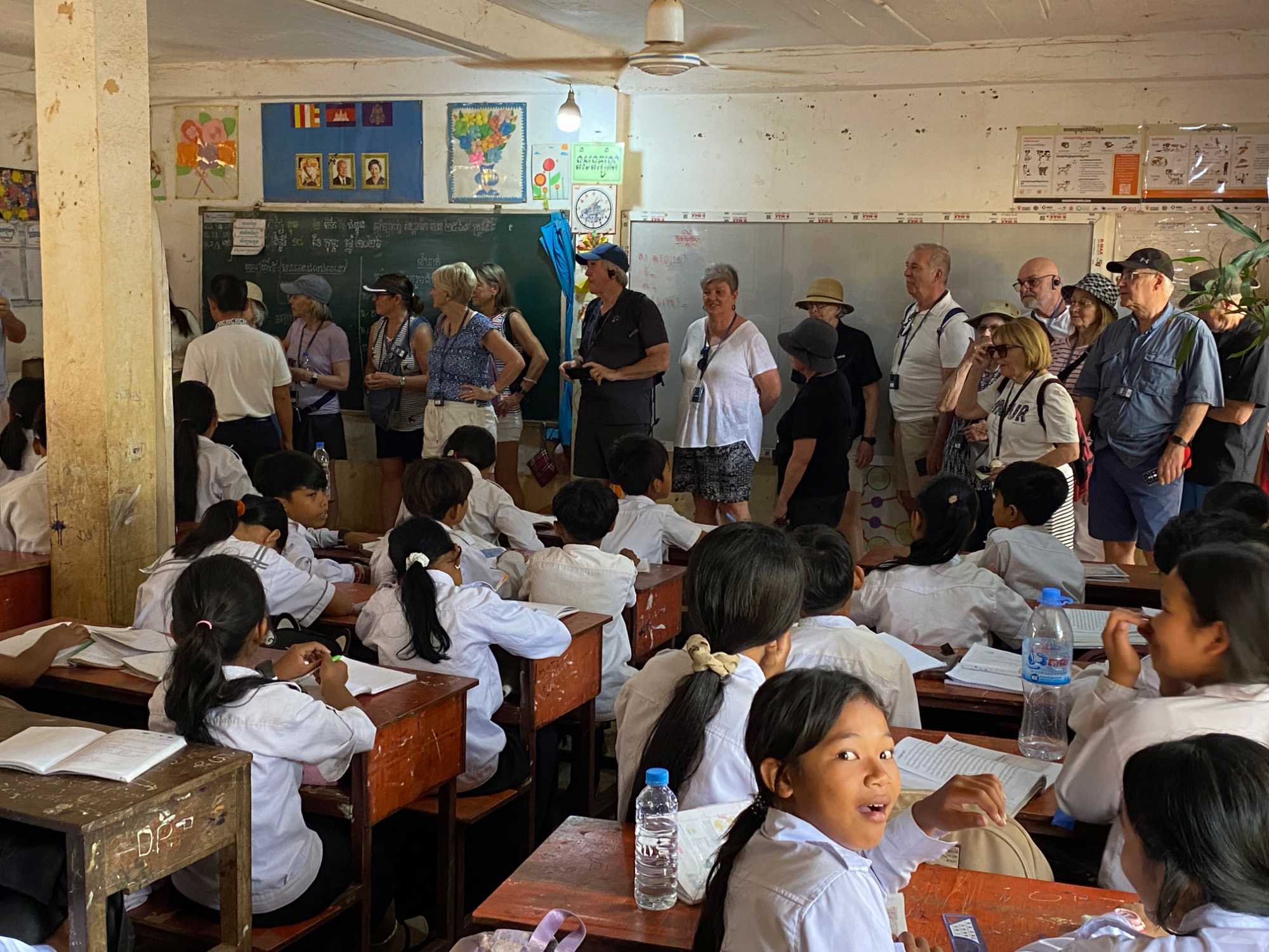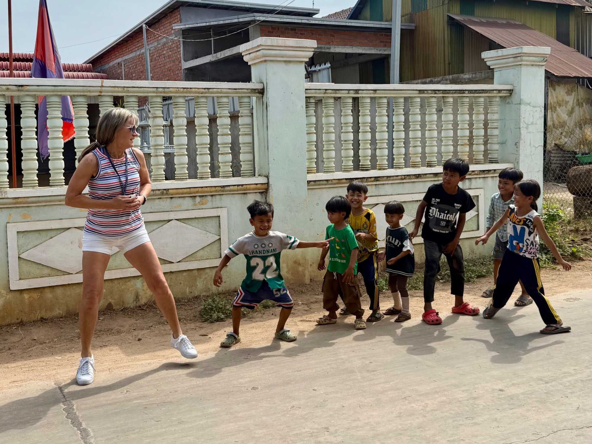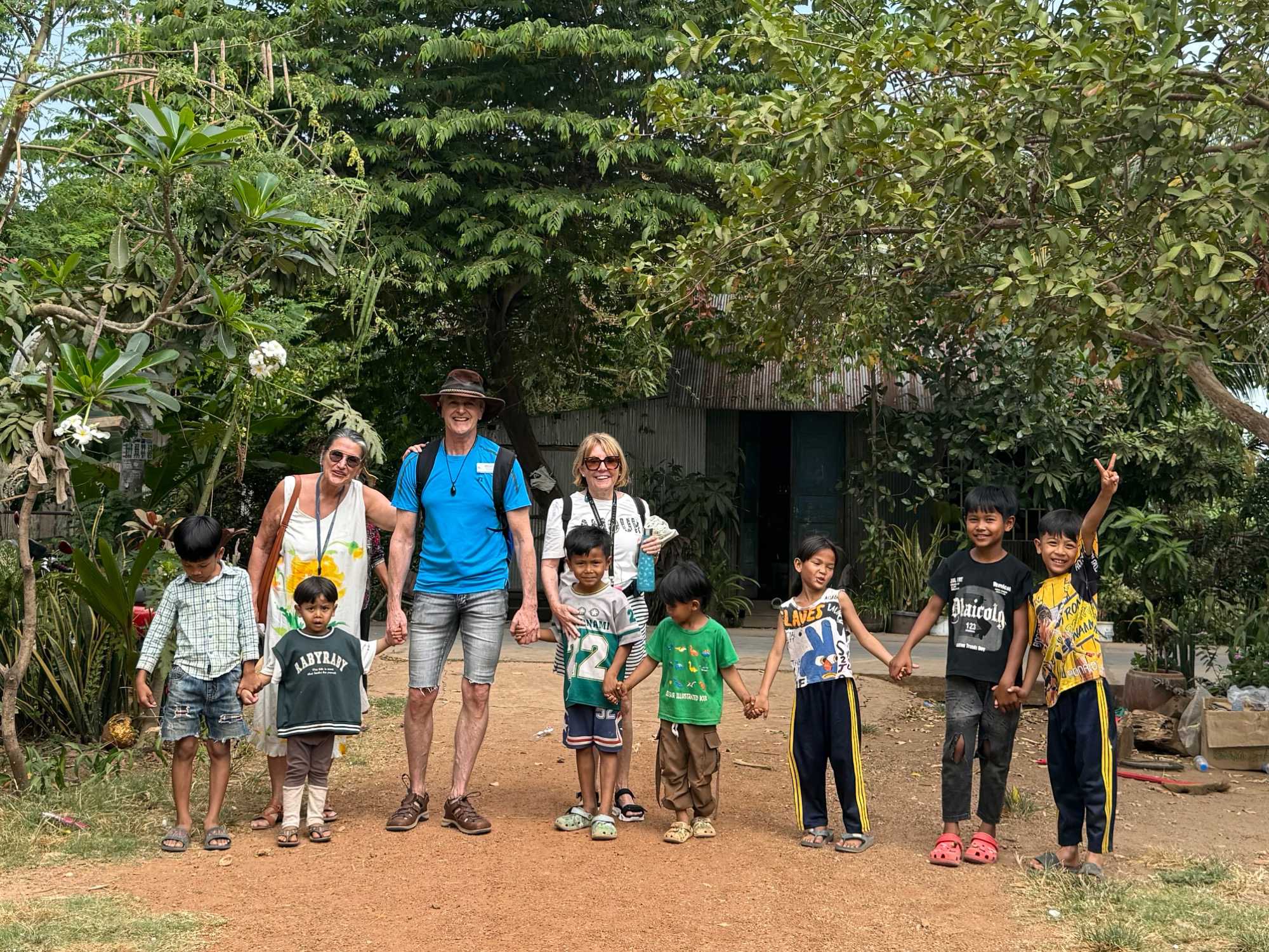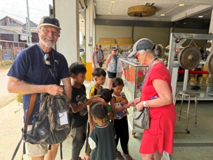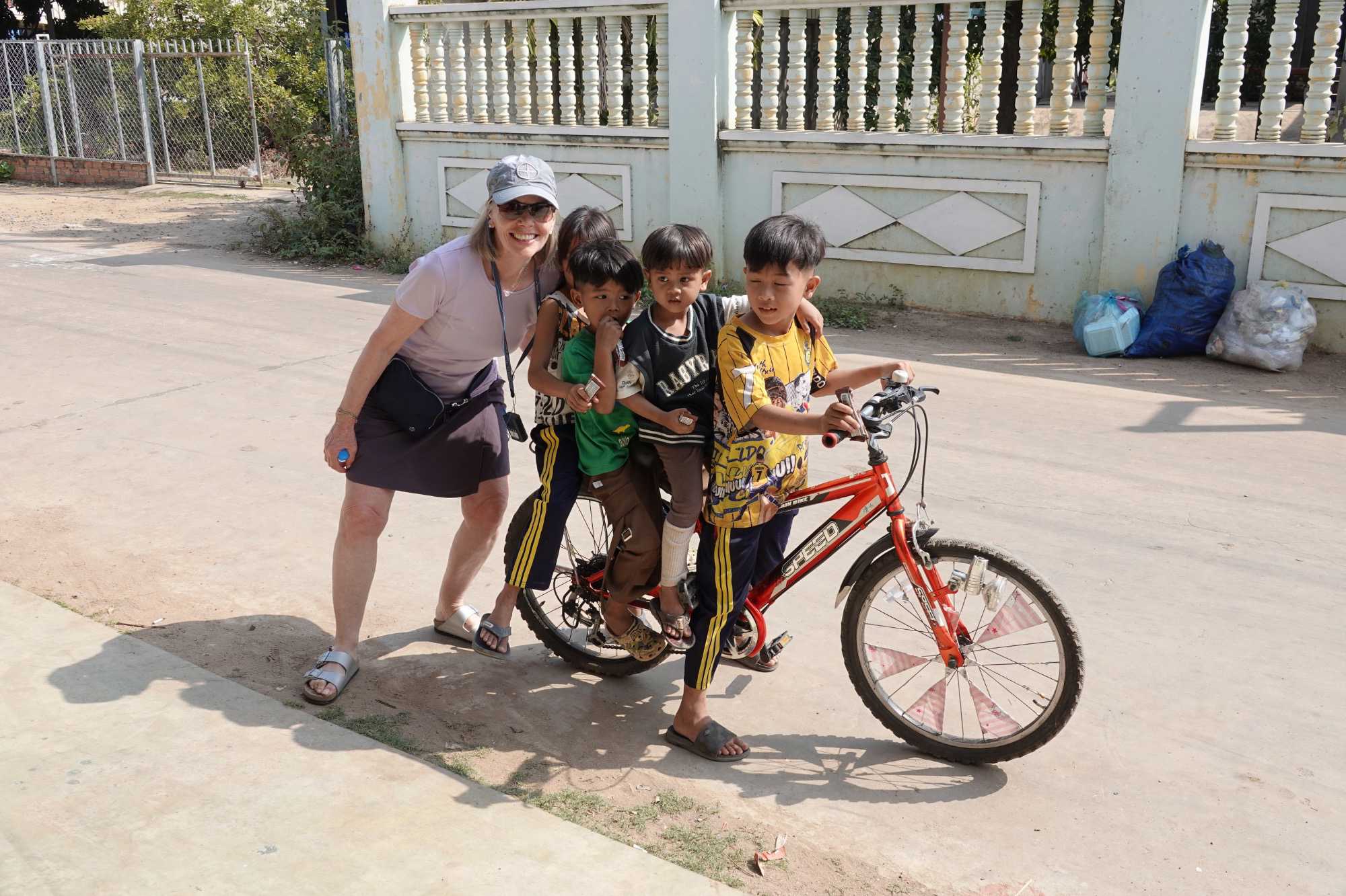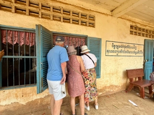Nous naviguons quelques heures pour rejoindre Kampong Tralach, afin d’apprendre davantage sur le coté spirituel des habitants. Le Cambodge est bouddhiste à 95%, chrétien 2%, musulman 2% et 1% d’anémistes. De là, nous empruntons un tuk-tuk, par groupe de 4, qui sillonne les paysages agricoles, entourés de rizières, pour aller visiter la pagode. Wat Kampong Tralach Leu et son monastère datant du 19è siècle. L’extérieur a été rafraichi, tandis qu’à l’intérieur où y aperçoit des peintures de l’époque qui mériteraient de grande restauration. Un moine était présent et nous a fait une cérémonie de bénédiction avec ses chants qui résonnaient dans nos coeurs, suivi d’un rituel où il attache un fil rouge au poignet droit pour les hommes, gauches pour les femmes.