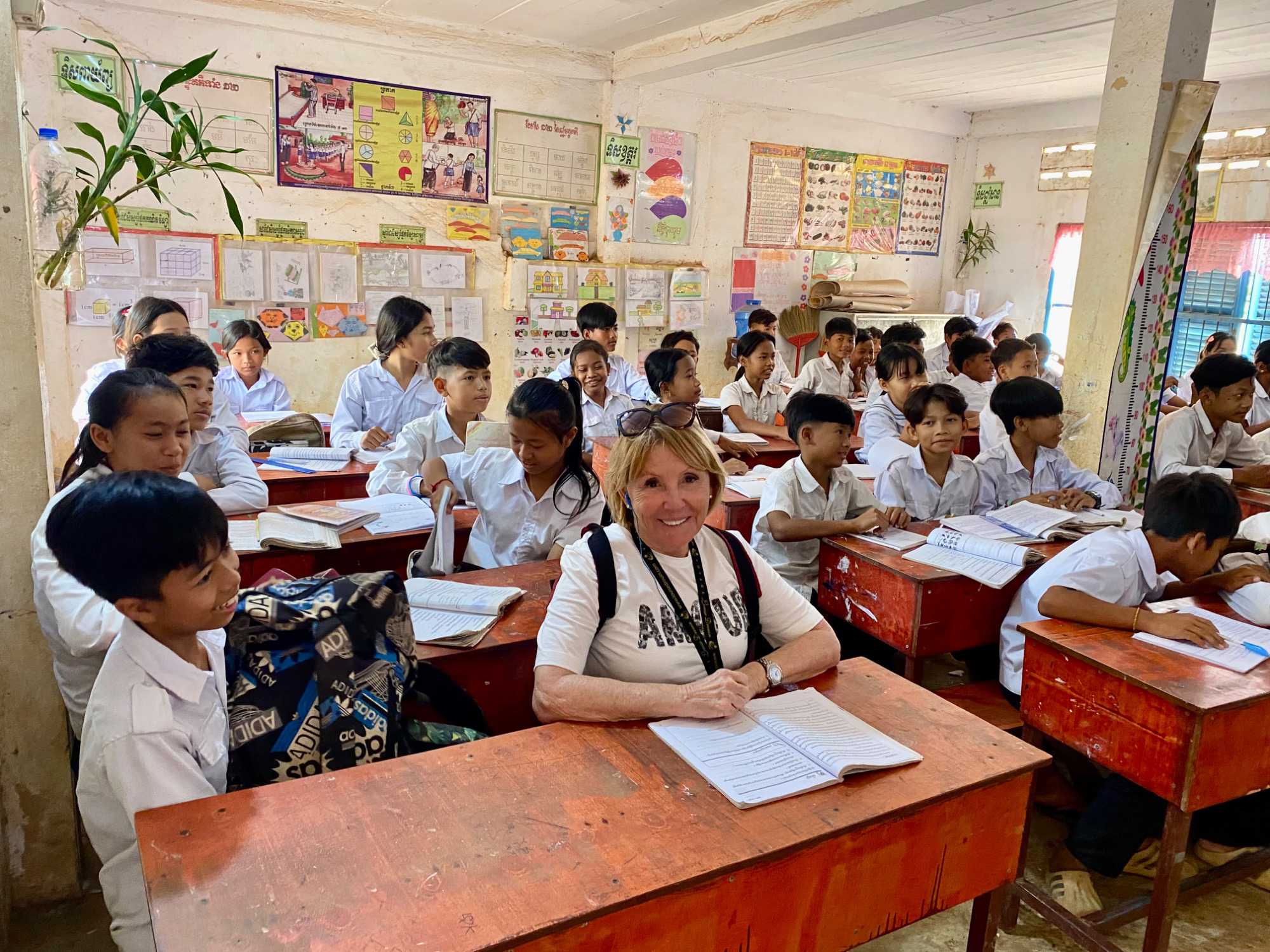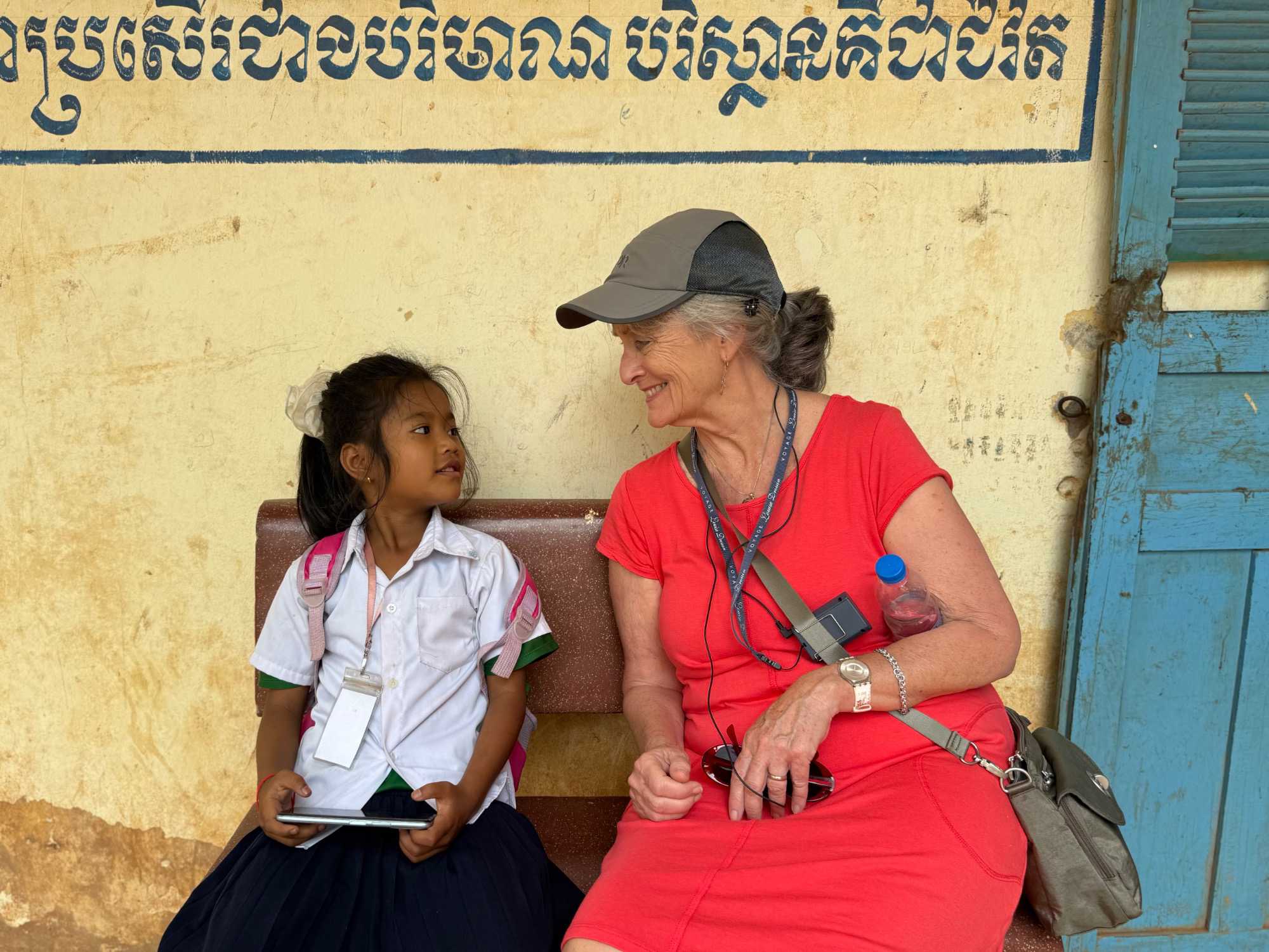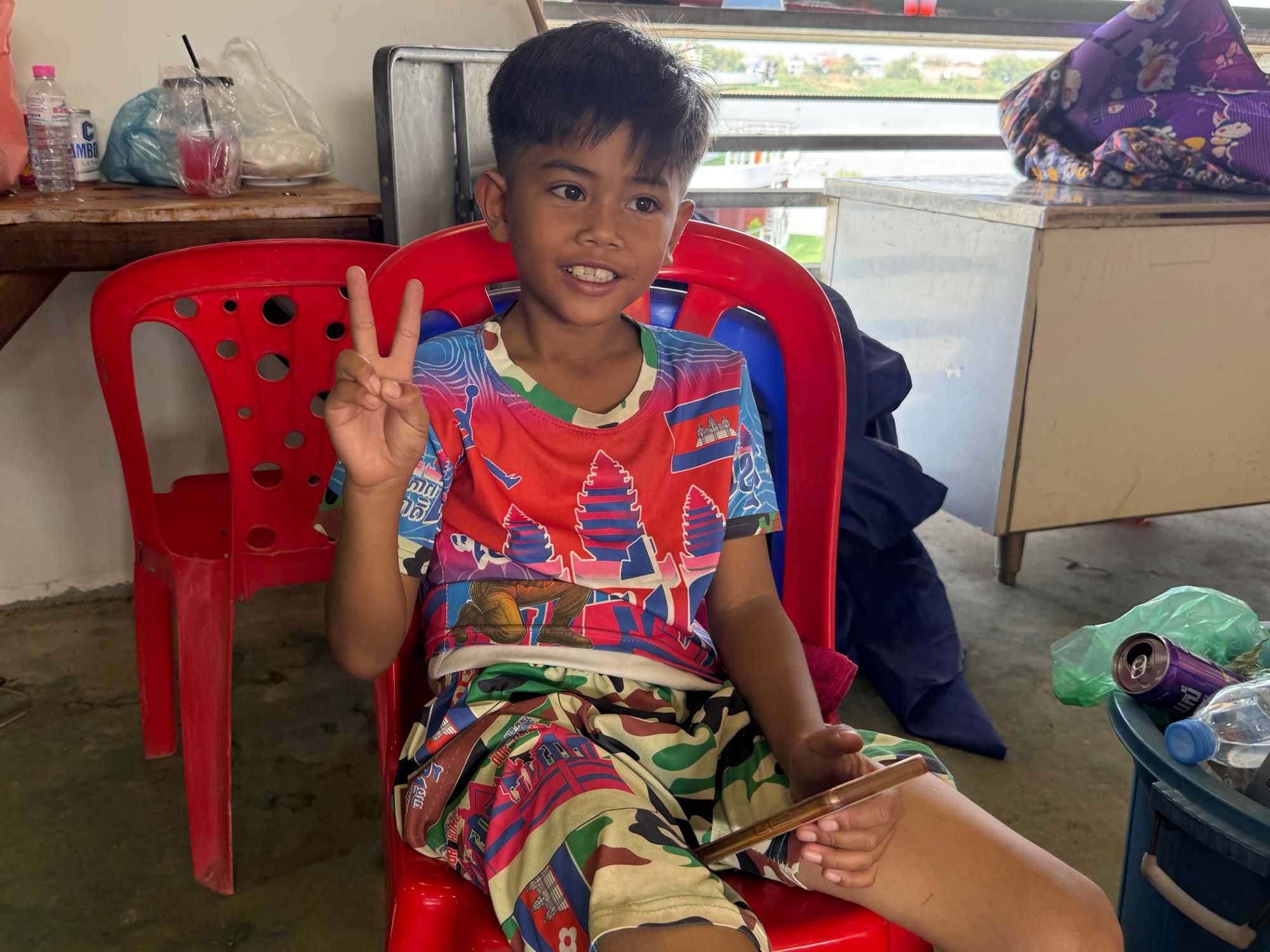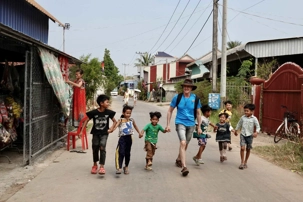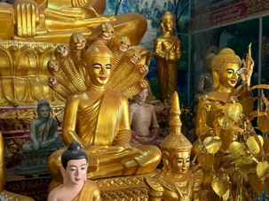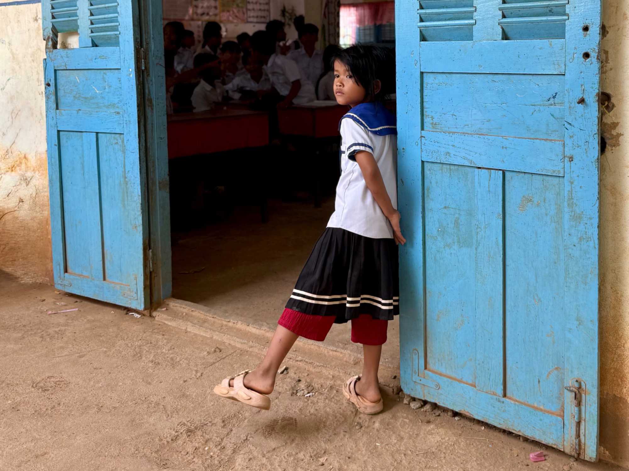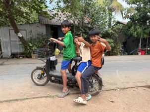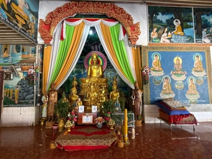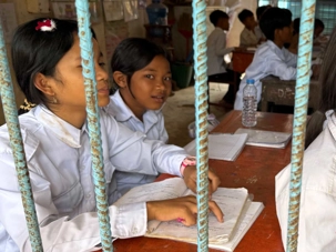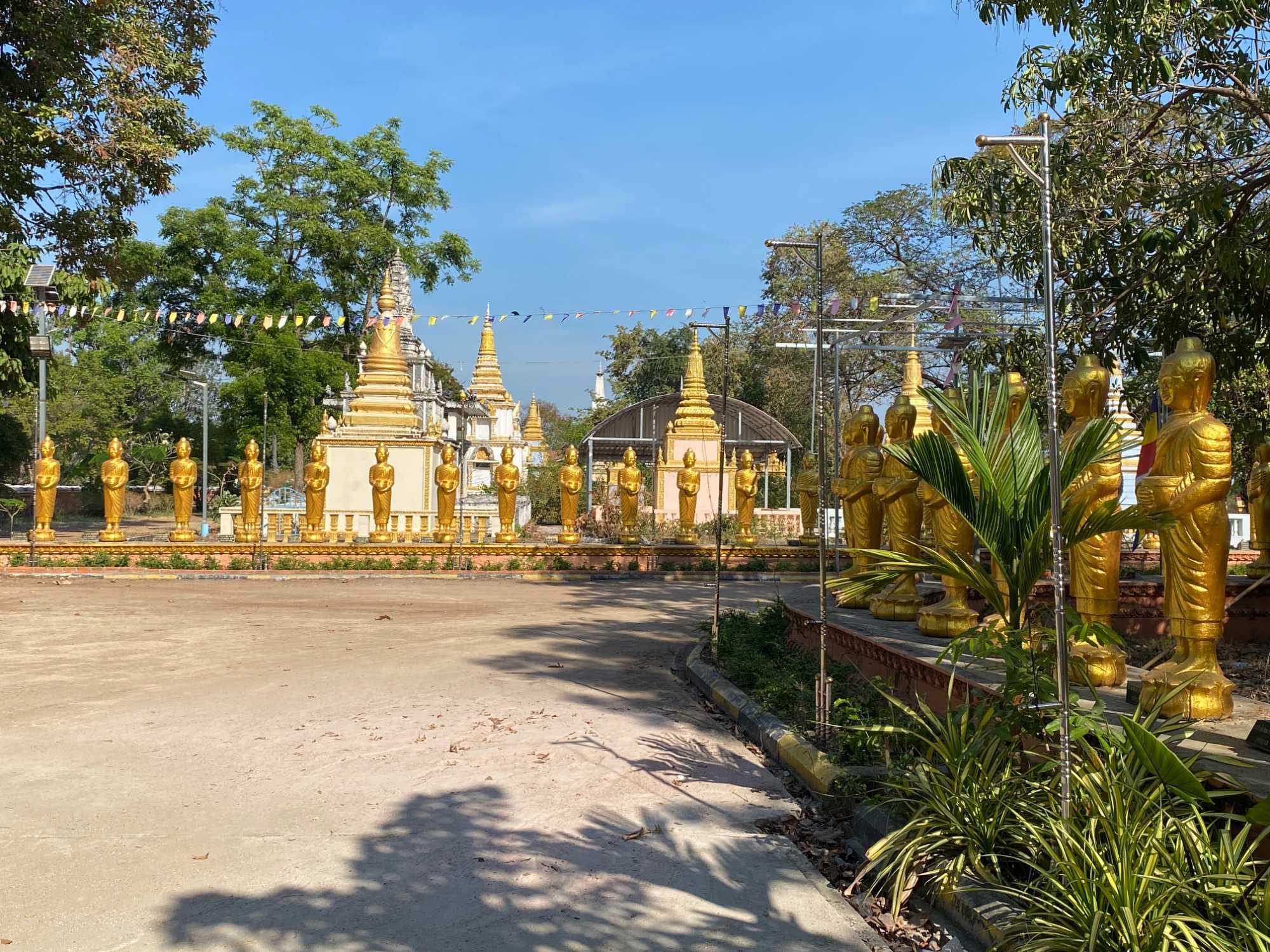 Nous naviguons quelques heures pour rejoindre Kampong Tralach, afin d’apprendre davantage sur le coté spirituel des habitants. Le Cambodge est bouddhiste à 95%, chrétien 2%, musulman 2% et 1% d’anémistes. De là, nous empruntons un tuk-tuk, par groupe de 4, qui sillonne les paysages agricoles, entourés de rizières, pour aller visiter la pagode. Wat Kampong Tralach Leu et son monastère datant du 19è siècle. L’extérieur a été rafraichi, tandis qu’à l’intérieur où y aperçoit des peintures de l’époque qui mériteraient de grande restauration. Un moine était présent et nous a fait une cérémonie de bénédiction avec ses chants qui résonnaient dans nos coeurs, suivi d’un rituel où il attache un fil rouge au poignet droit pour les hommes, gauches pour les femmes.